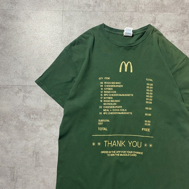 ◯ Explanation ◯ マクドナルドの象徴であるゴールデンアーチと、レシートをモチーフにしたユニークなグラフィックが目を引く1枚。 フロントにはBIG MAC、CHEESEBURGER、FRIES、CHICKEN McNUGGETSなどのおなじみのメニューが並び、ラストには “TOTAL FREE” や “THANK YOU” の表記まで再現された遊び心のあるデザイン。 単なるロゴTではなく、グラフィックとして完成度の高い企業モノに仕上がっています。 ボディはDELTA PRO WEIGHTを使用。 程よくしっかりとしたコットン生地で、デイリーに着用しやすい質感。 ダークグリーンのボディにゴールド系プリントの配色も良く、1枚で主役になる存在感のあるアイテムです。 企業系・アドバタイジングTシャツ、ファストフードモチーフがお好きな方におすすめの1着。 ○Size○ 表記→L ・着丈67 ・身幅51 ・肩幅50 ・袖丈17 (cm) ○Color○ ・グリーン ※プリント:ゴールド ○Material○ ・100%コットン ○Condition○ ・左肩付近多少のフェード感あり ○Caution○ 当店で取り扱っている商材は全て『古着』となっております。 そのため、多少の状態難(ほつれ、傷、汚れ、リブの伸び、使用感、擦れ、色あせ、etc)がある場合がございます。 新品同様の完璧なお品物をお求めの方は当店でのお買い物を控えて頂きますよう宜しくお願いします。 また、購入された商品に関しましては、購入日時から起算して『72時間以内に』発送手続きの方を取らせて頂きます。 お急ぎの場合は購入前に当店オンラインストアの方にお問い合わせ頂きますよう宜しくお願いします。 26/693