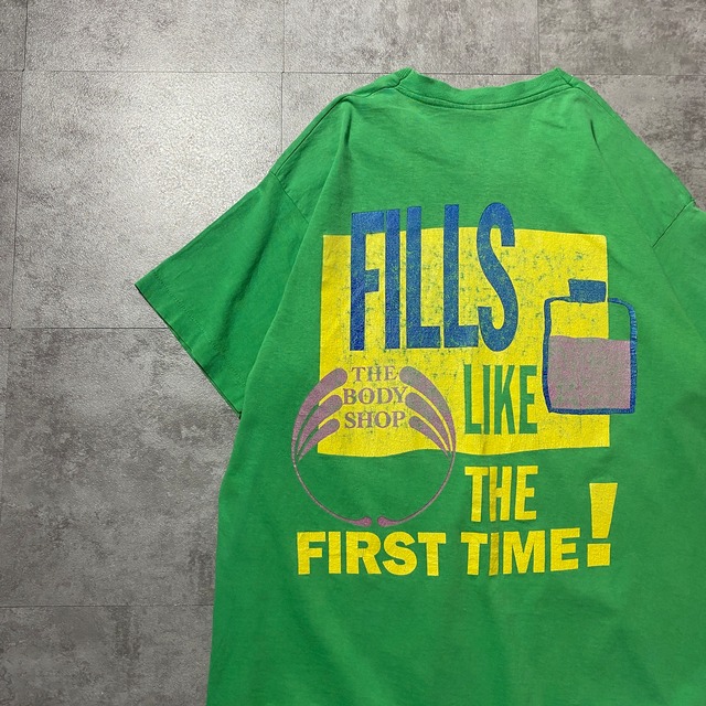 【カナダ製】90's Fruit of the Loom The Body Shop フルーツオブザルーム ボディショップ バックプリント シングルステッチ グリーン Tシャツ