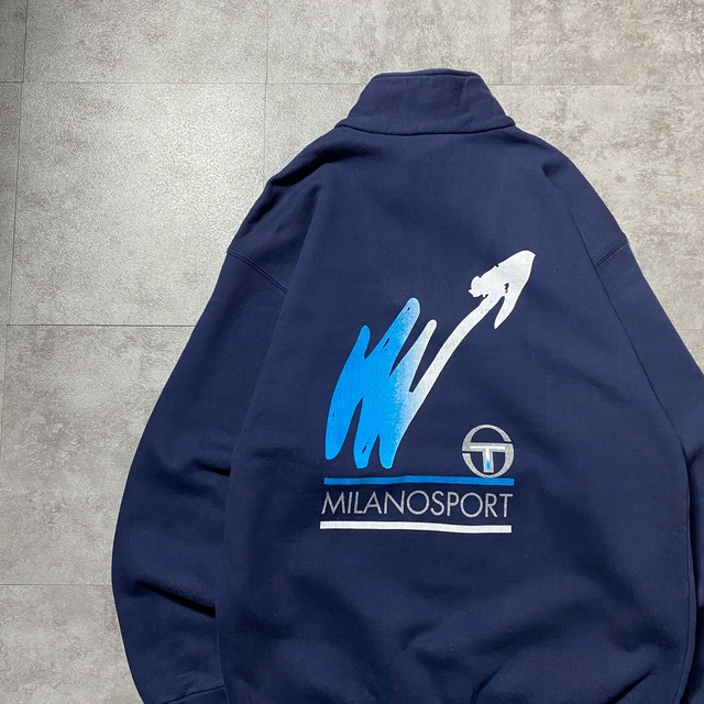 【Size:XL】90's Sergio Tacchini セルジオタッキーニ 刺繍ワンポイント ハーフジップ バックプリント ネイビー スウェット トレーナー