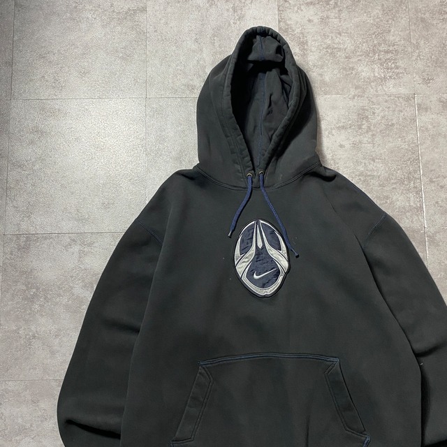 【Size:XL】00's NIKE ナイキ スウォッシュセンター刺繍×ワッペン ブラック 黒 スウェット パーカー フーディ