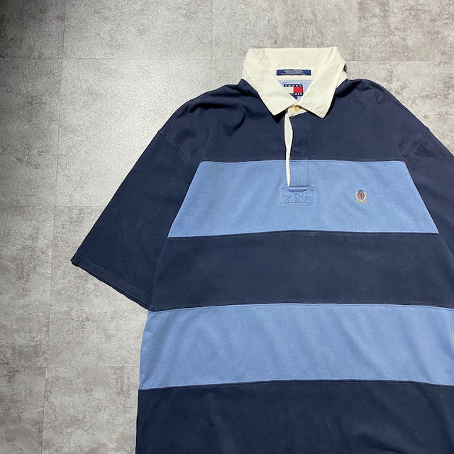 90's Tommy Hilfiger トミーヒルフィガー 刺繍ロゴ ボーダー XXLサイズ ハーフスリーブ 半袖 ラガーシャツ Tシャツ ポロシャツ
