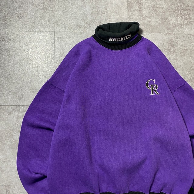 【Size.XL】90's The Game MLB Colorado Rockies コロラドロッキーズ ハイネック 刺繍ネックロゴ ワンポイント ラインリブ パープル 紫 スウェット トレーナー