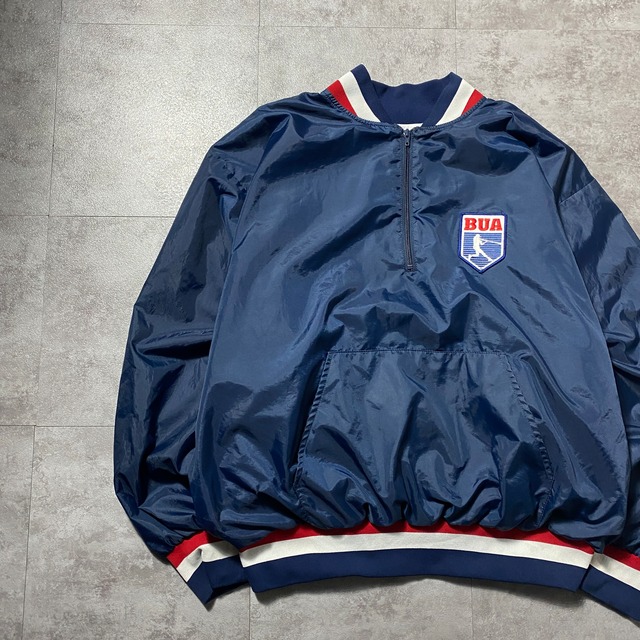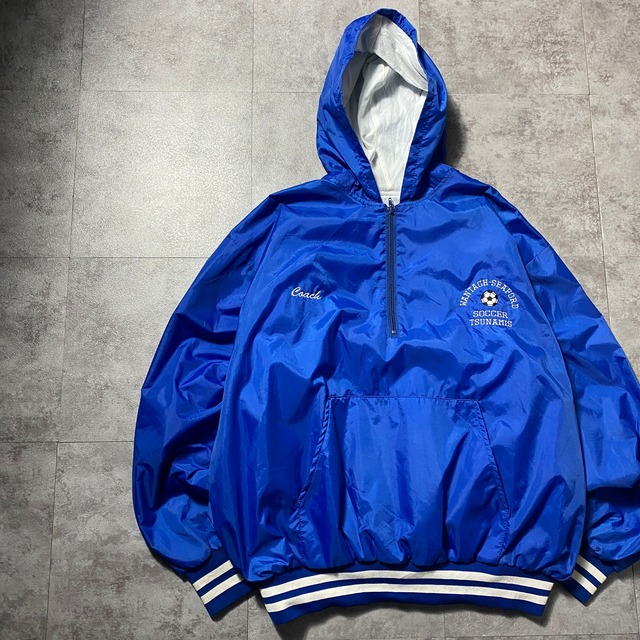 【USA製】90's GAME 刺繍ロゴ ハーフジップ ラインリブ ブルー ナイロン アノラックパーカー