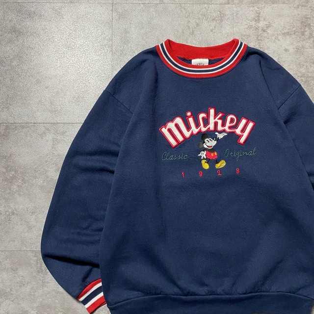 【USA製】90's old Disney MICKEY&CO. オールドディズニー ミッキー 刺繍ロゴ ラインリブ ネイビー スウェット トレーナー