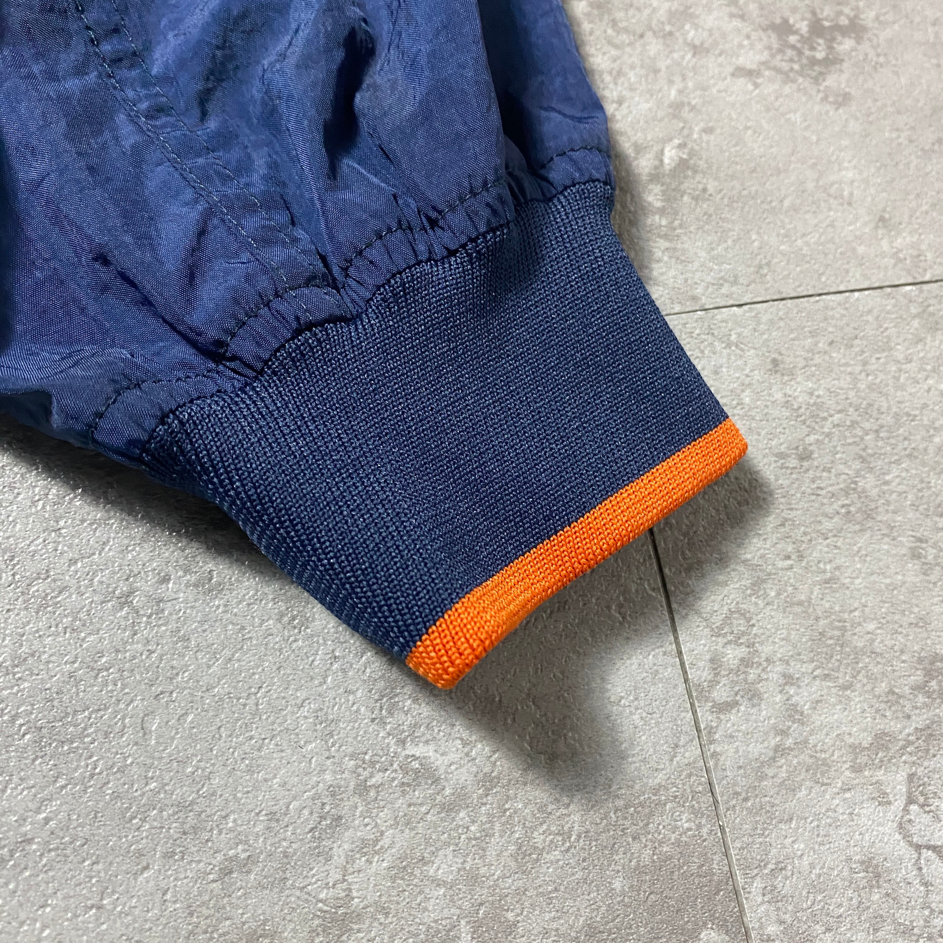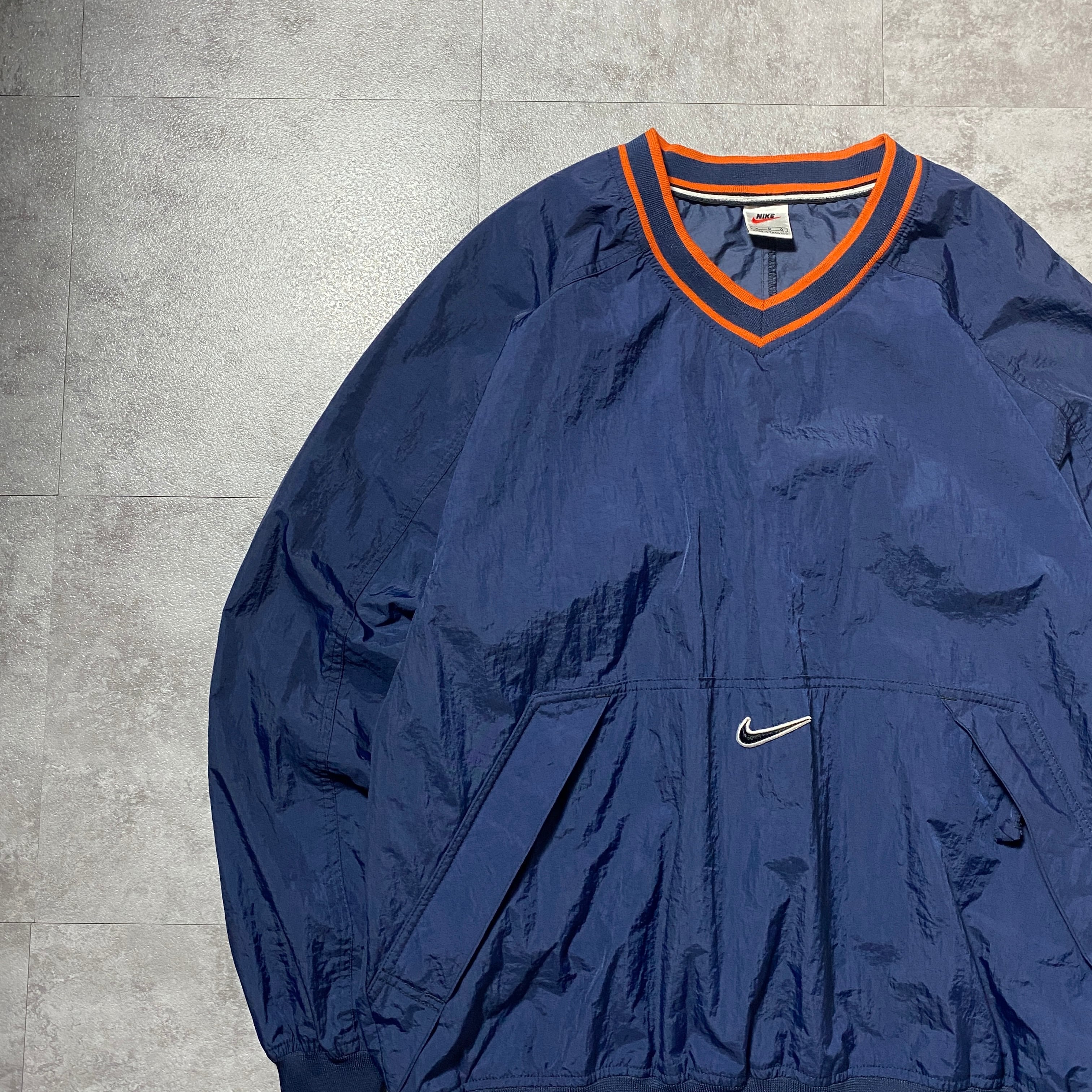 90's NIKE ナイキ スウォッシュ 刺繍センターロゴ ラインリブ ネイビー ナイロンプルオーバー ナイロンジャケット