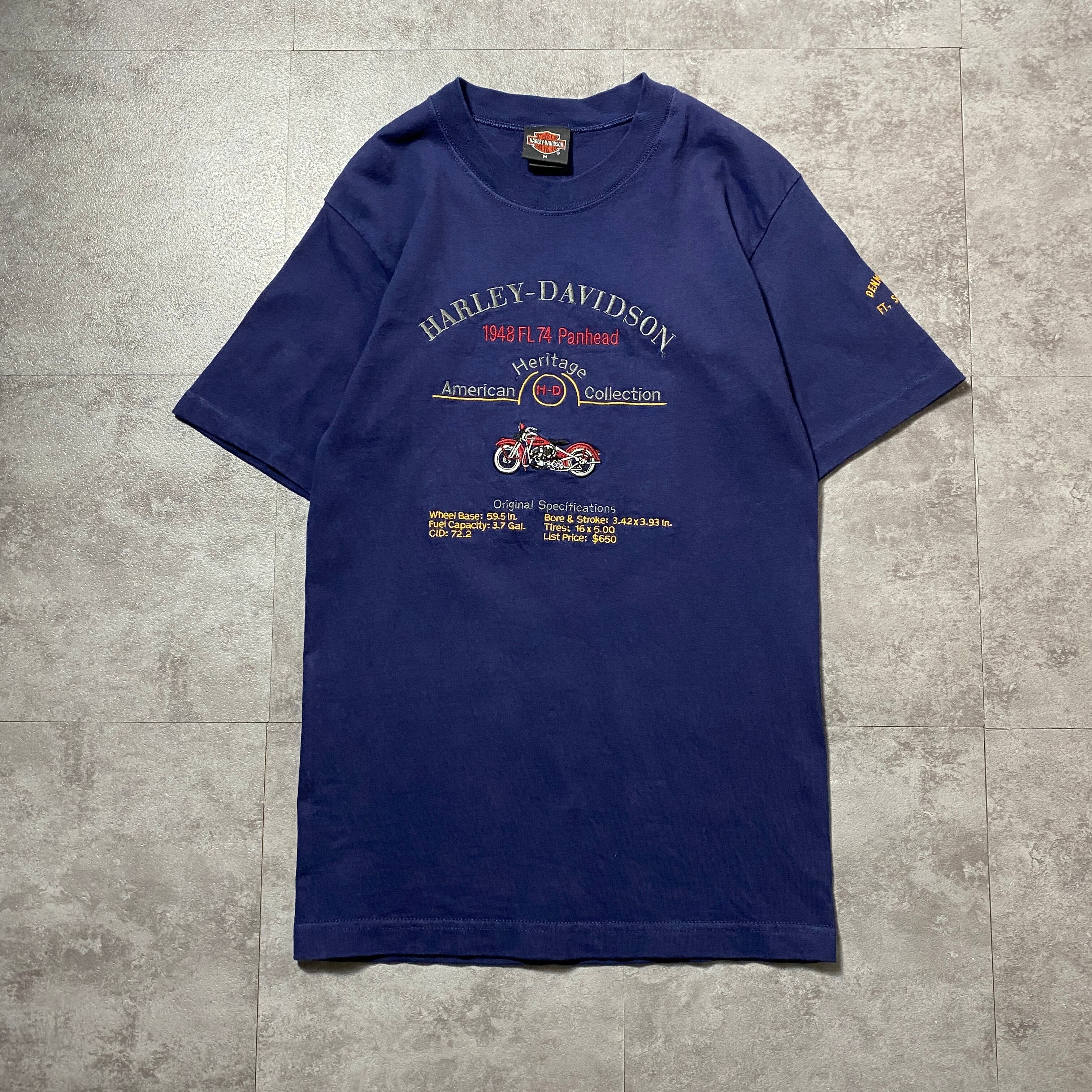 【USA製】90's Harley-Davidson ハーレーダビッドソン 刺繍デザイン ネイビー シングルステッチ Tシャツ