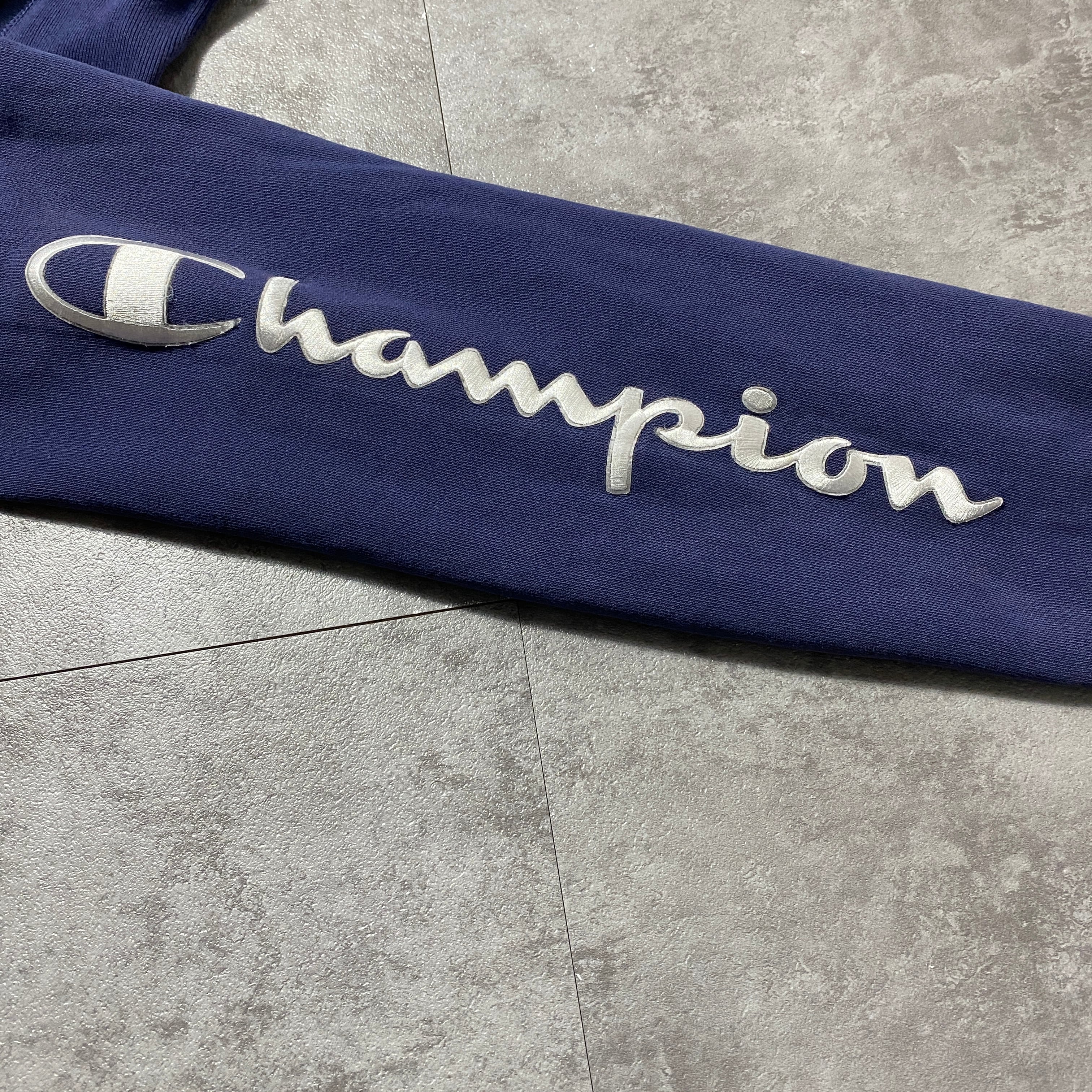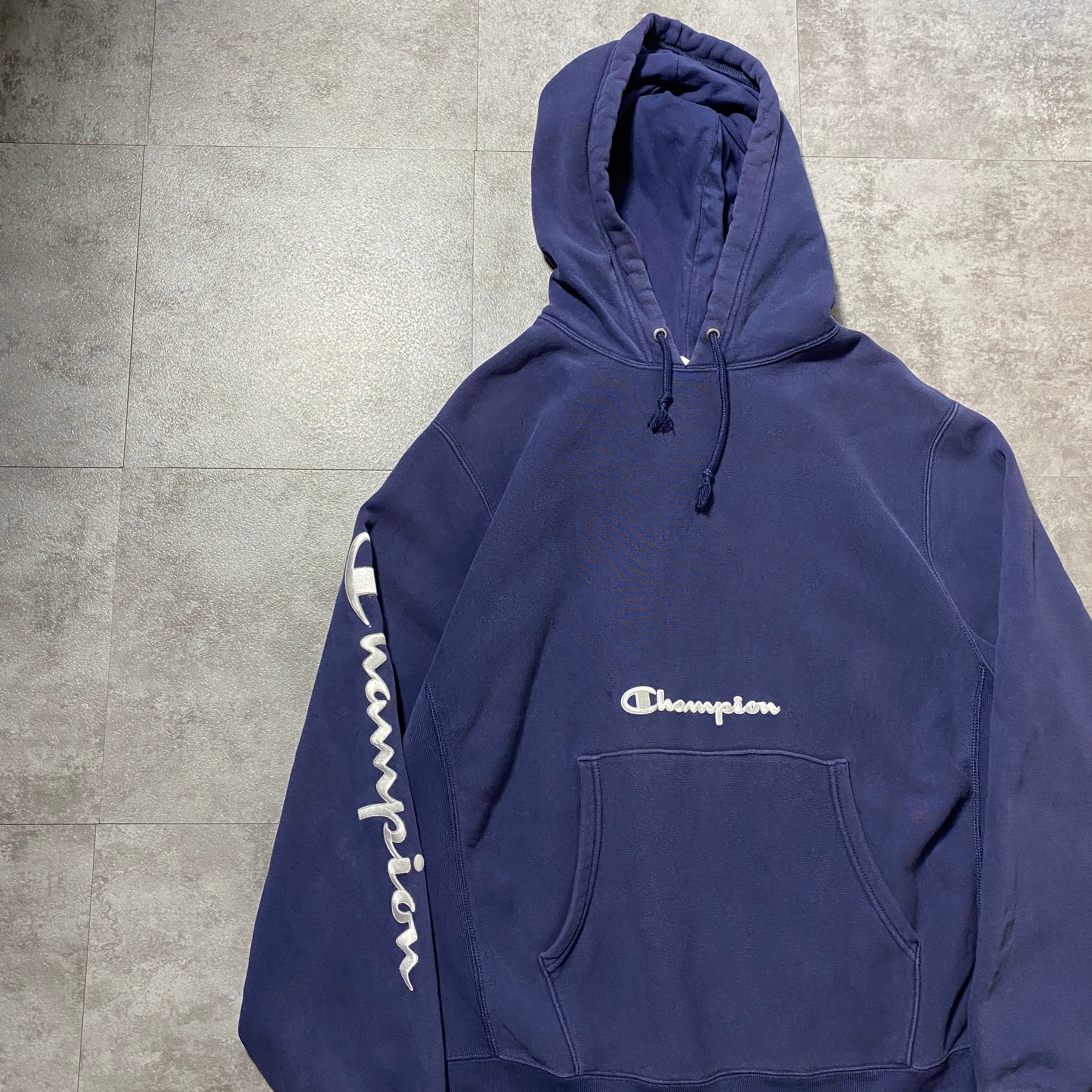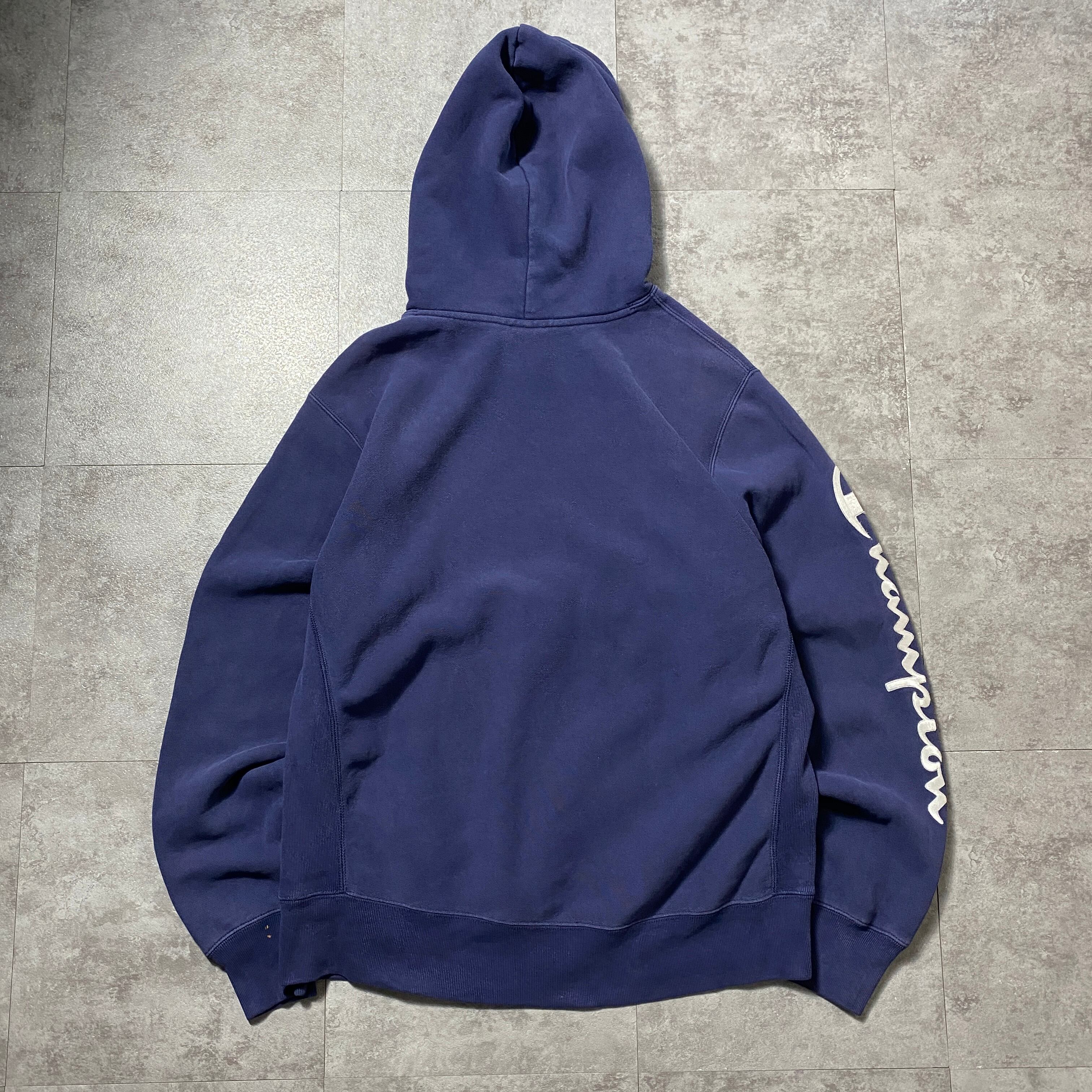00's Champion チャンピオン リバースウィーブ 刺繍センターロゴ アームロゴ ヘビーオンス ネイビー スウェット パーカー