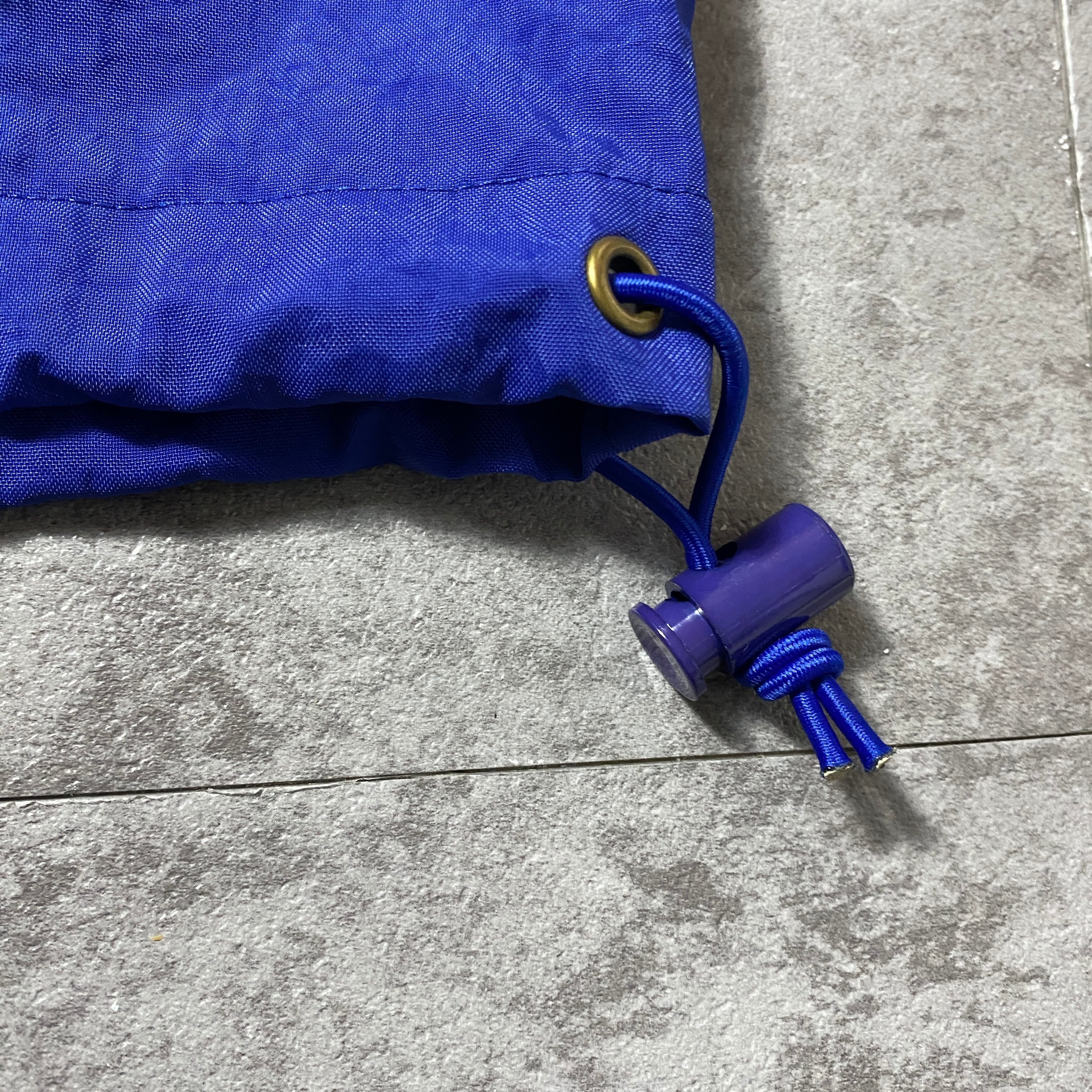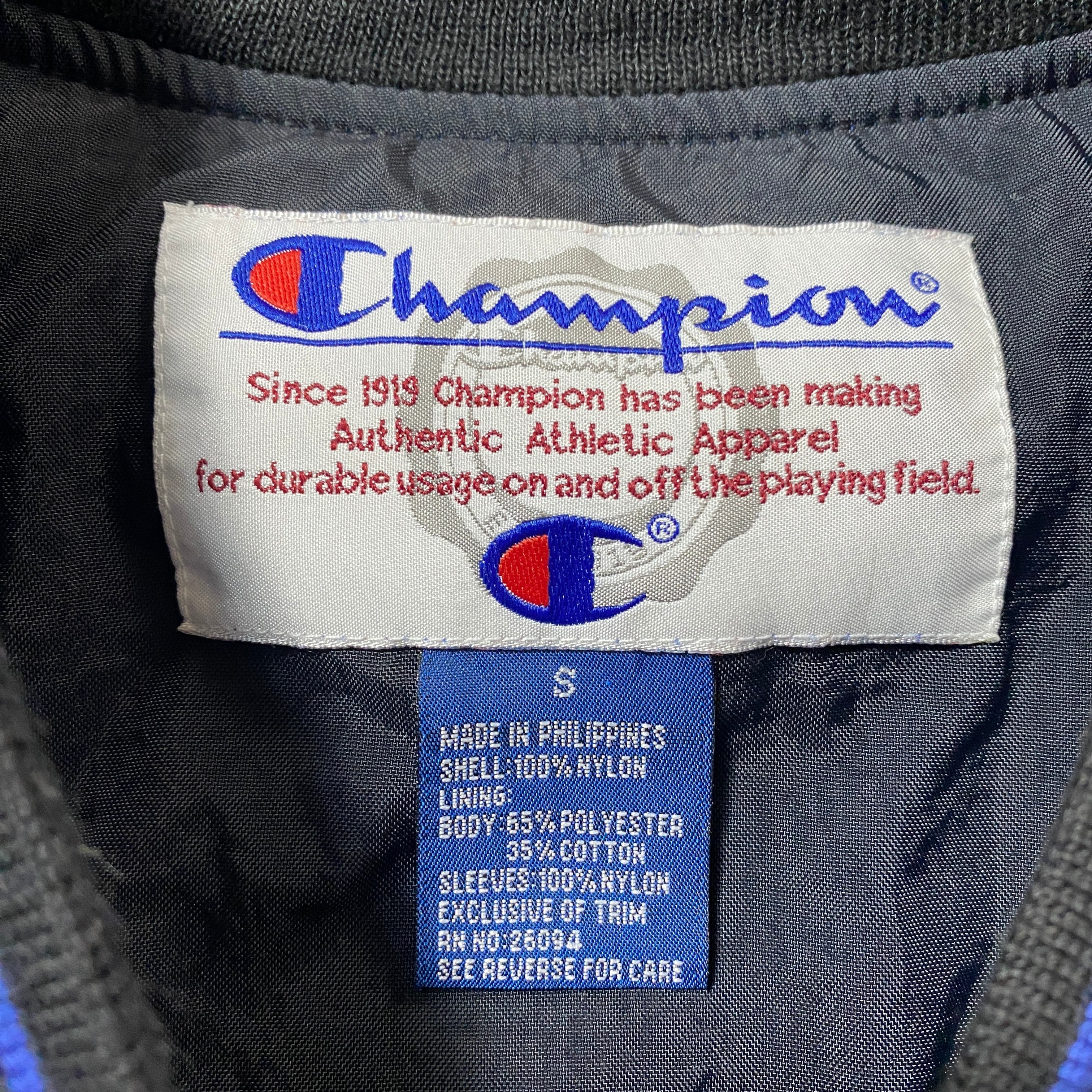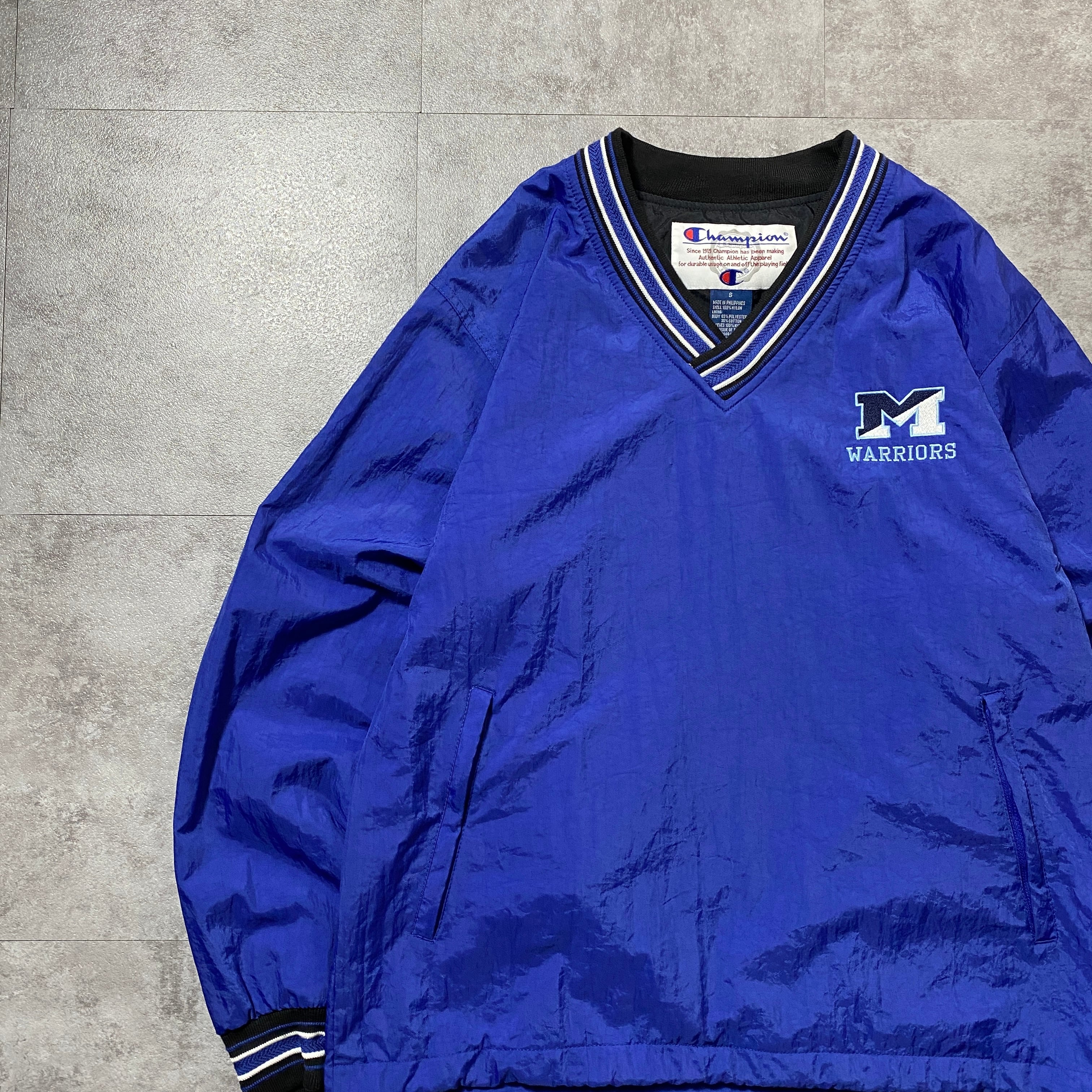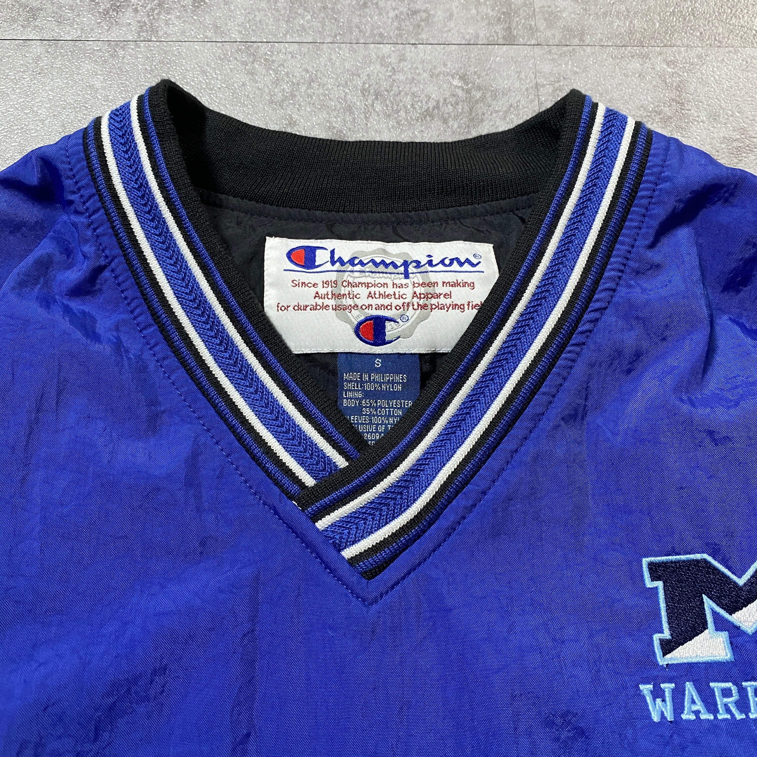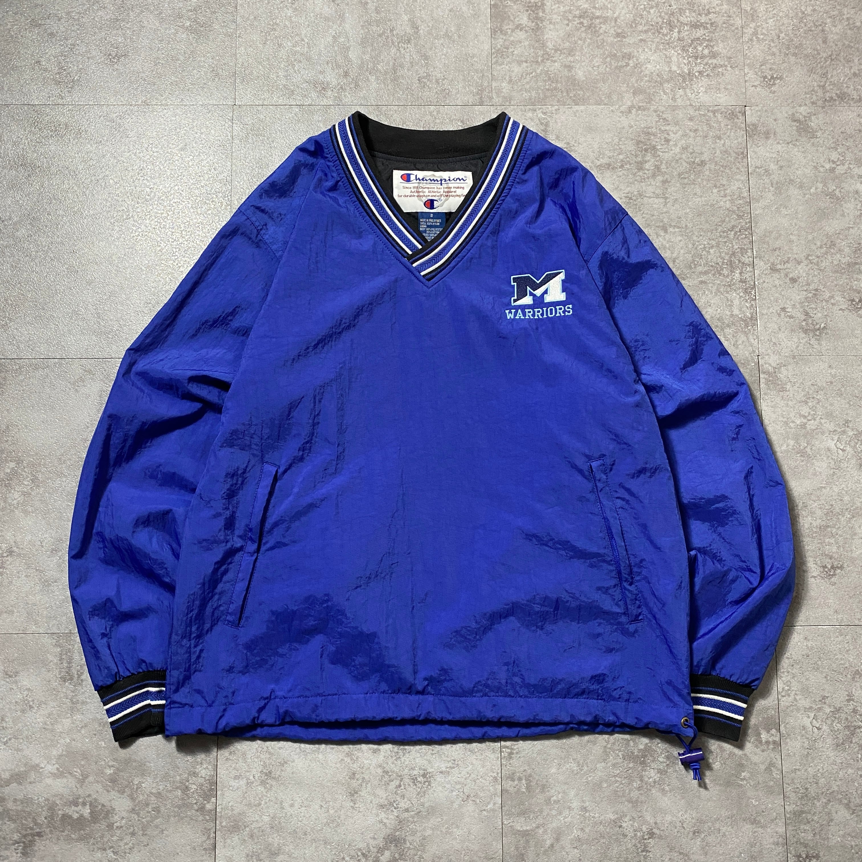 90's Champion チャンピオン 刺繍企業ロゴ ラインリブ ブルー ナイロンプルオーバー