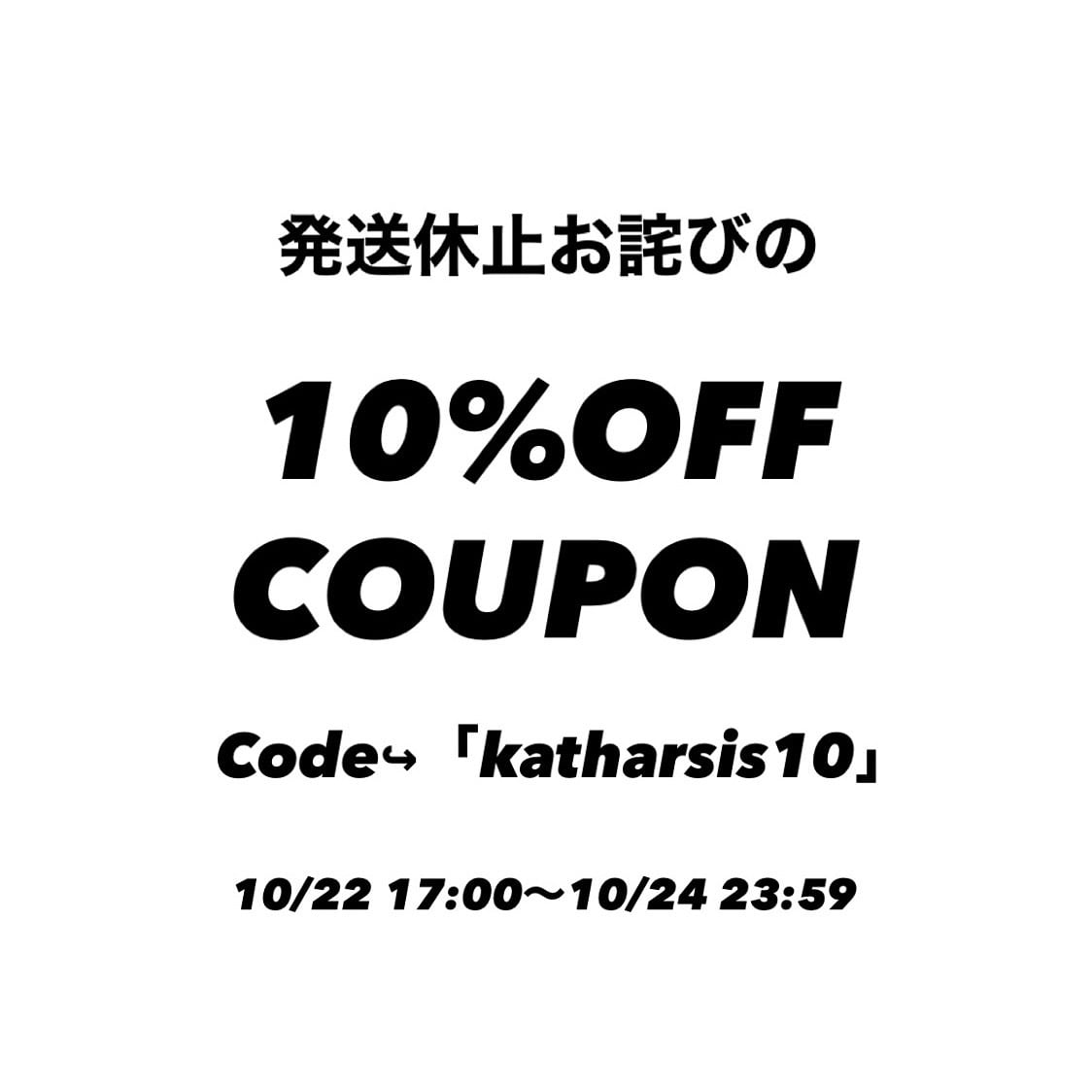 また発送休止のお詫びとして、10/22 17:00〜10/24 23:59の期間中にお使い頂ける10%OFFクーポンを配布させて頂きます!