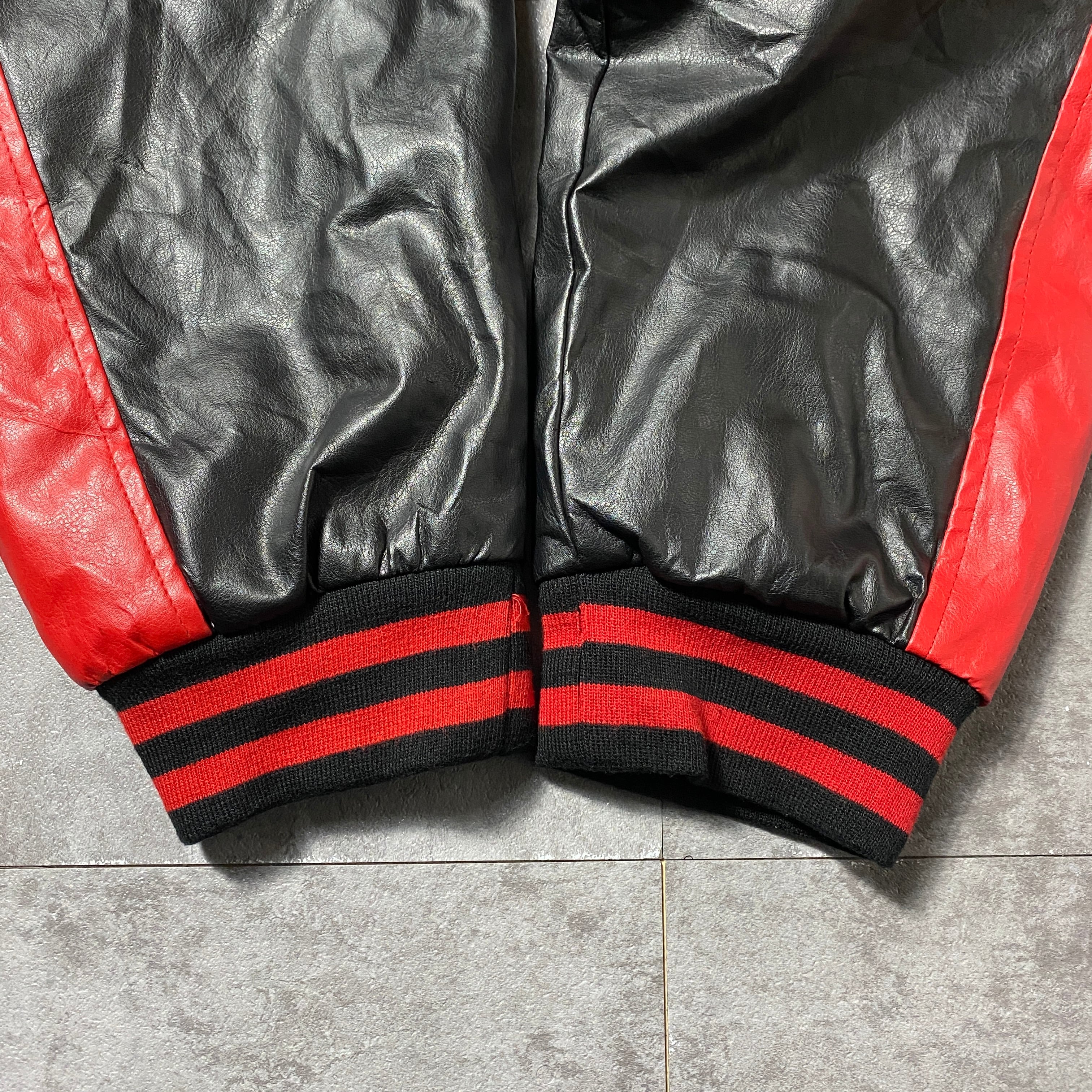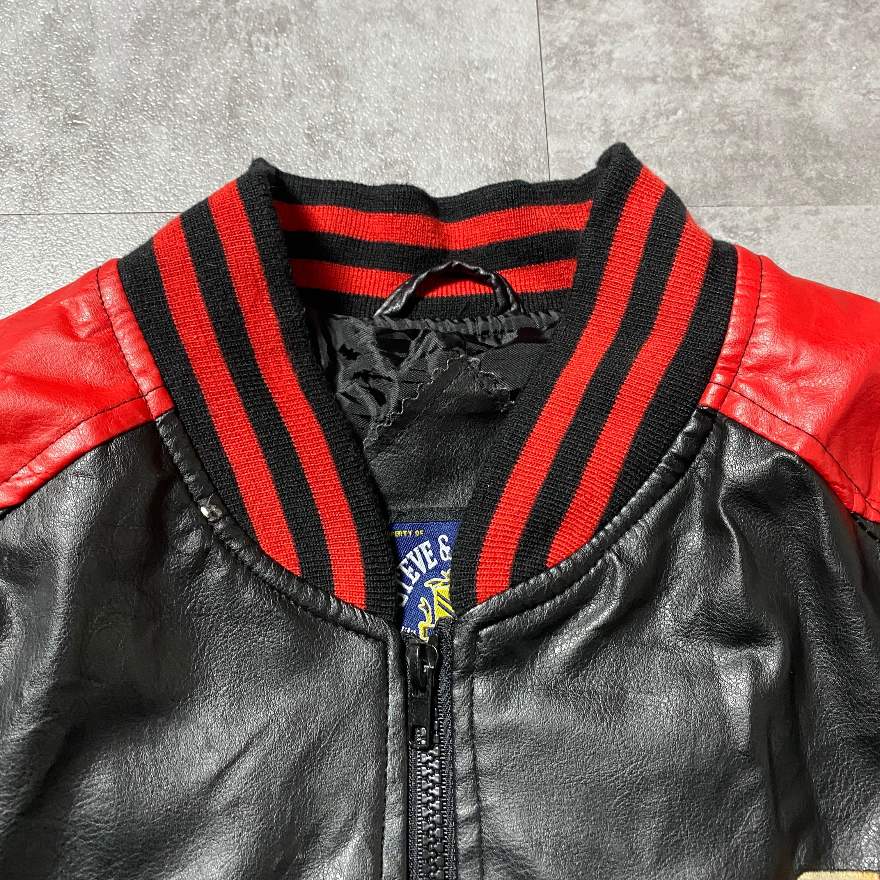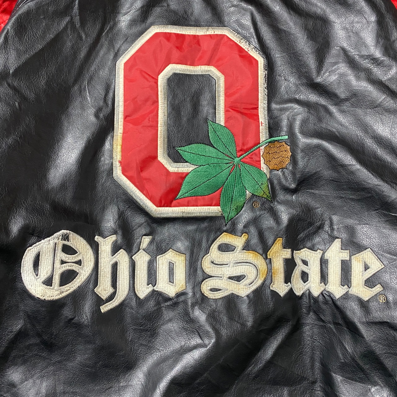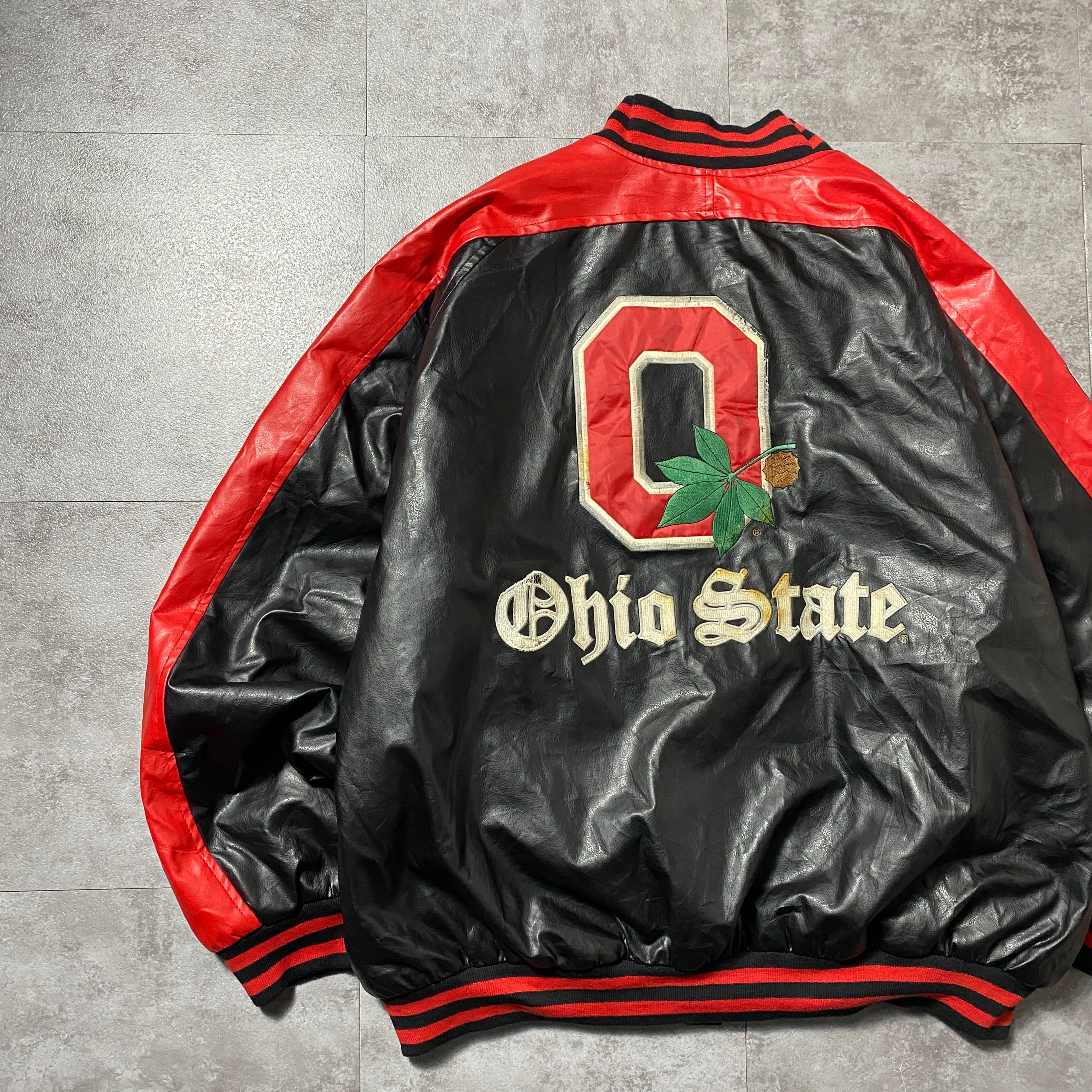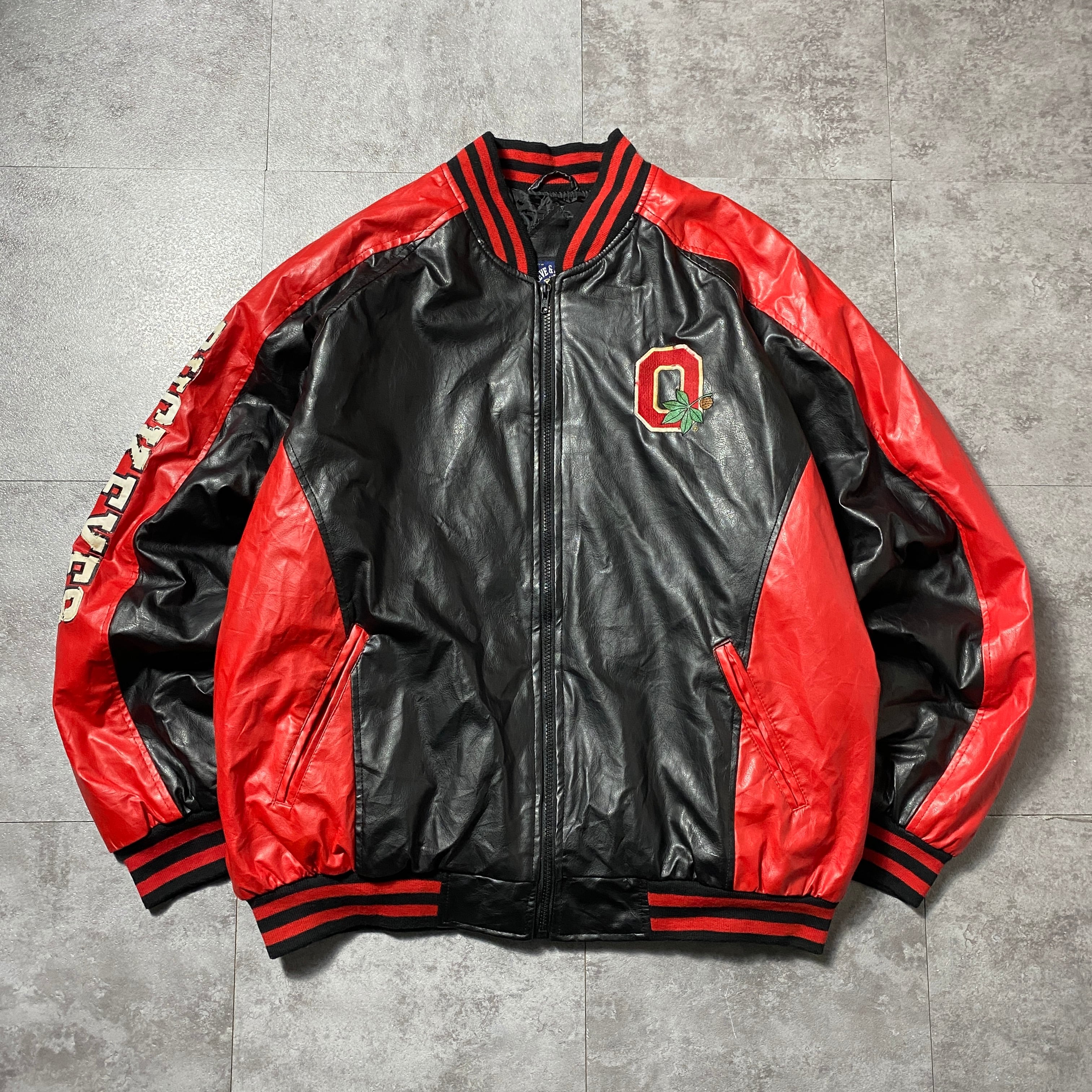 90's STEEVE&BARRY'S スティーブアンドバリーズ オハイオ大学 カレッジロゴ ラインリブ フェイクレザージャケット スタジャン