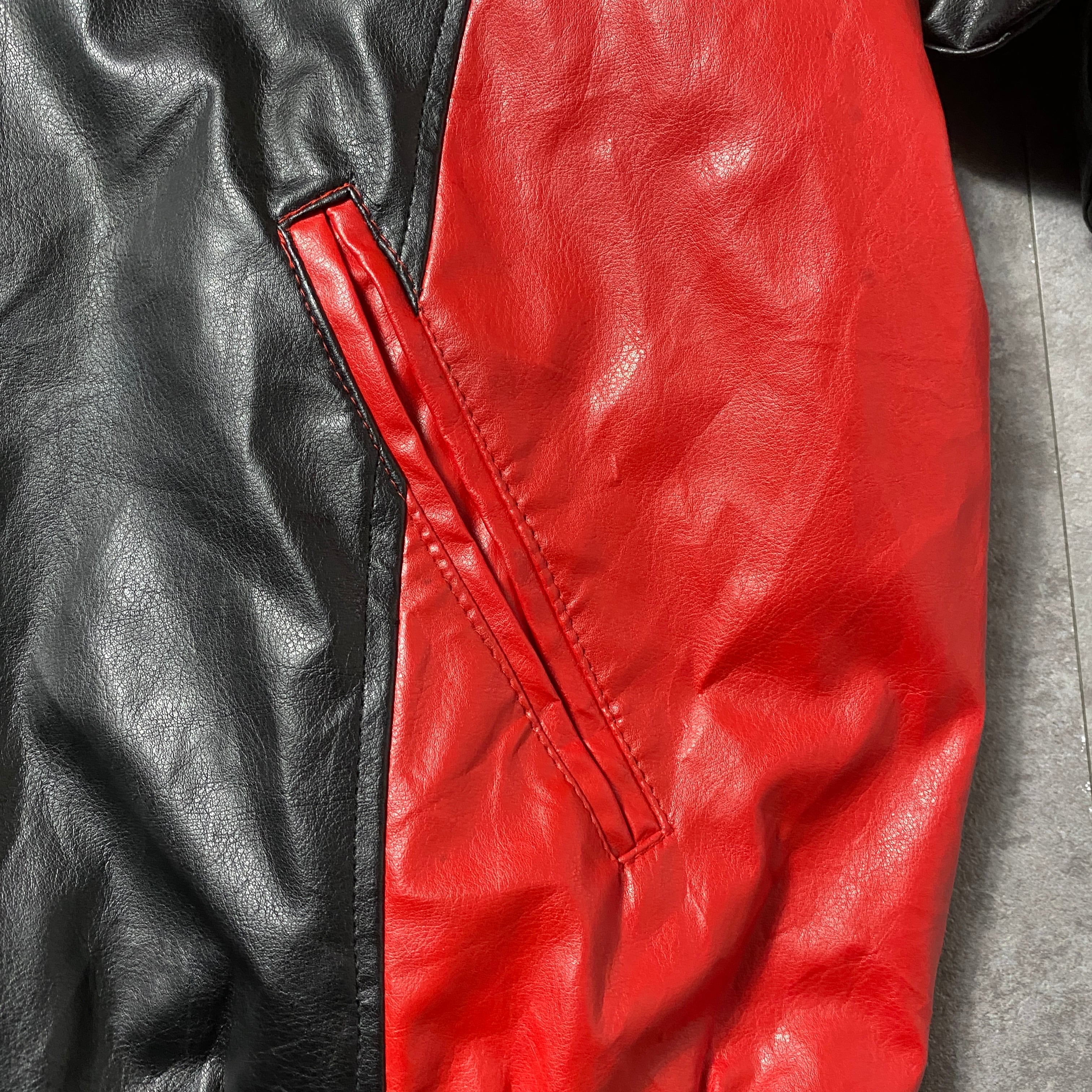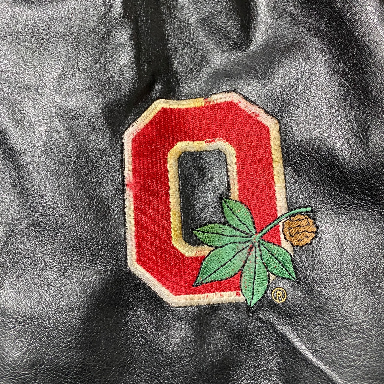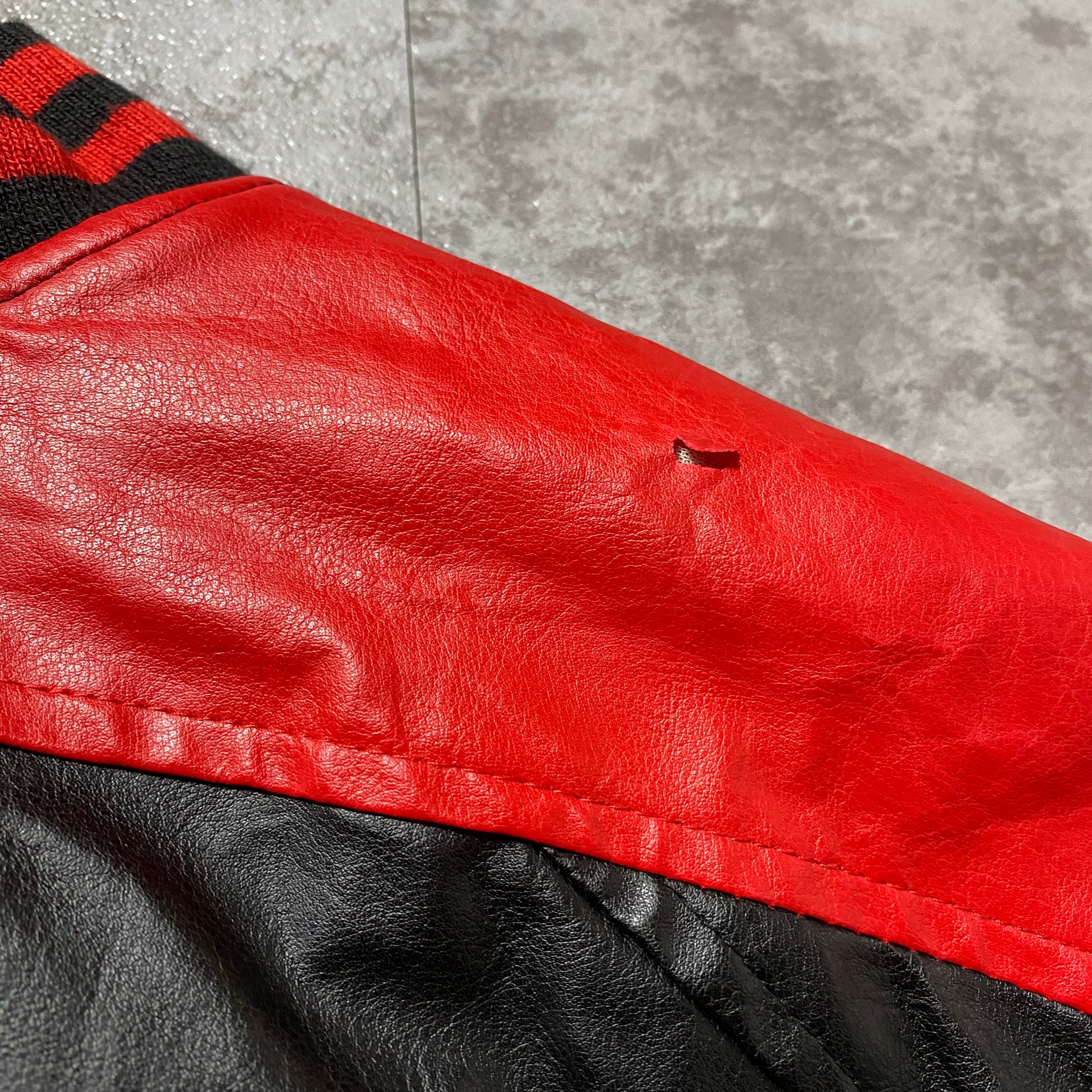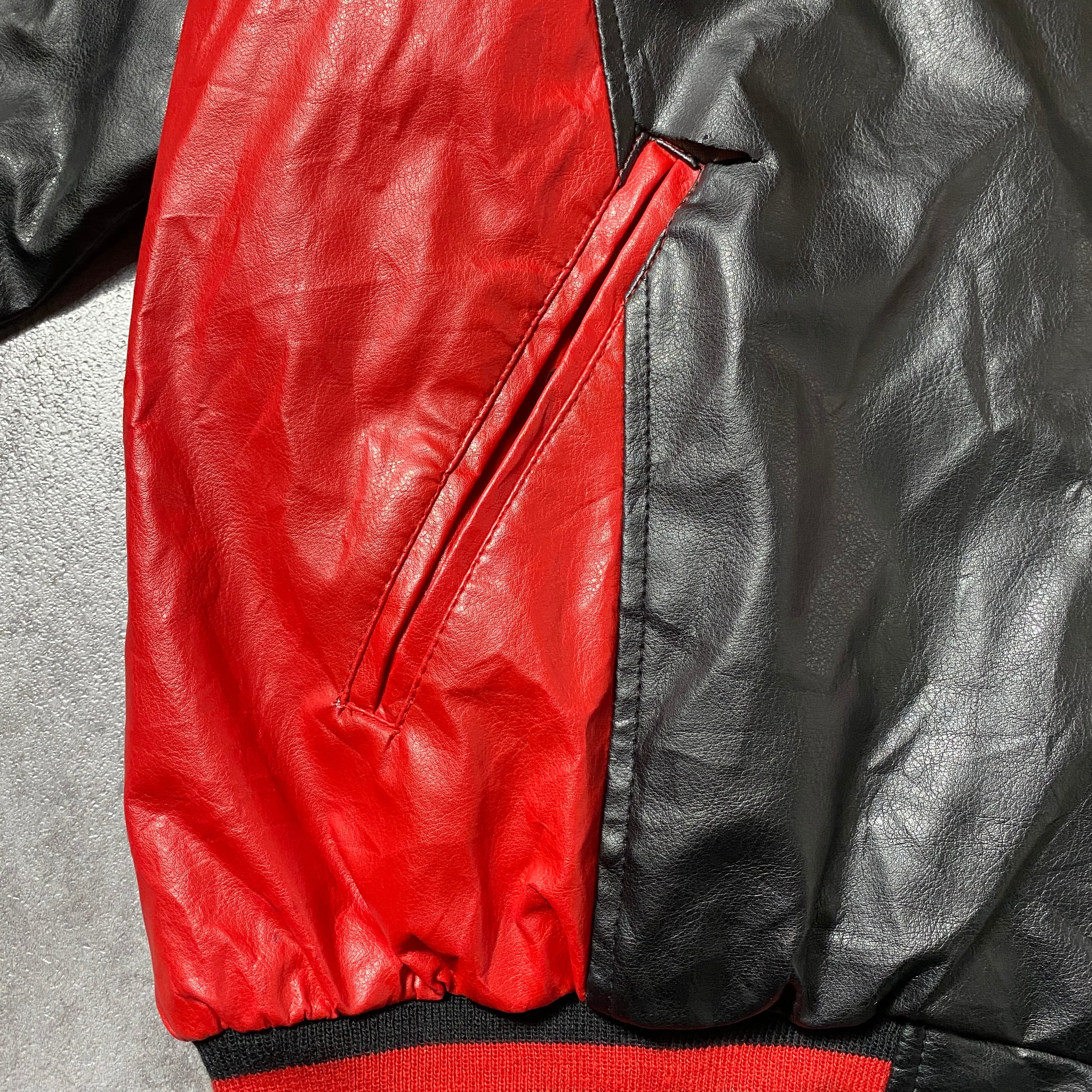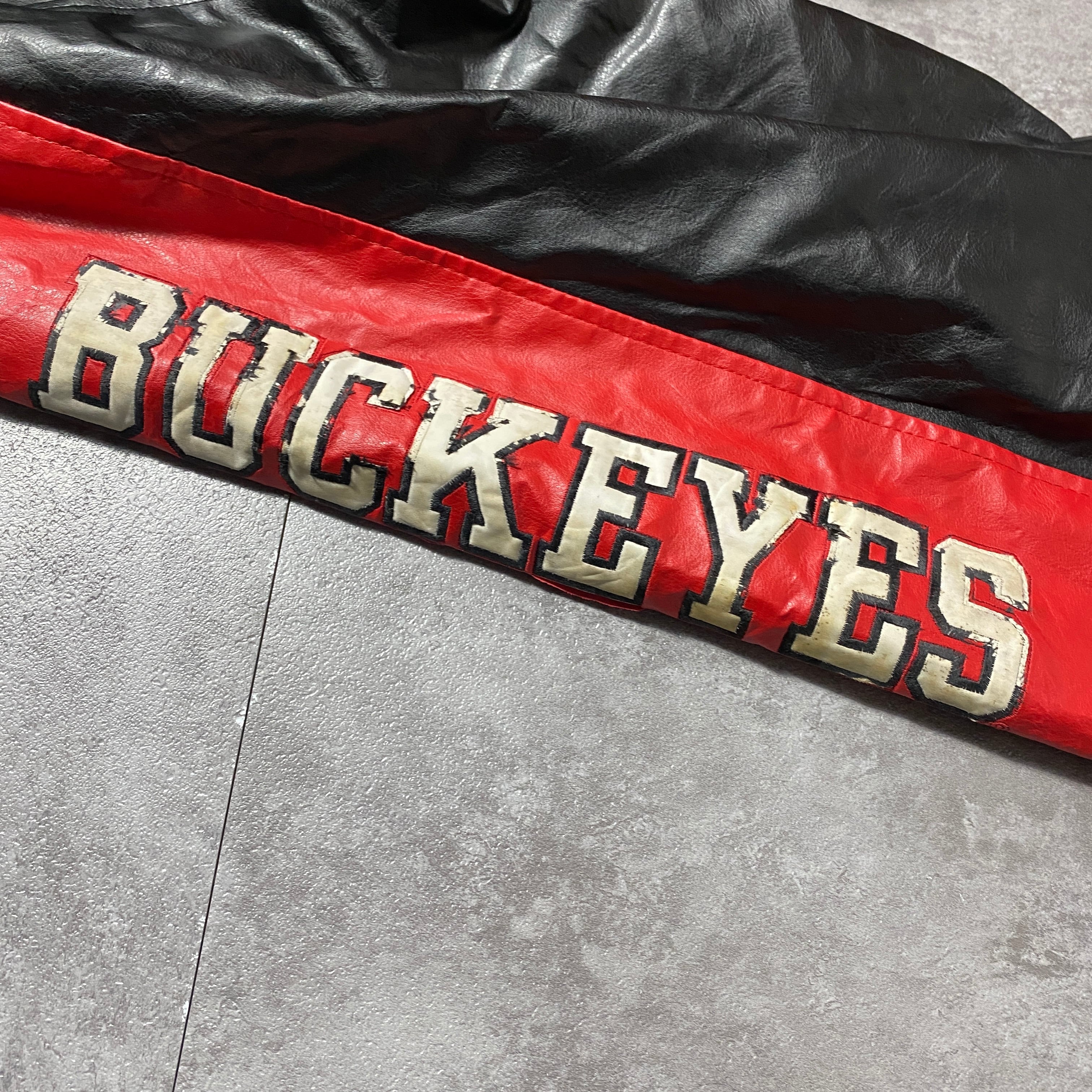 90's STEEVE&BARRY'S スティーブアンドバリーズ オハイオ大学 カレッジロゴ ラインリブ フェイクレザージャケット スタジャン