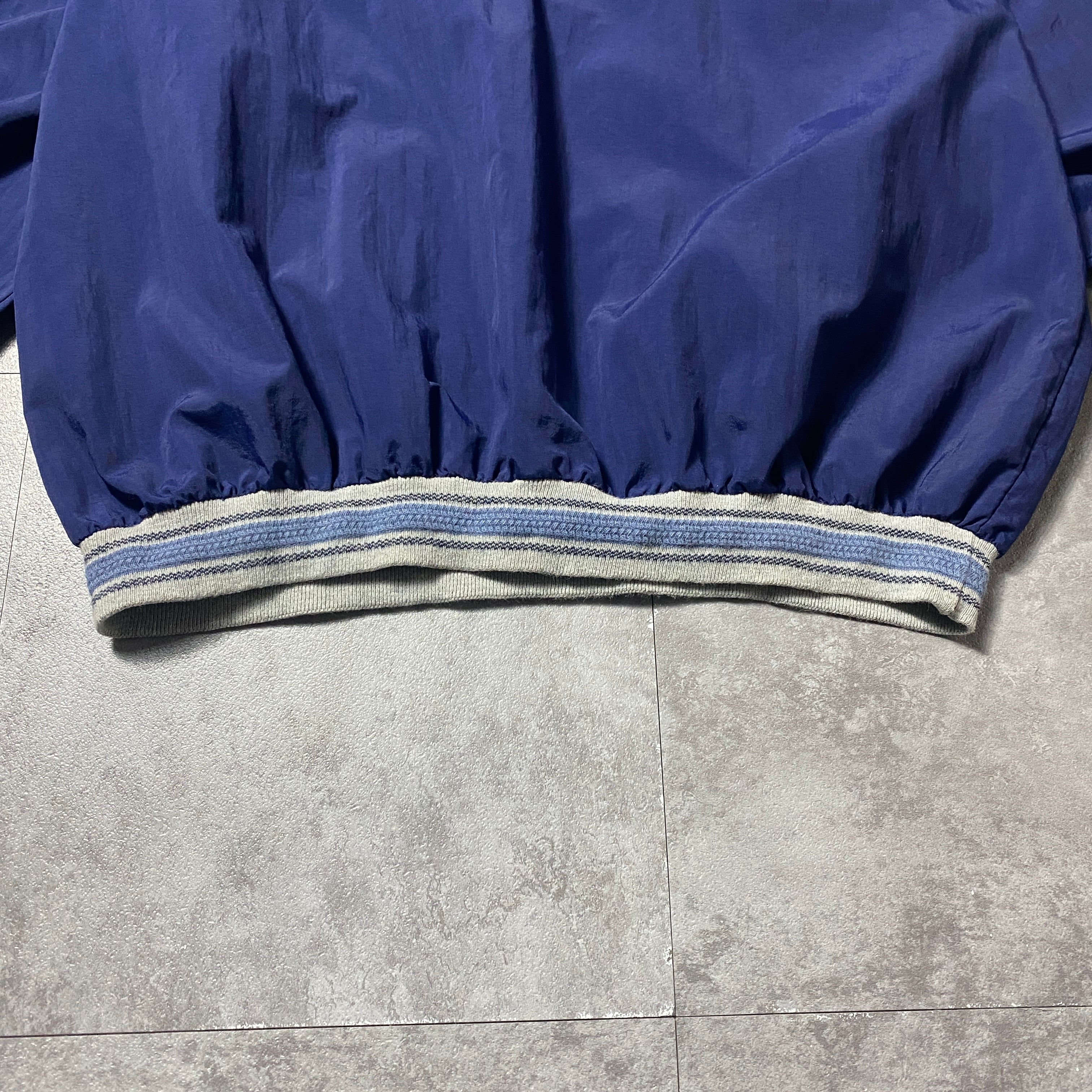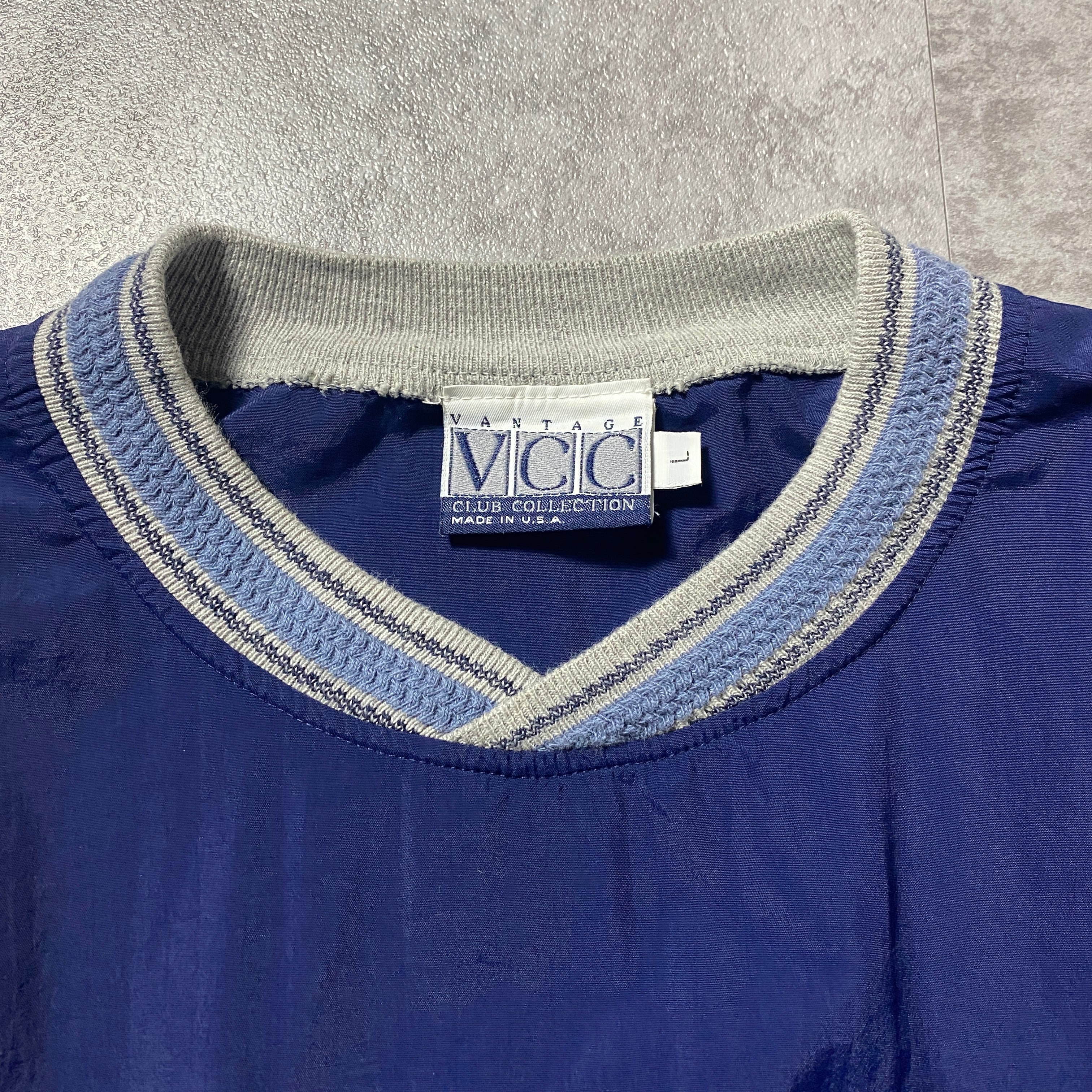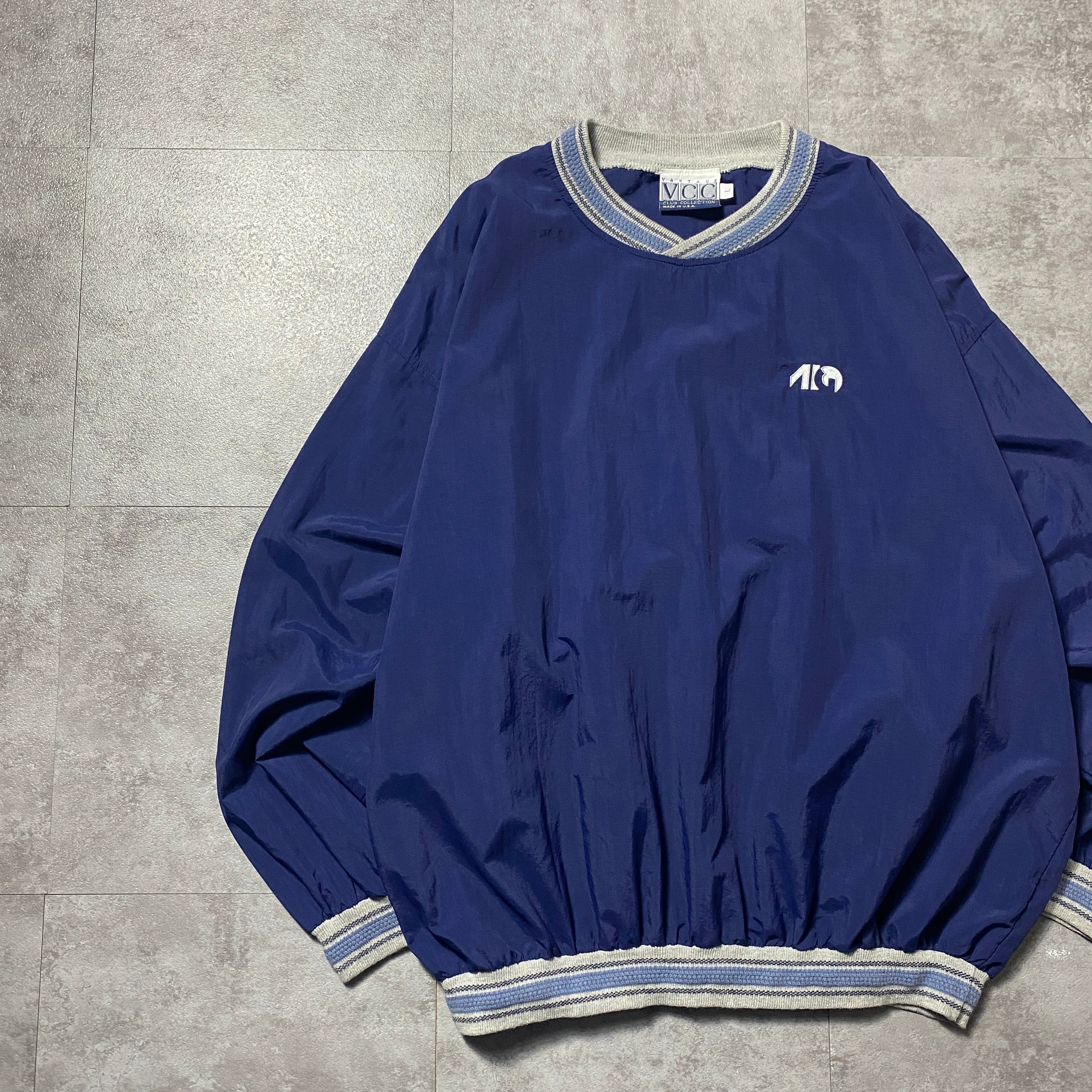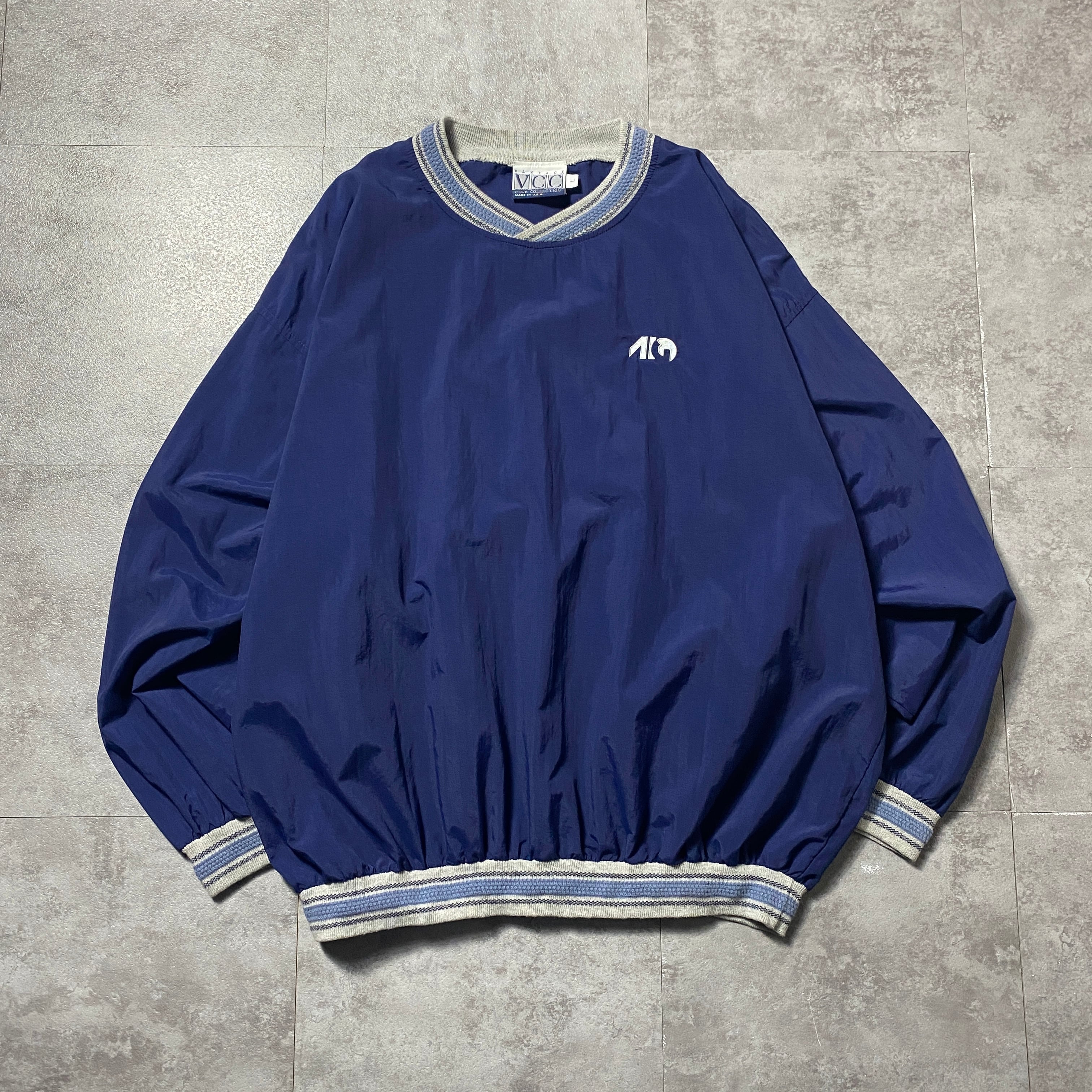 【USA製】90's Vantage Club Collection "VCC" 刺繍ワンポイント ラインリブ ネイビー ナイロンプルオーバー