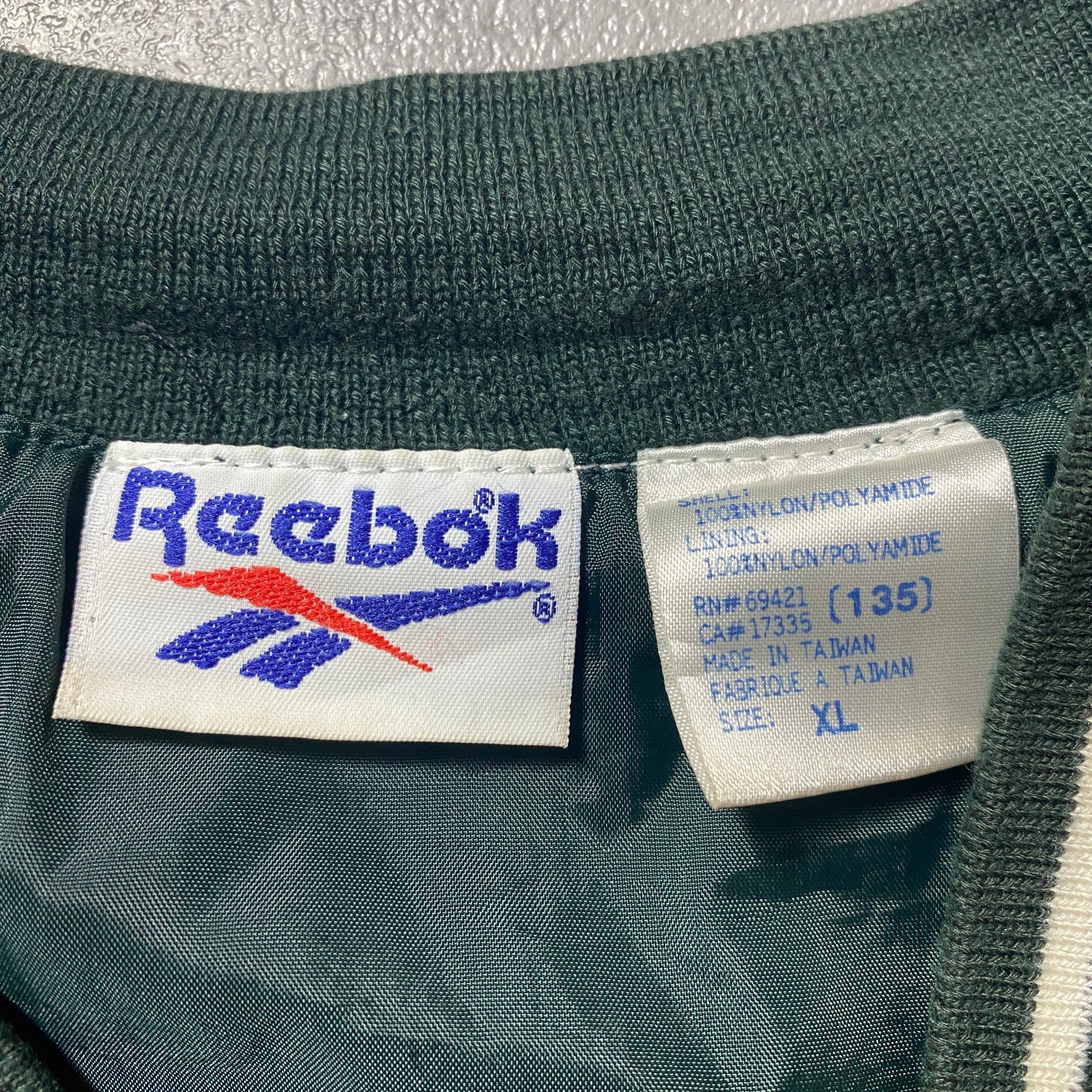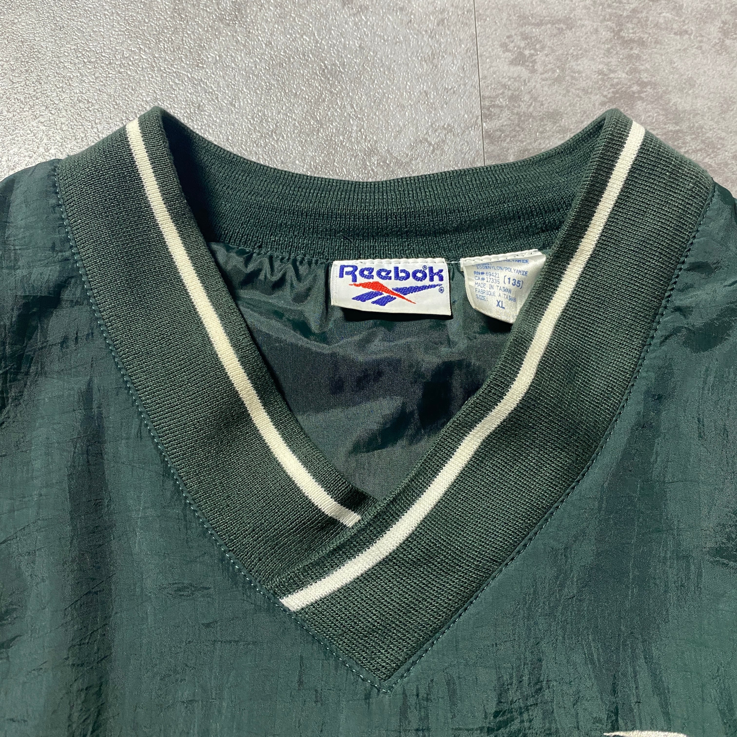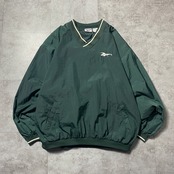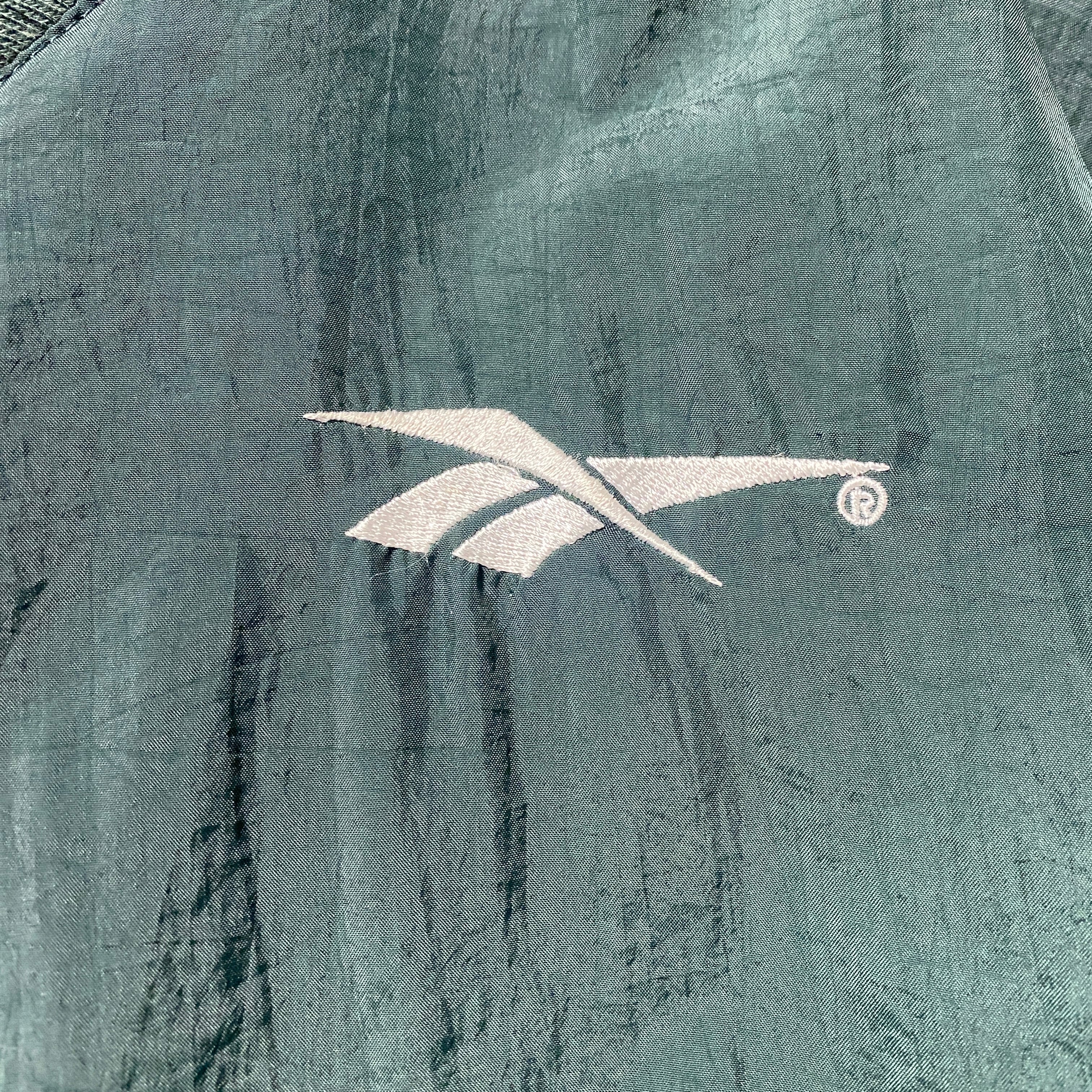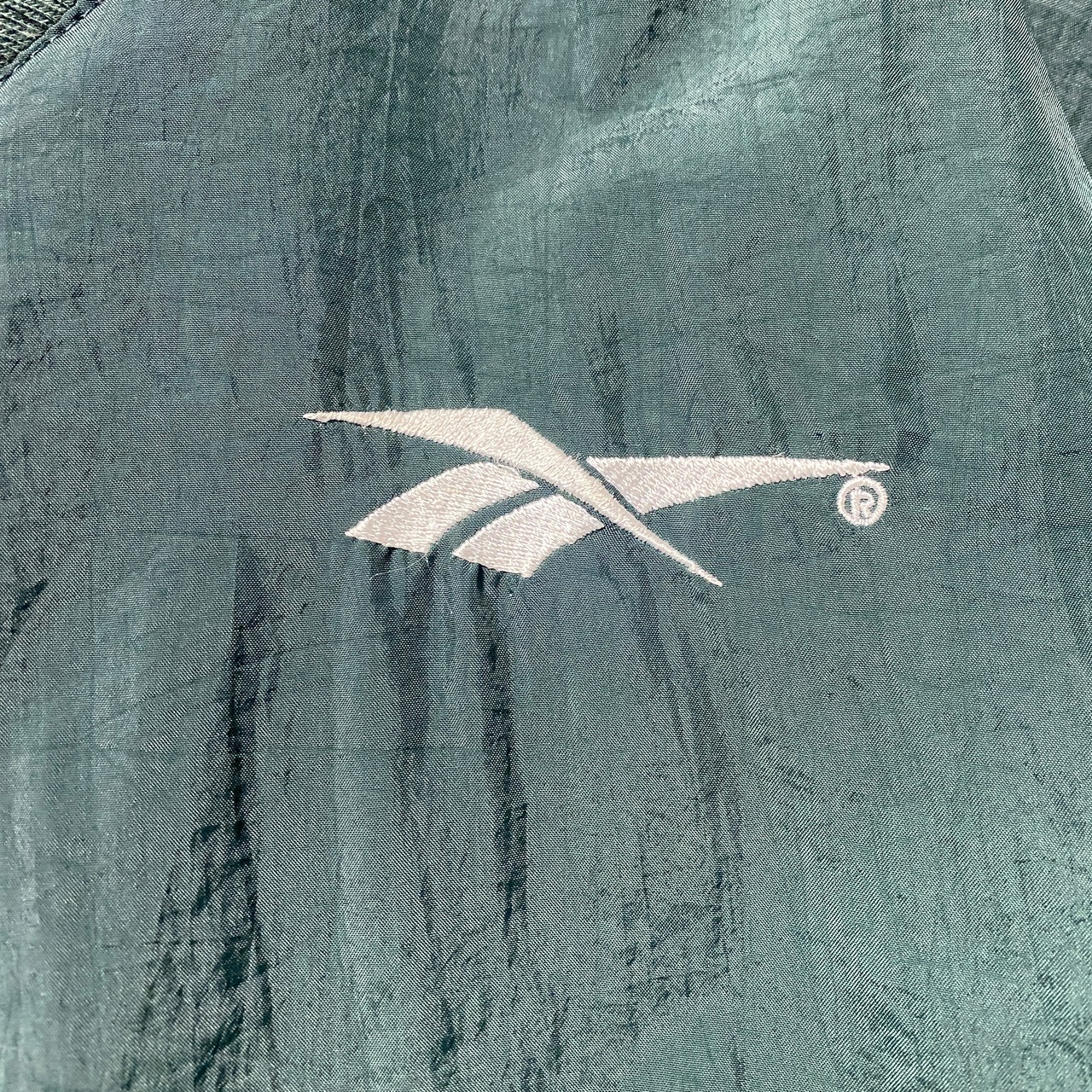 【Size.XL】90's Reebok リーボック 刺繍ワンポイント ベクターロゴ ラインリブ グリーン ナイロンプルオーバー