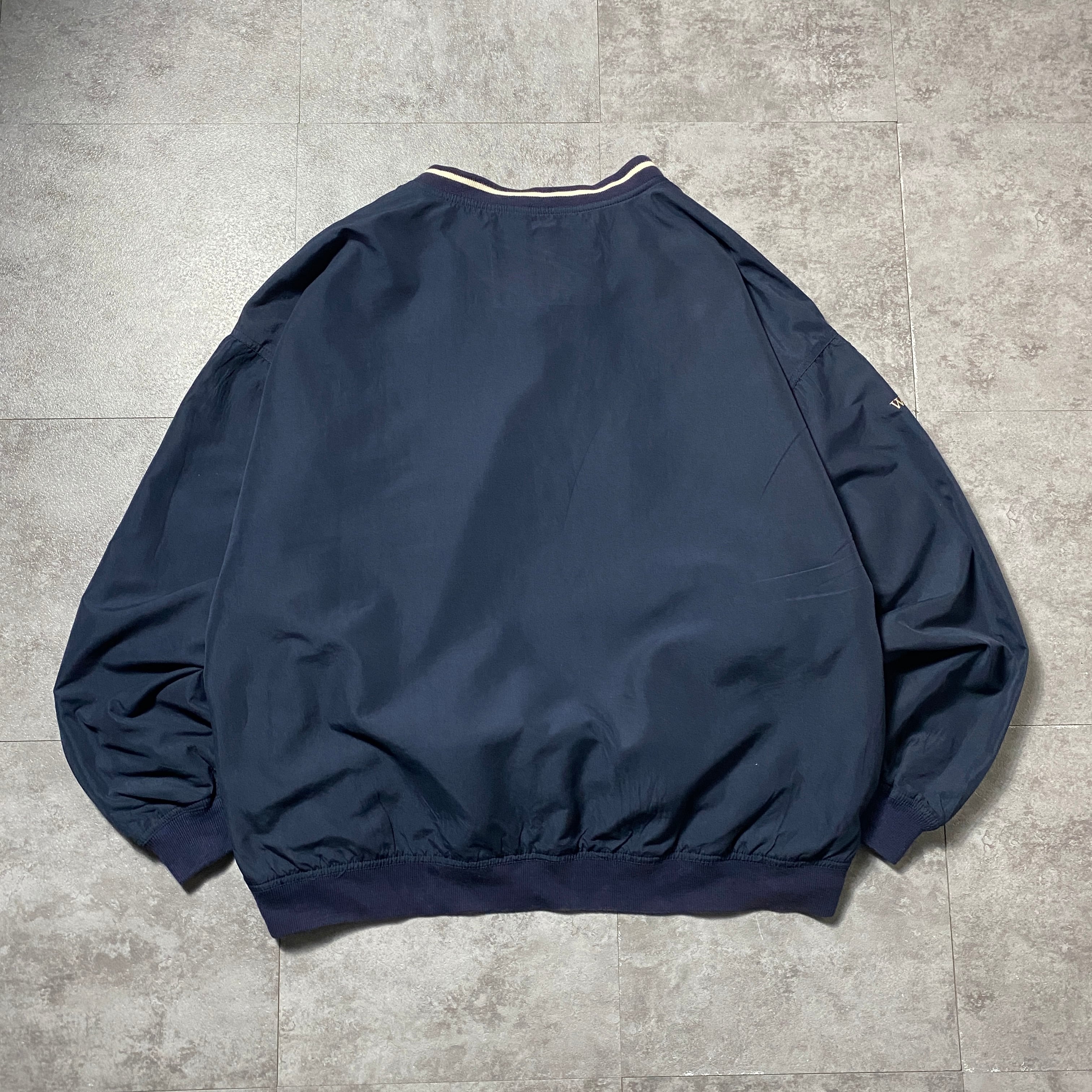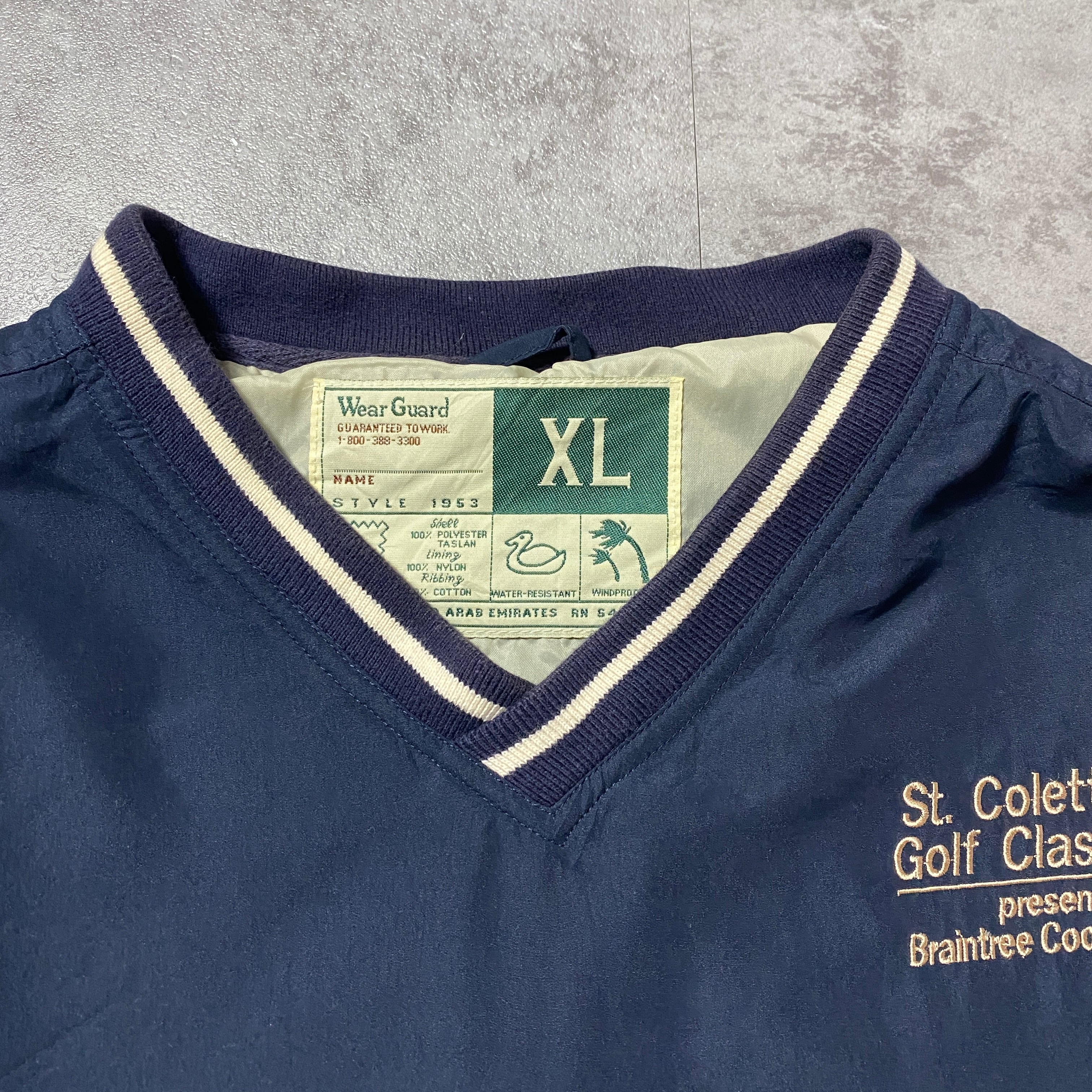 【Size:XL】90's Wear Guard 刺繍企業ロゴ ラインリブ ネイビー ナイロンプルオーバー