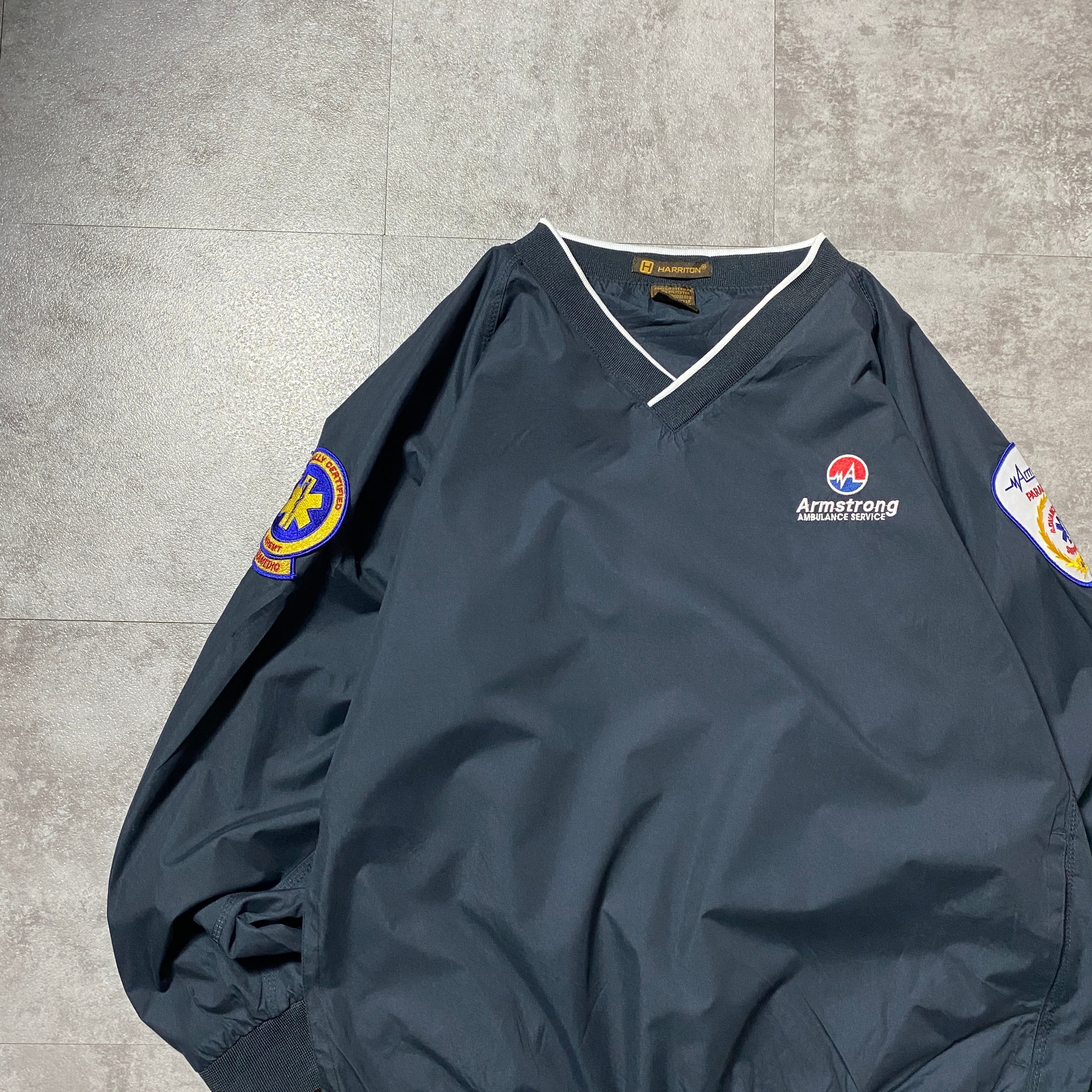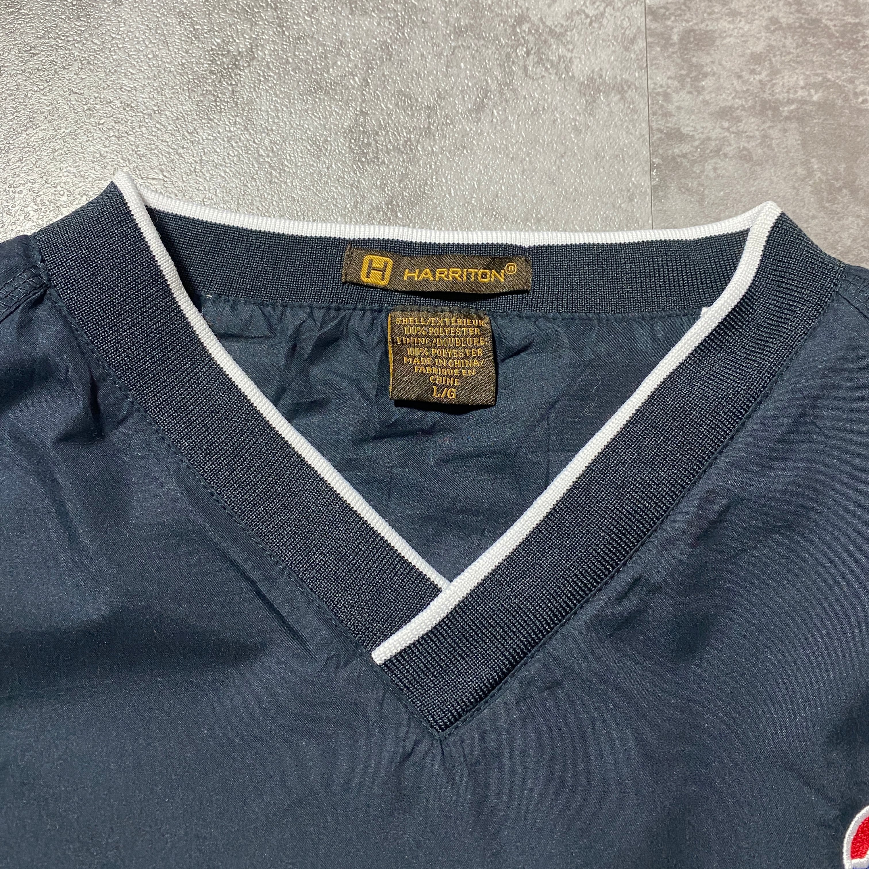 90's HARRITON 刺繍ワンポイント 企業ロゴ アームワッペン ラインリブ ブラック 黒 ナイロンプルオーバー