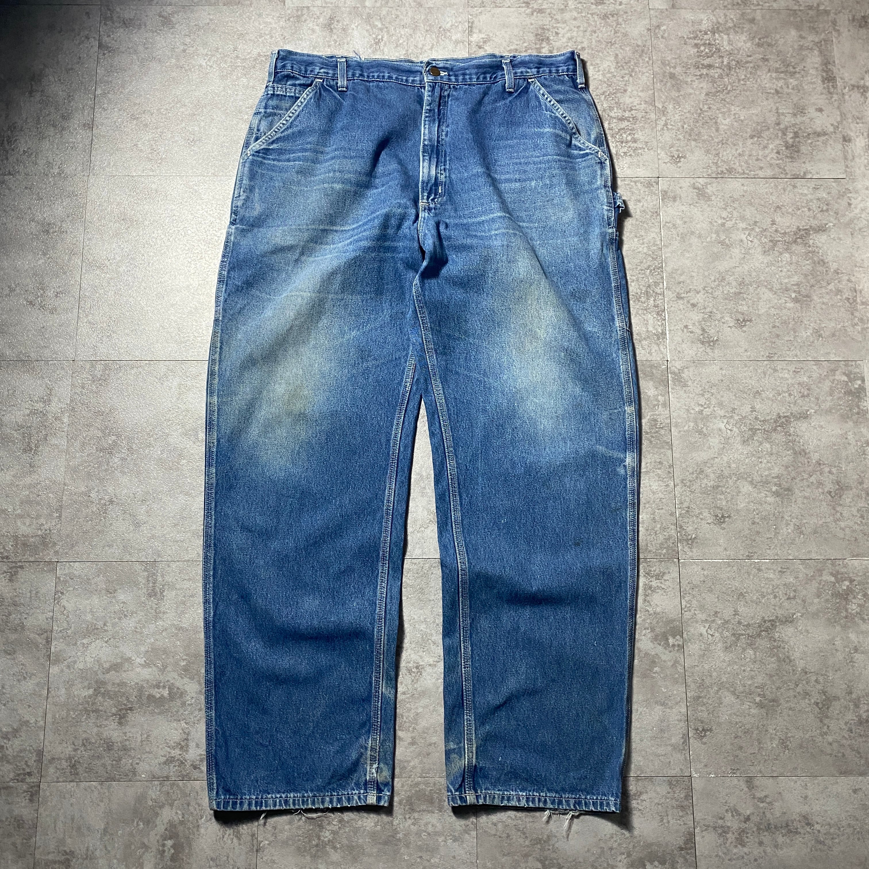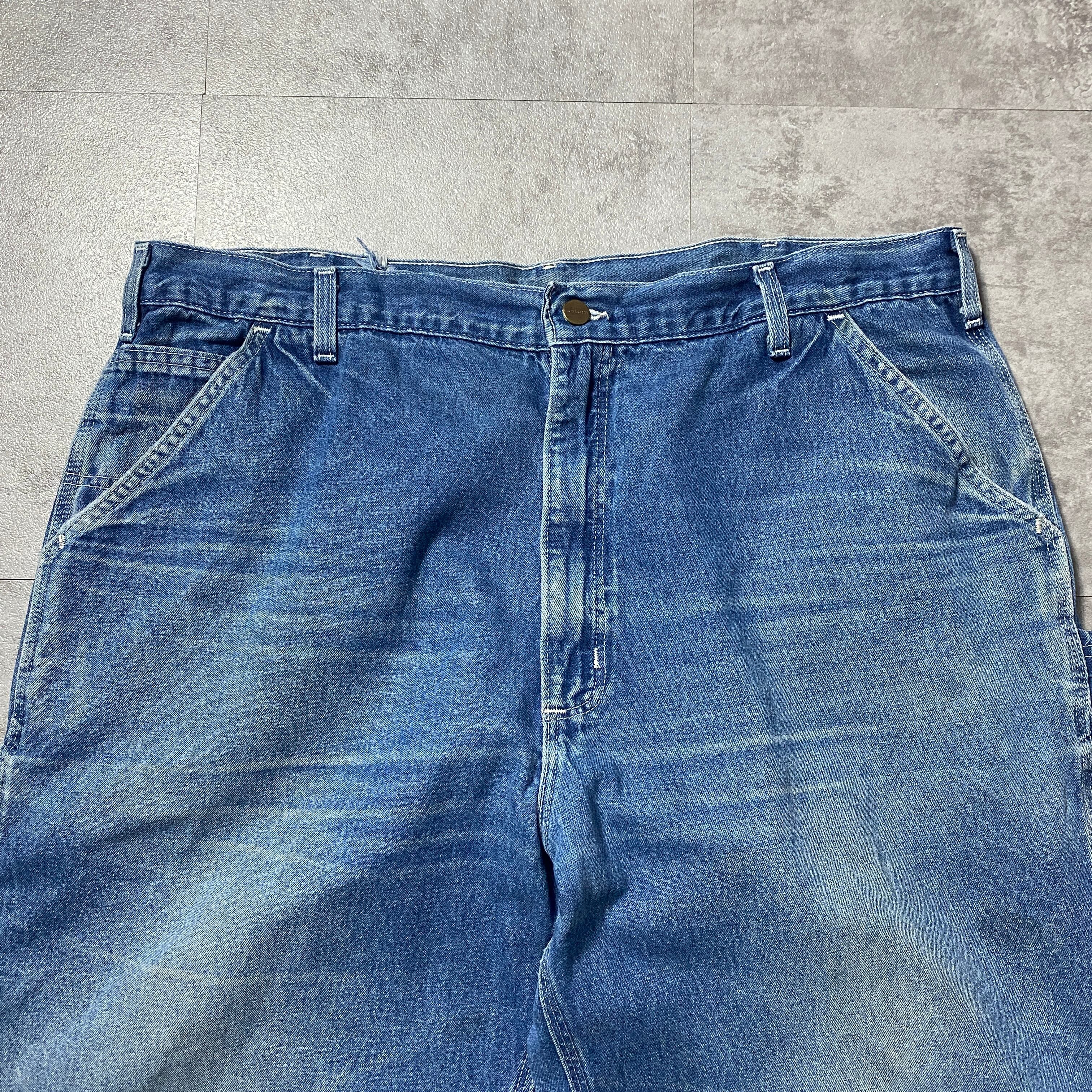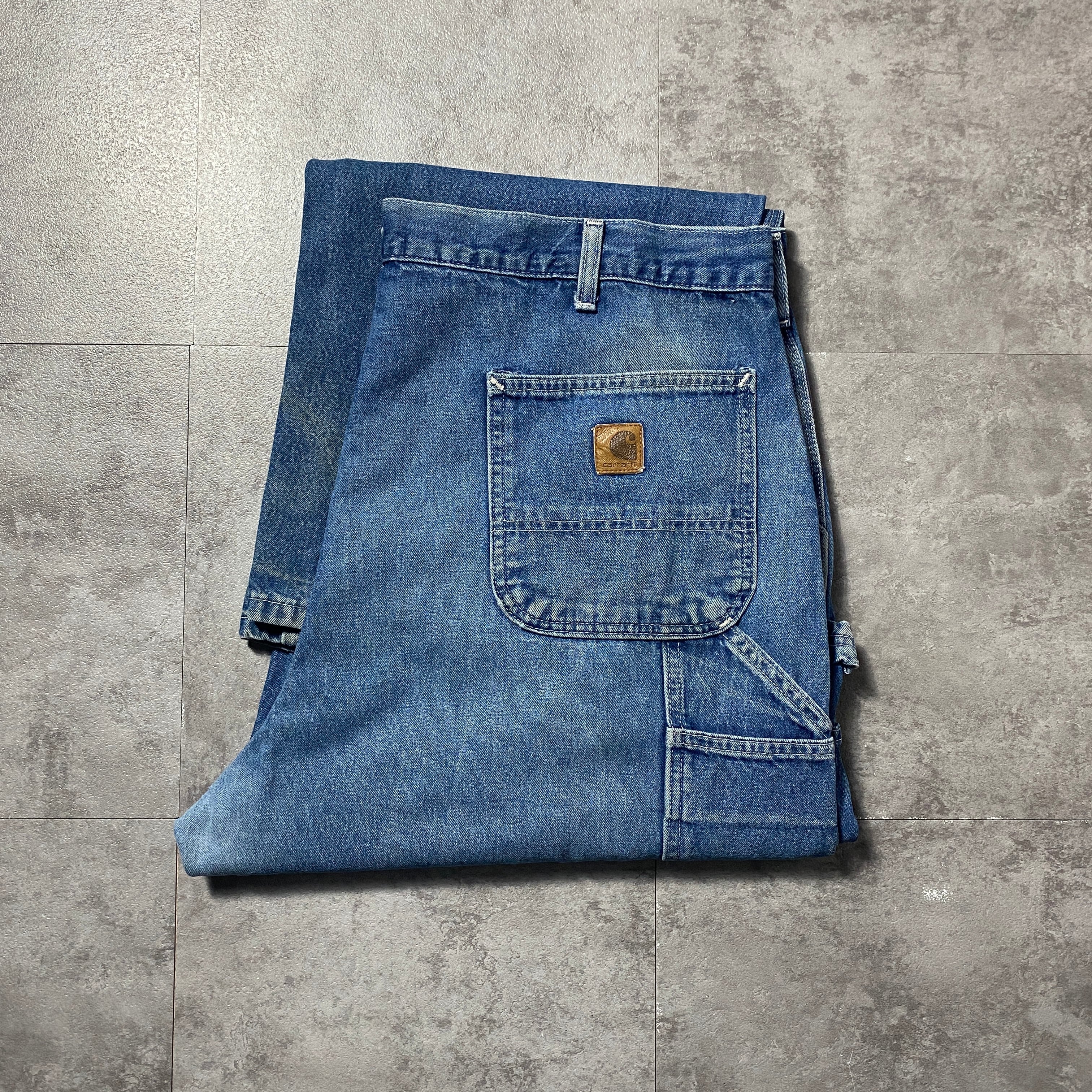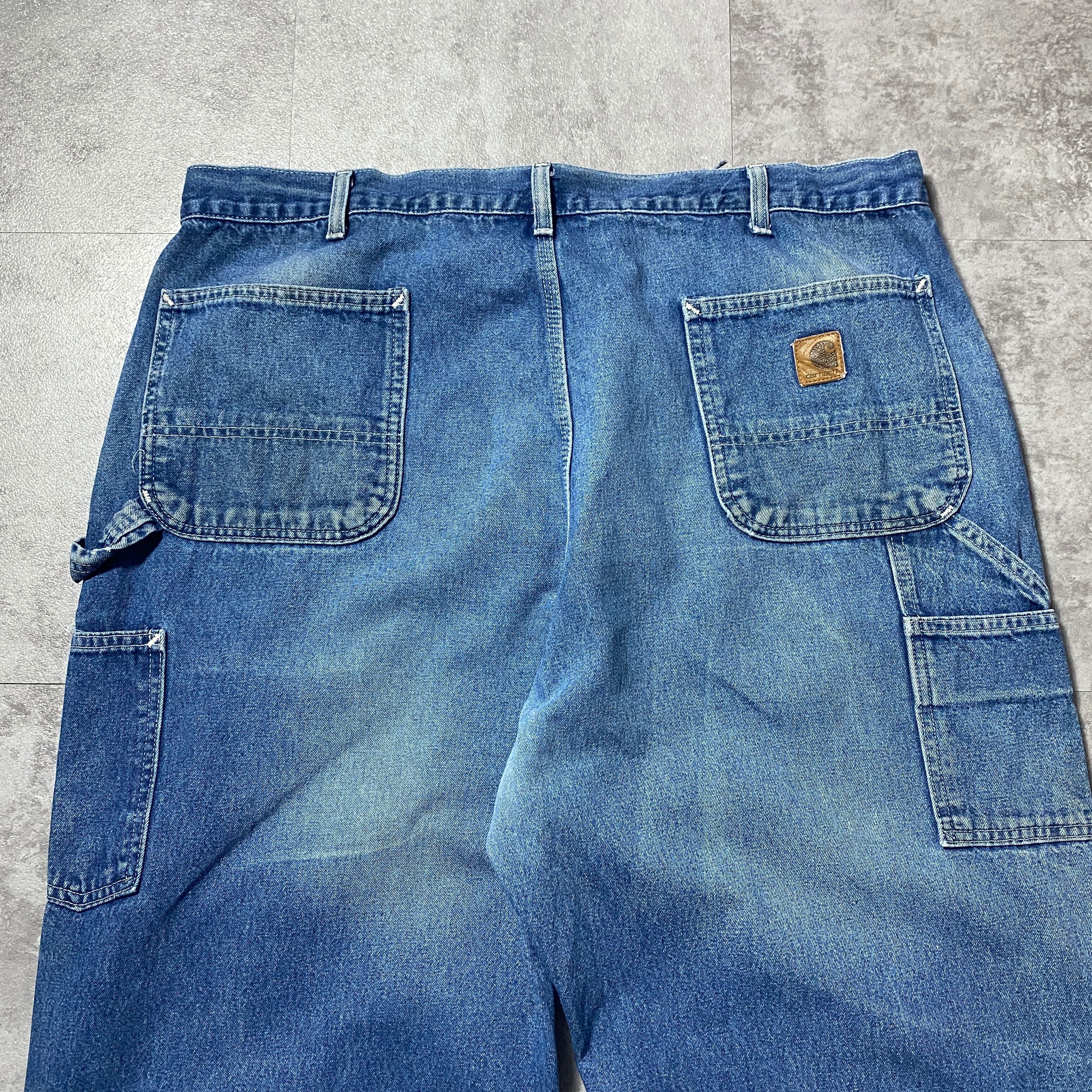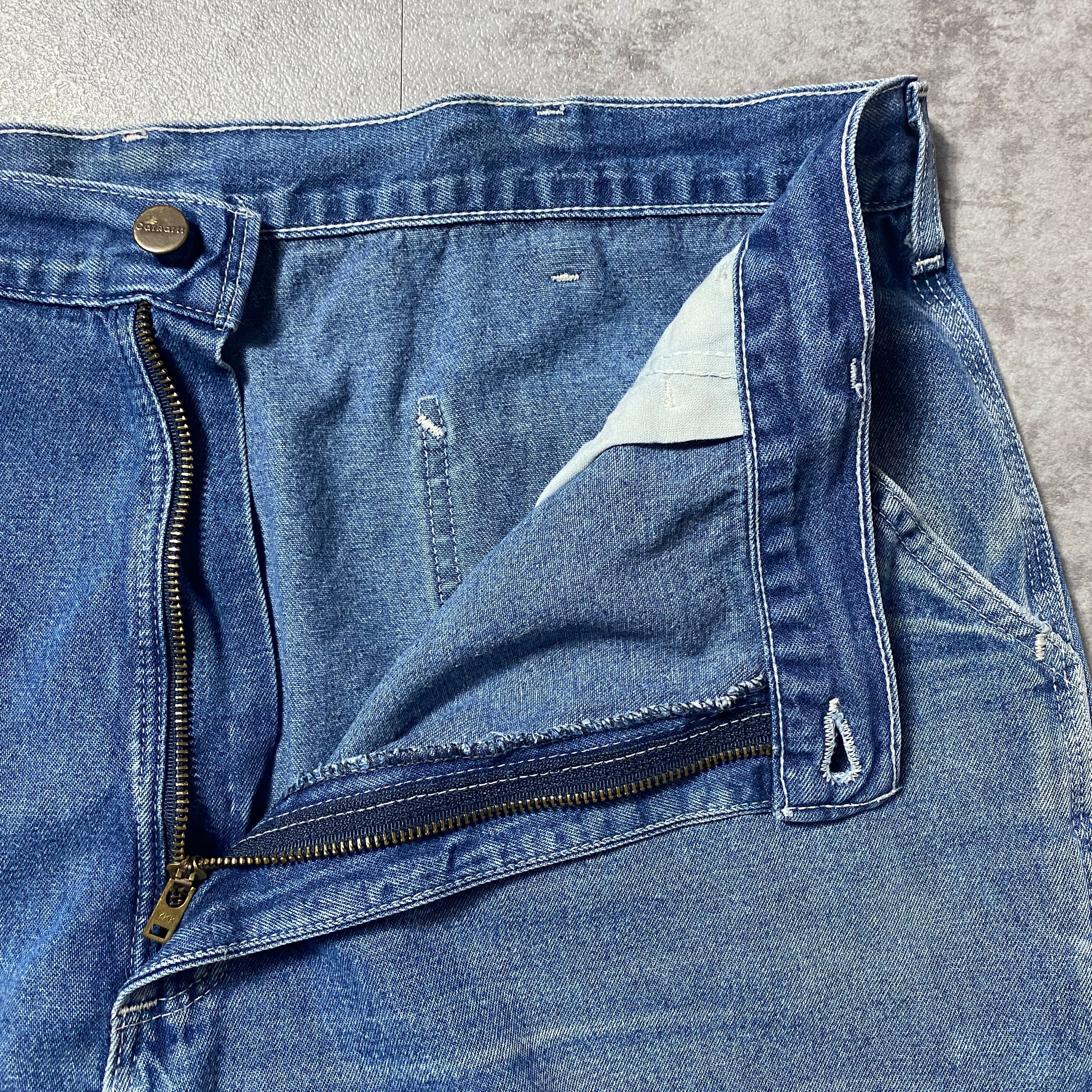 【42×34】00's carhartt カーハート ジッパーフライ レザーパッチ 縦落ち ヒゲ デニム ペインターパンツ