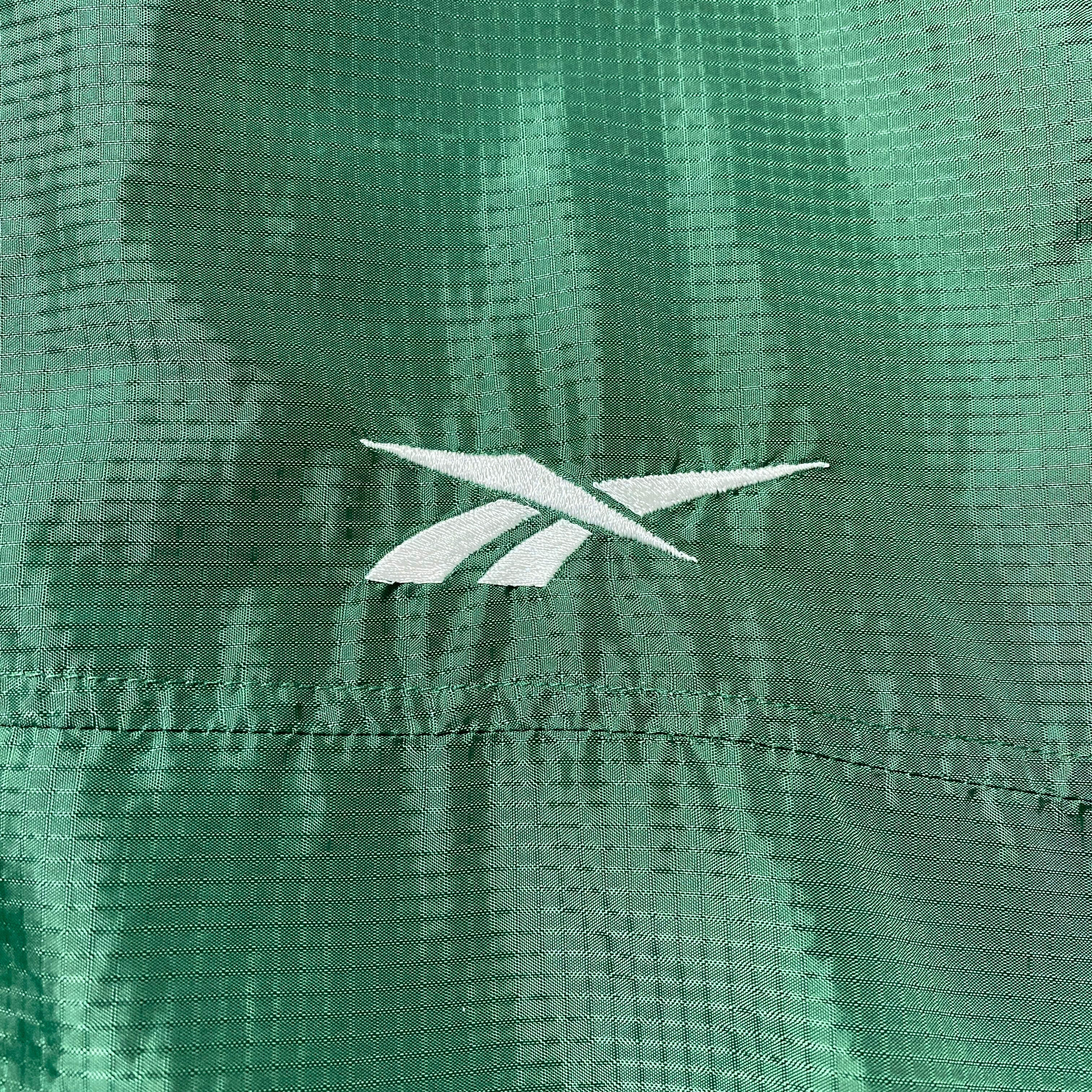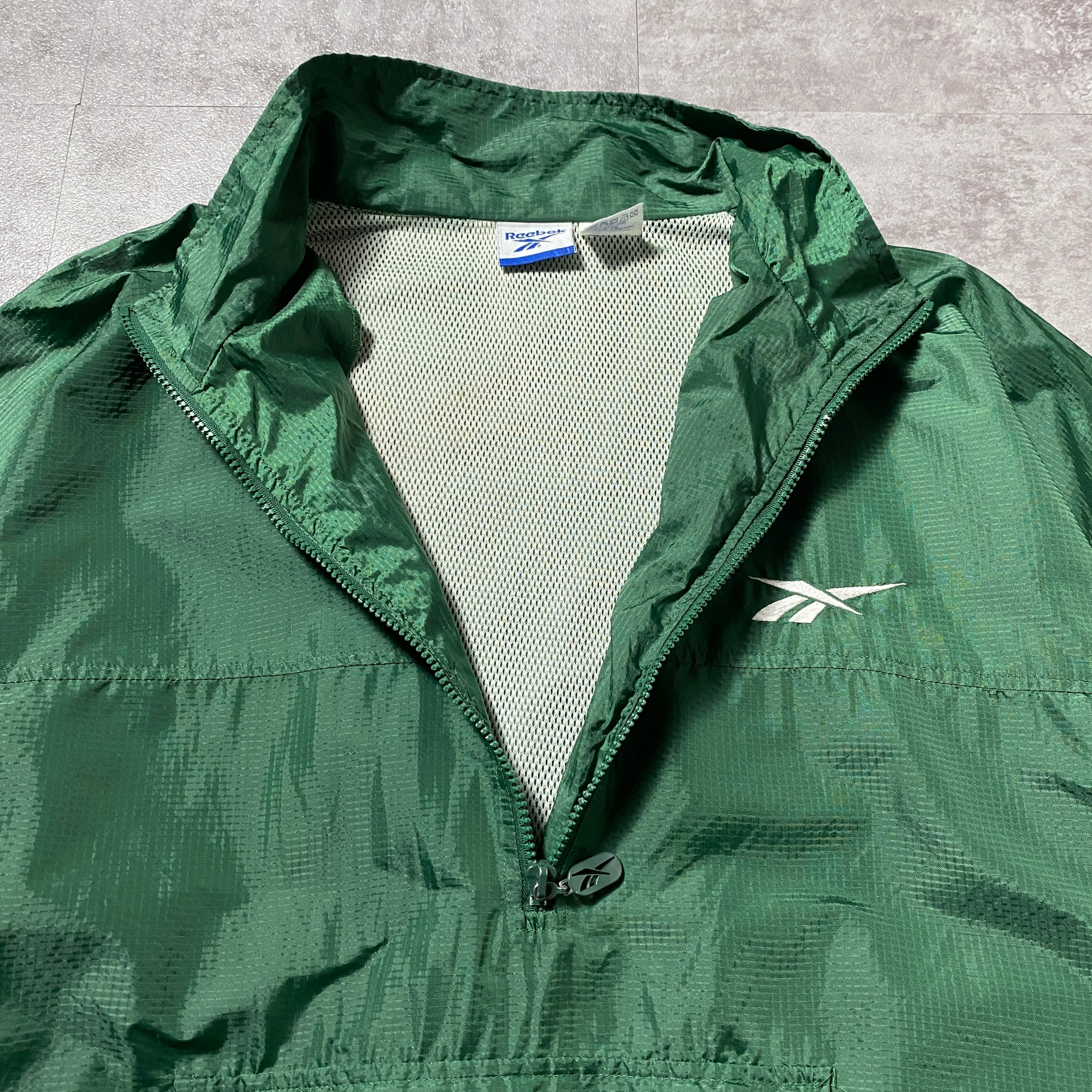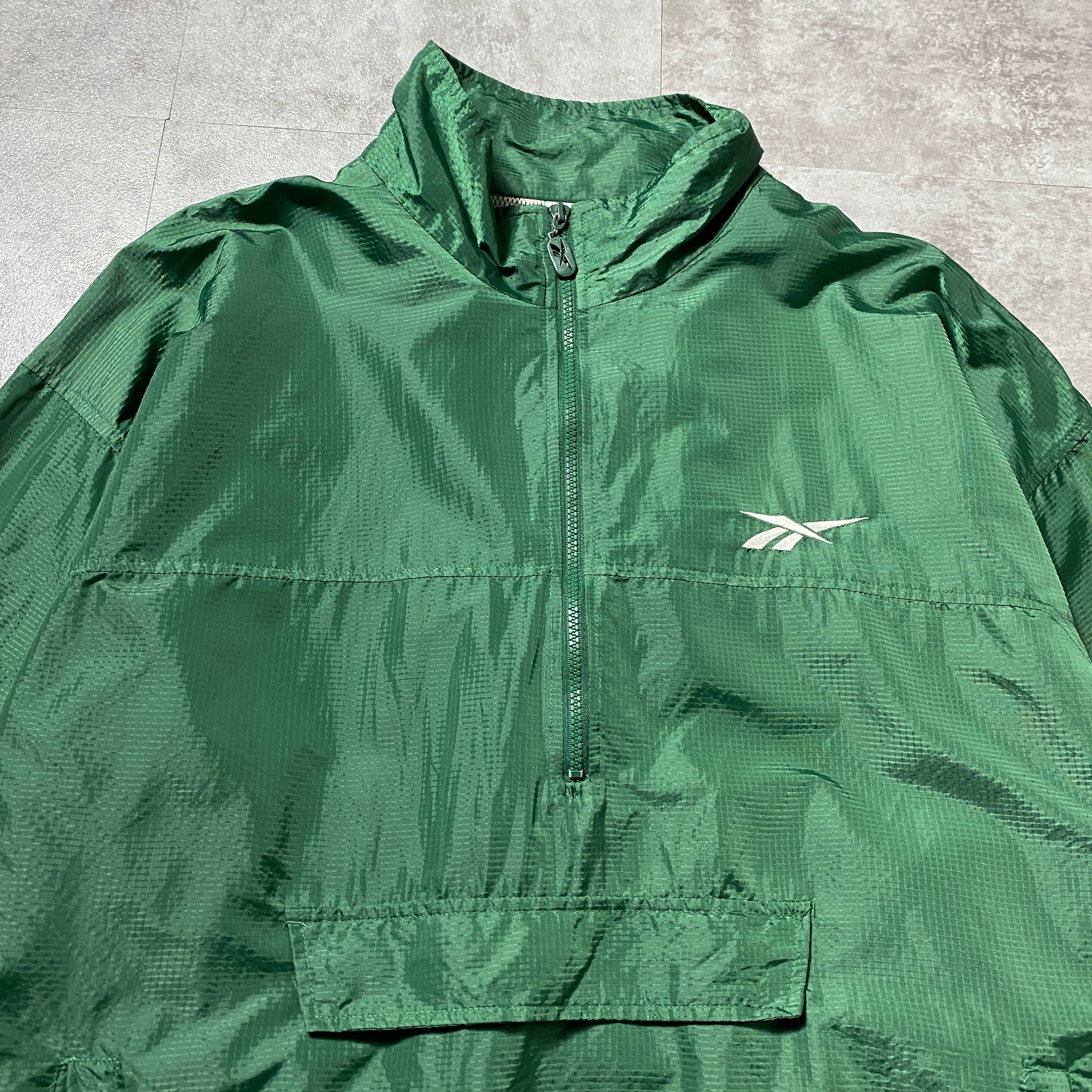 【Size:XL】90's Reebok リーボック ハーフジップ 刺繍ワンポイント ベクターロゴ グリーン ナイロンプルオーバー