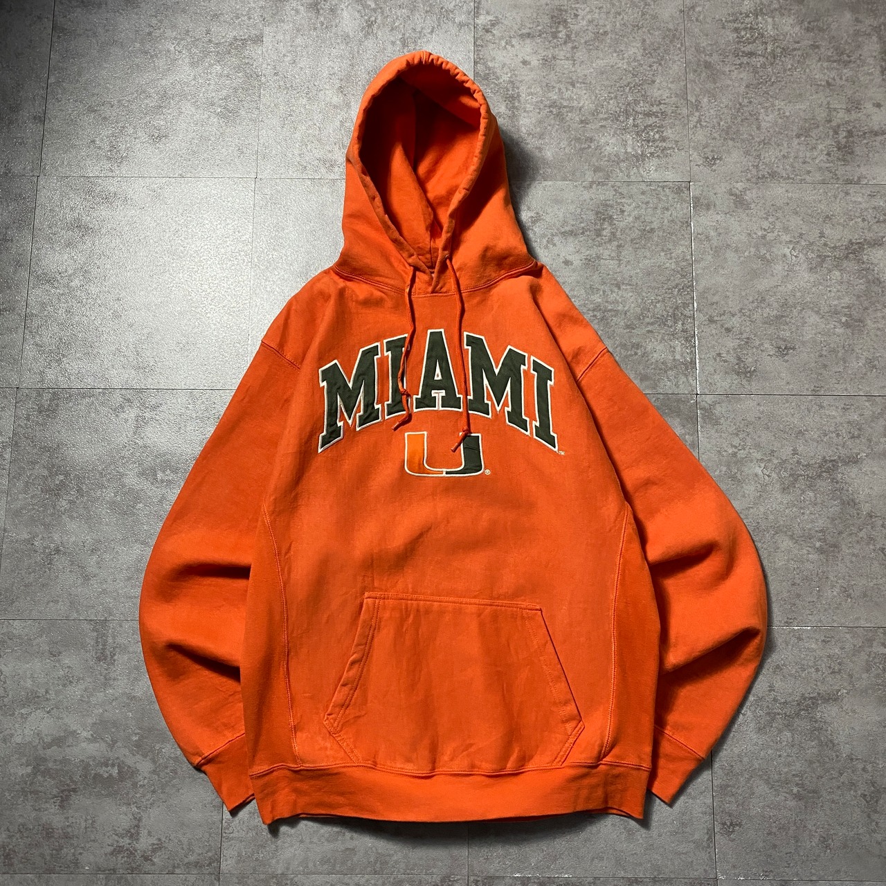 90's 00's STEVE&BARRY'S NCAA MIAMI Split U スティーブアンドバリーズ マイアミ大学 カレッジロゴ リバースウィーブ オレンジ スウェット パーカー