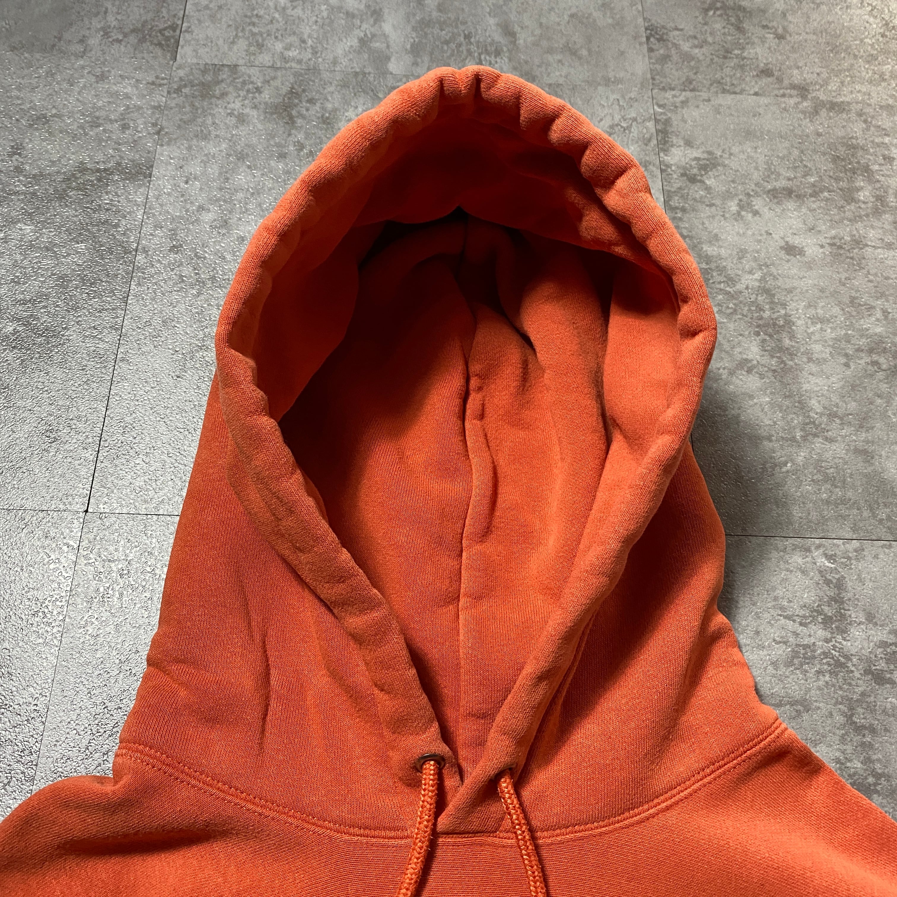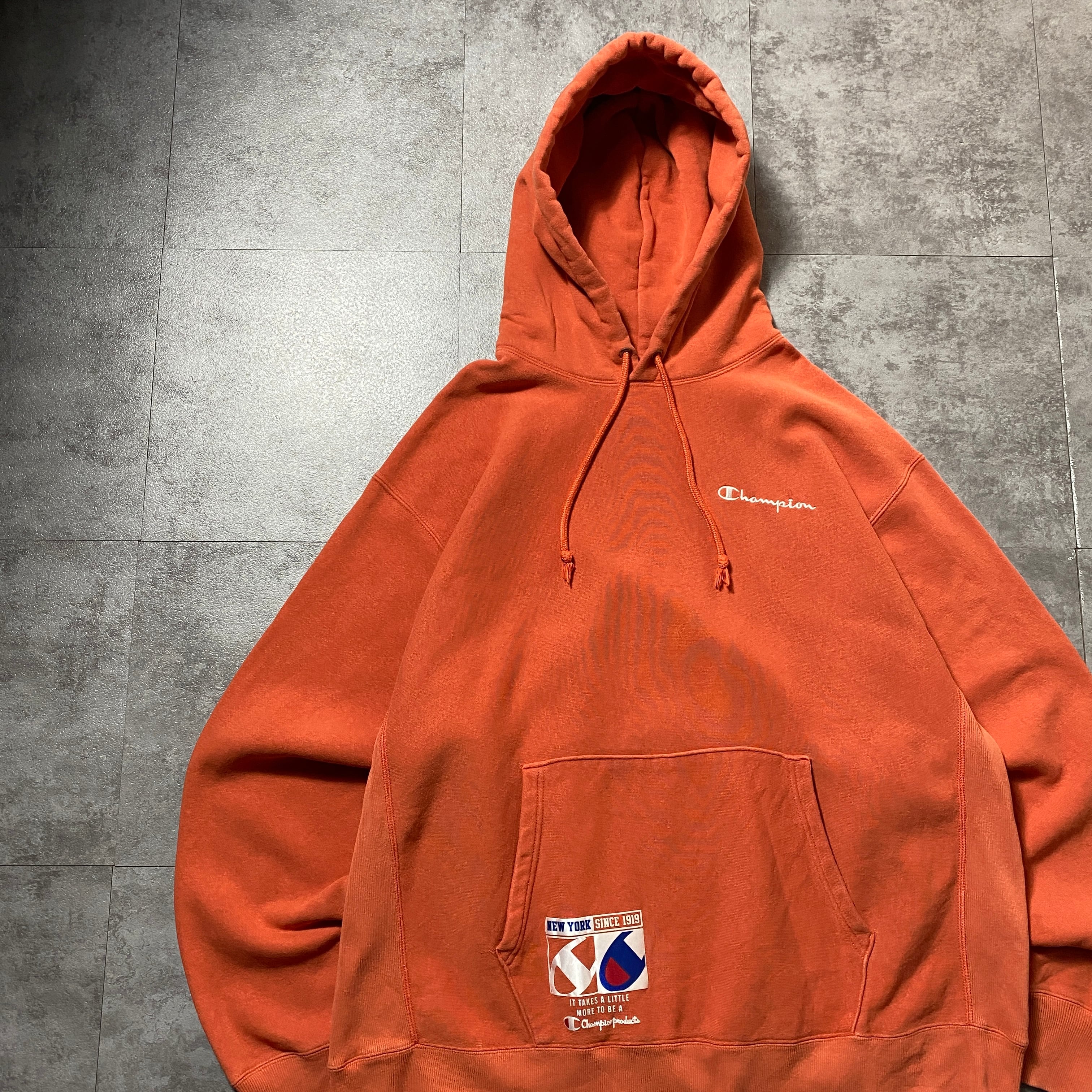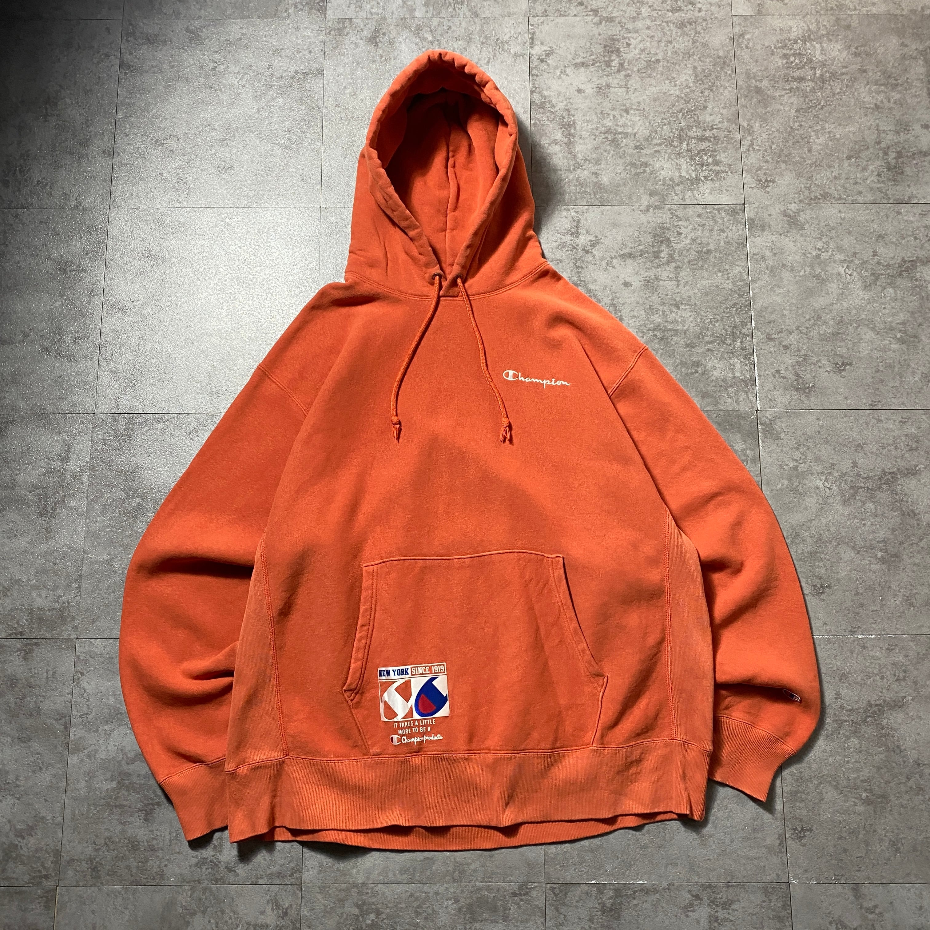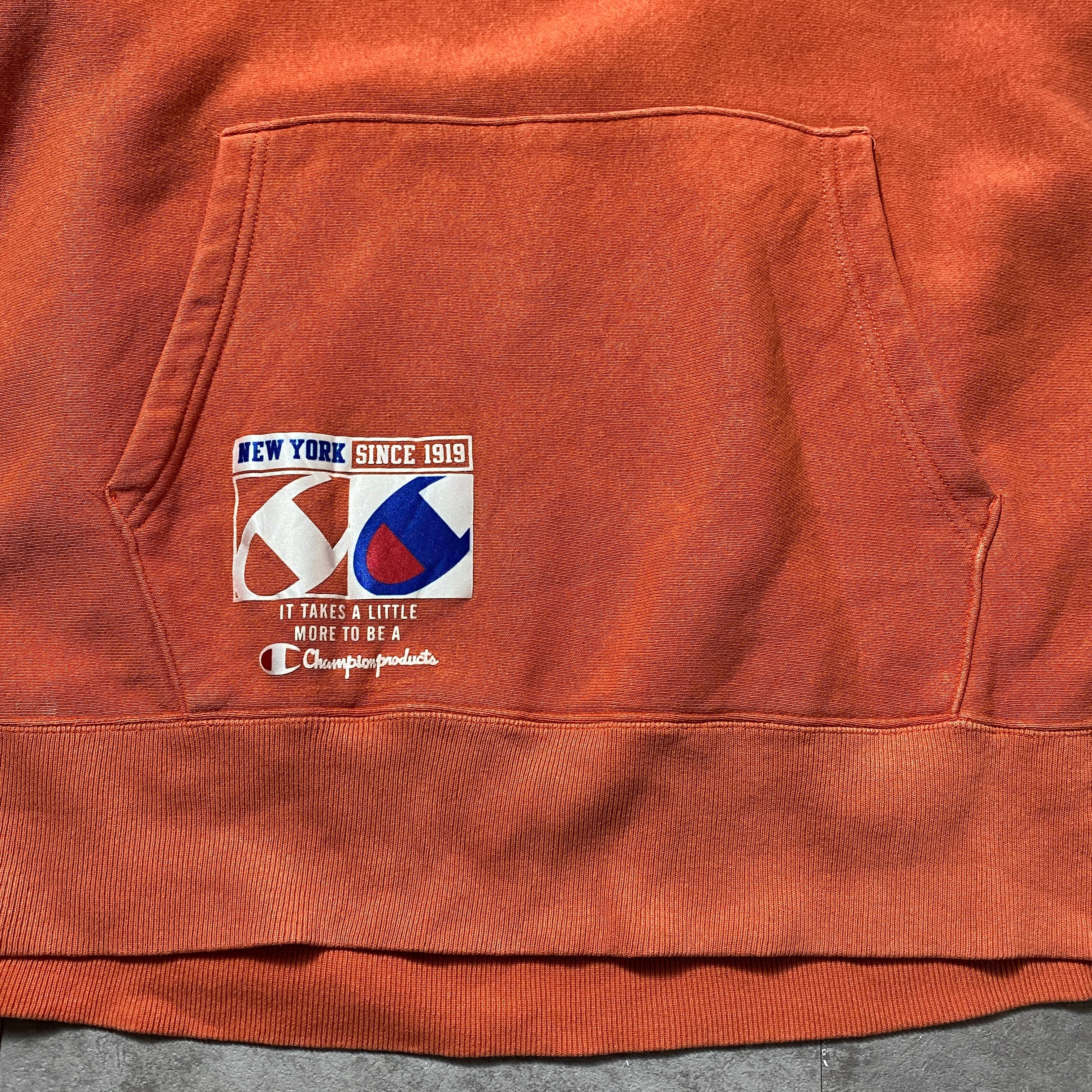 【Size:XL】00's Champion チャンピオン リバースウィーブ 刺繍ワンポイント プリント入りカンガルーポケット オレンジ スウェット パーカー
