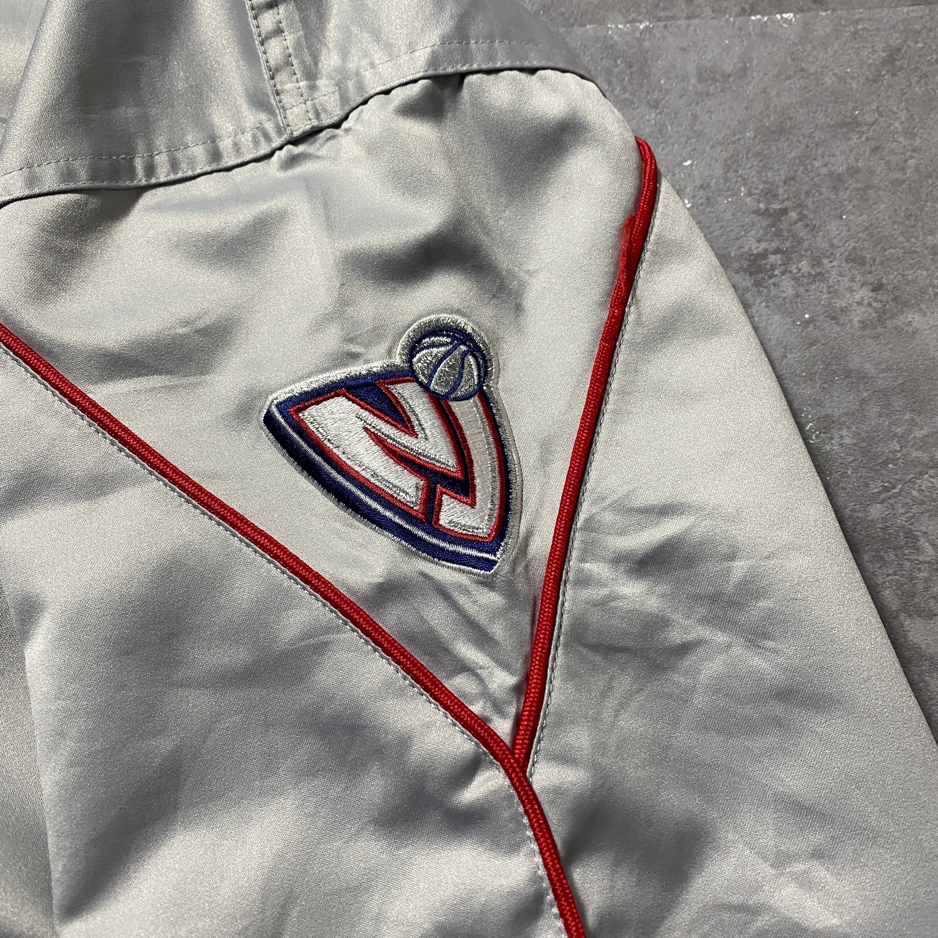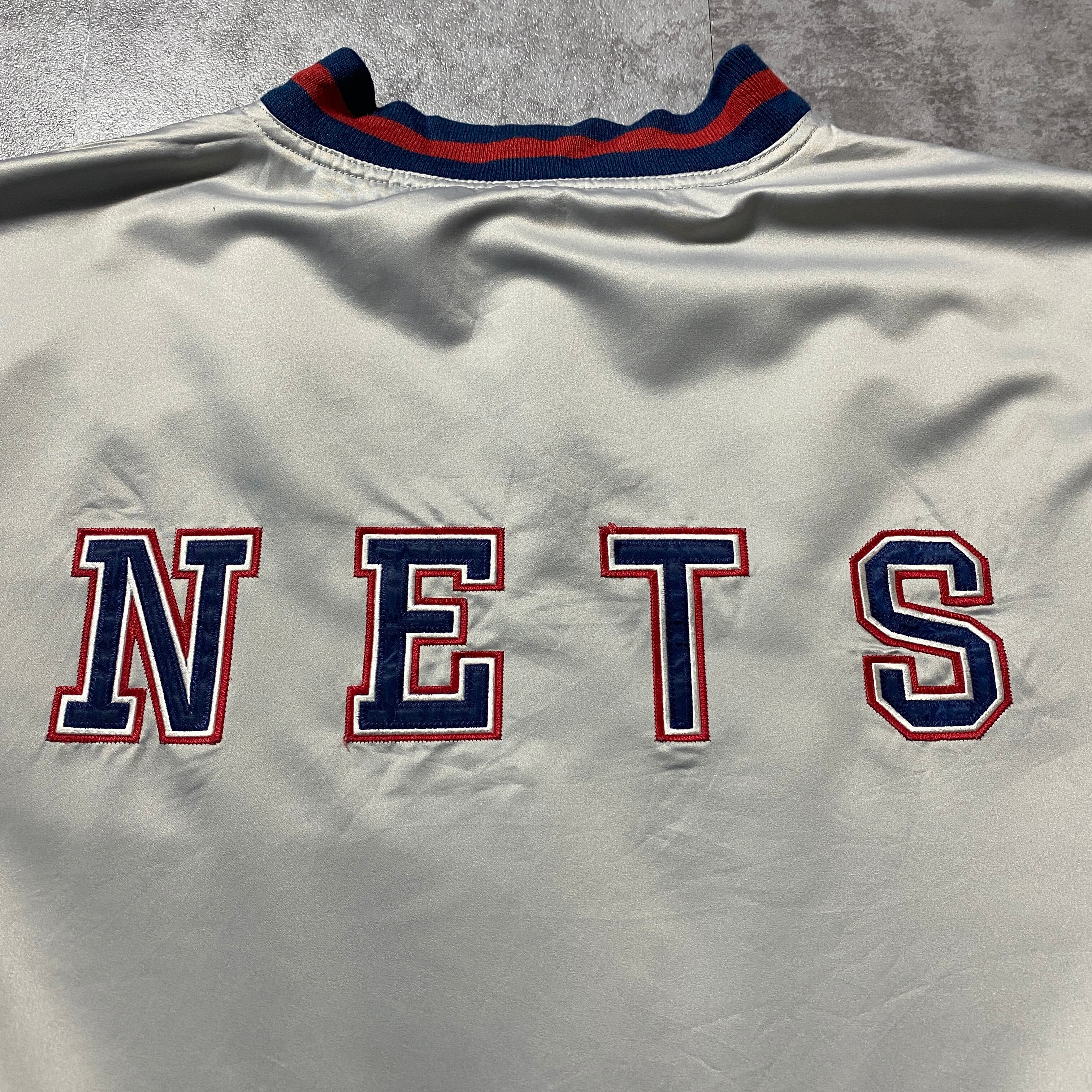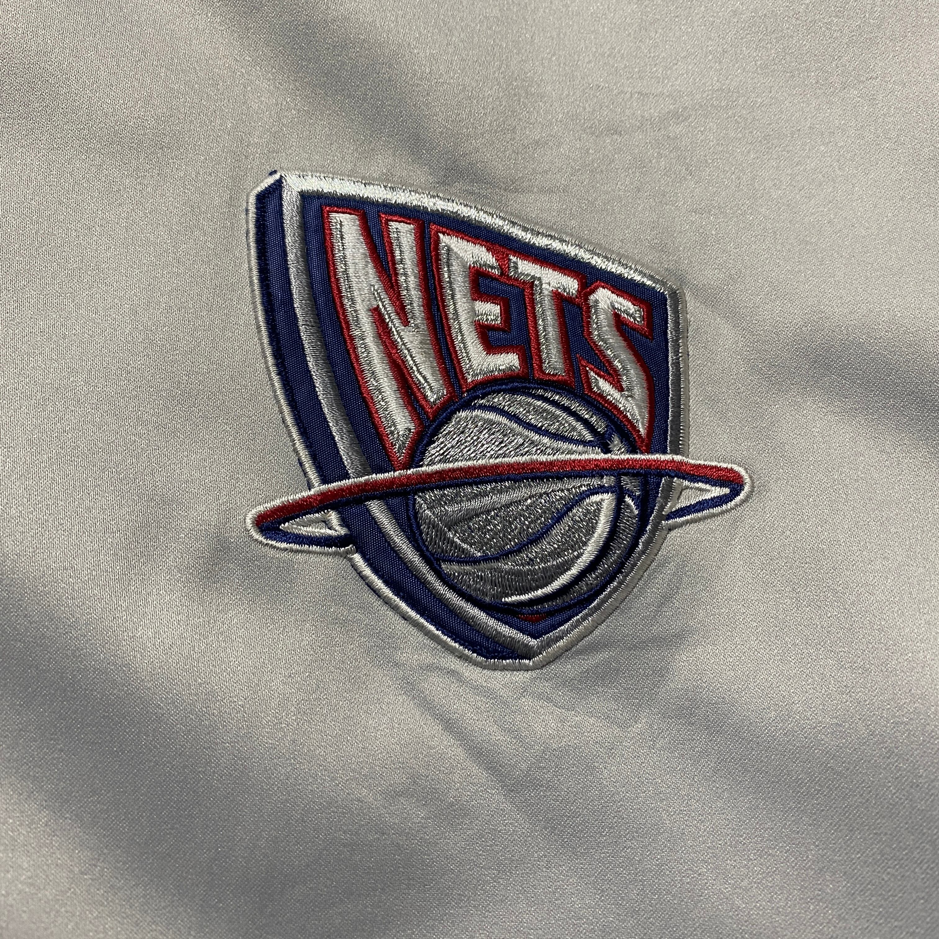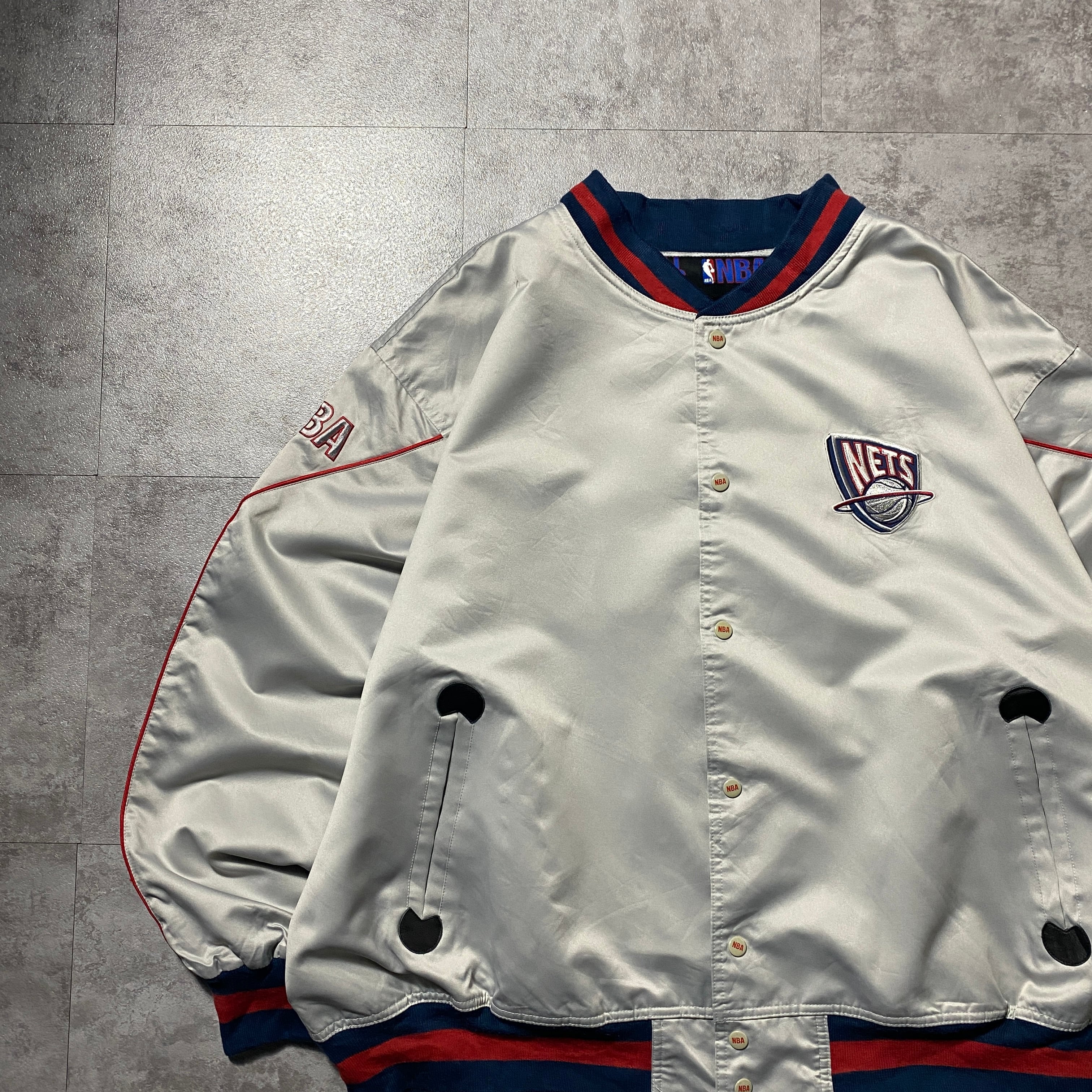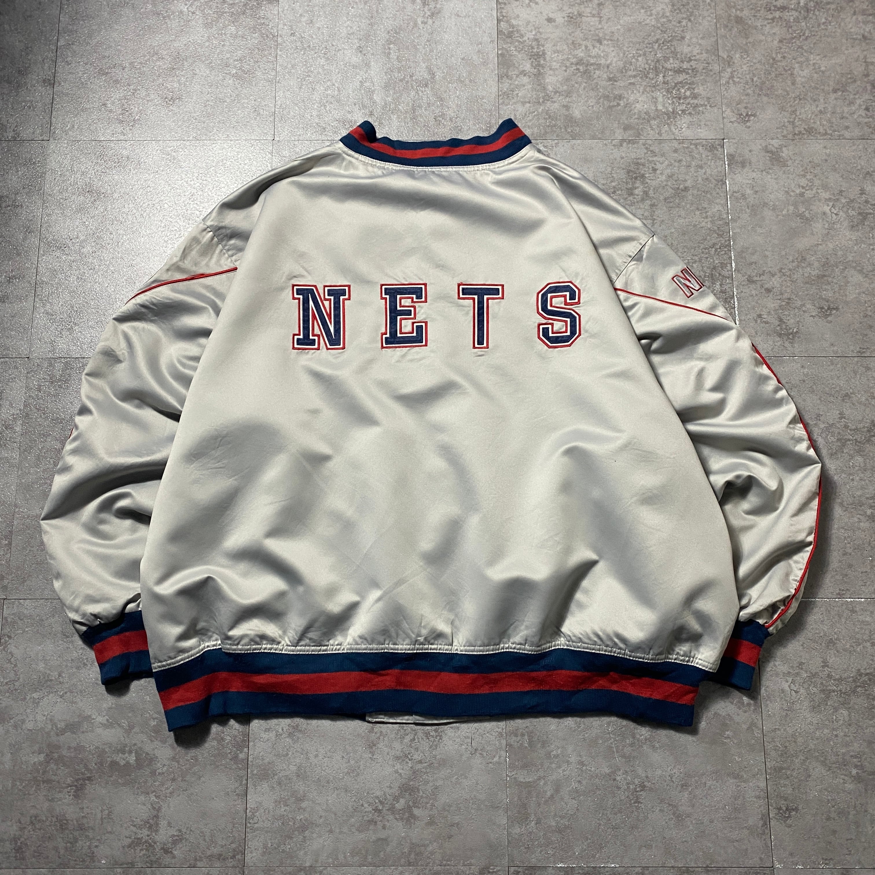 【Size:3XL】90's NBA New Jersey NETS ニュージャージー・ネッツ 刺繍両面ロゴ ラインリブ シルバー ナイロンジャケット スタジャン