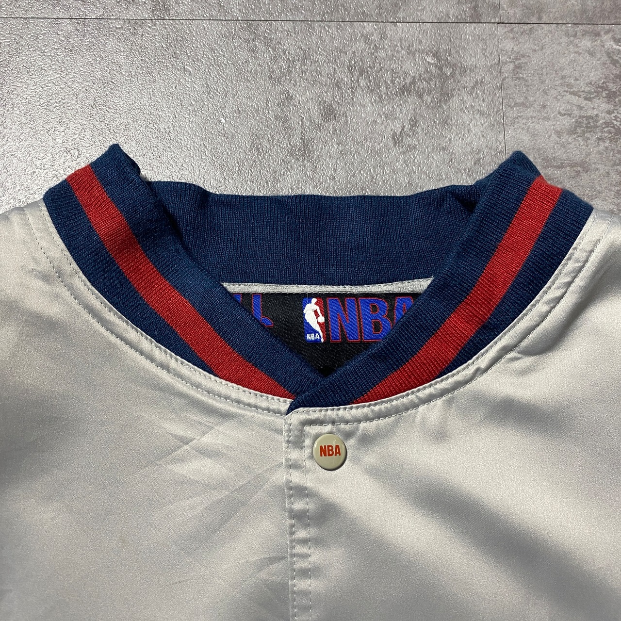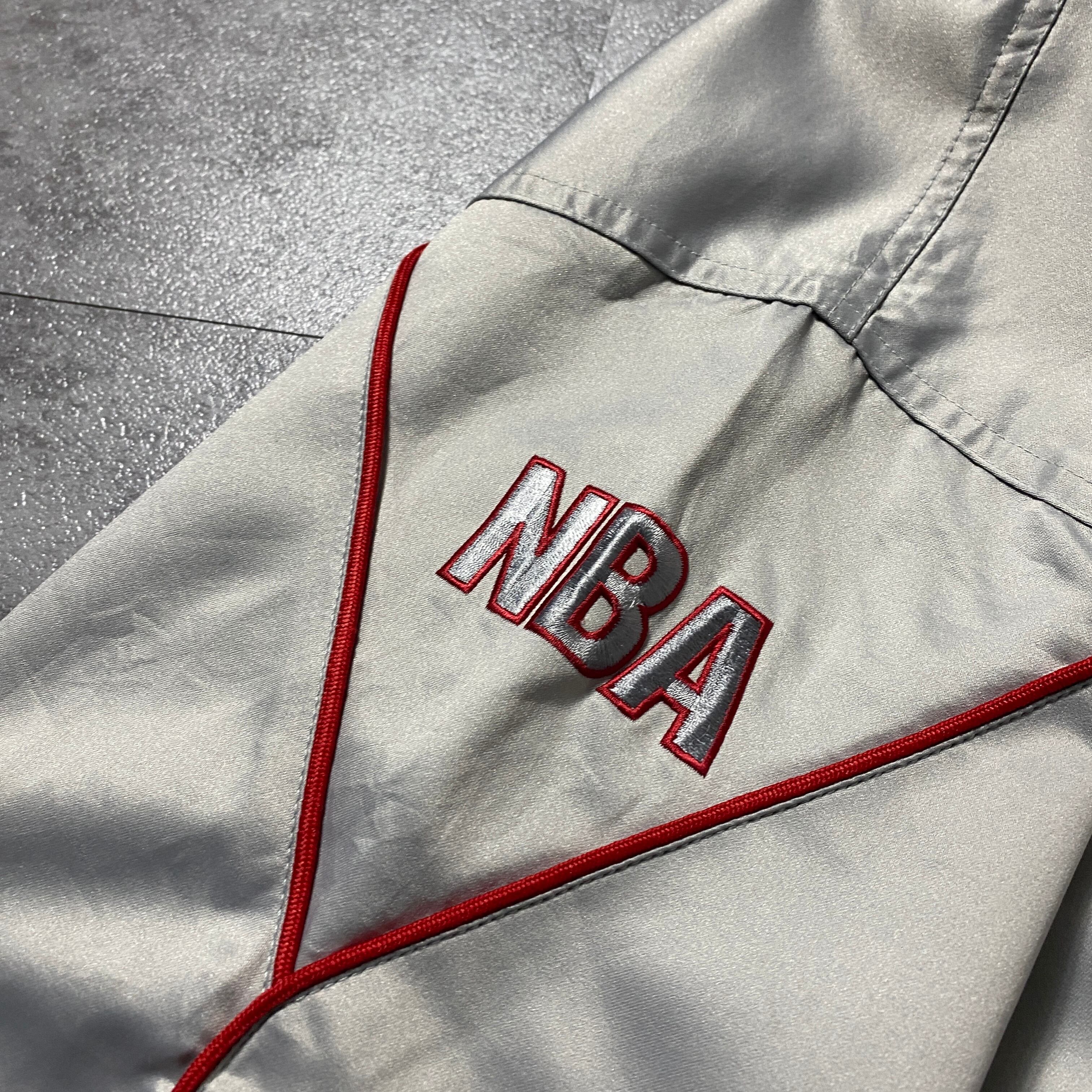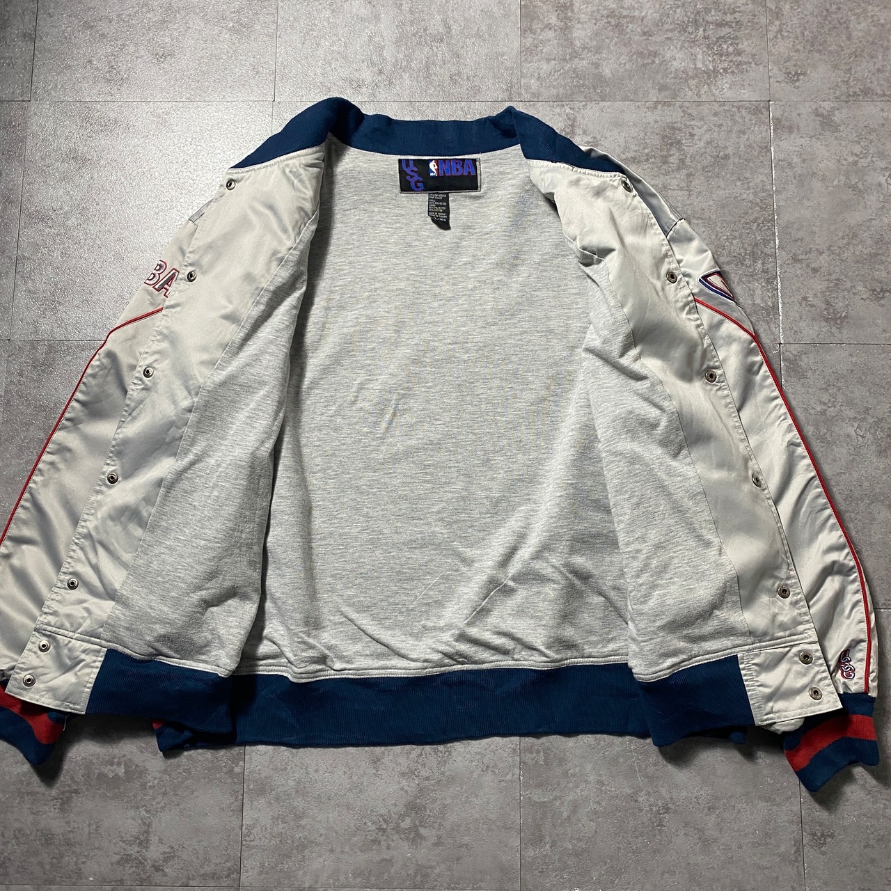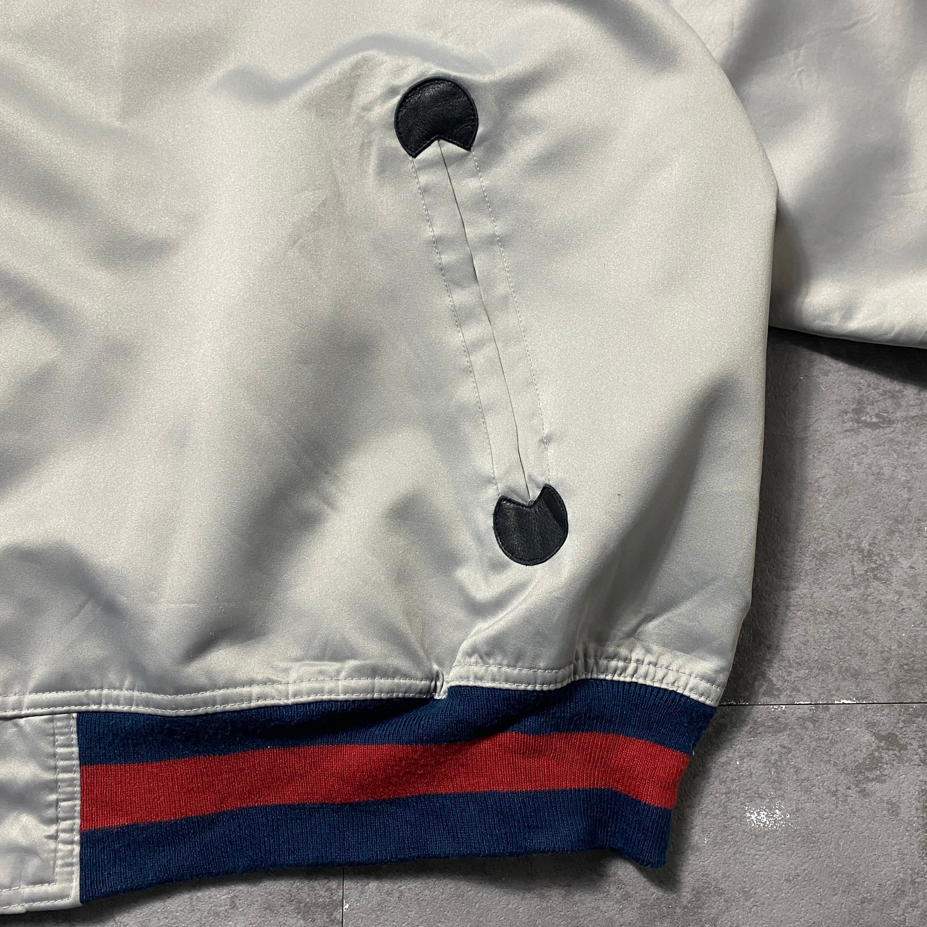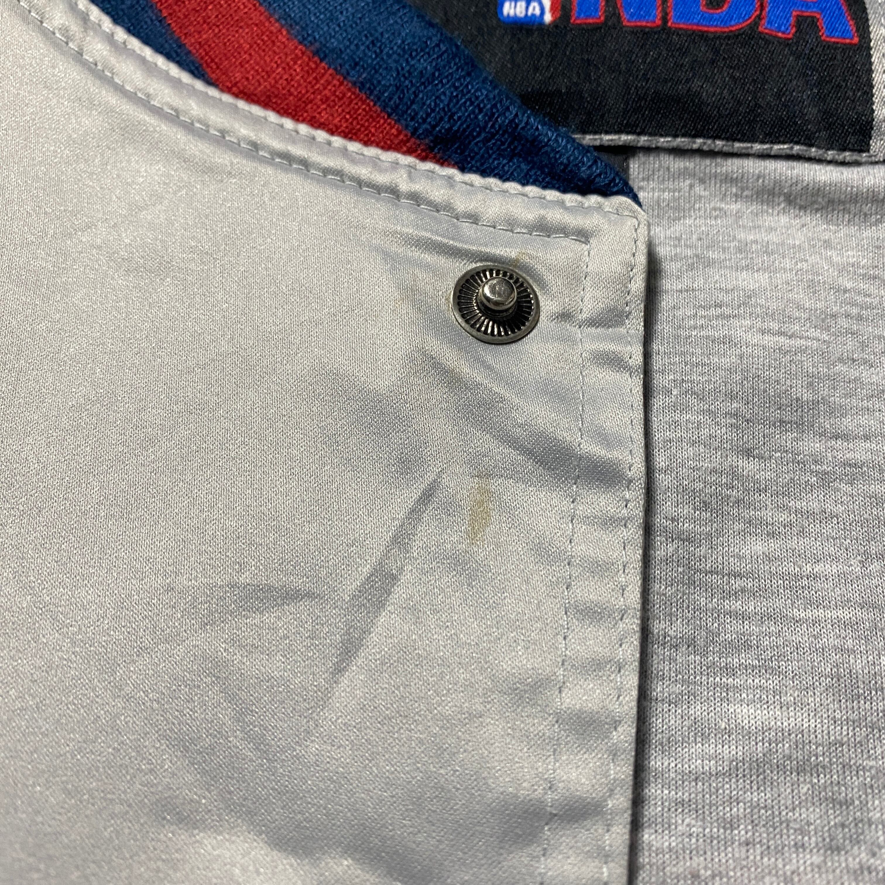 【Size:3XL】90's NBA New Jersey NETS ニュージャージー・ネッツ 刺繍両面ロゴ ラインリブ シルバー ナイロンジャケット スタジャン