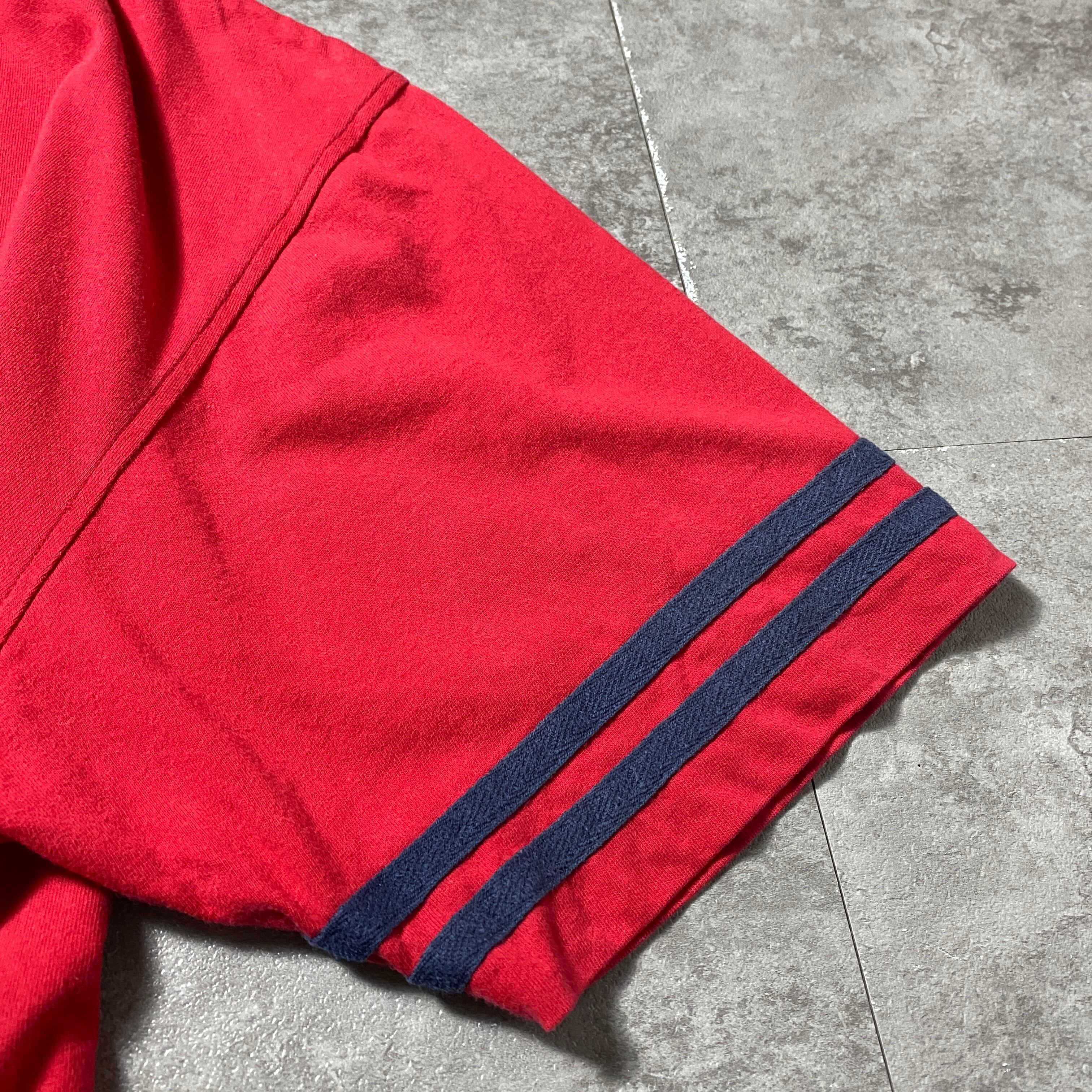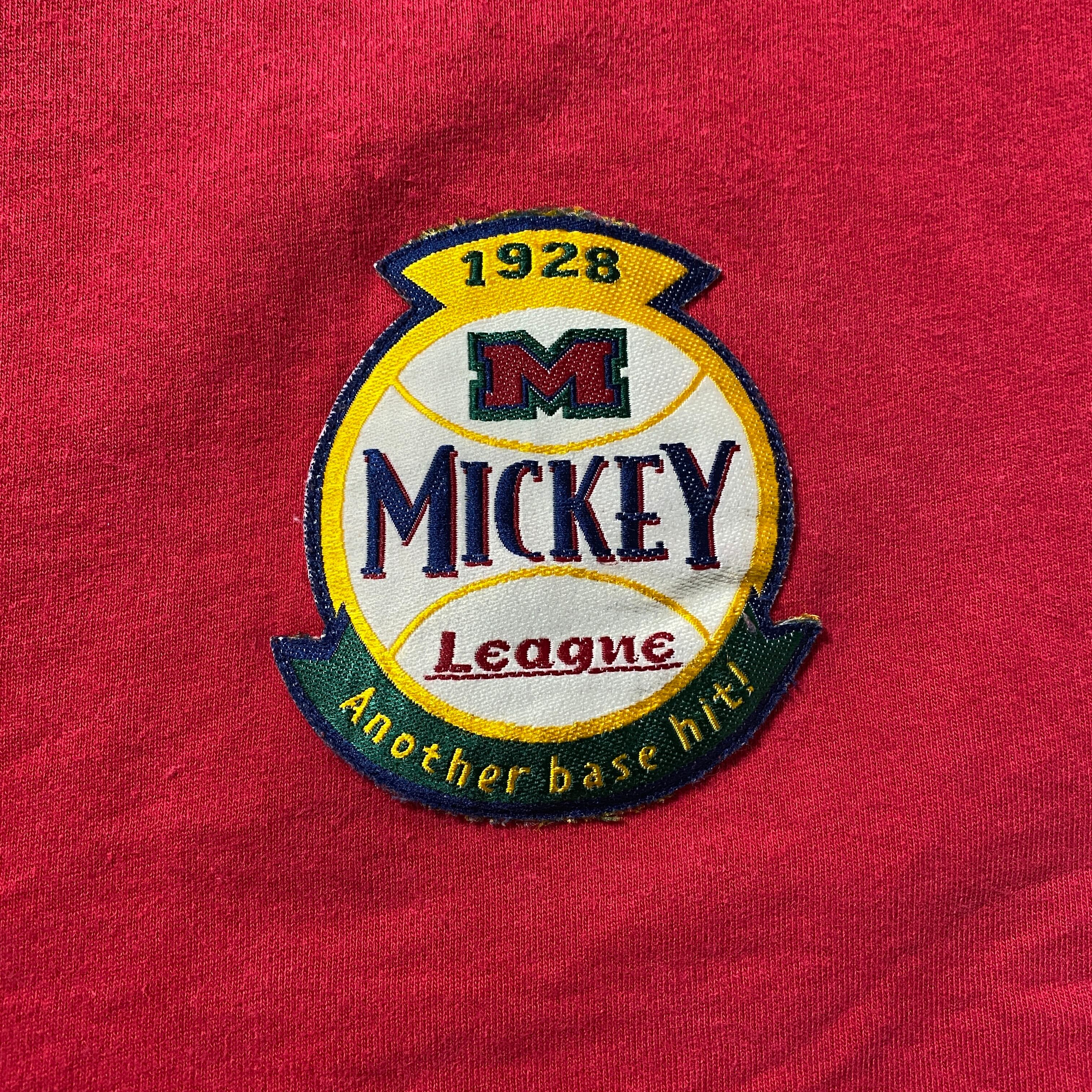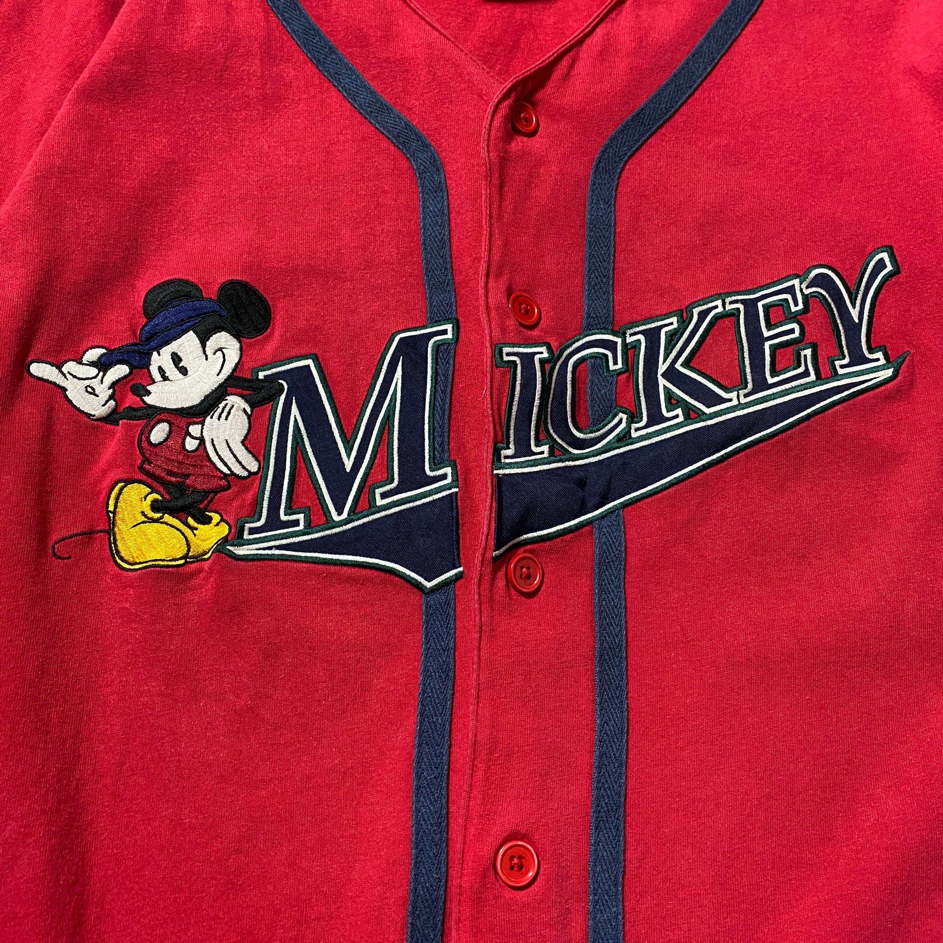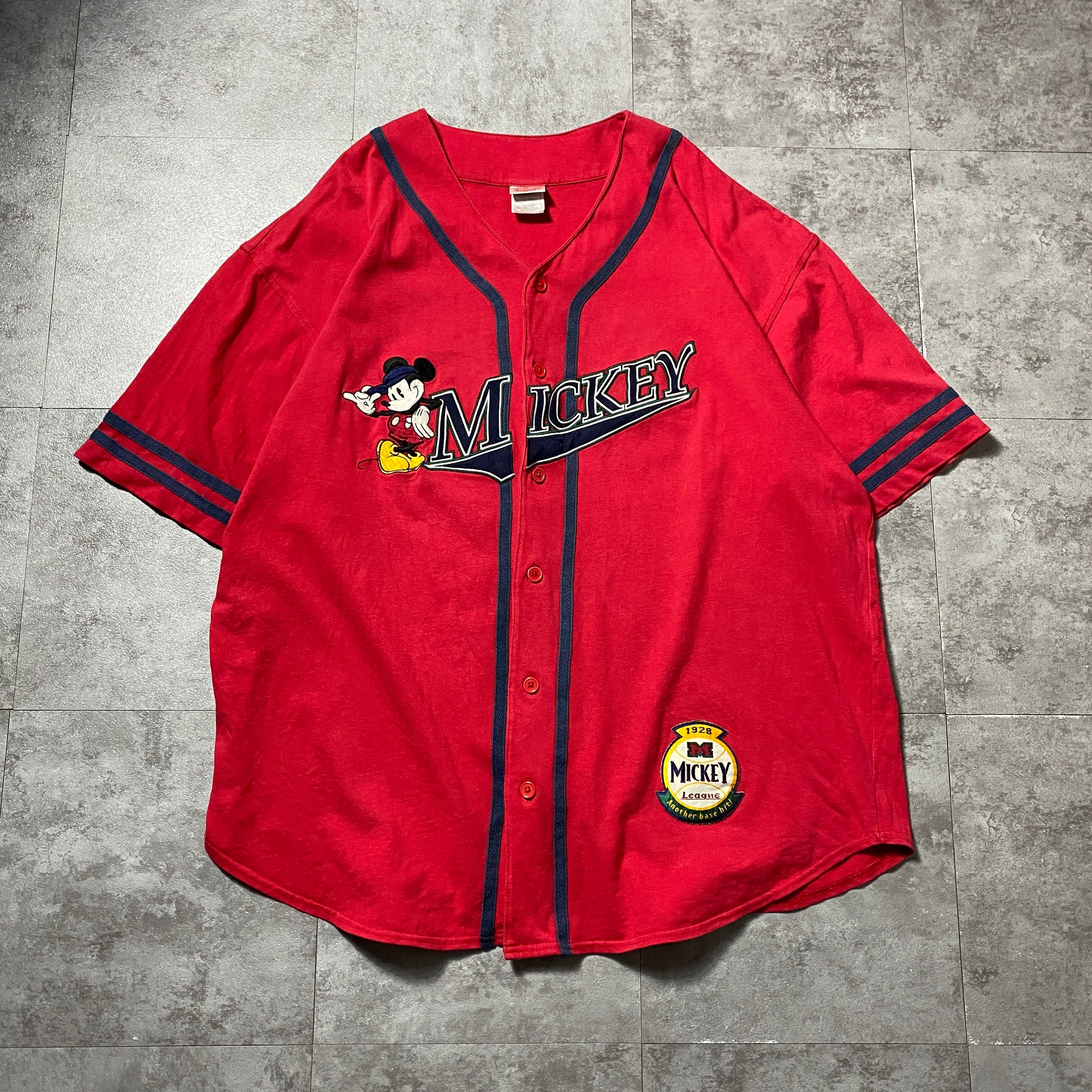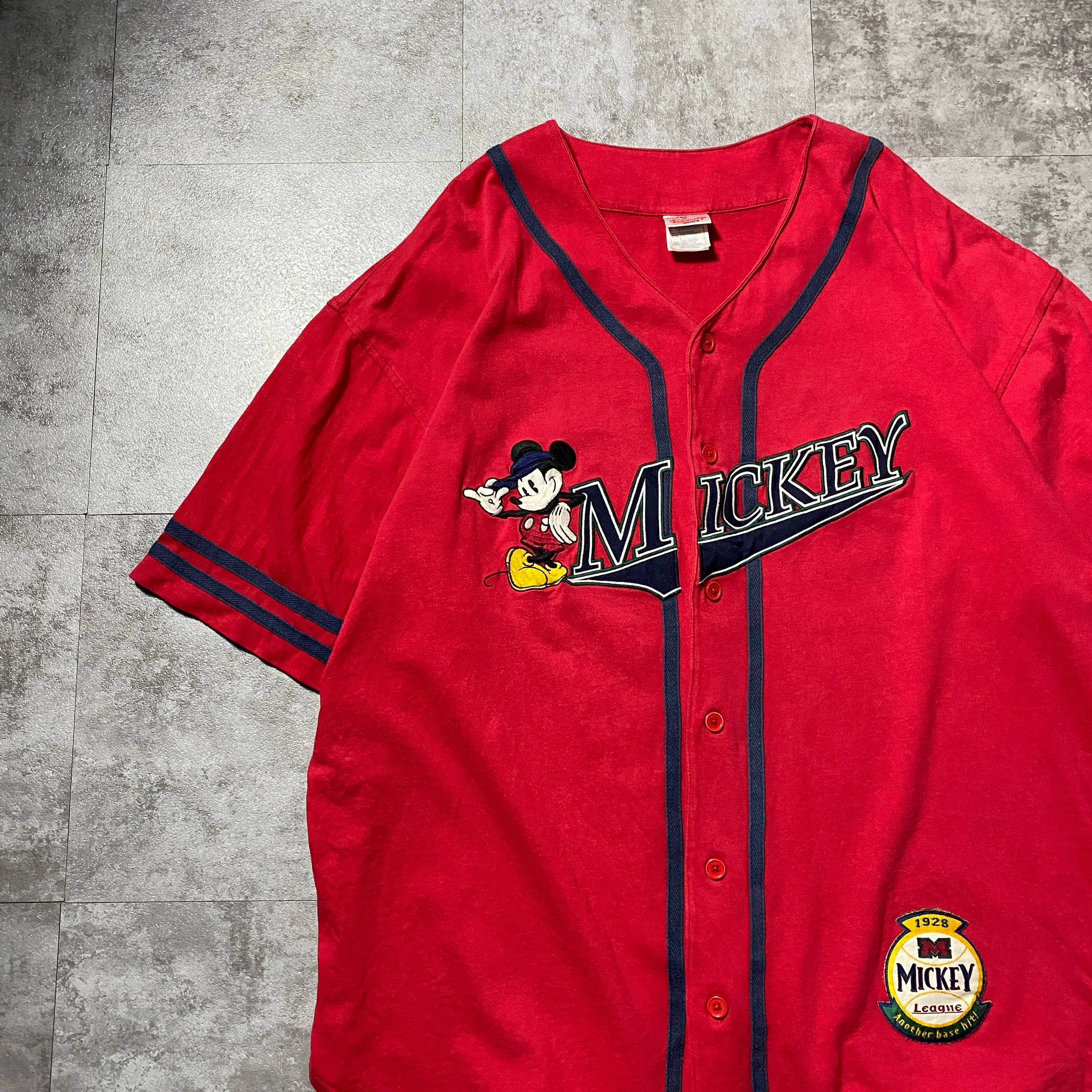 【Size:XXL】90's-00's old Disney オールドディズニー ミッキー 刺繍×ワッペンロゴ レッド 赤 ベースボールシャツ