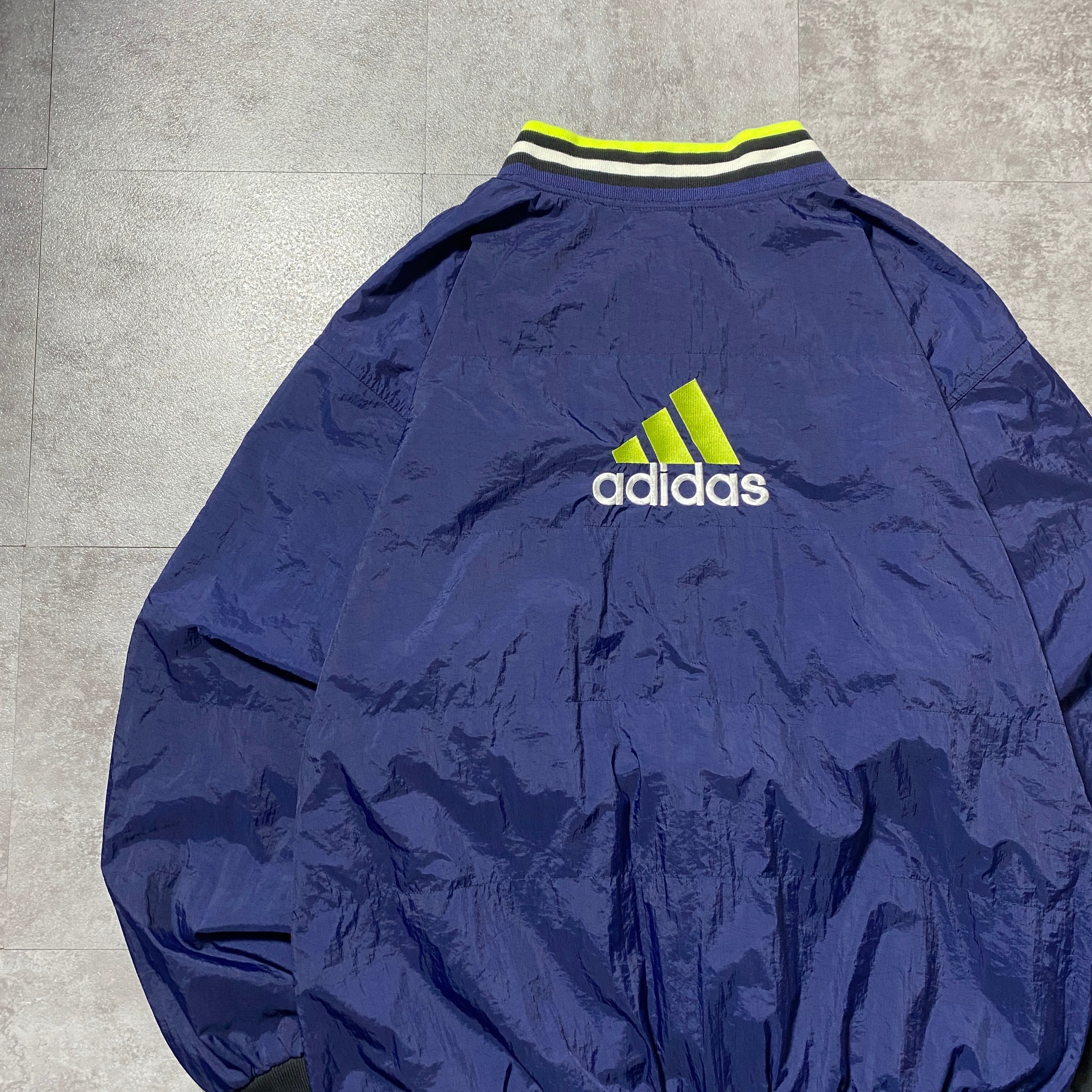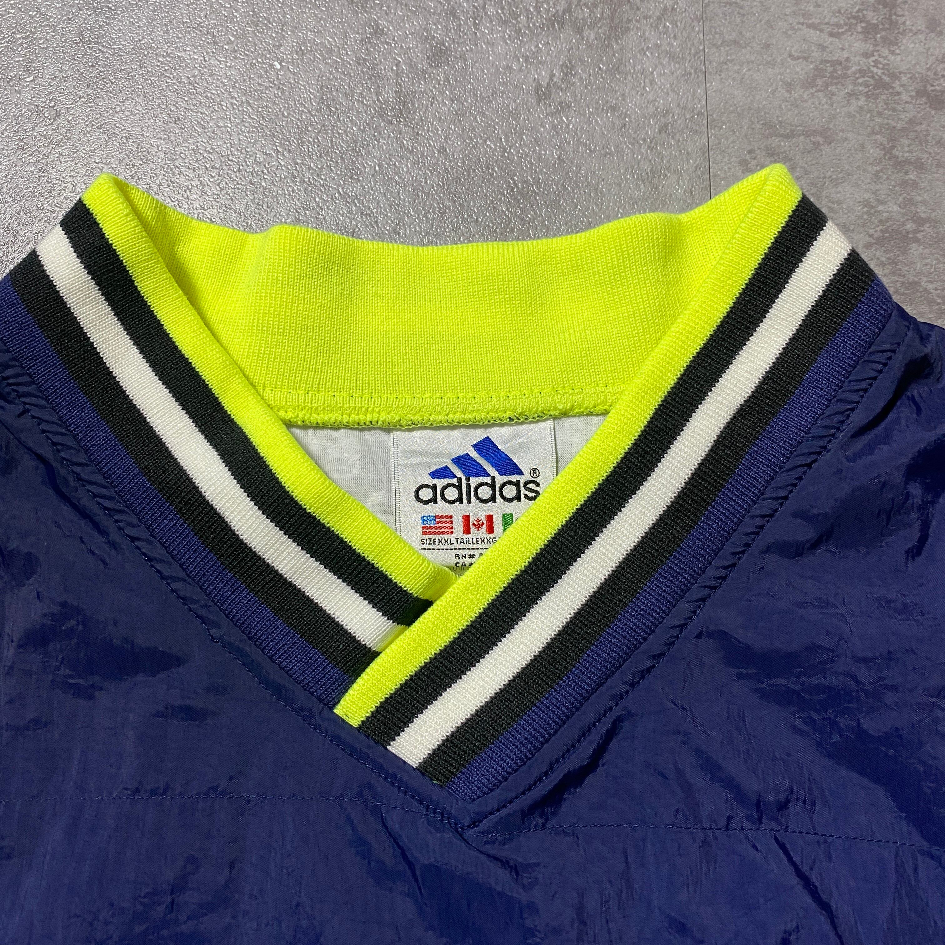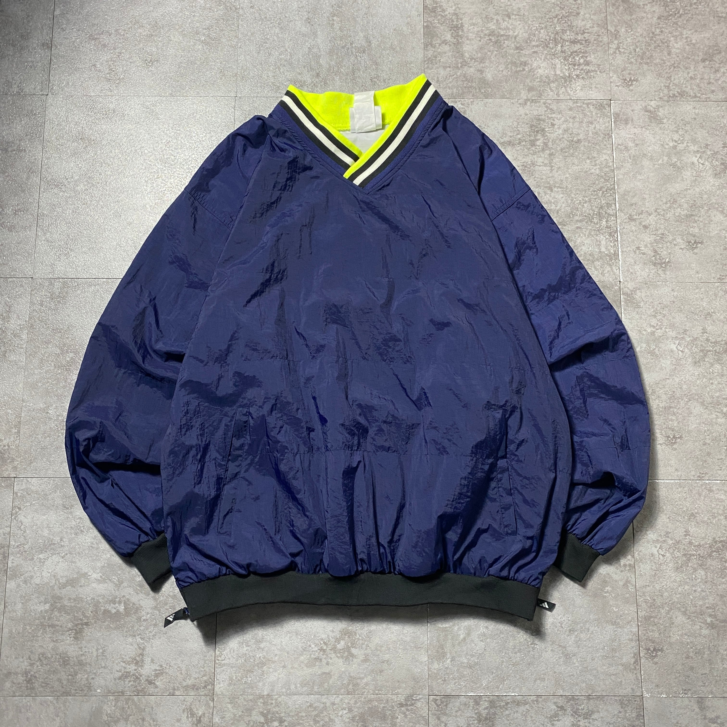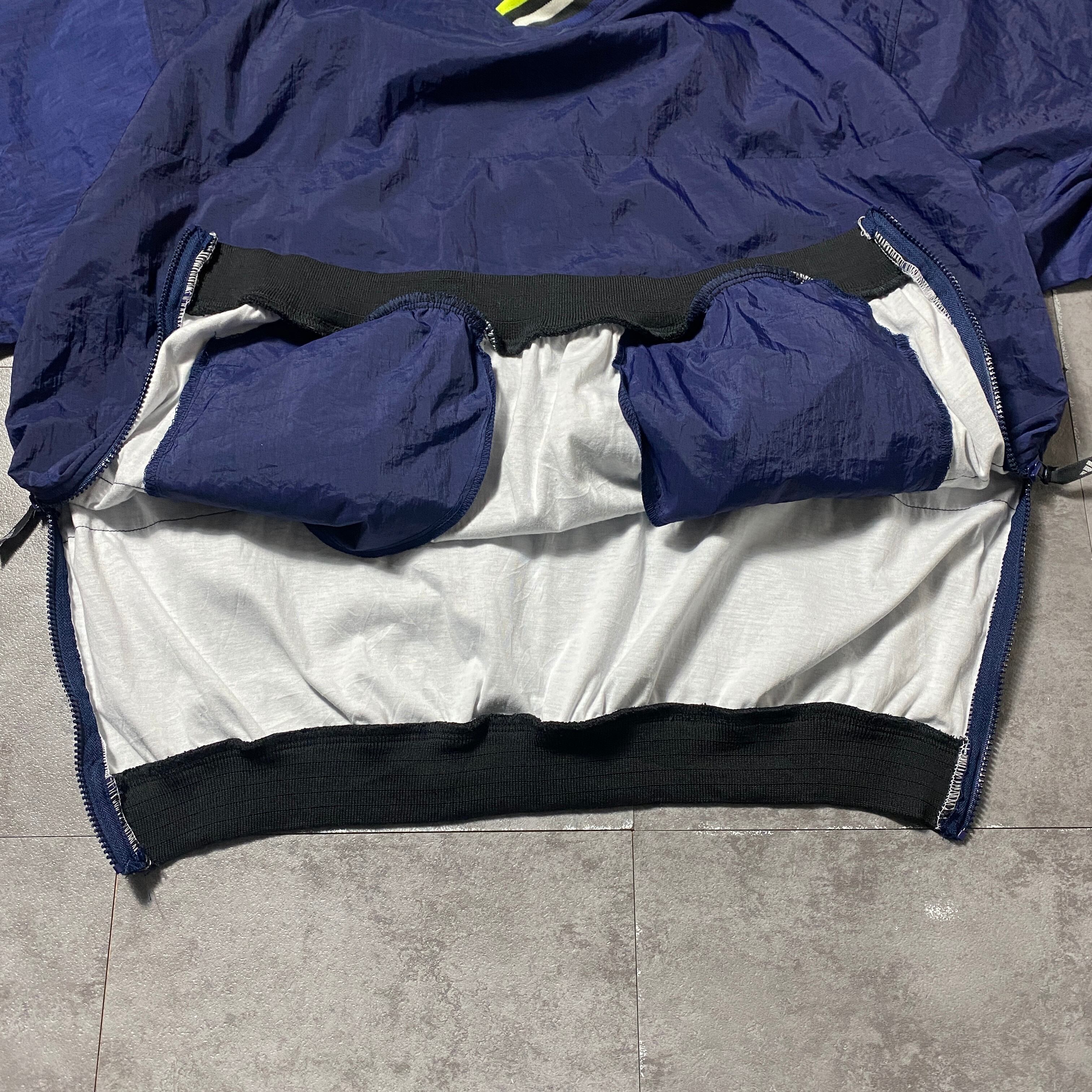 90's adidas アディダス パフォーマンスロゴ バック刺繍 ラインリブ ネイビー ナイロンプルオーバー