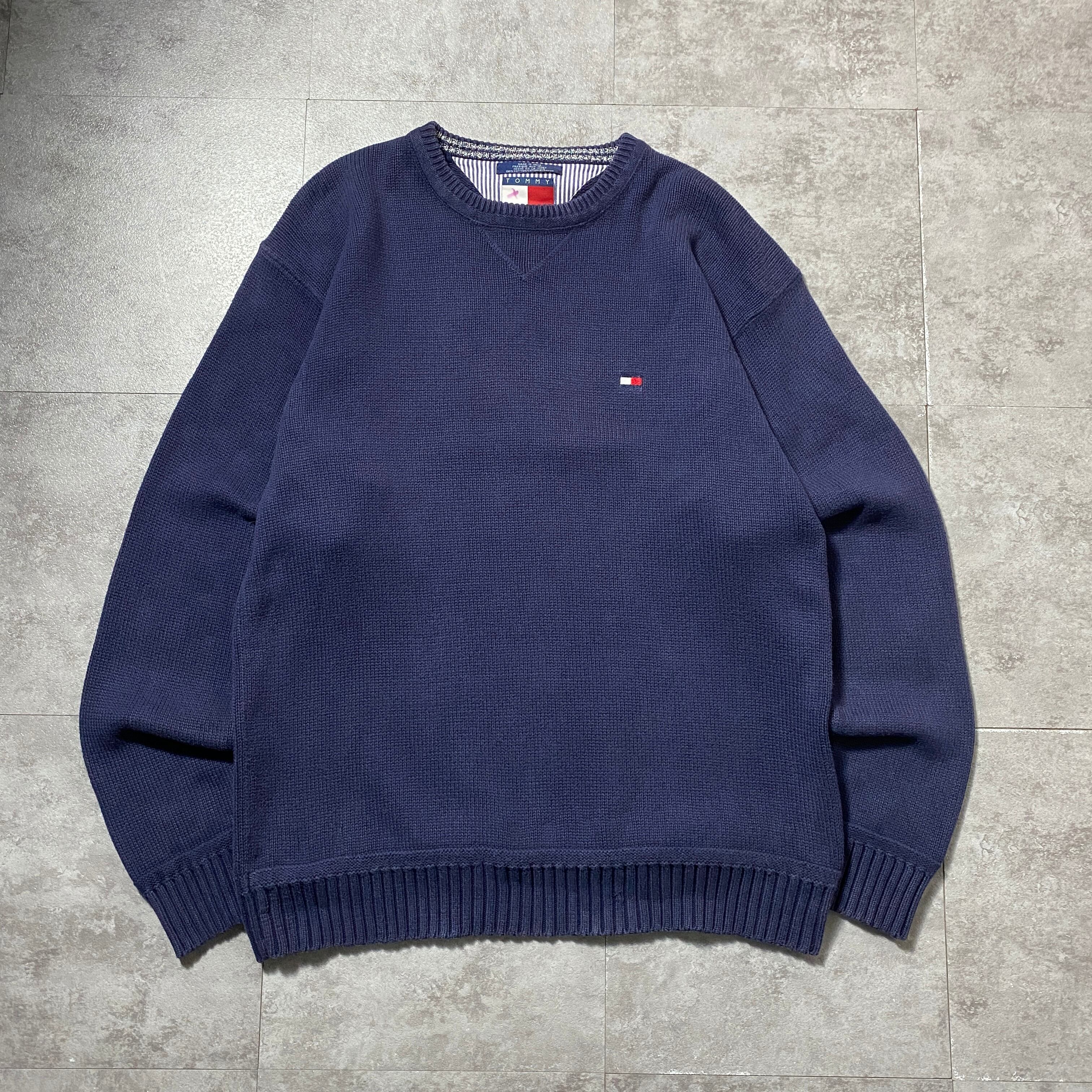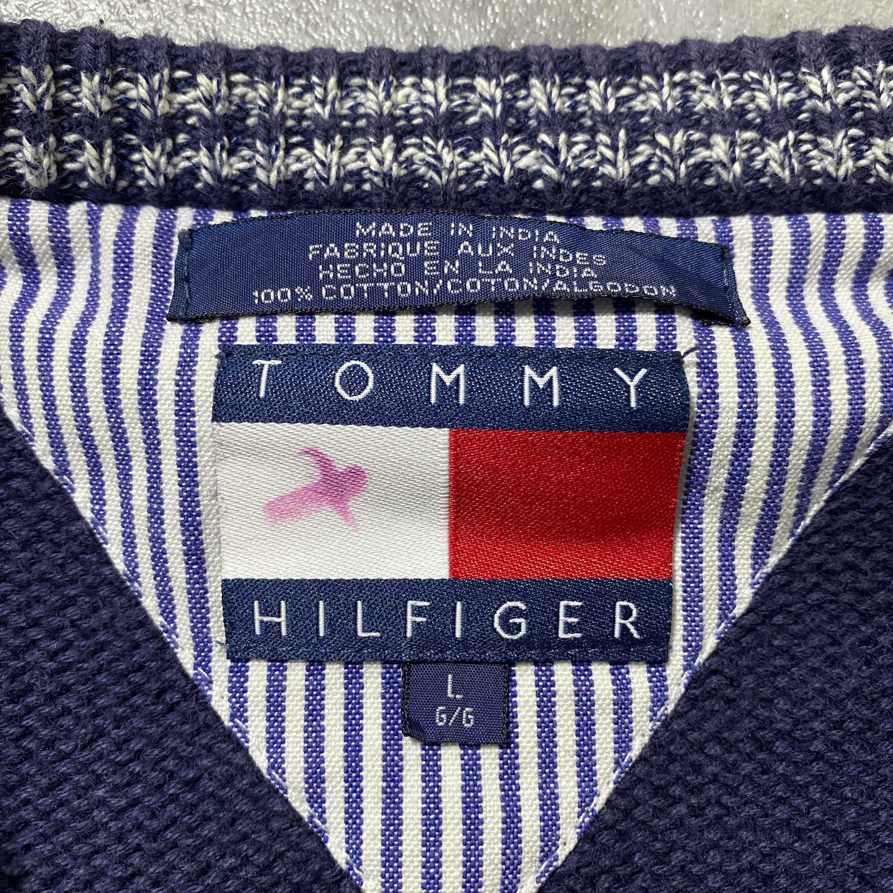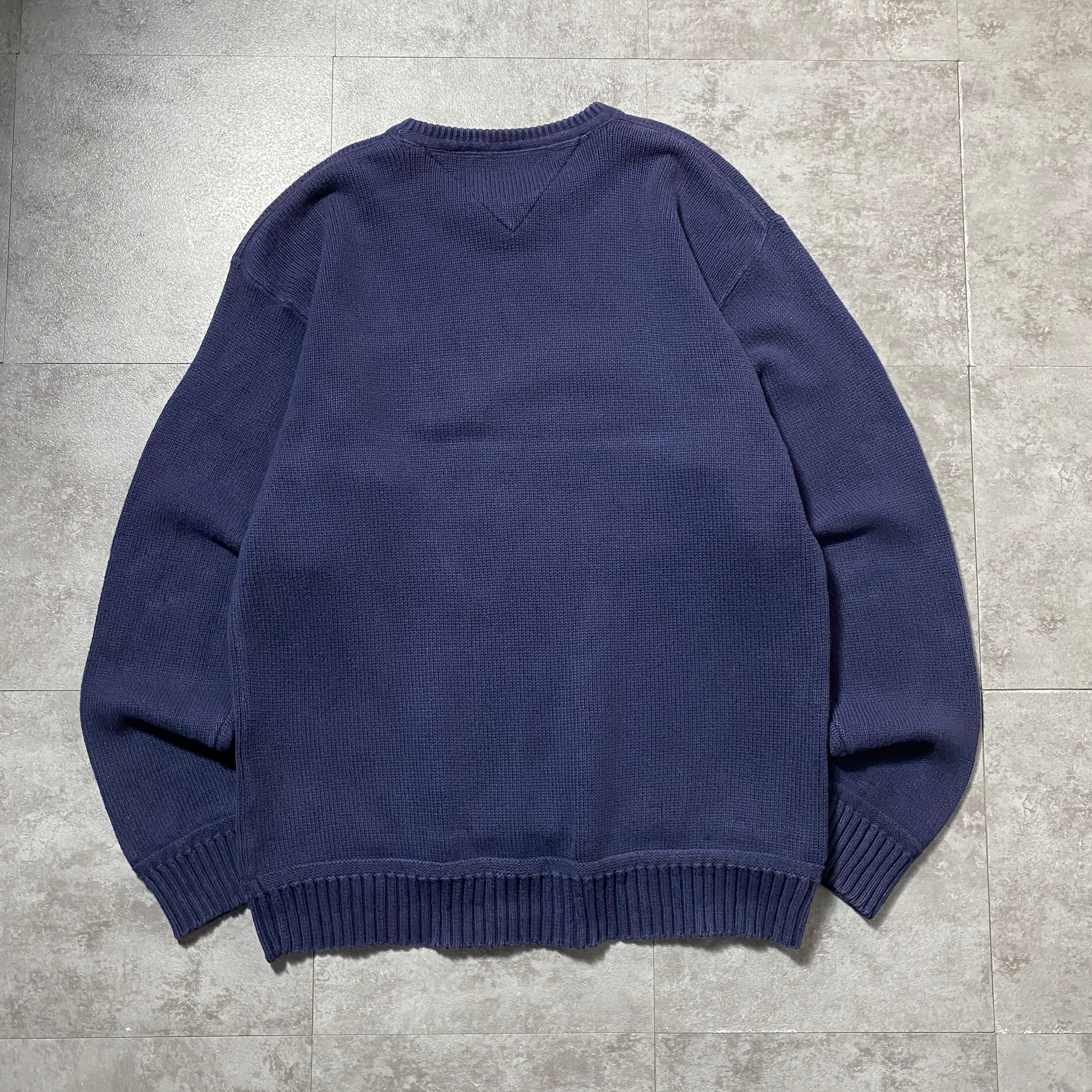 90's Tommy Hilfiger トミーヒルフィガー 刺繍ワンポイント フラッグロゴ 前V ネイビー コットンニット セーター