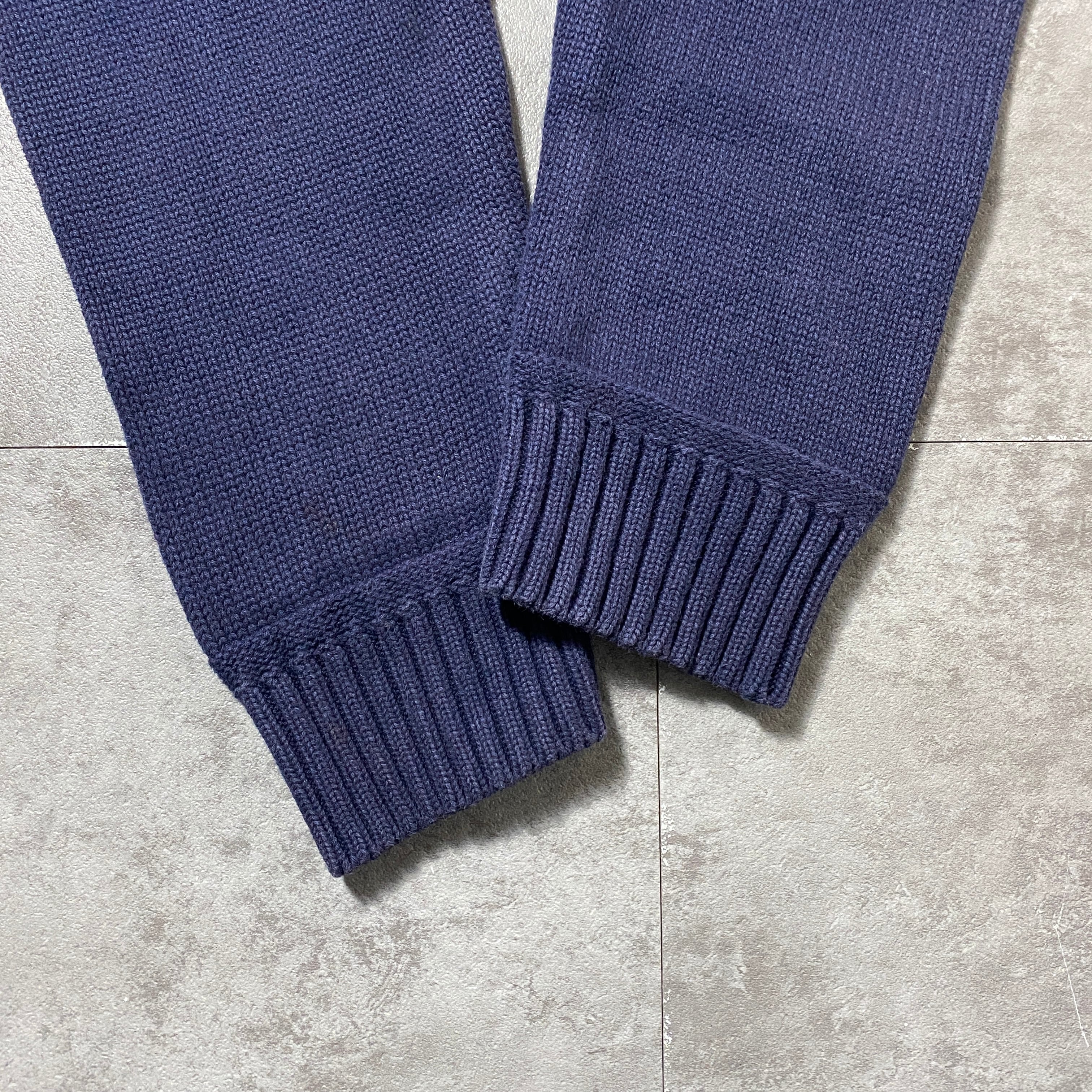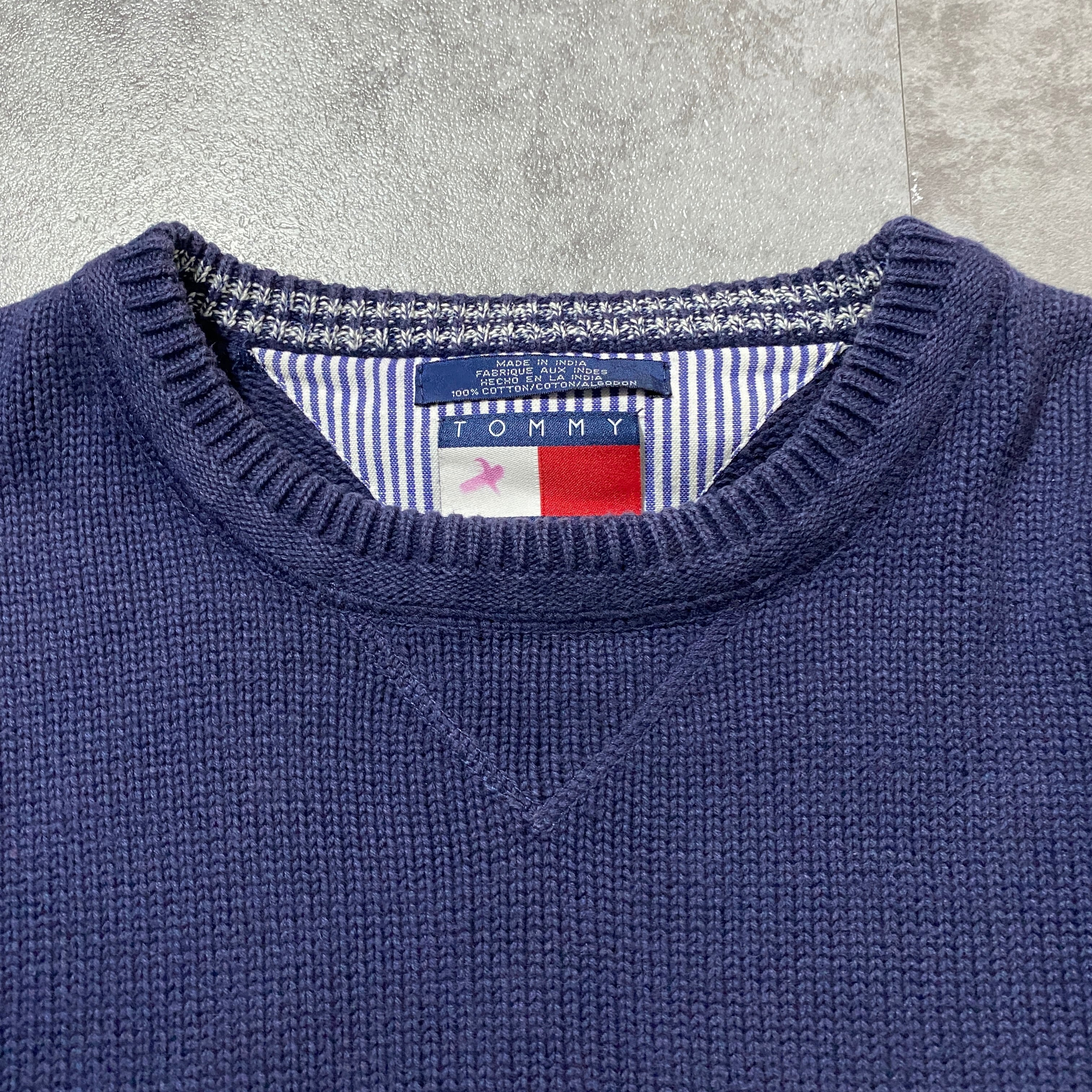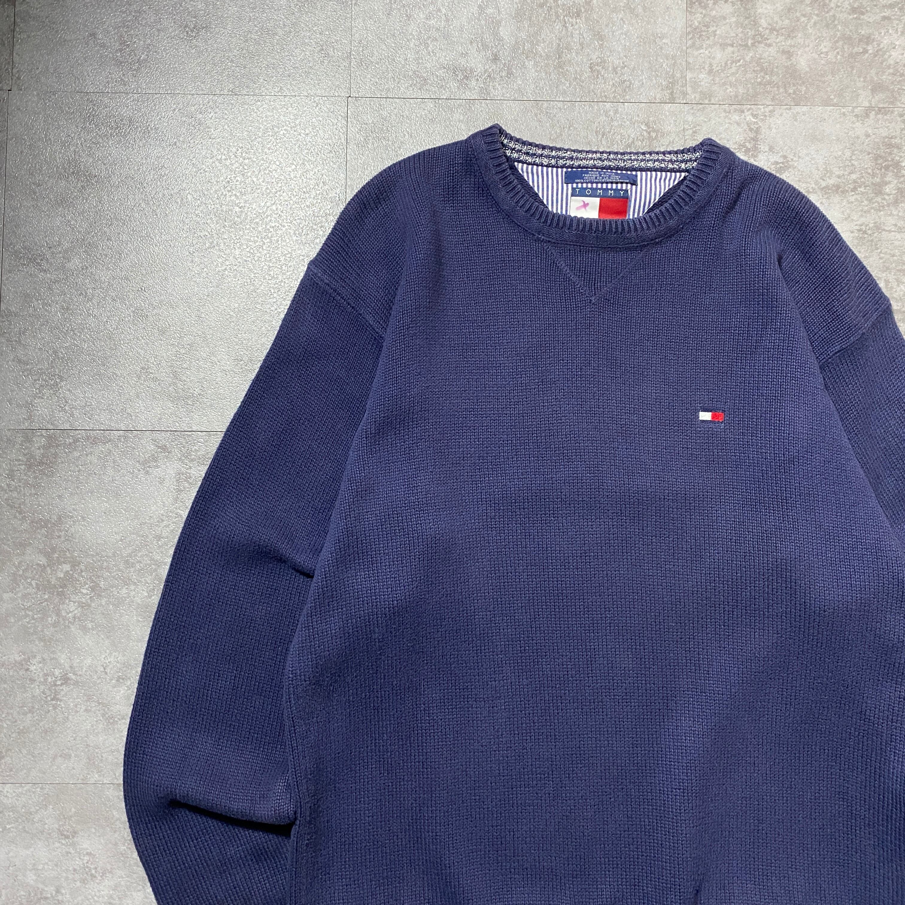 90's Tommy Hilfiger トミーヒルフィガー 刺繍ワンポイント フラッグロゴ 前V ネイビー コットンニット セーター