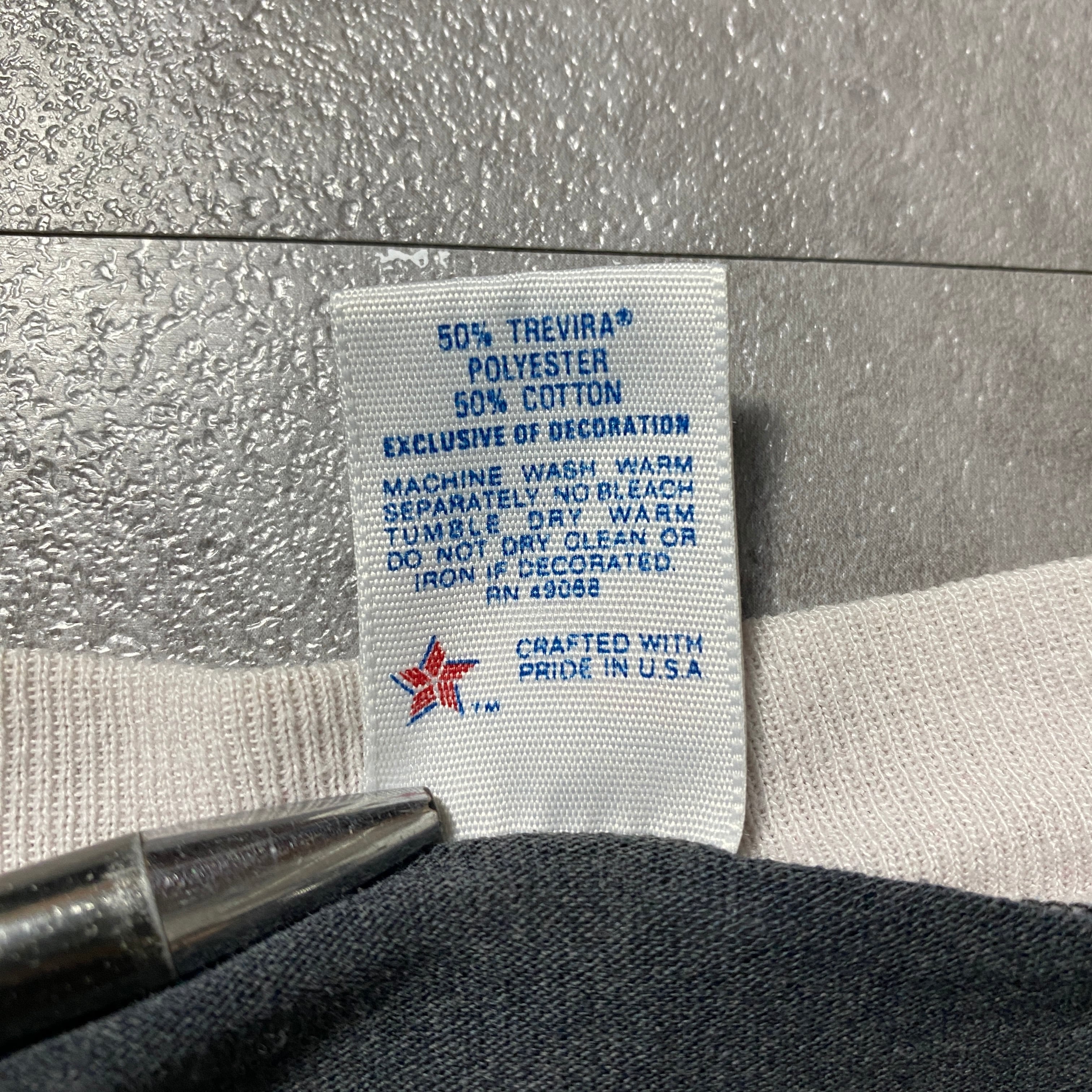 【USA製】90's SOFFE SHIRTS ソフィシャツ キリスト文字 ナンバリング プリント Vネック ラインリブ リンガーネック Tシャツ