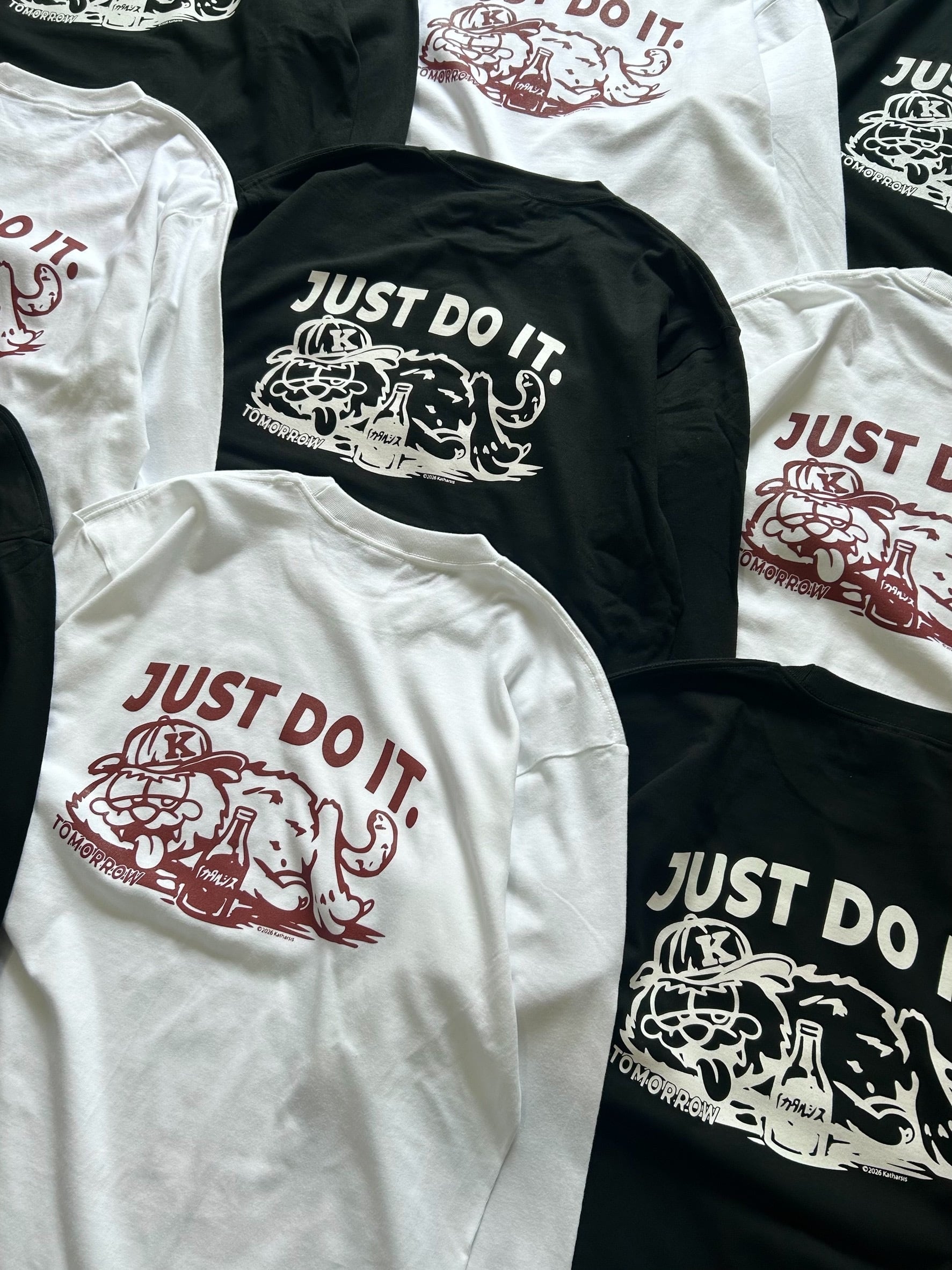 2026年3月を持って4周年を迎えたストリート専門オンライン古着屋「katharsis」が発売するオリジナルアイテム「“Just do it tomorrow” back print Tee」が完成しました。