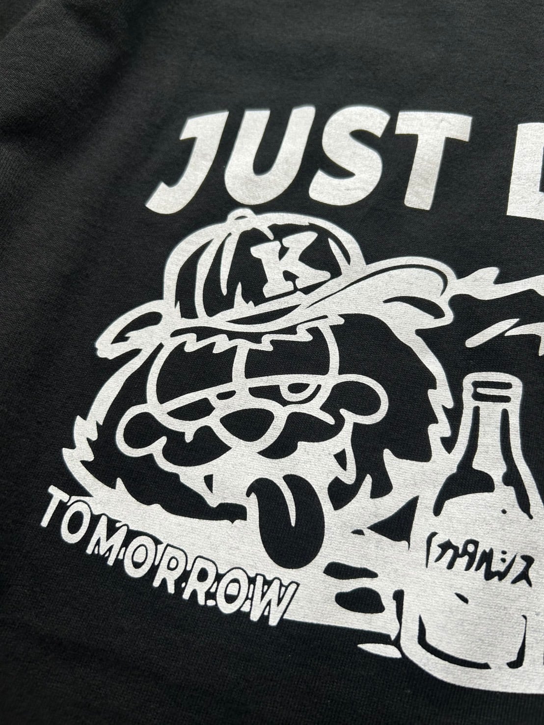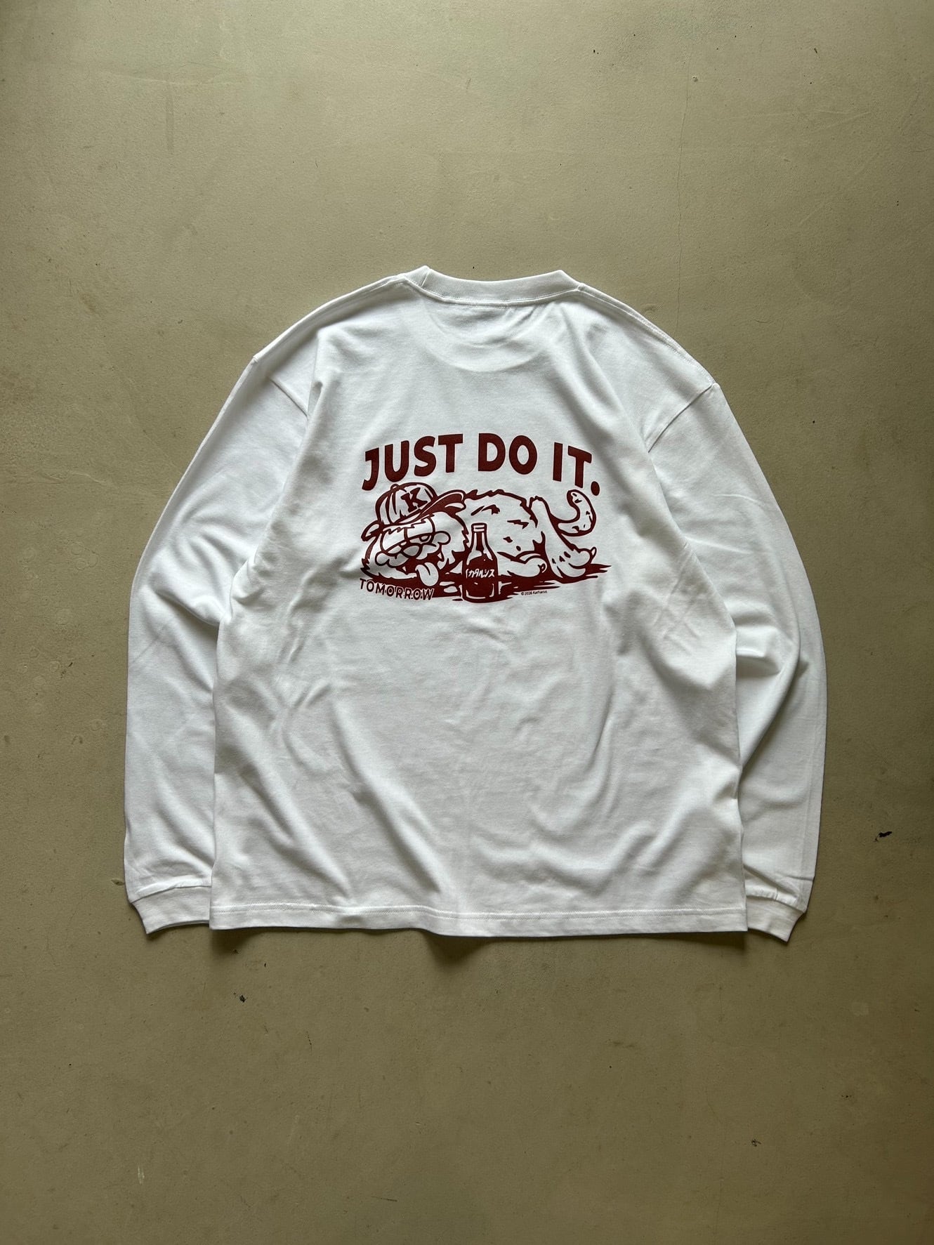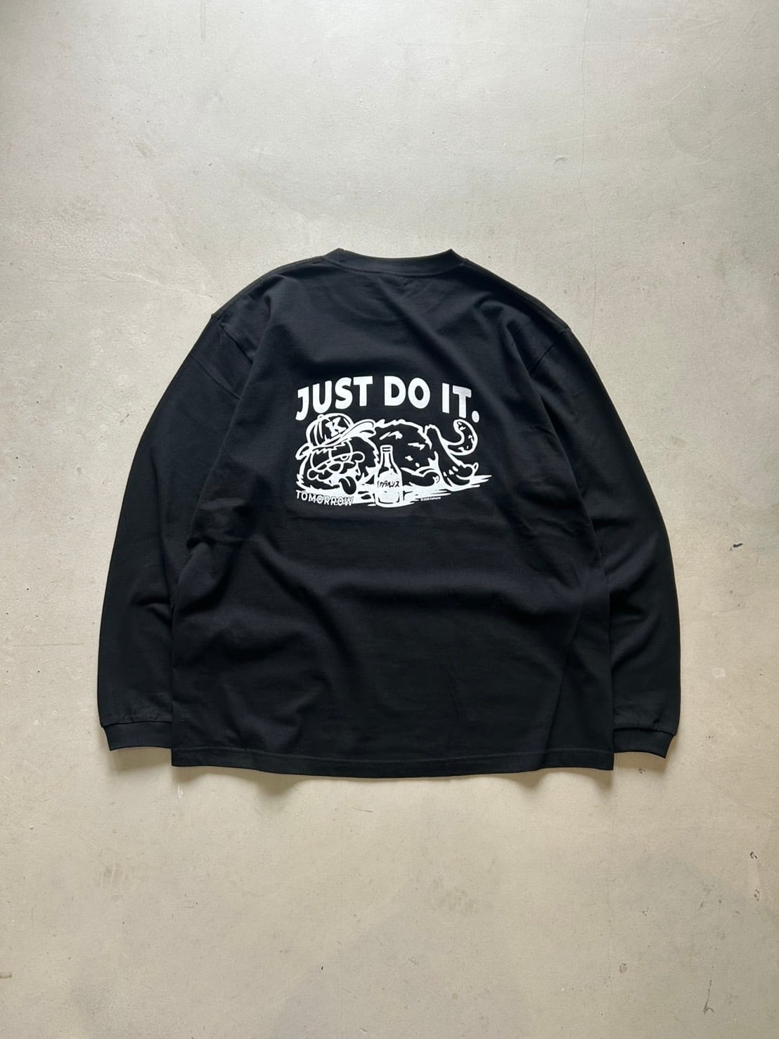 「Just do it tomorrow(明日やればいい)」という先延ばしをカッコつけたキャッチコピーに、アイコニックな猫のキャラをデザインしたストリートシーンにぴったりな1着となっております。