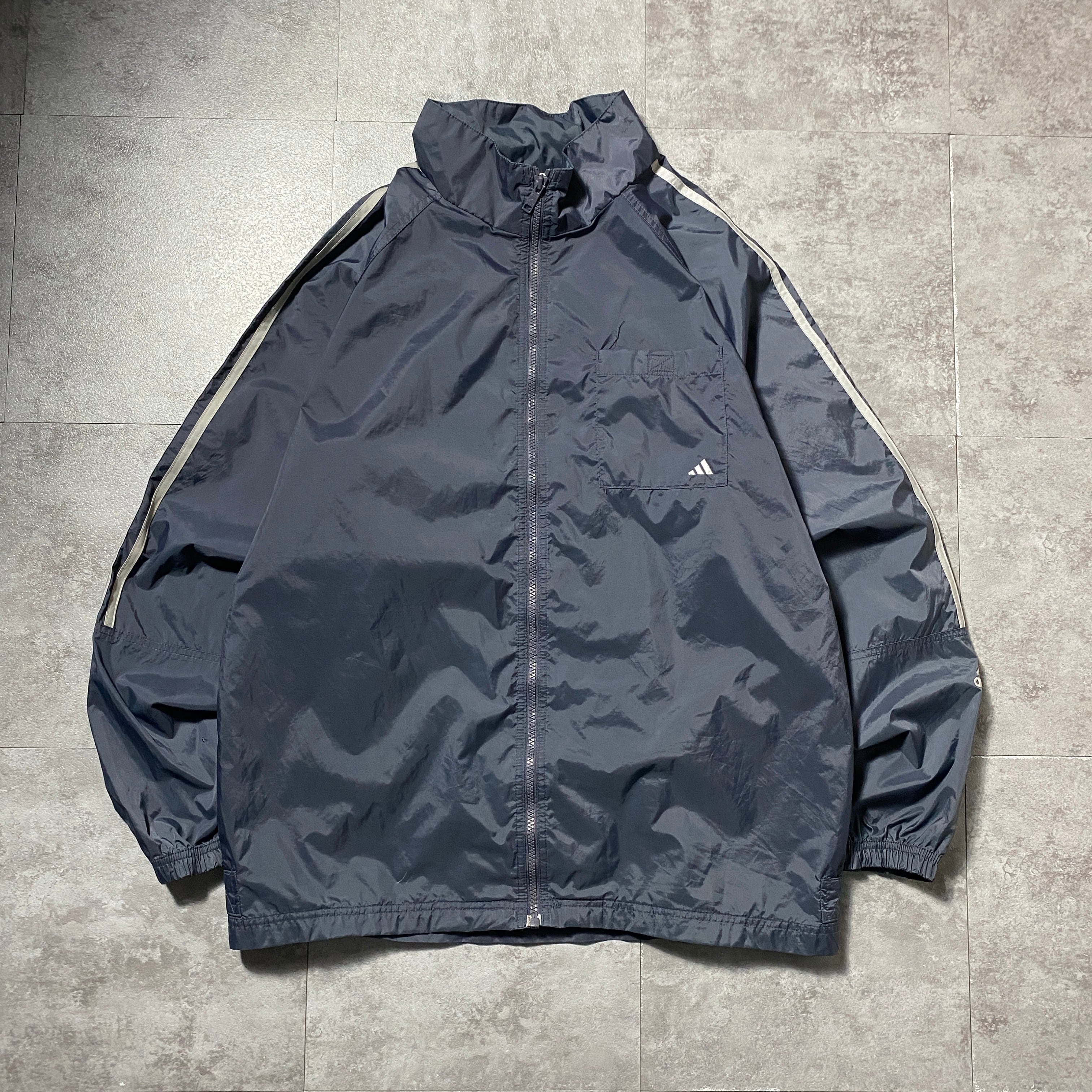 90's adidas アディダス パフォーマンスロゴ 両面刺繍 サイドストライプ ダークグレー 薄手 ナイロンジャケット
