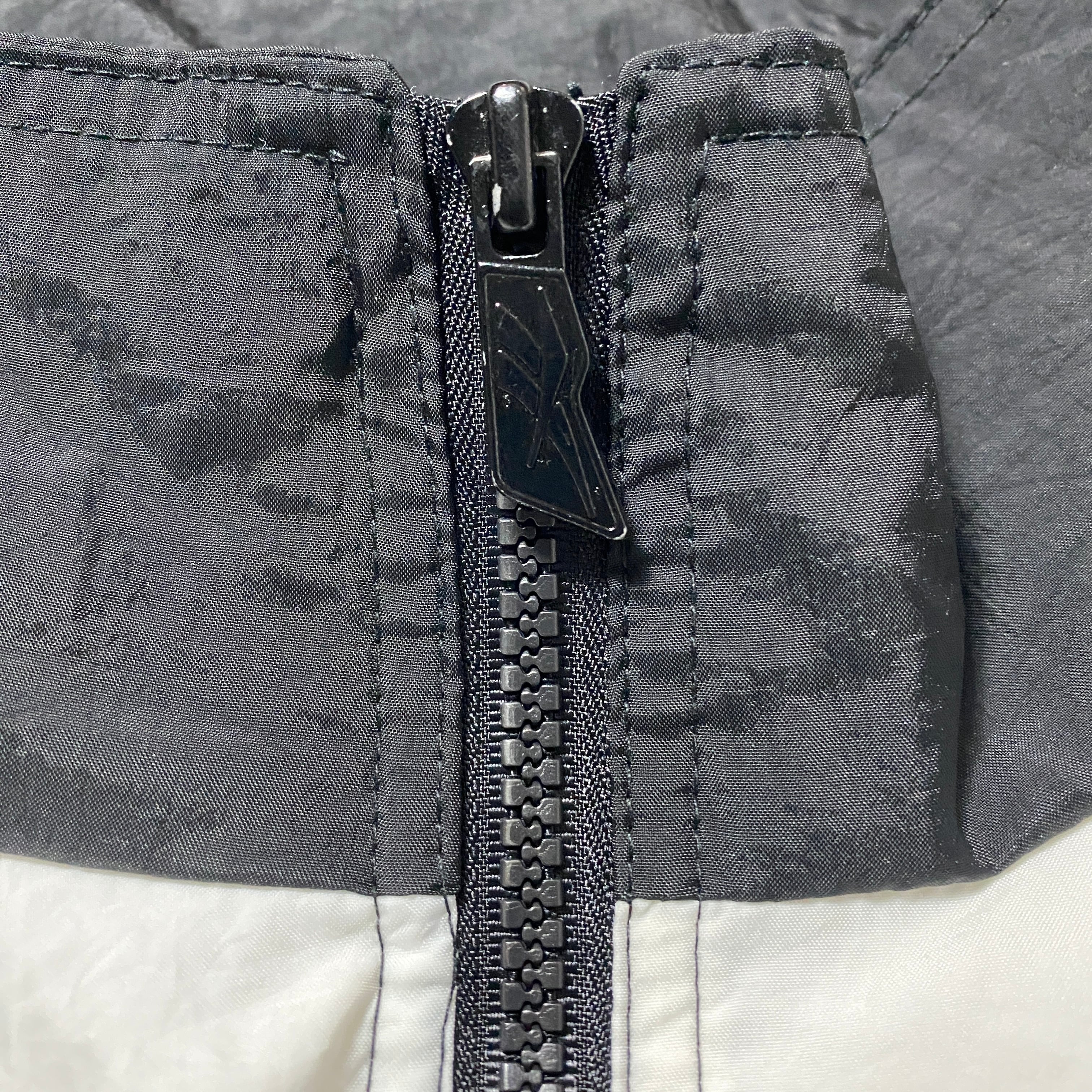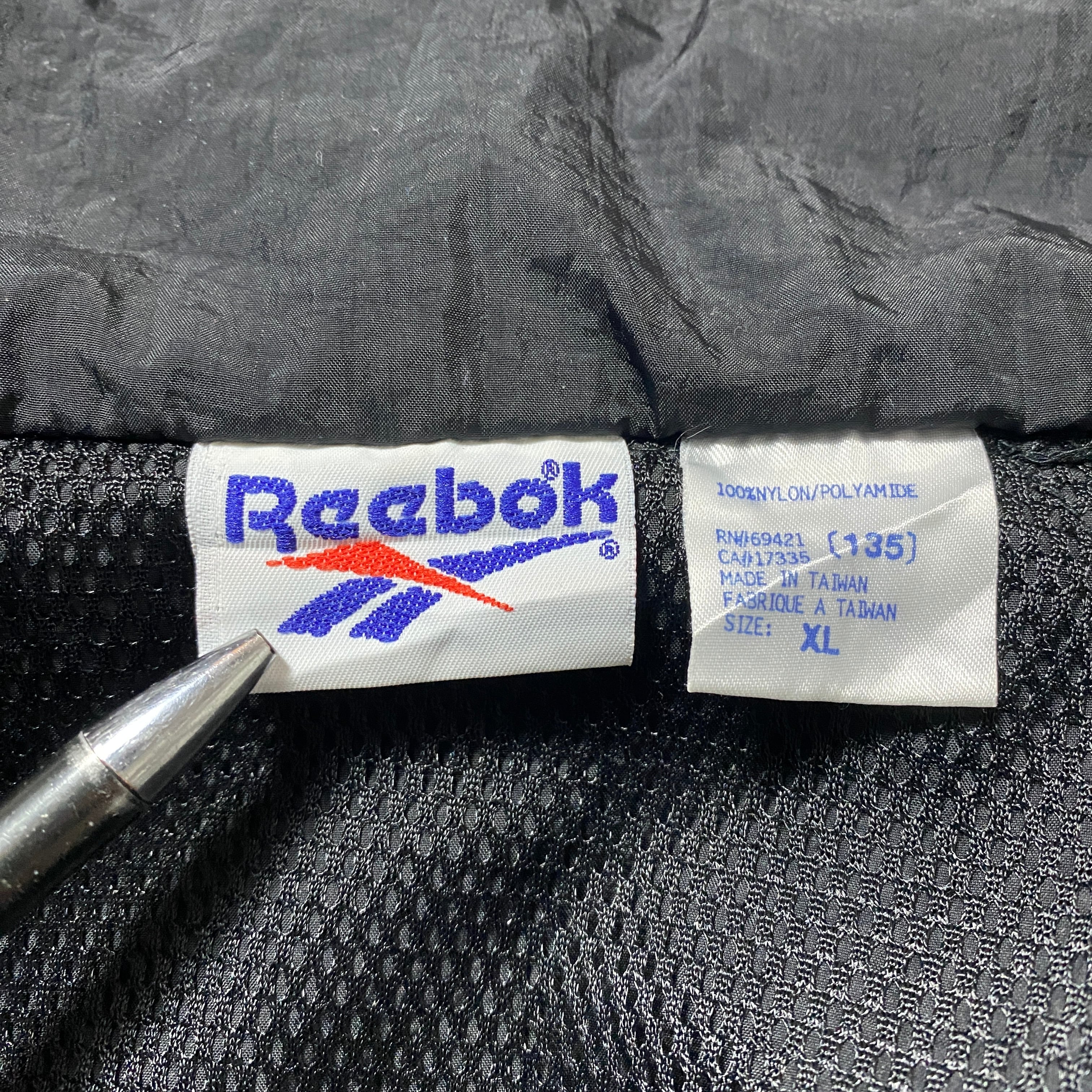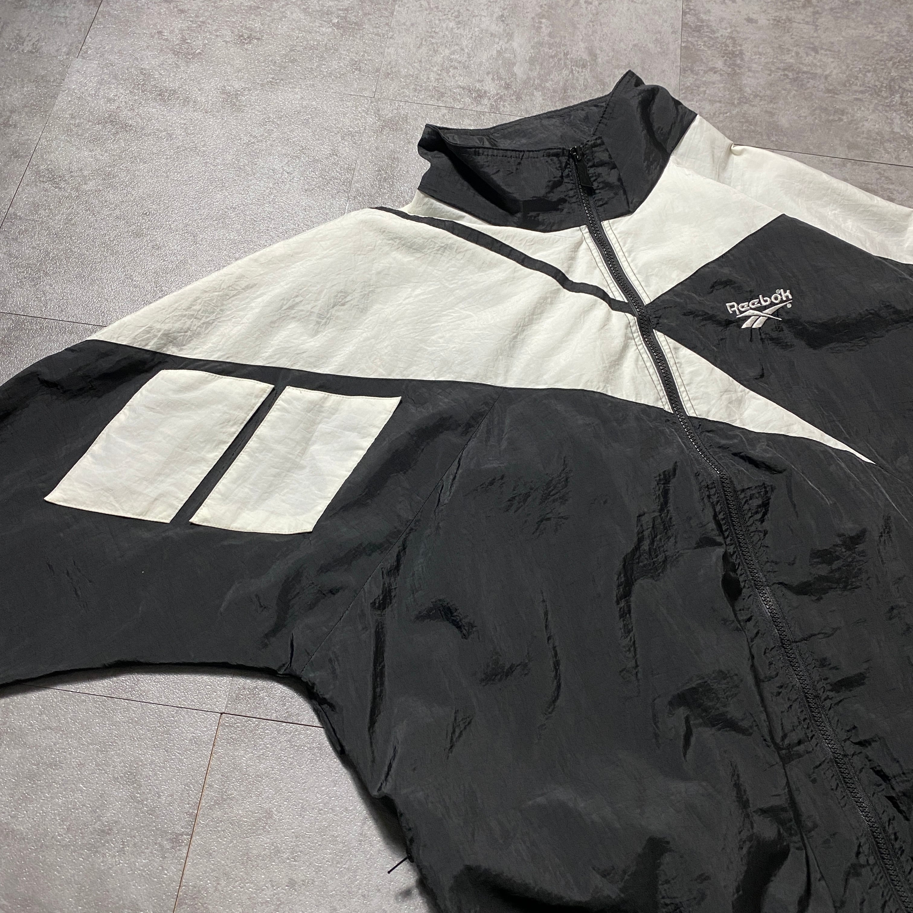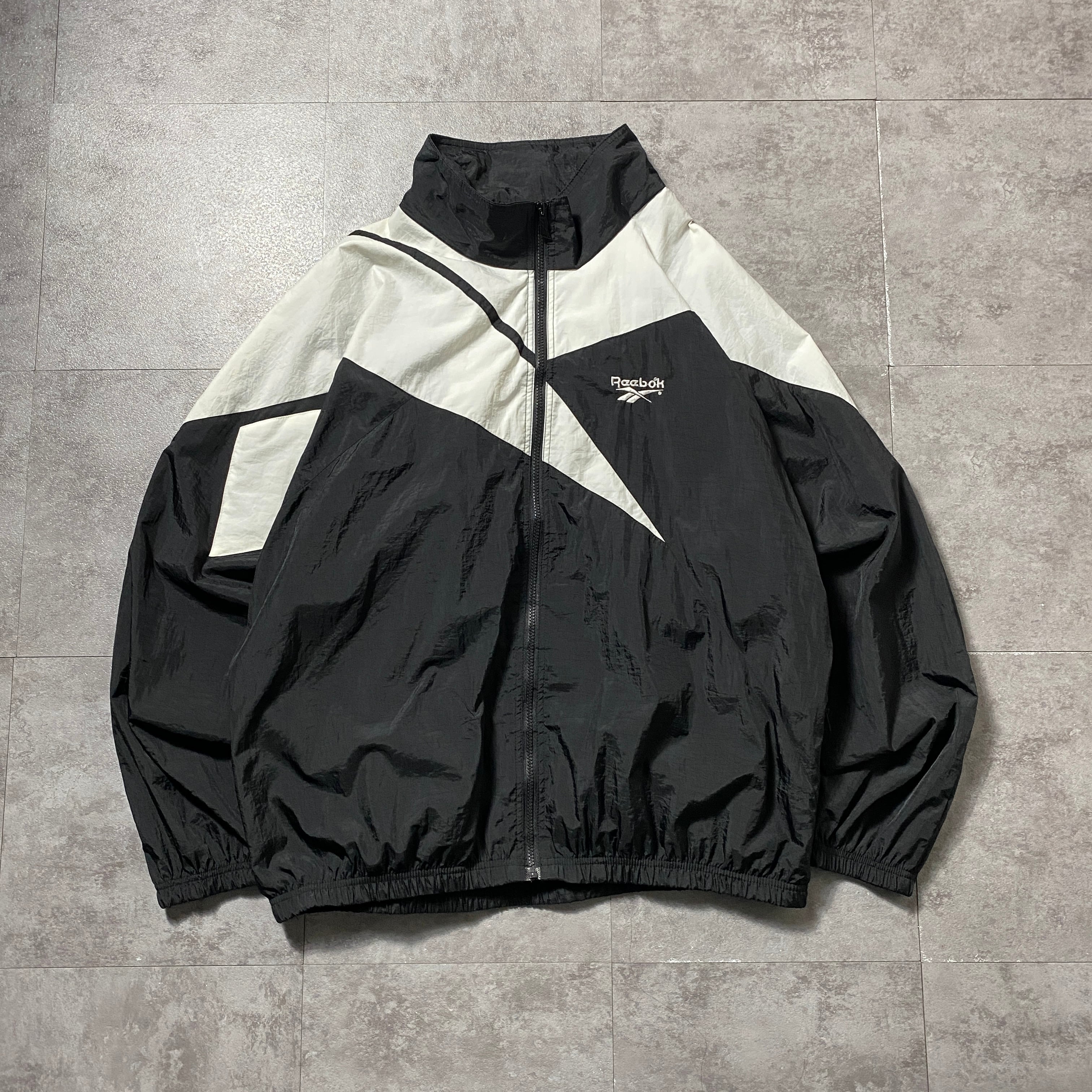【Size:XL】90's Reebok リーボック 刺繍ベクターロゴ 美品 ブラック 黒 フード付 ナイロンジャケット