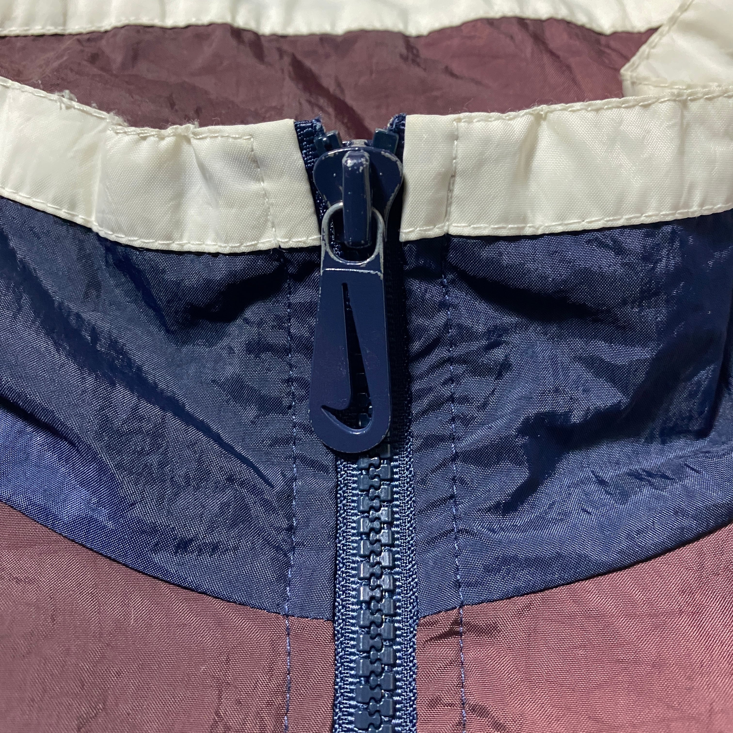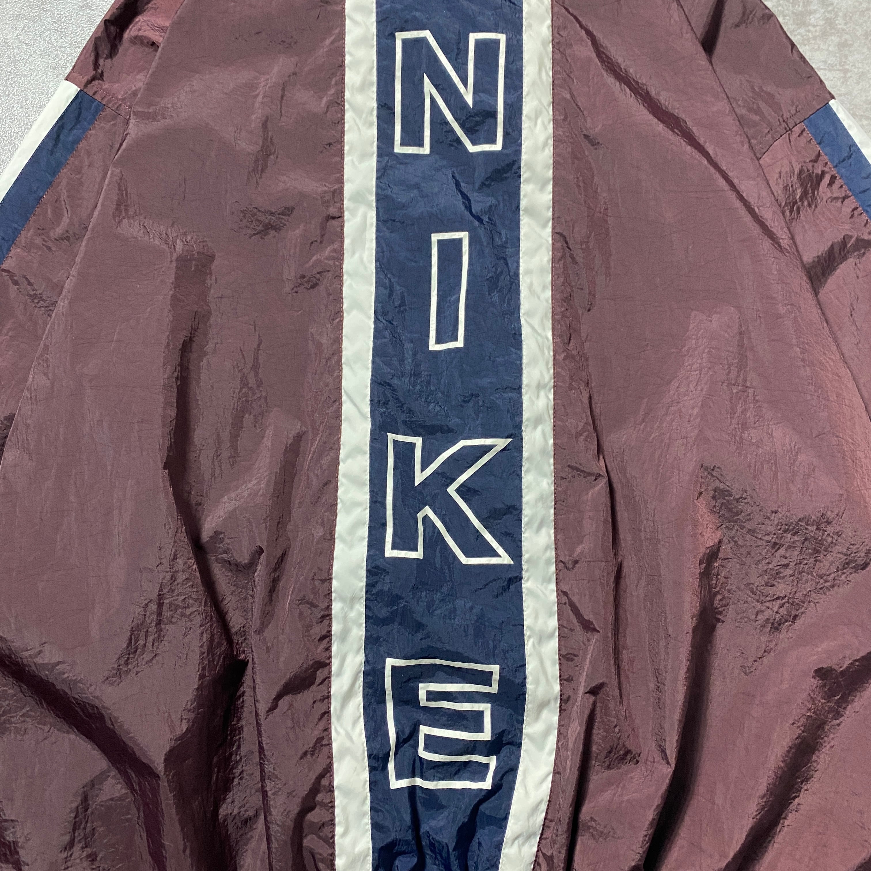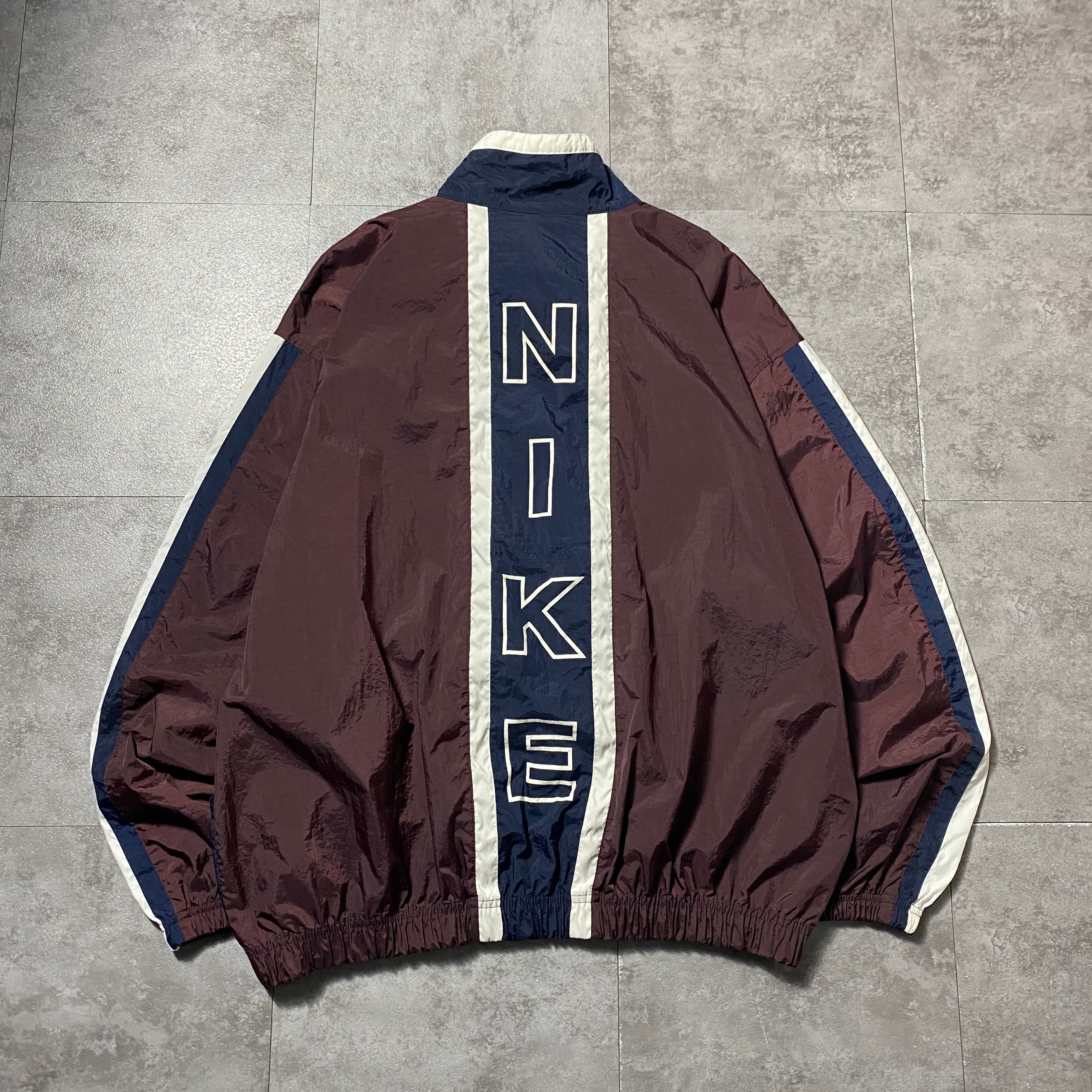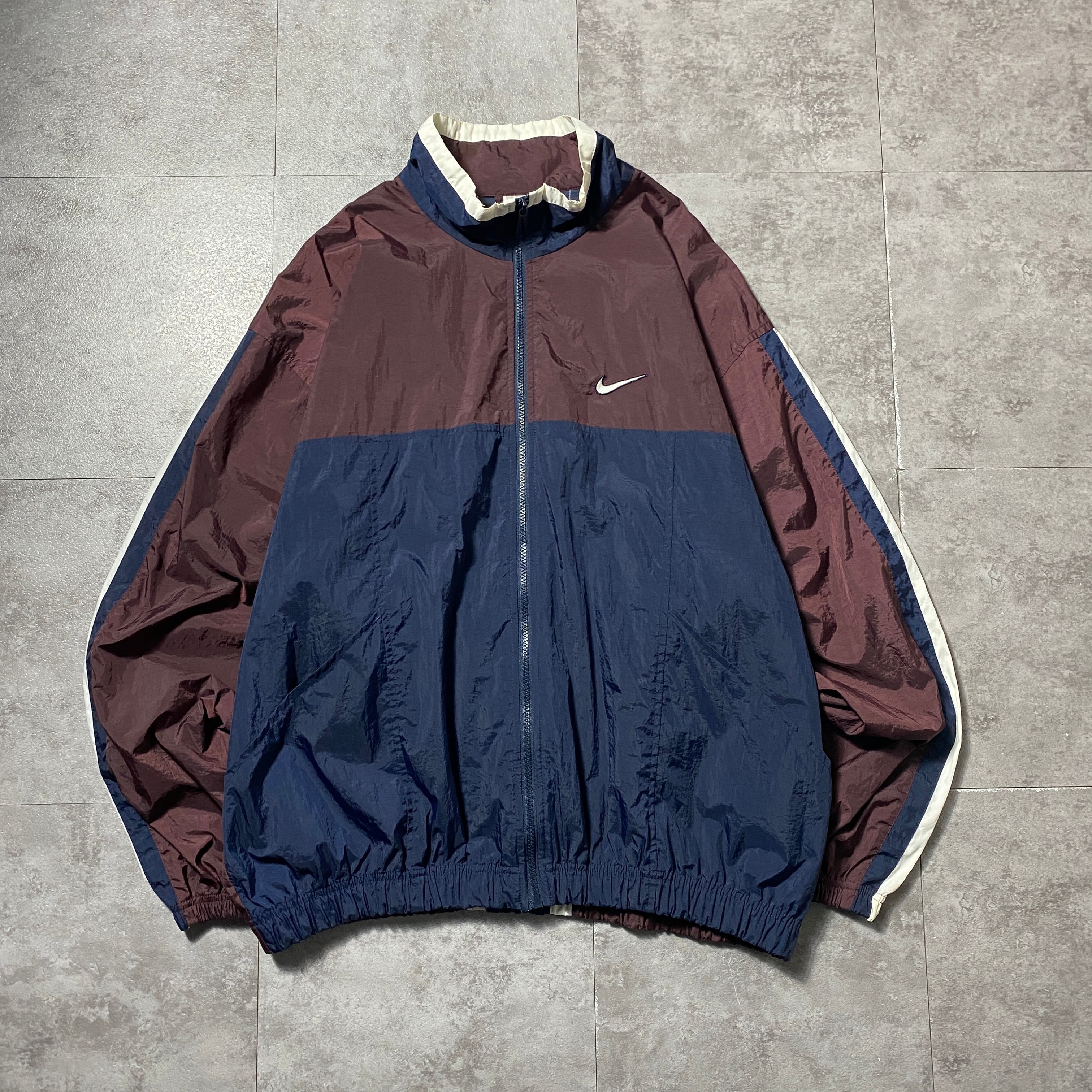 90's NIKE ナイキ スウォッシュ 刺繍ワンポイント バックプリント ブラウン×ネイビー 薄手 ナイロンジャケット