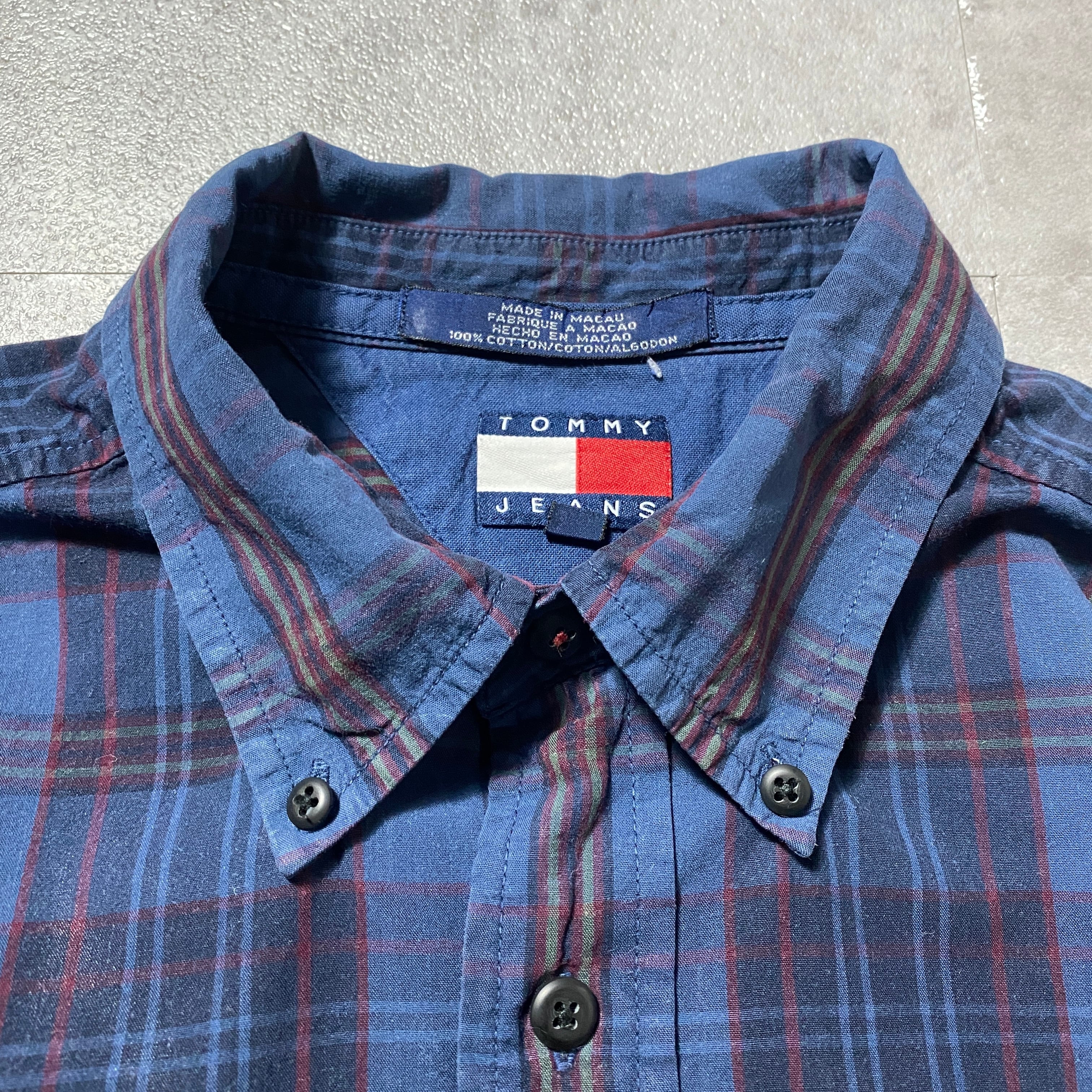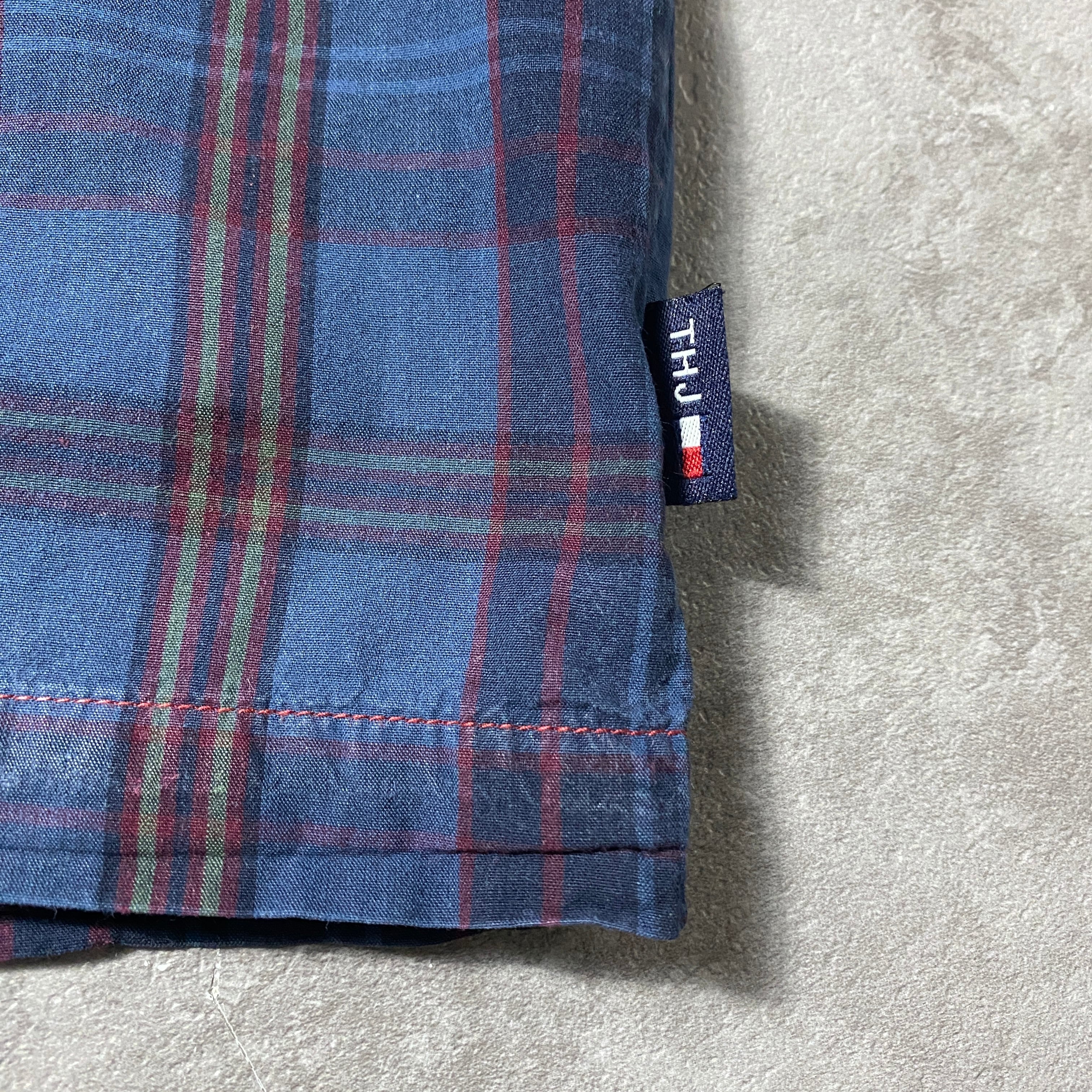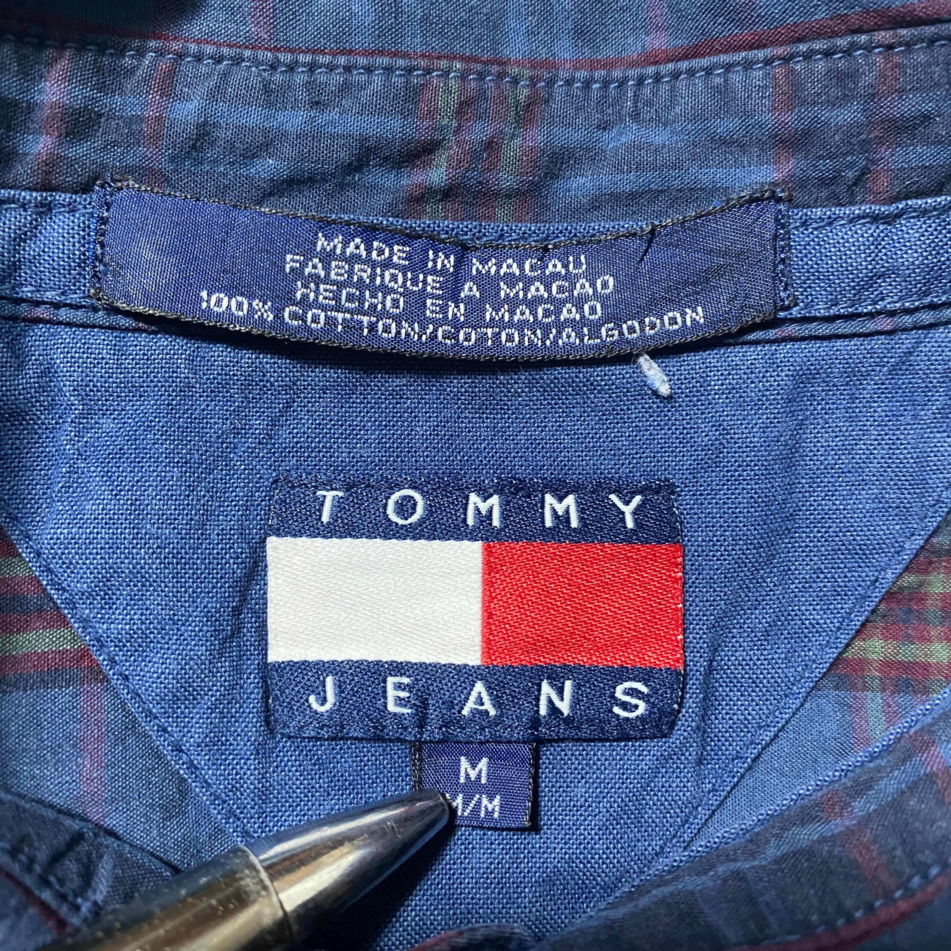 90's Tommy Jeans トミージーンズ ラベルロゴ 胸ポケット チェック総柄 ボタンダウンシャツ