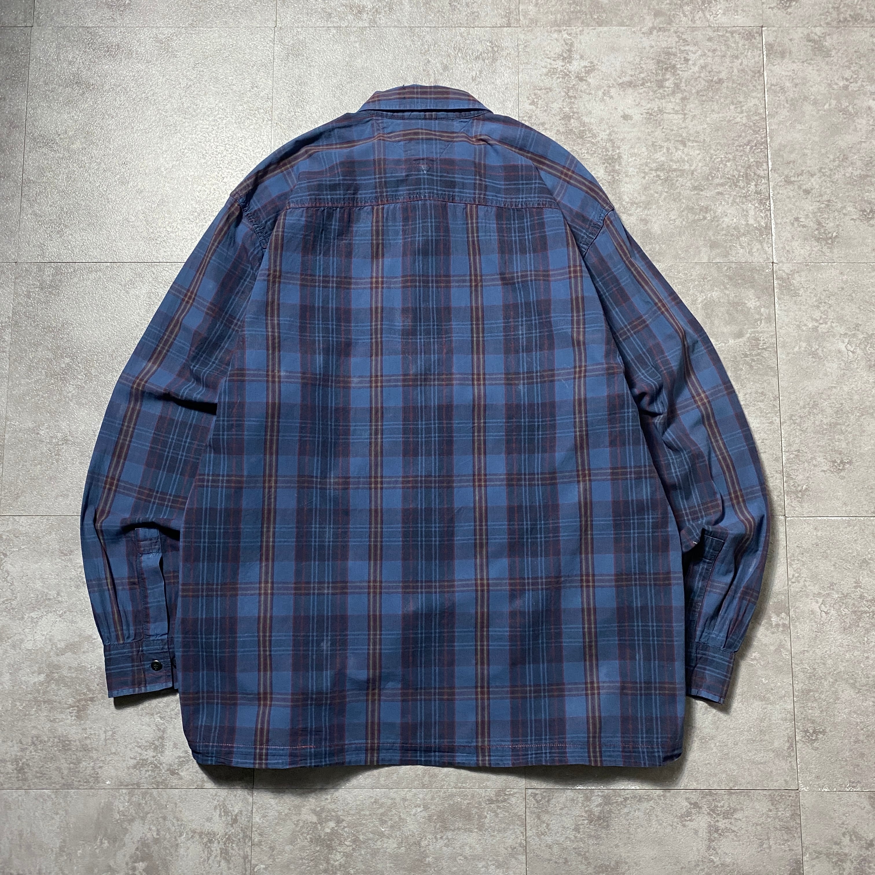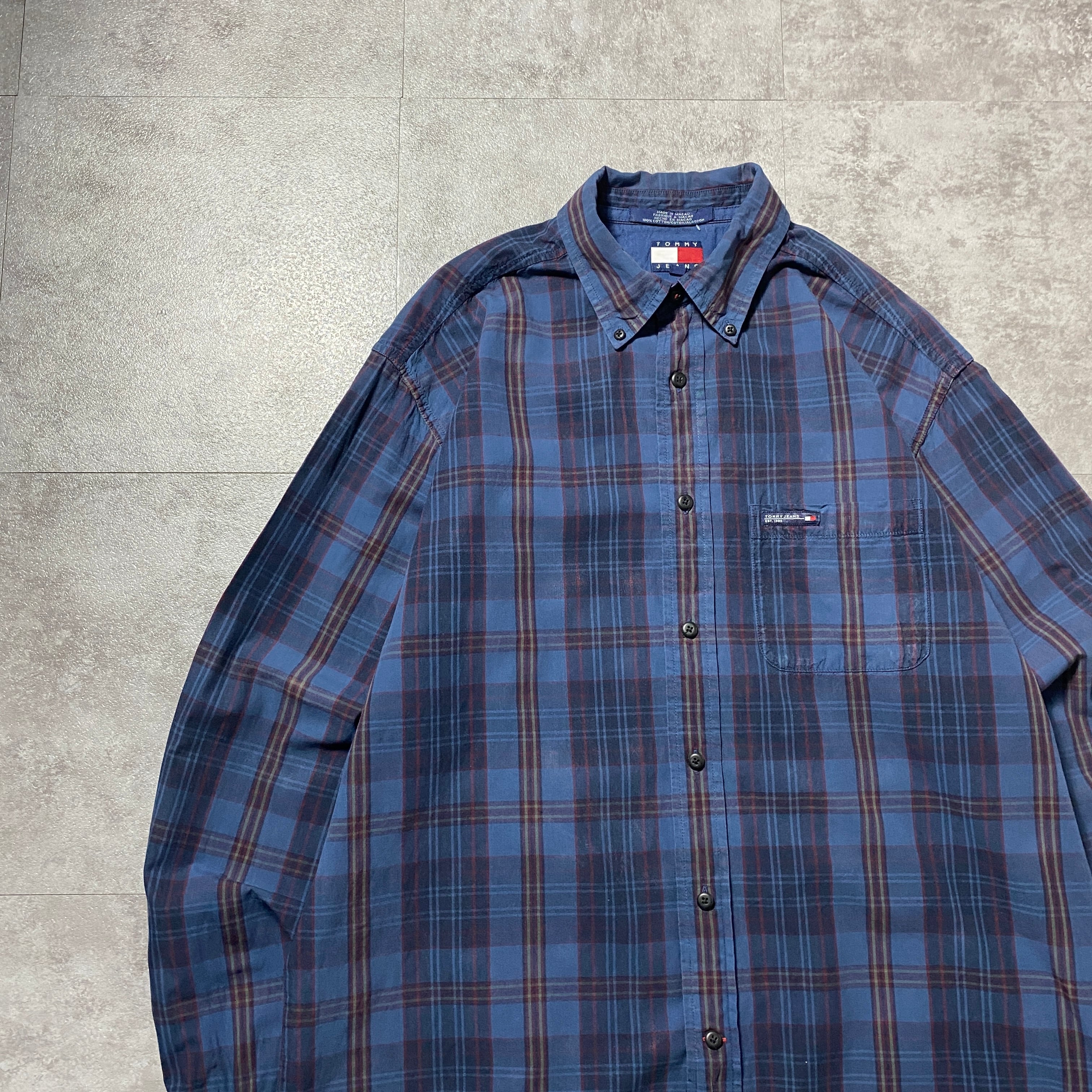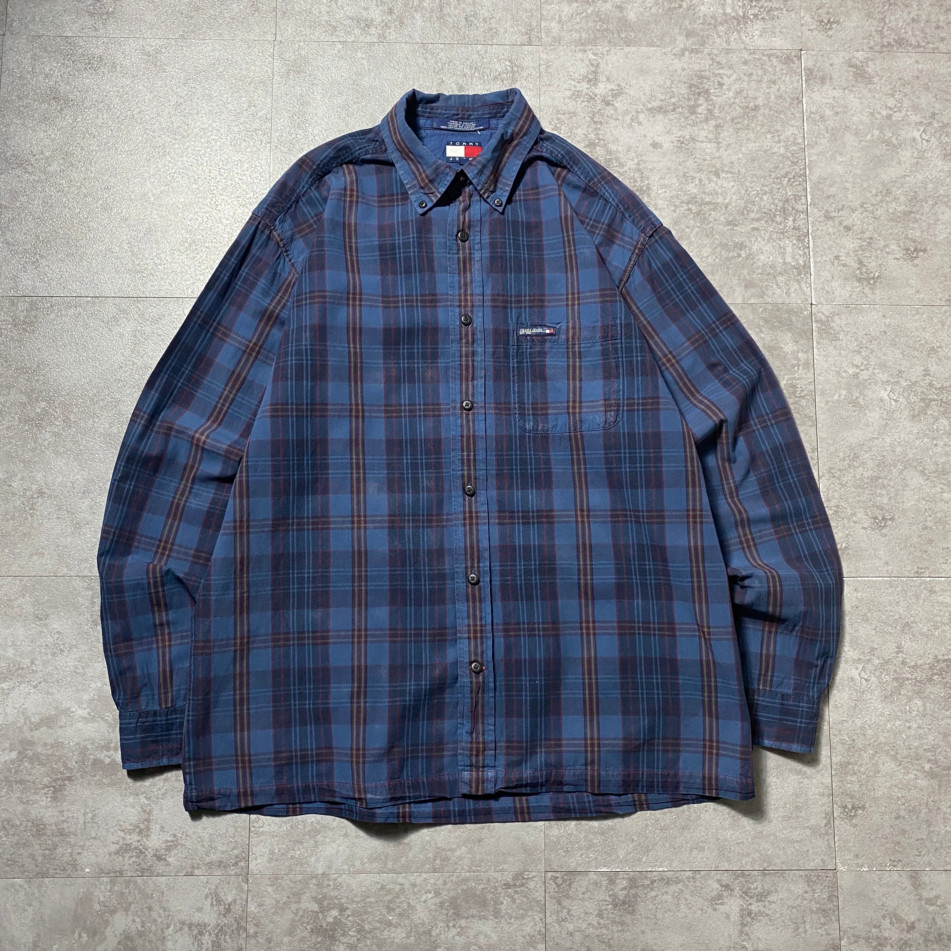 90's Tommy Jeans トミージーンズ ラベルロゴ 胸ポケット チェック総柄 ボタンダウンシャツ