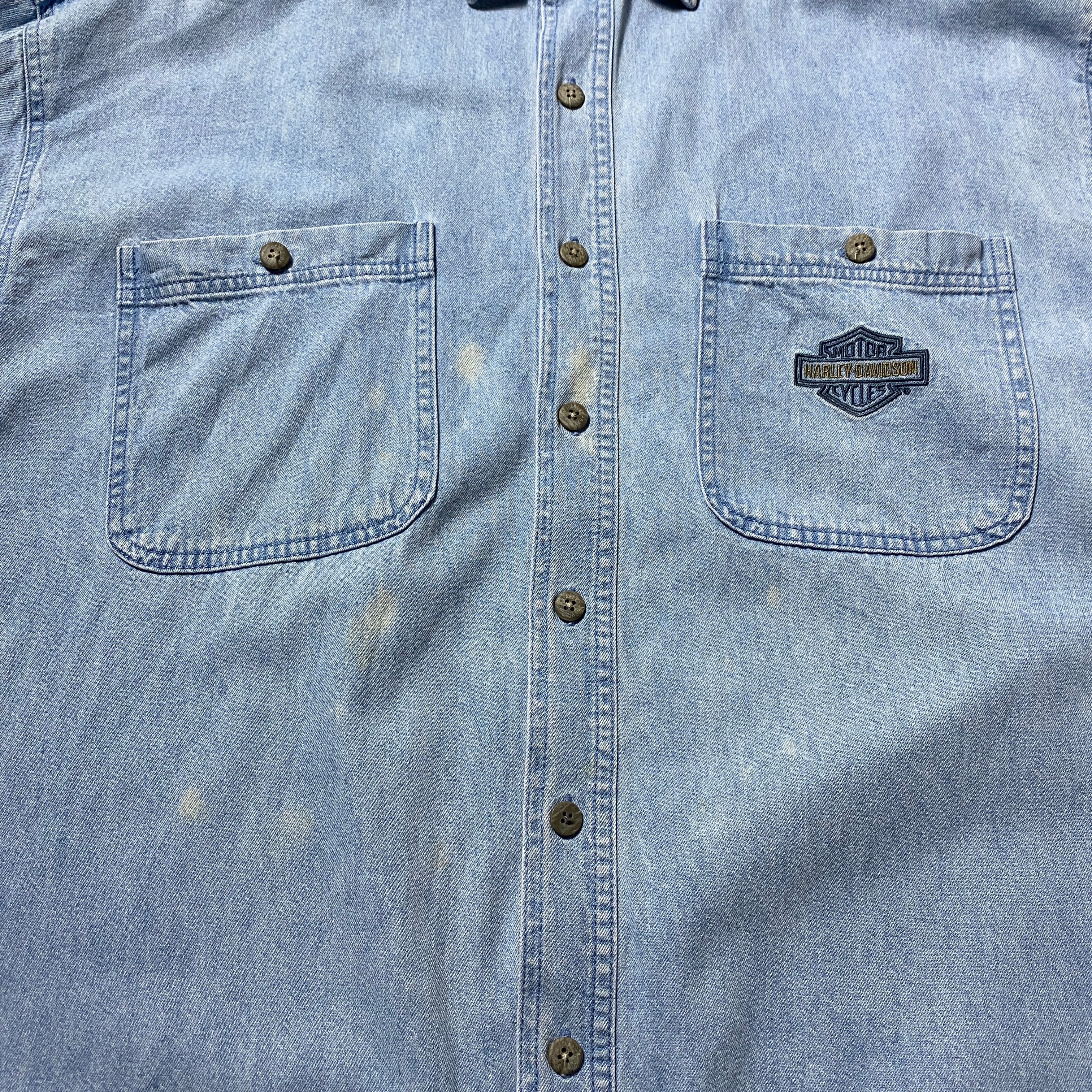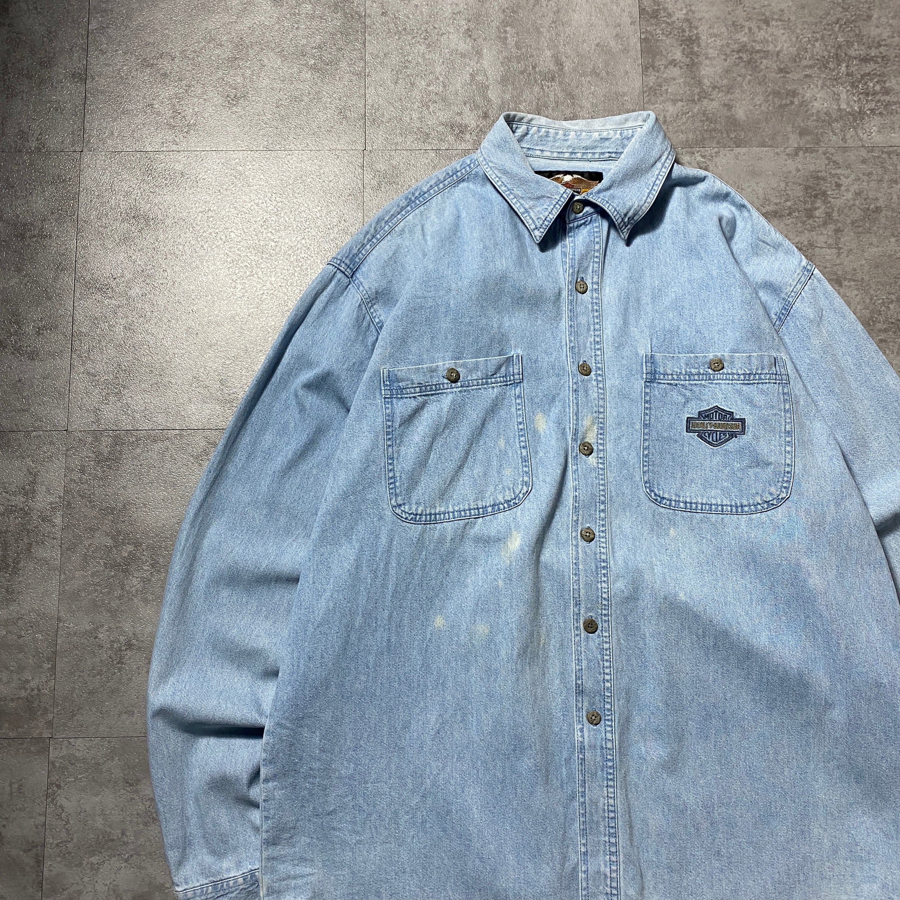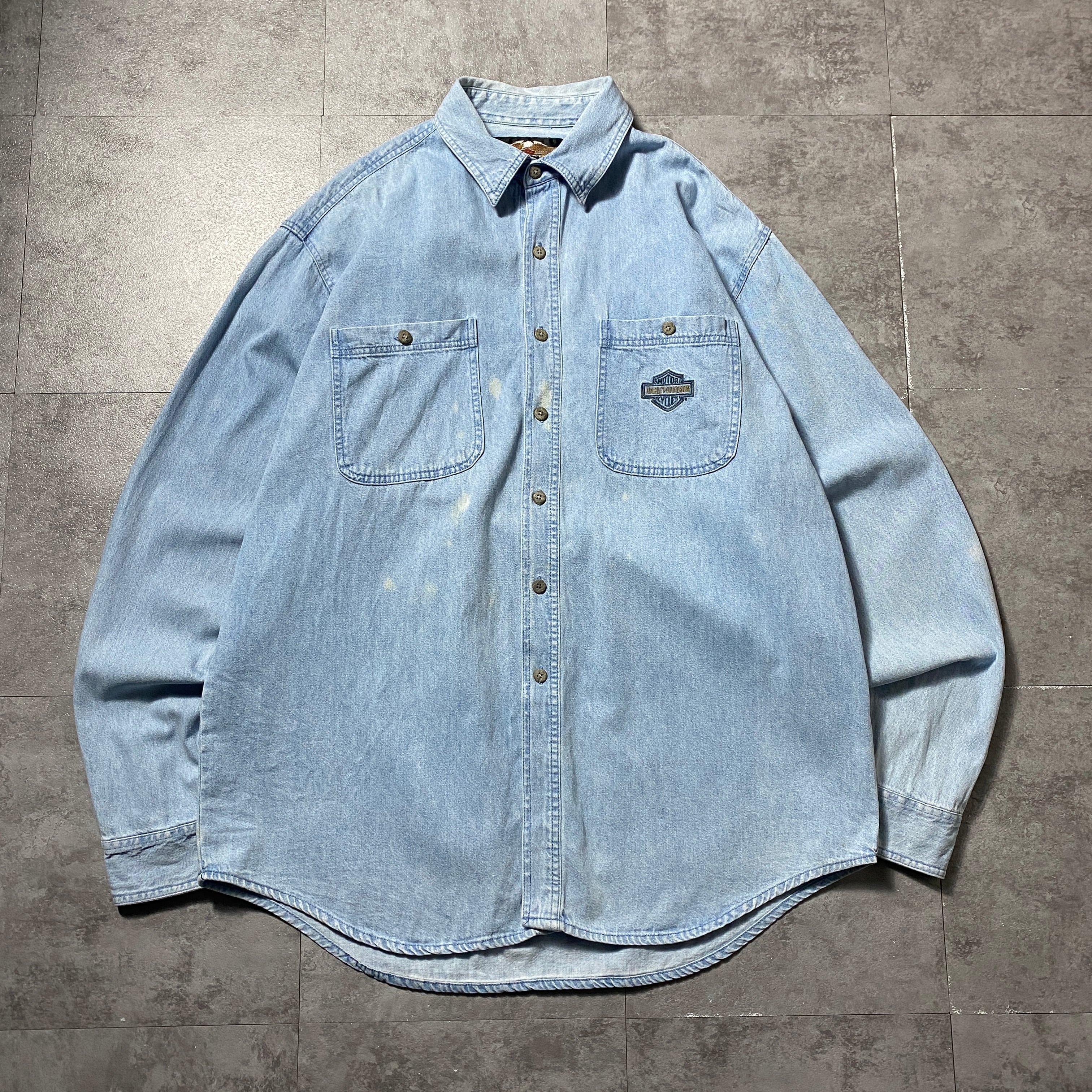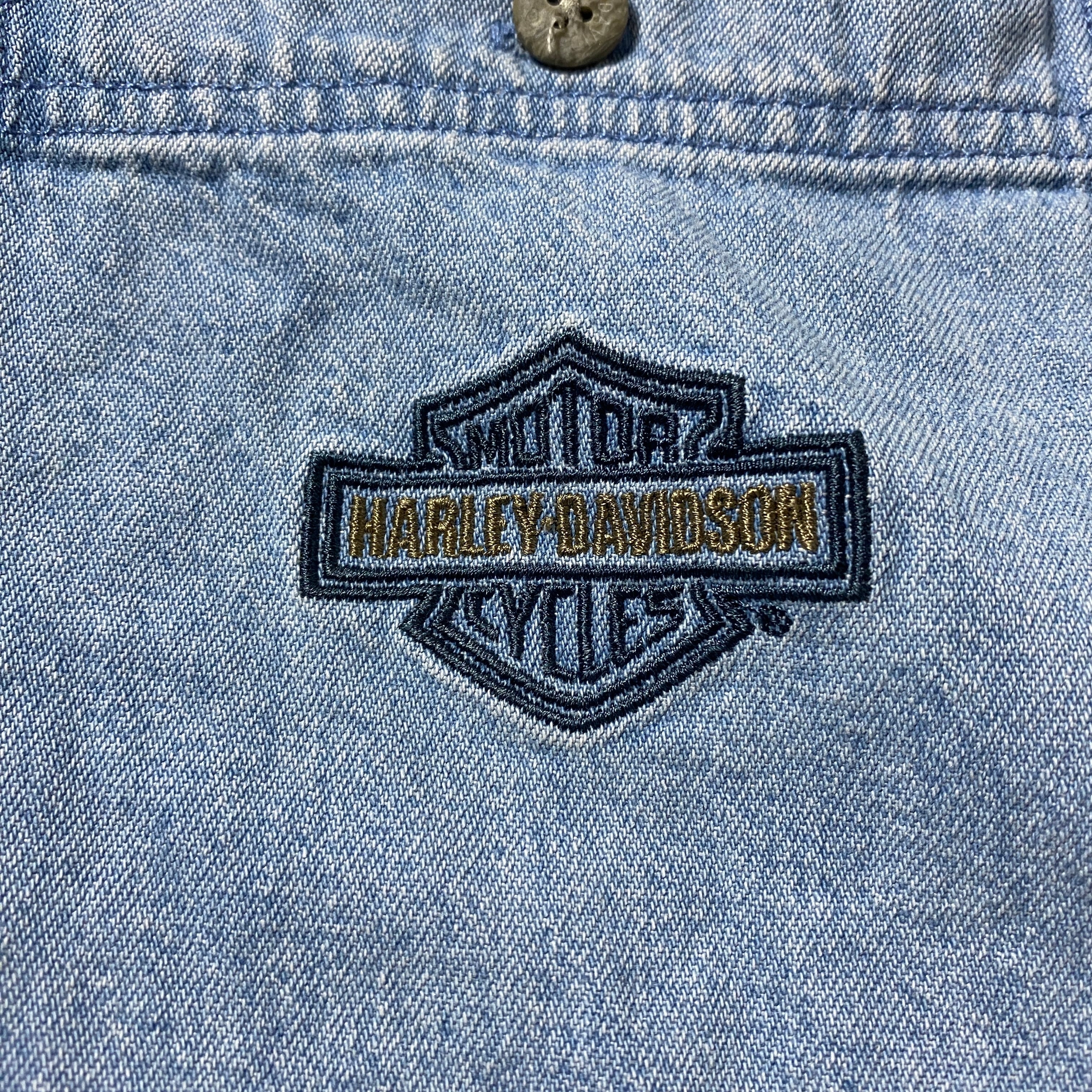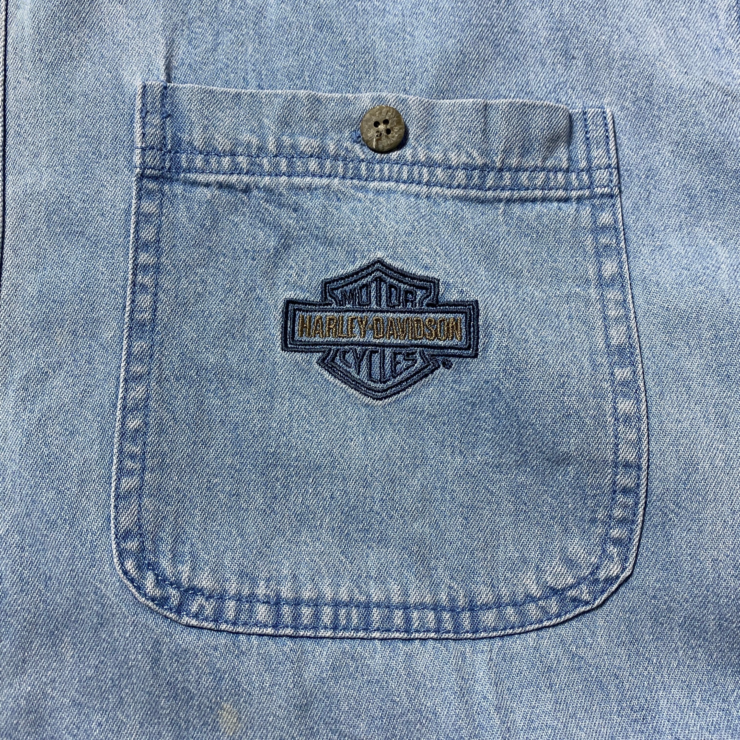 【Size:XL】90's Harley-Davidson ハーレーダビッドソン 刺繍ロゴ ダブルポケット ブリーチ デニムシャツ