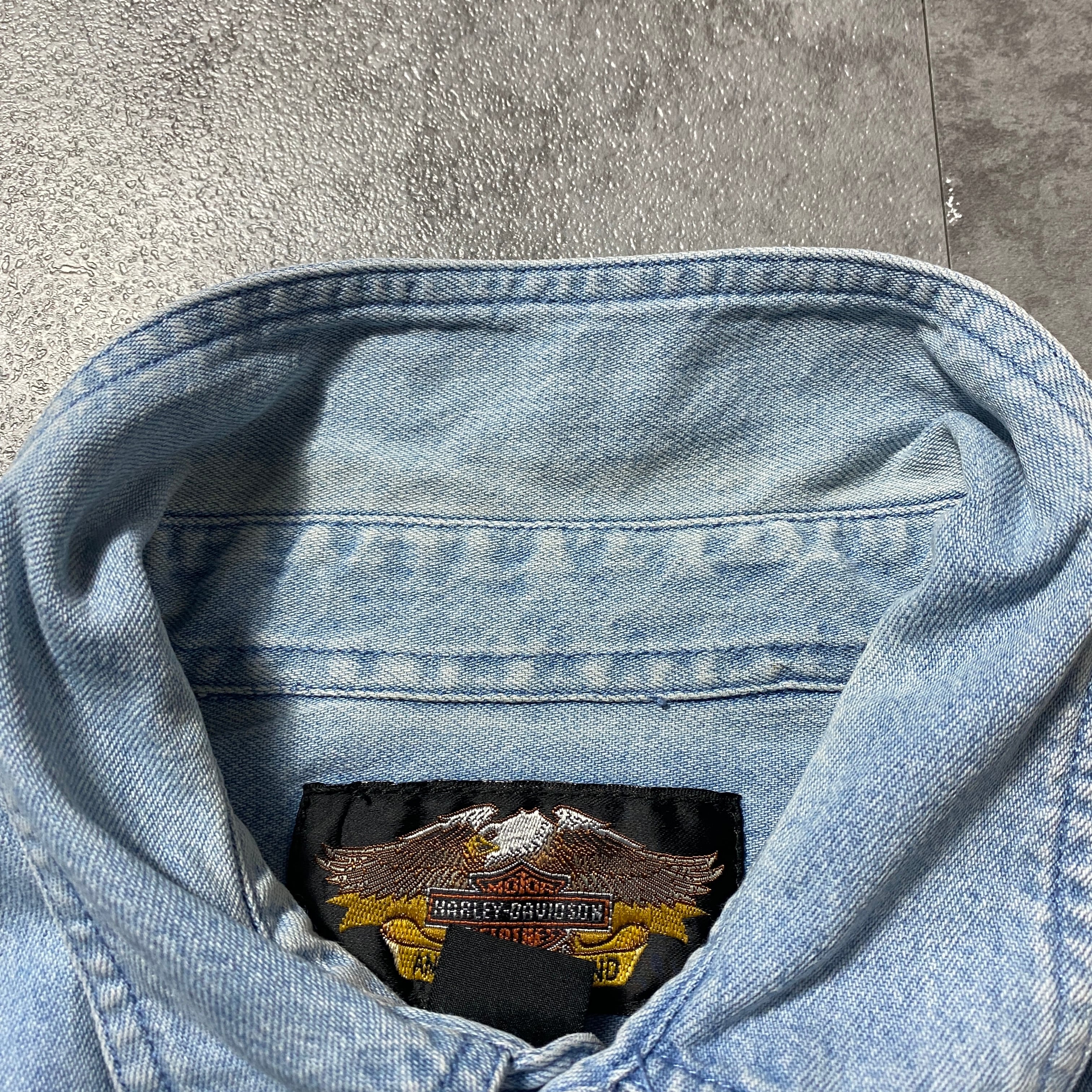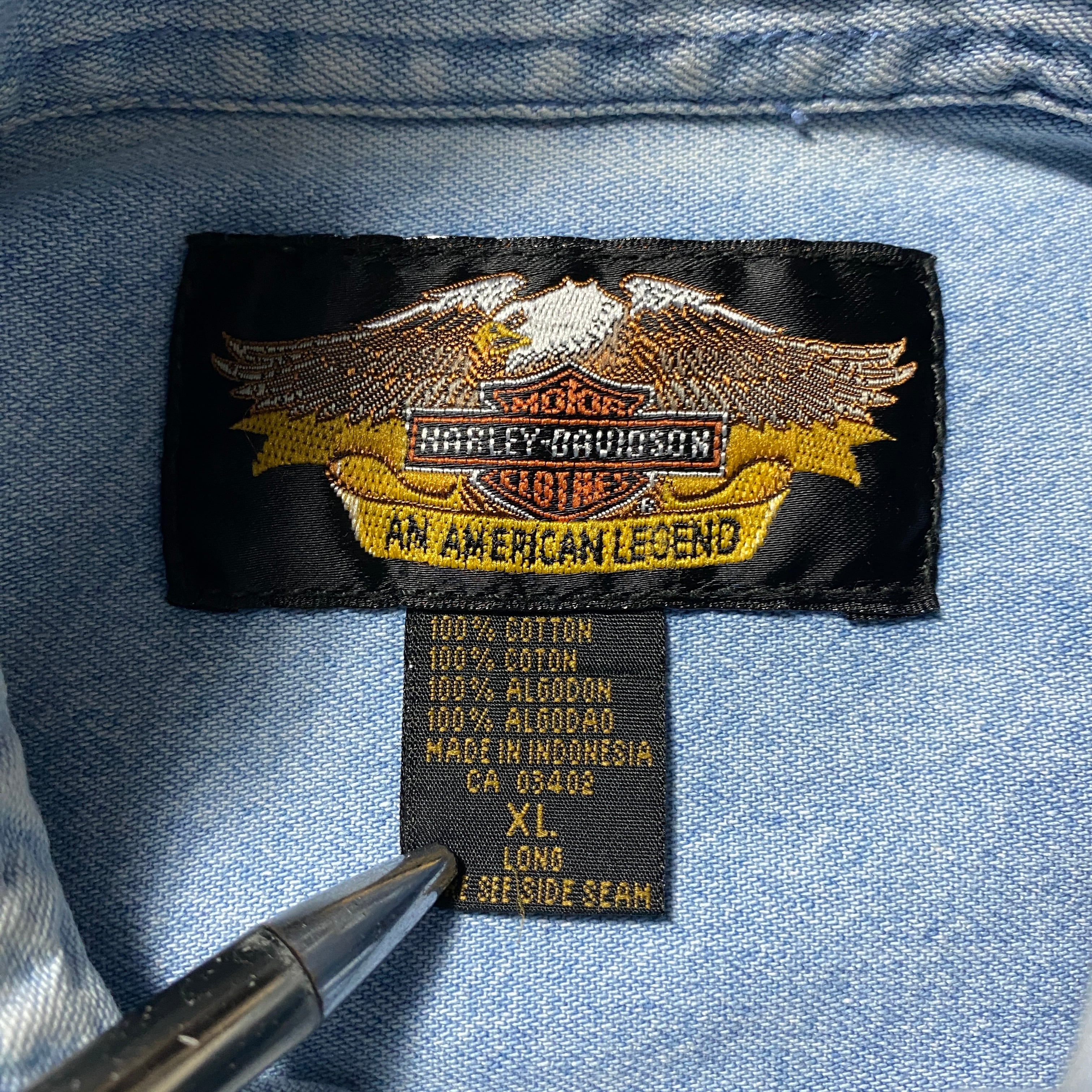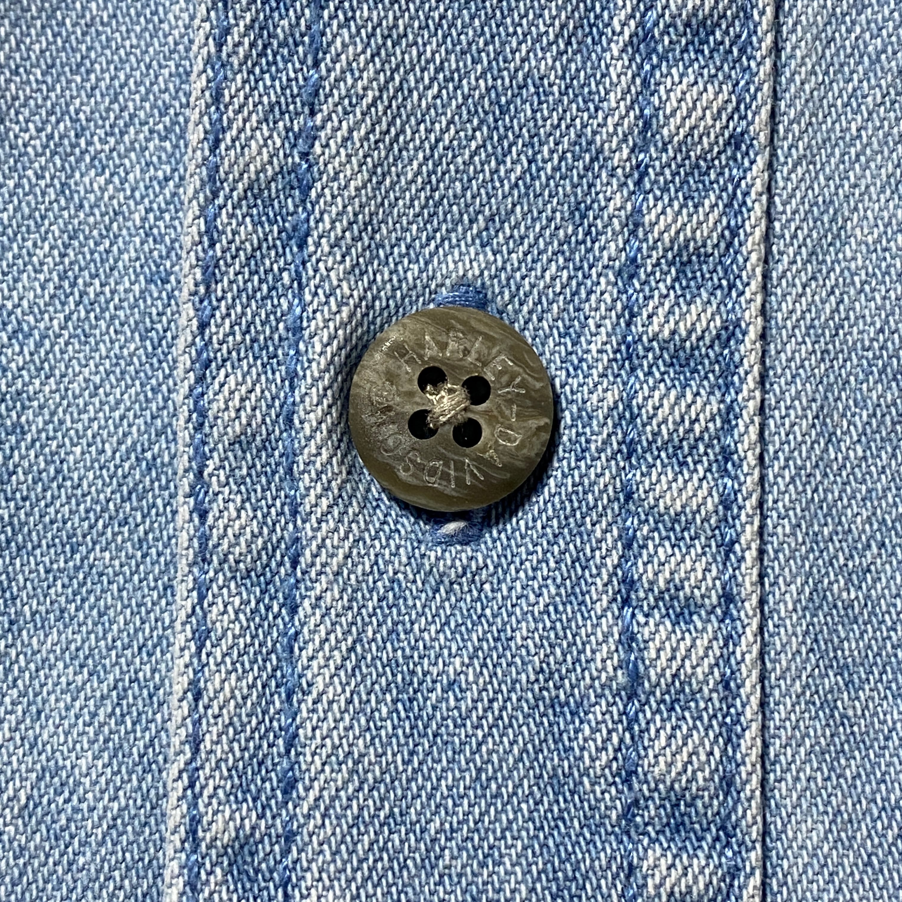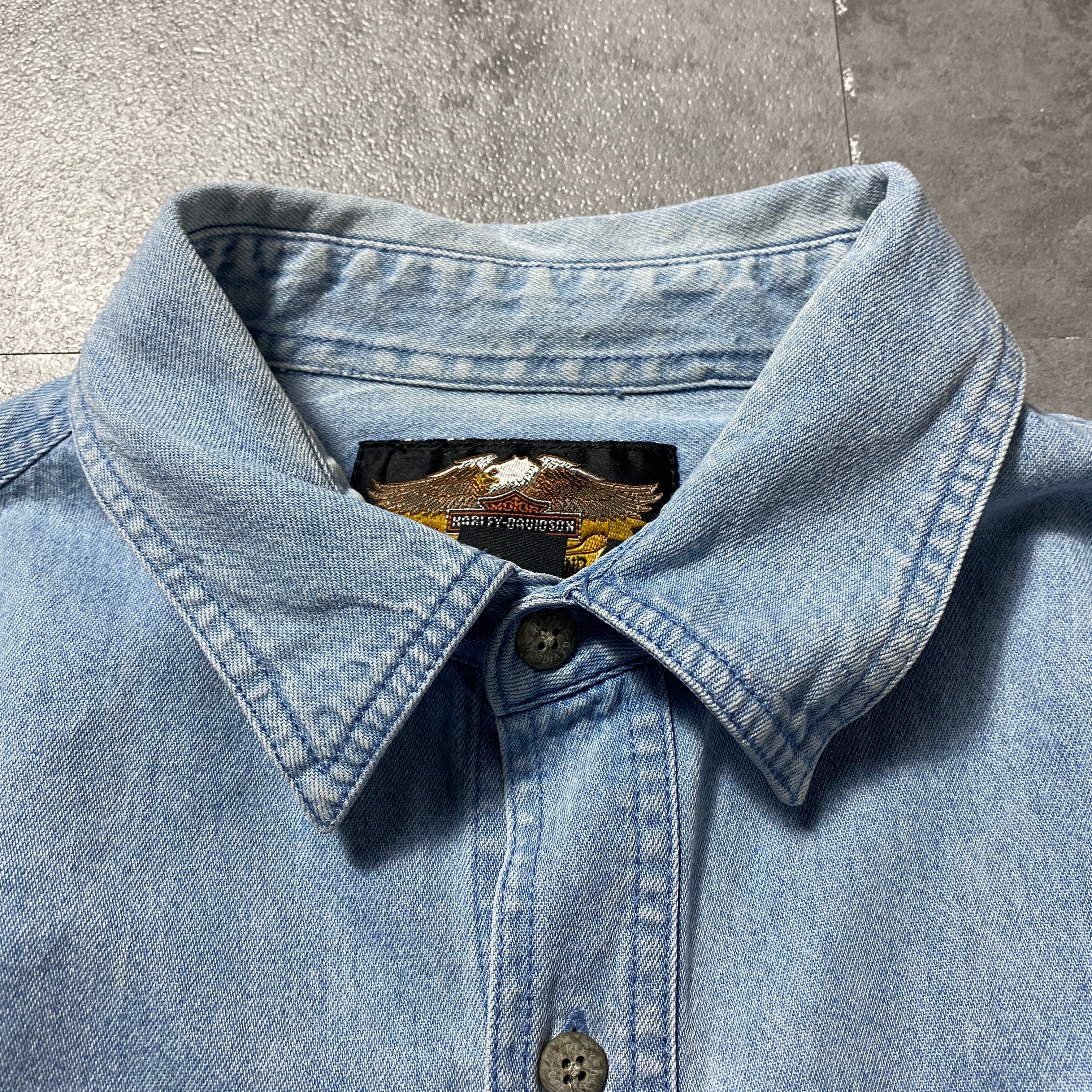 【Size:XL】90's Harley-Davidson ハーレーダビッドソン 刺繍ロゴ ダブルポケット ブリーチ デニムシャツ