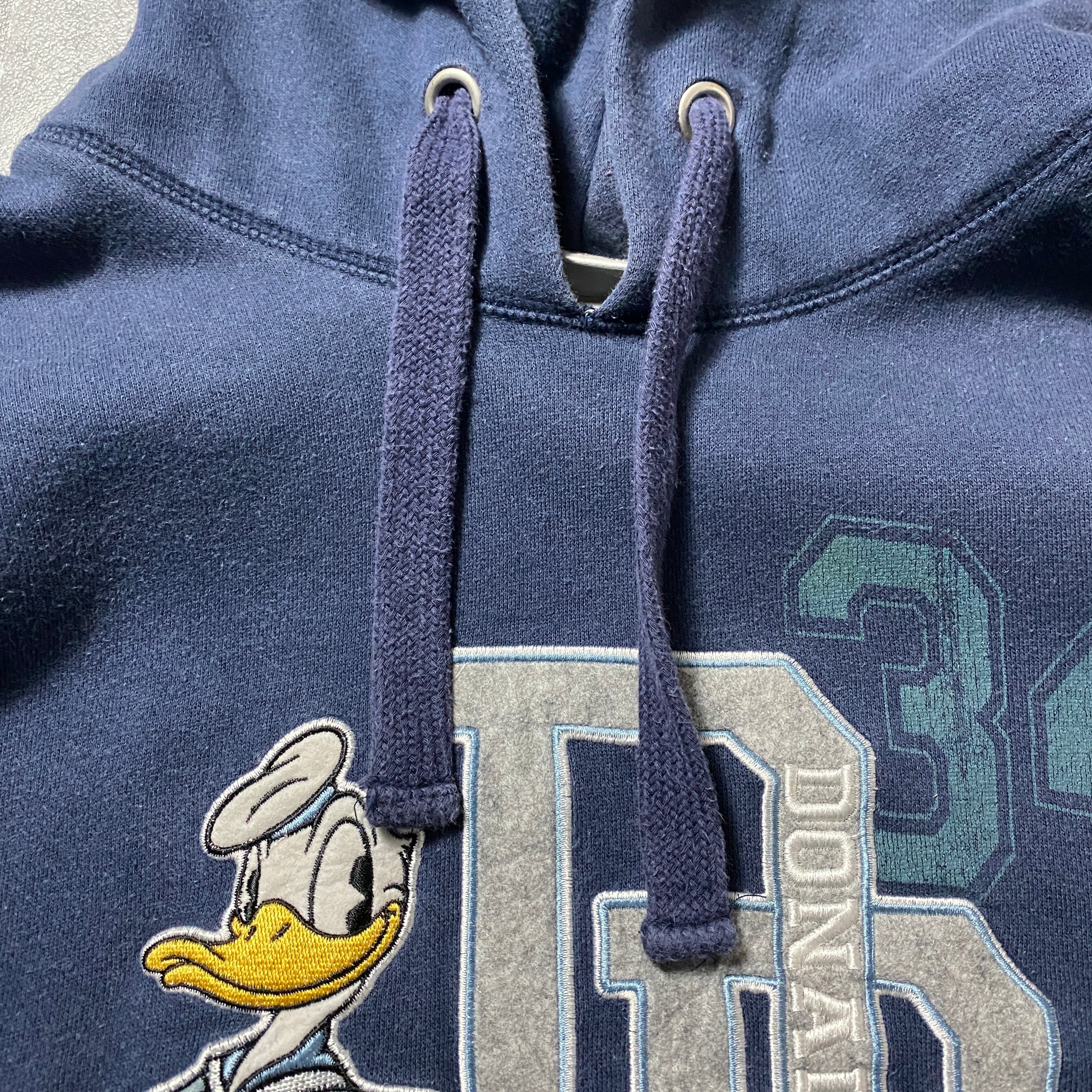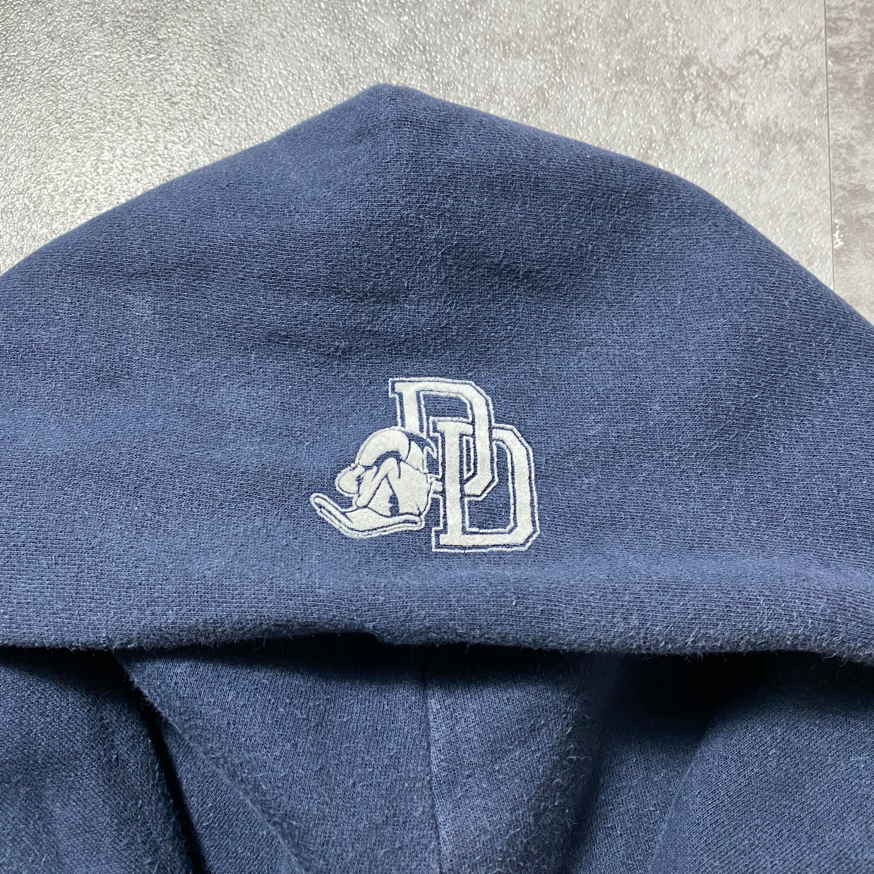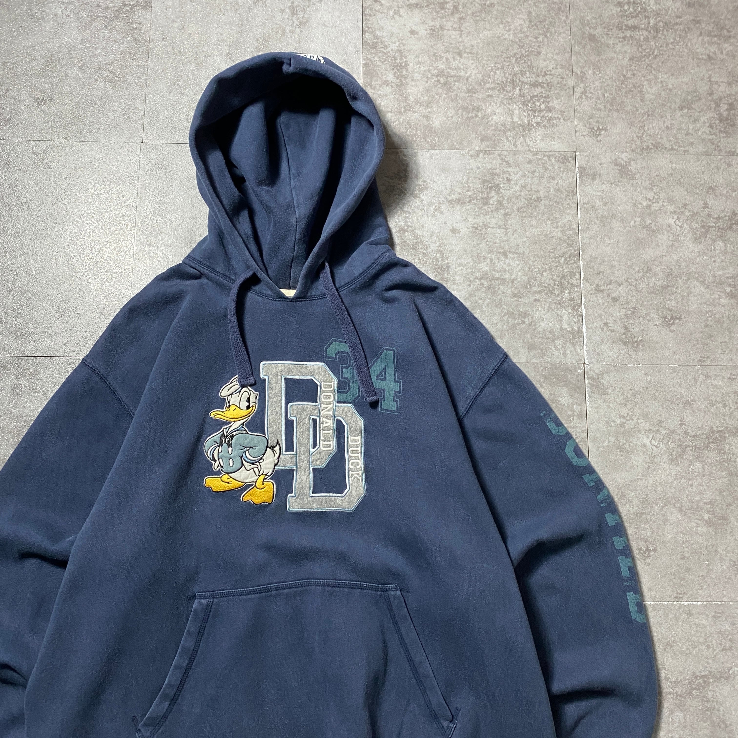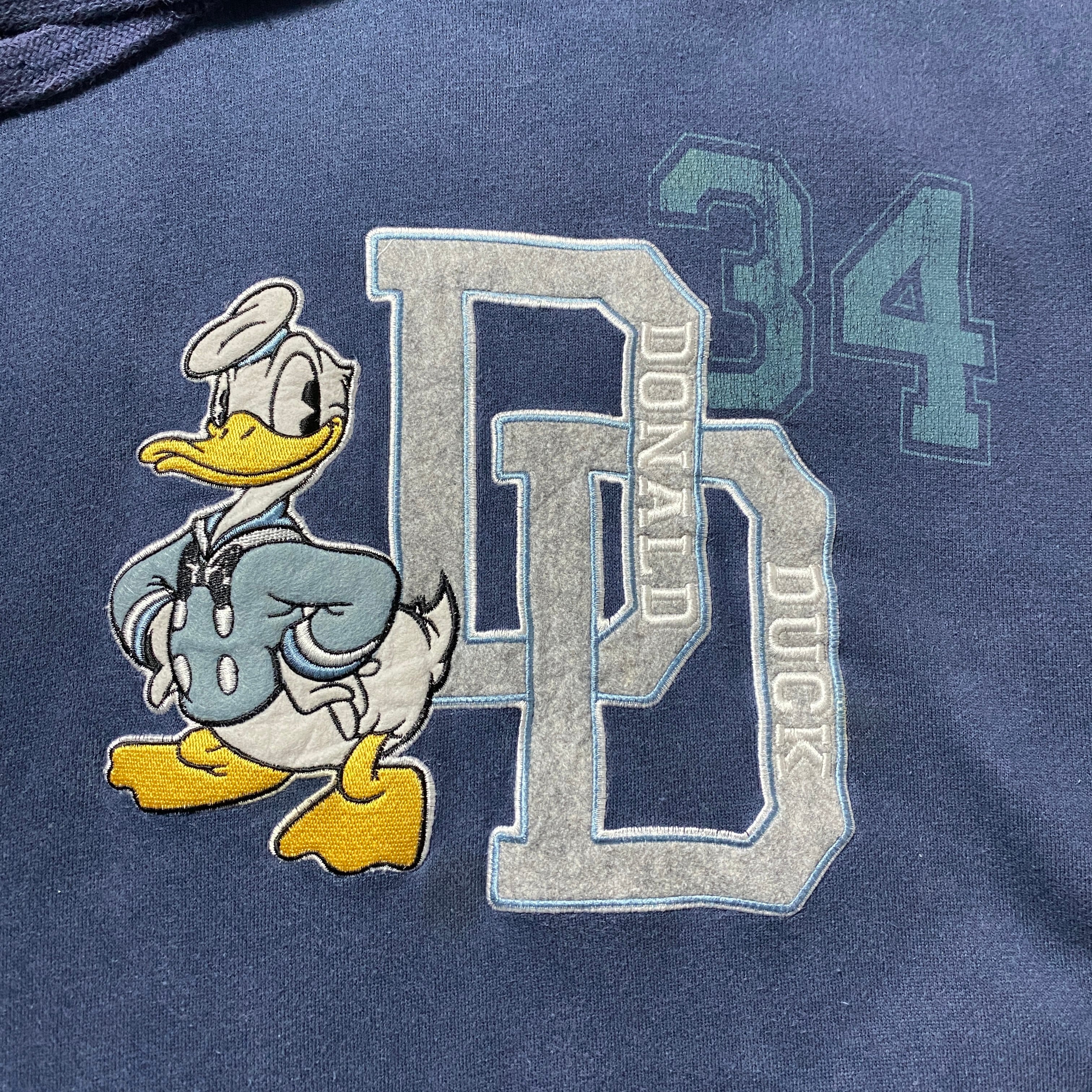 【Size:XL】00's Disney ディズニー ドナルドダック ワッペンロゴ ネイビー スウェット パーカー フーディ