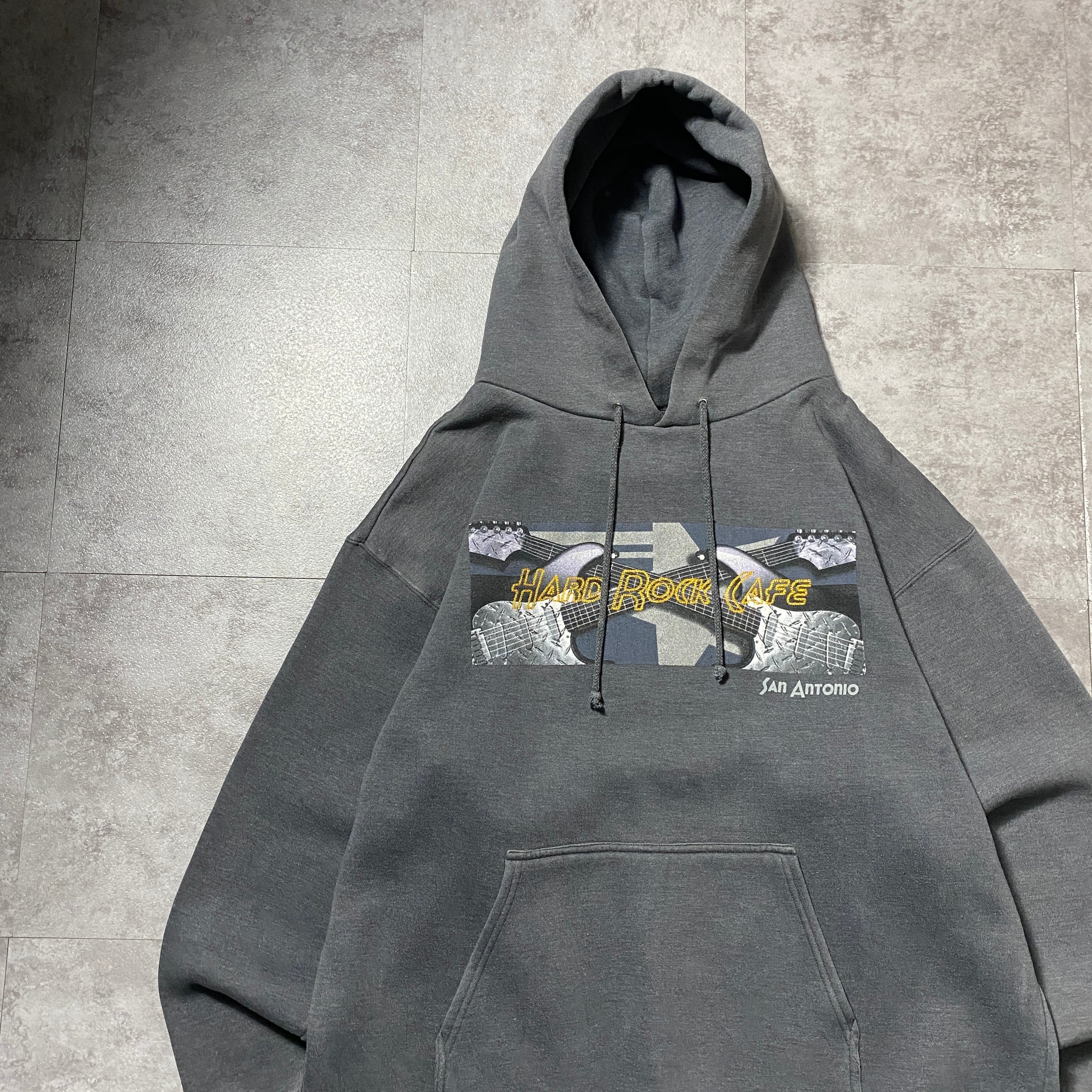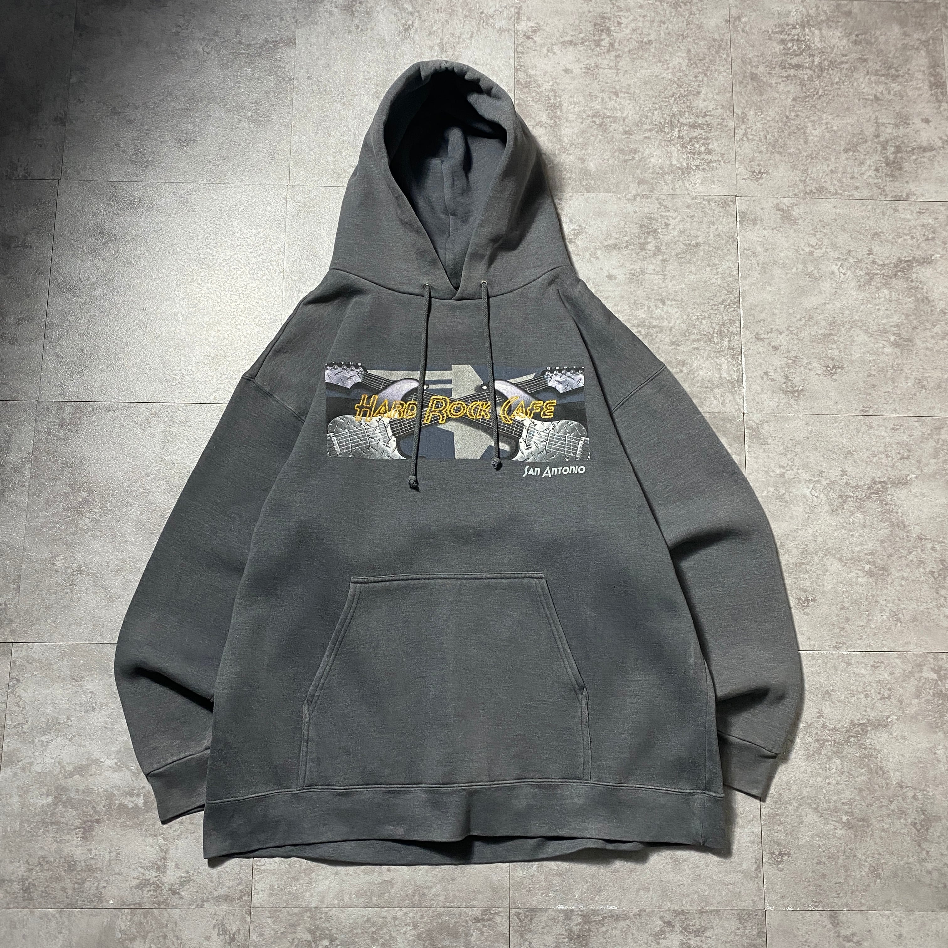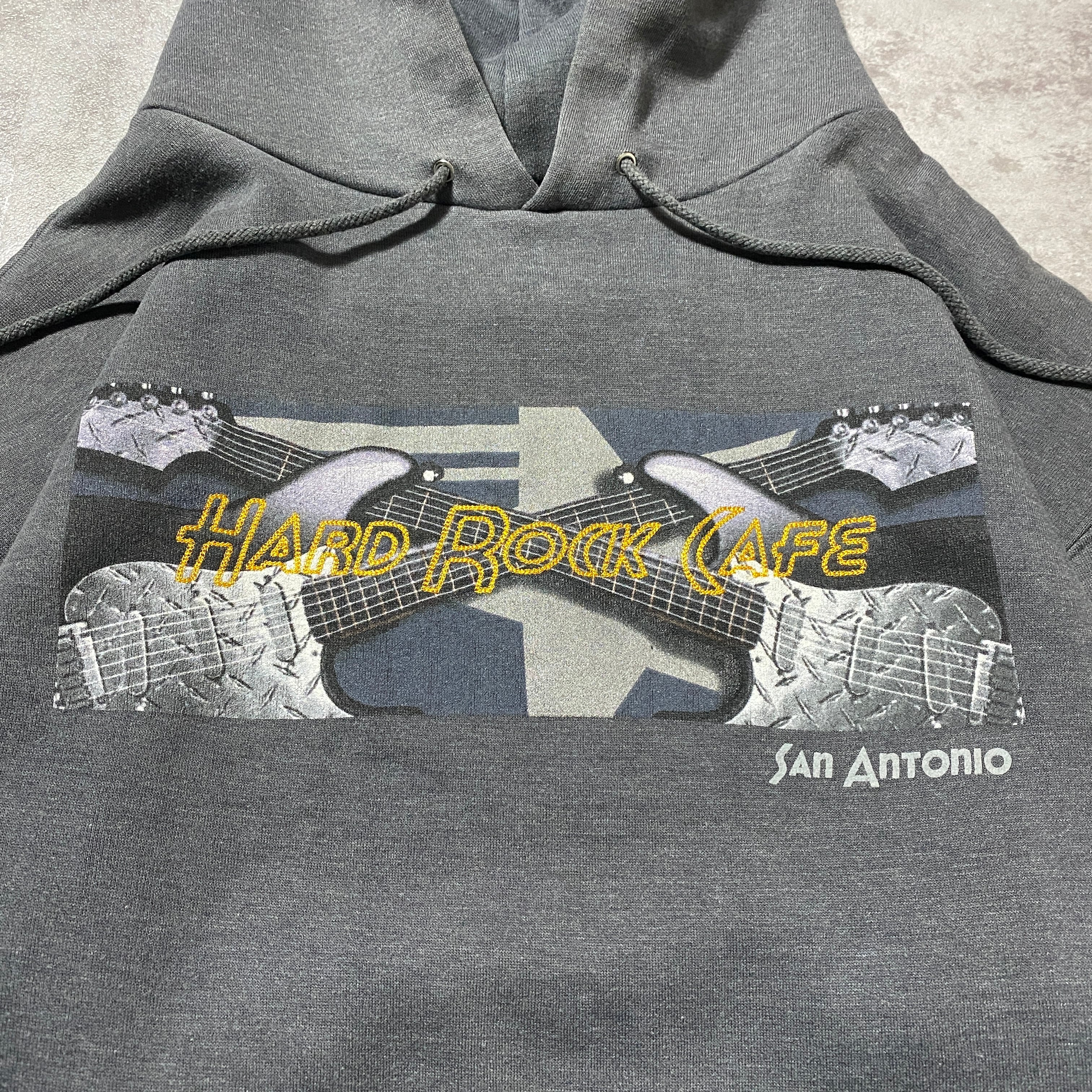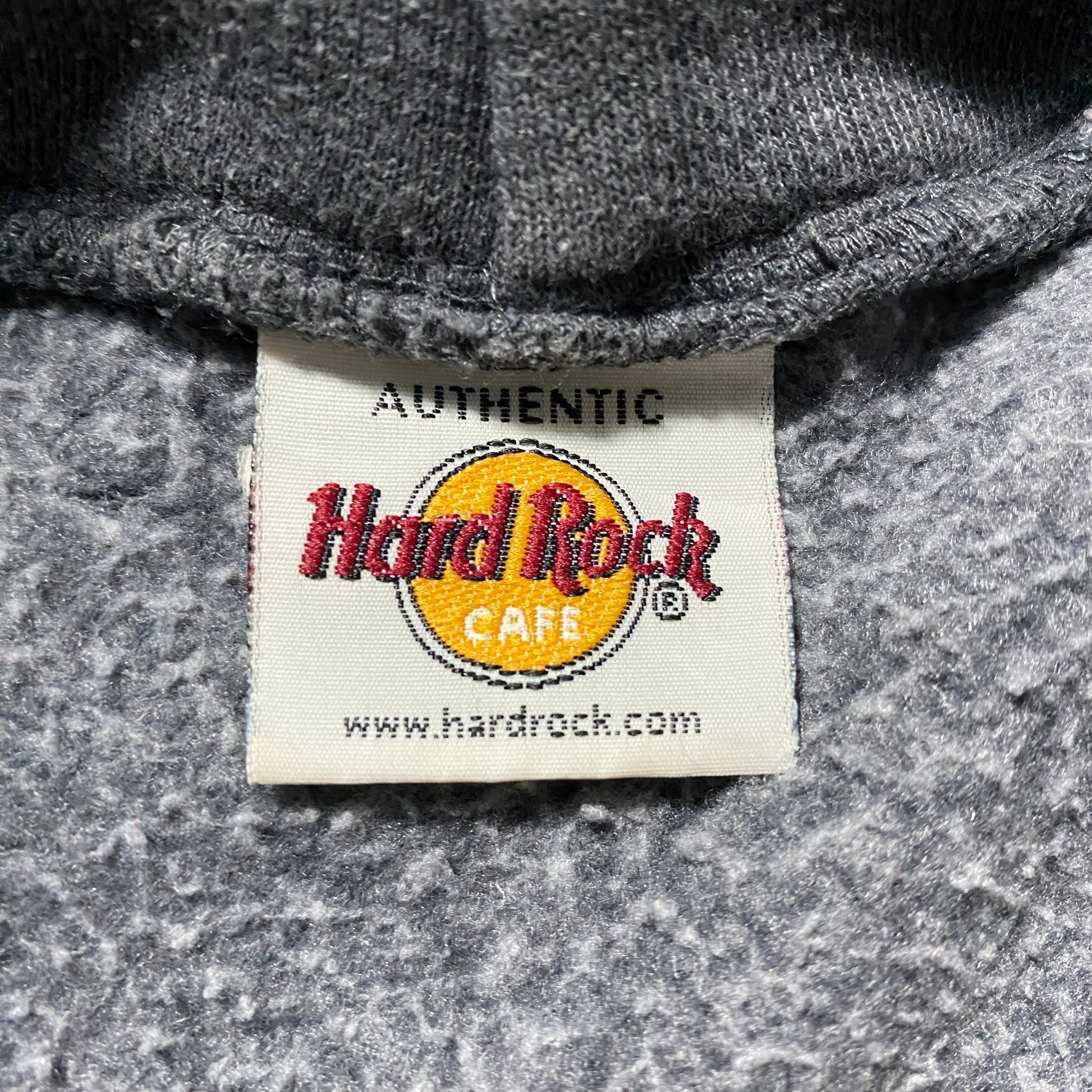【希少ロシア製】90's Hard Rock Cafe ハードロックカフェ ギター 刺繍×プリント ダークグレー スウェット パーカー
