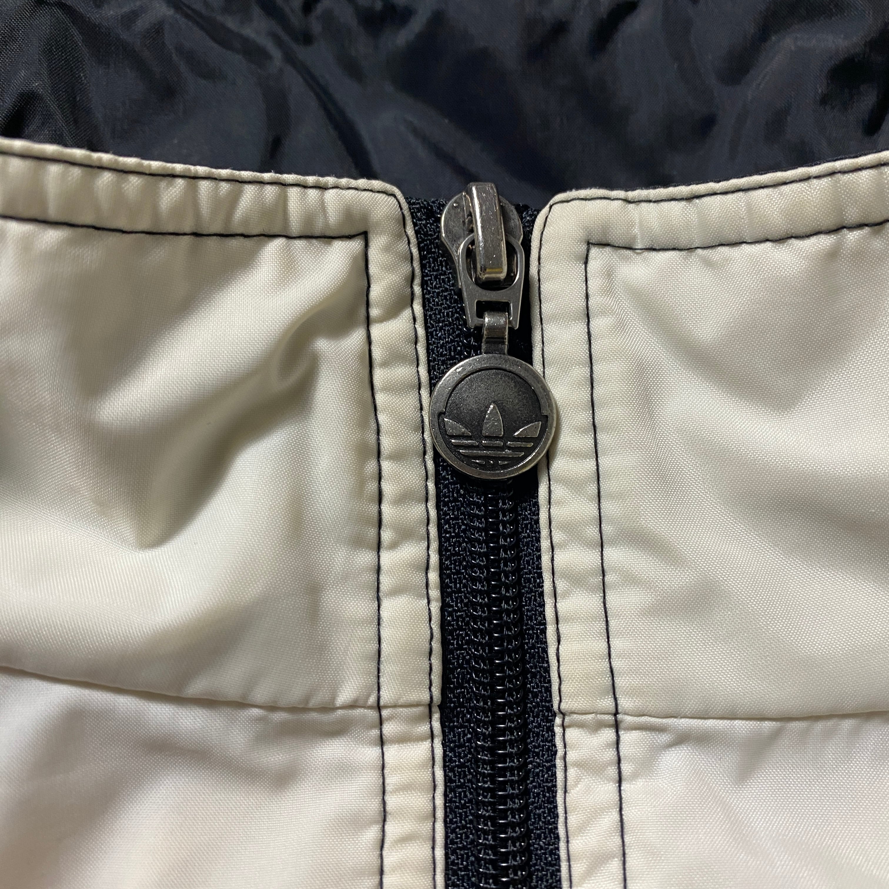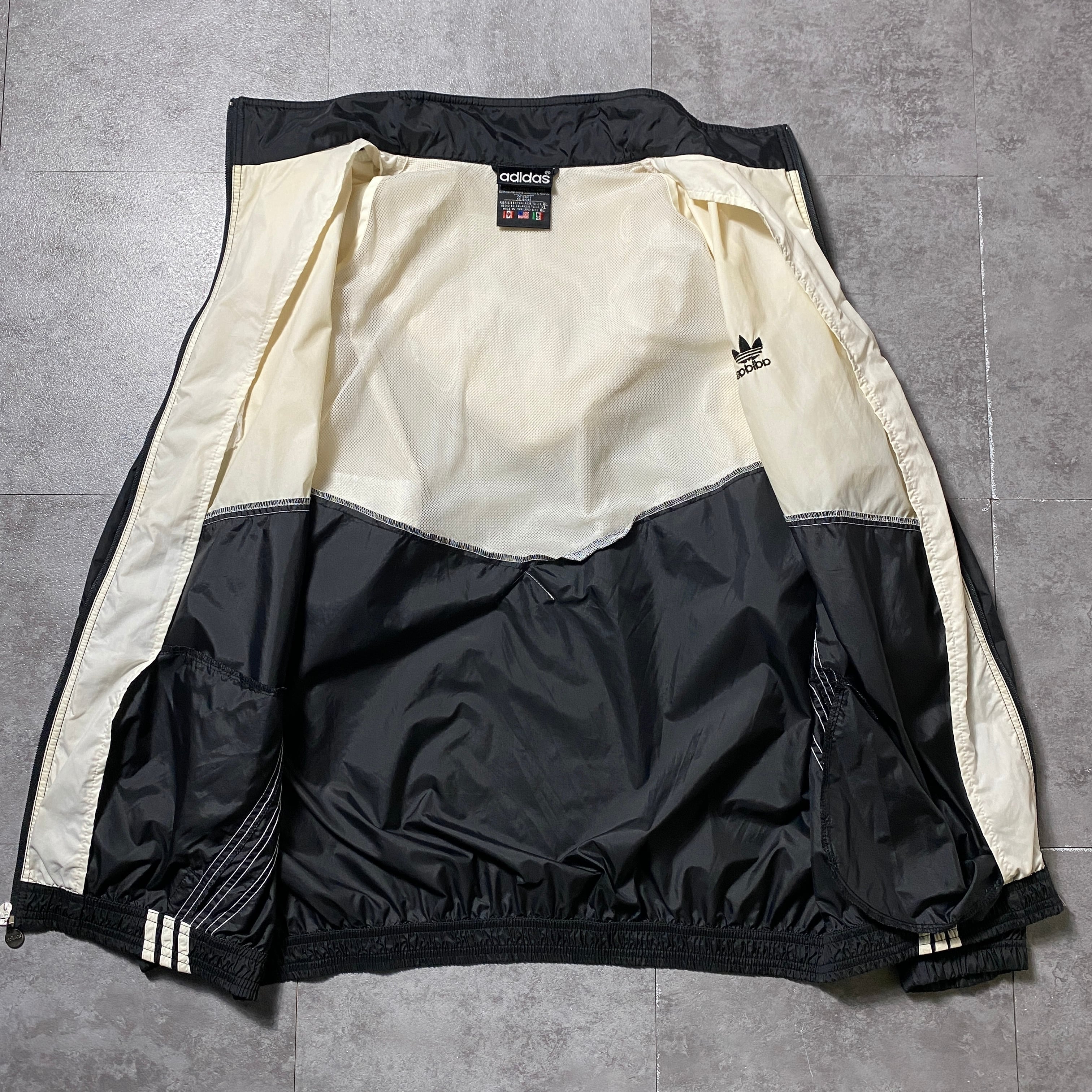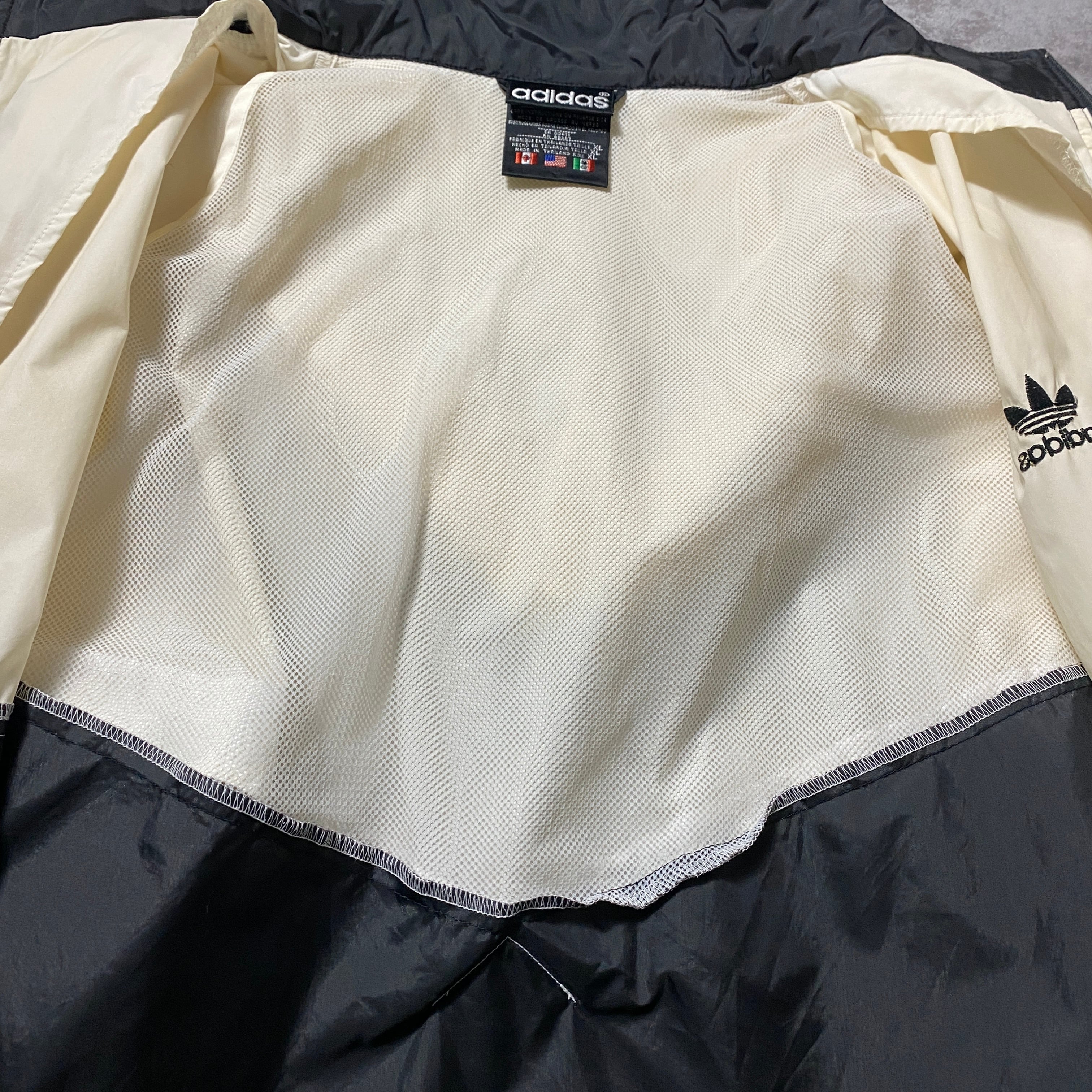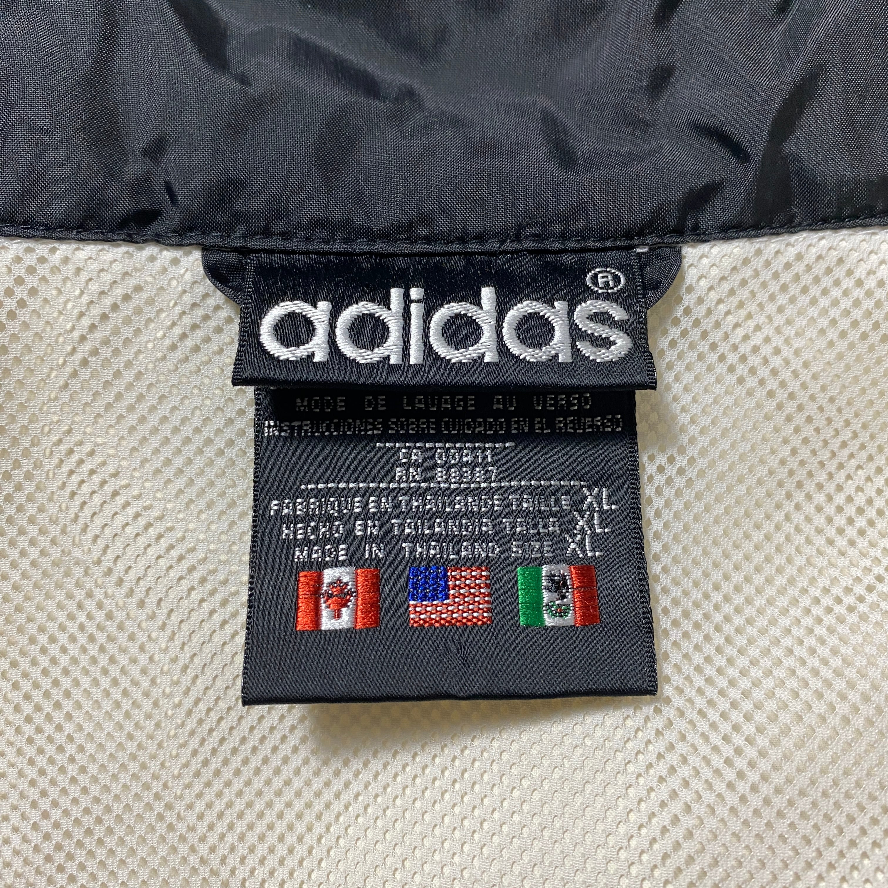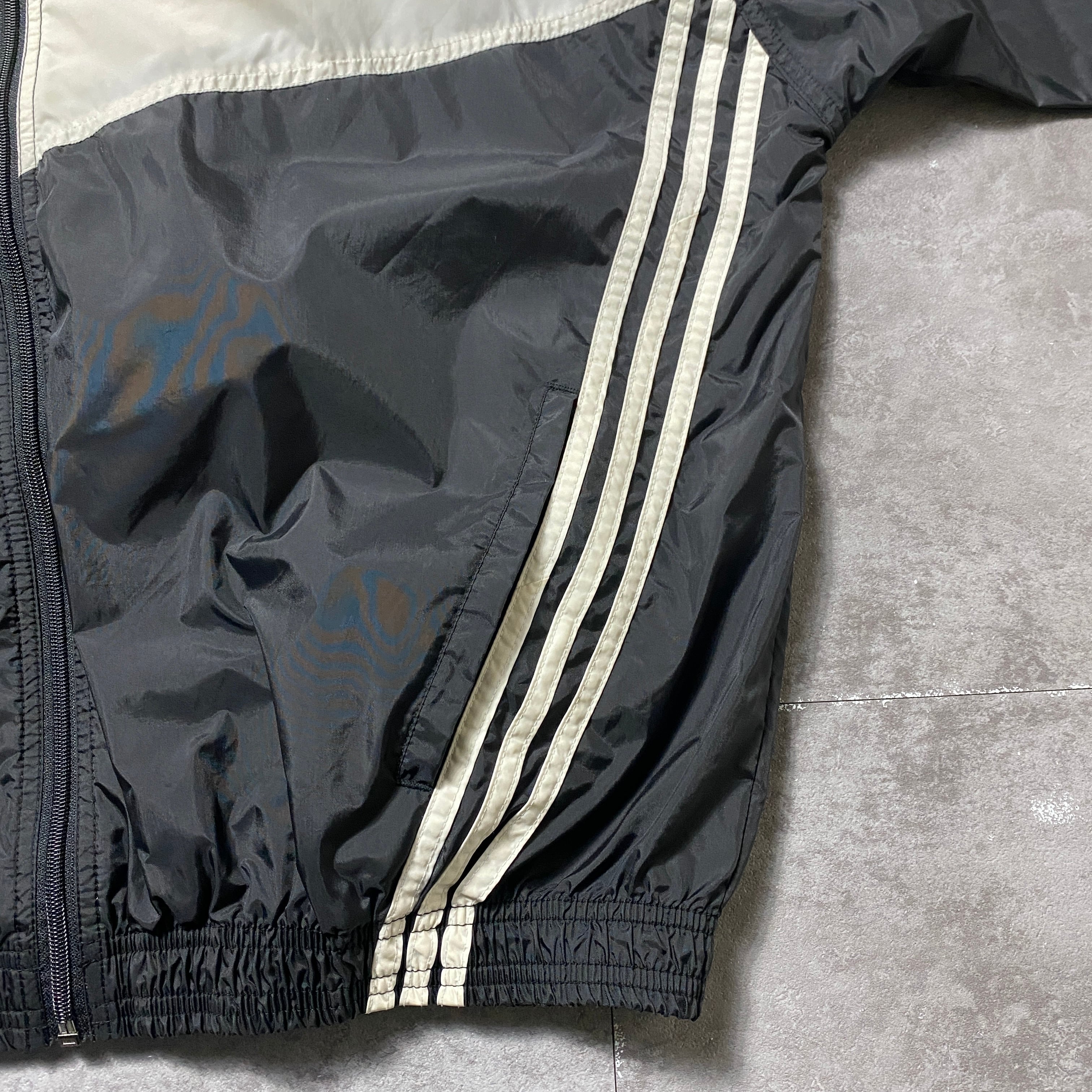 【Size:XL】90's adidas アディダス トレフォイル 刺繍ワンポイント スリーストライプ フード格納 ナイロンジャケット