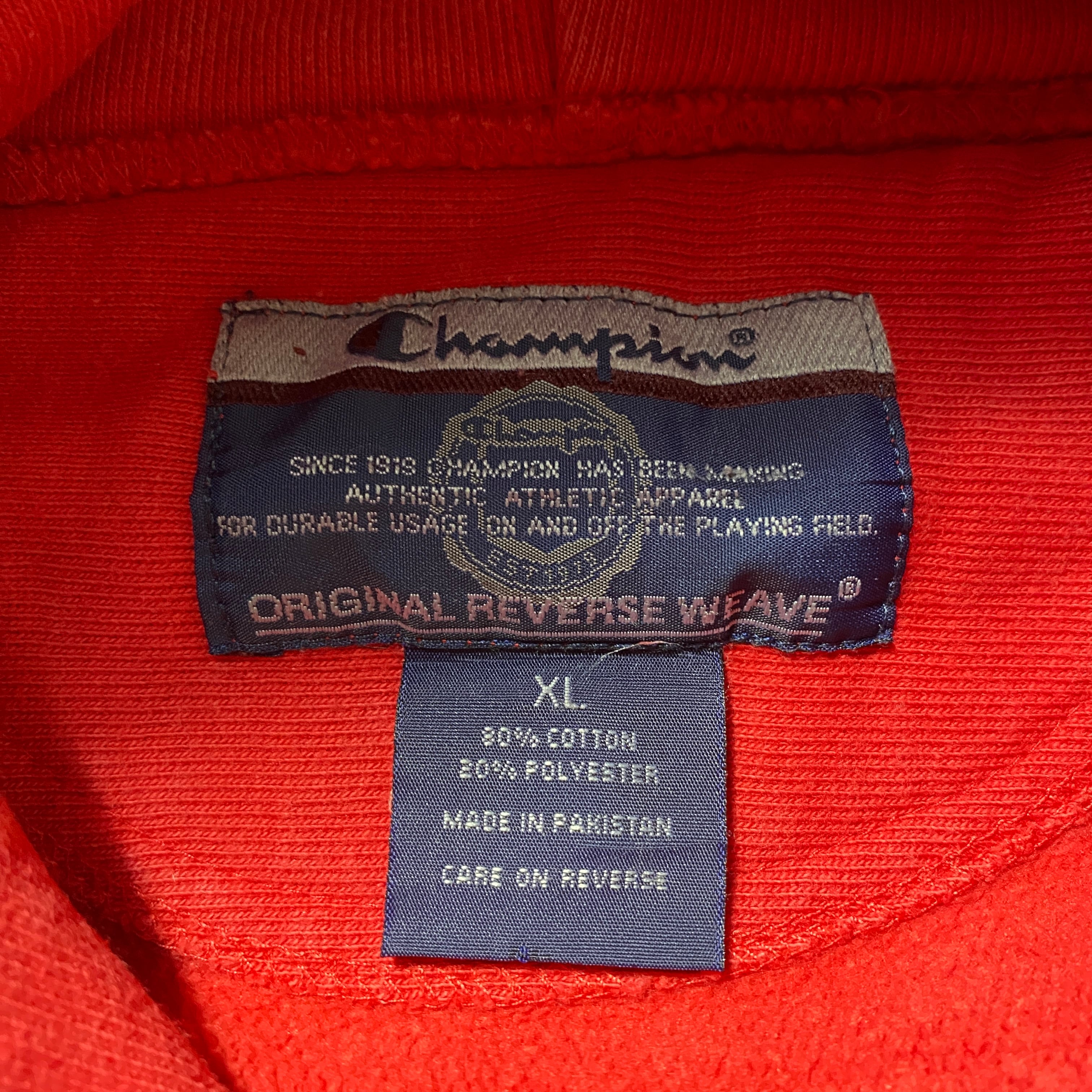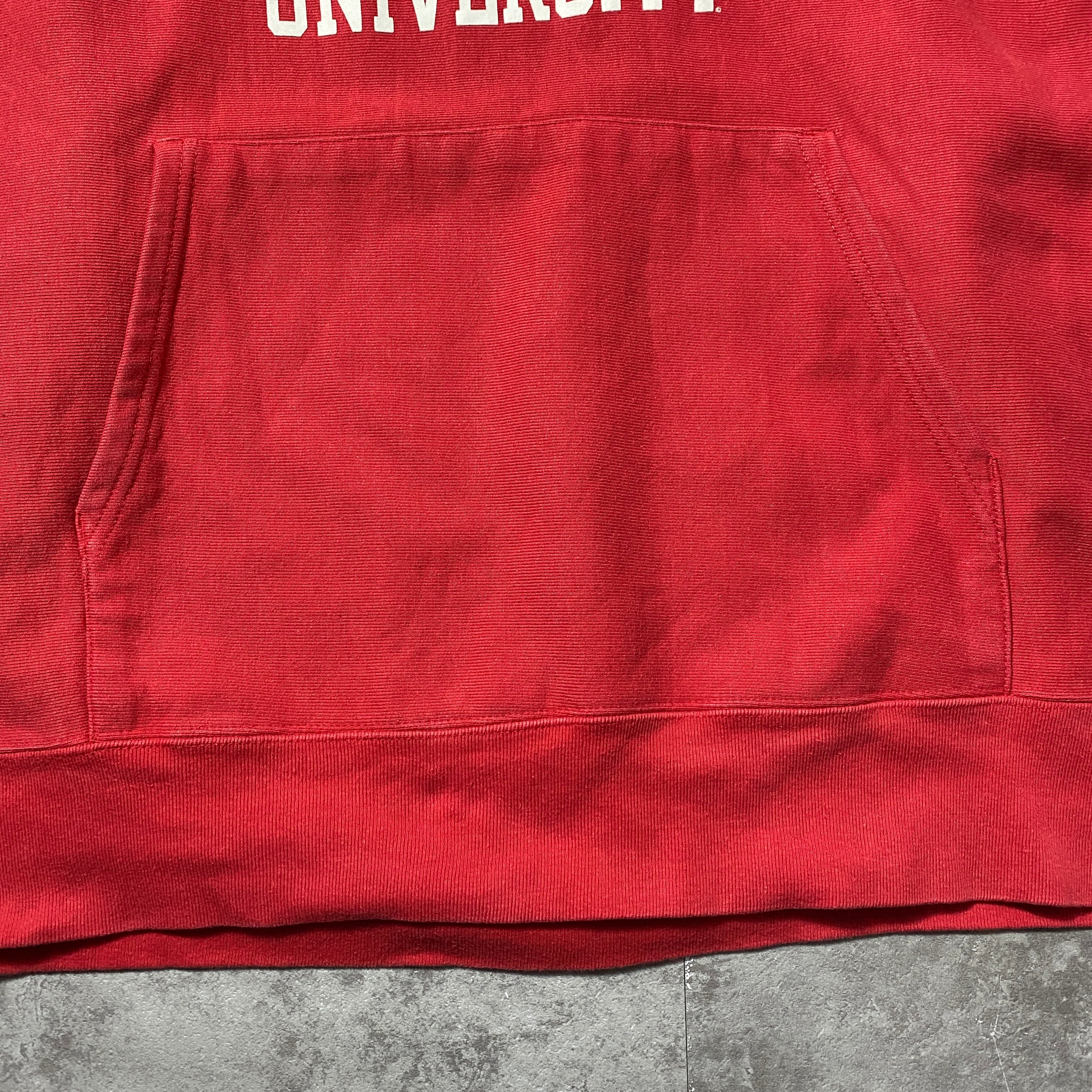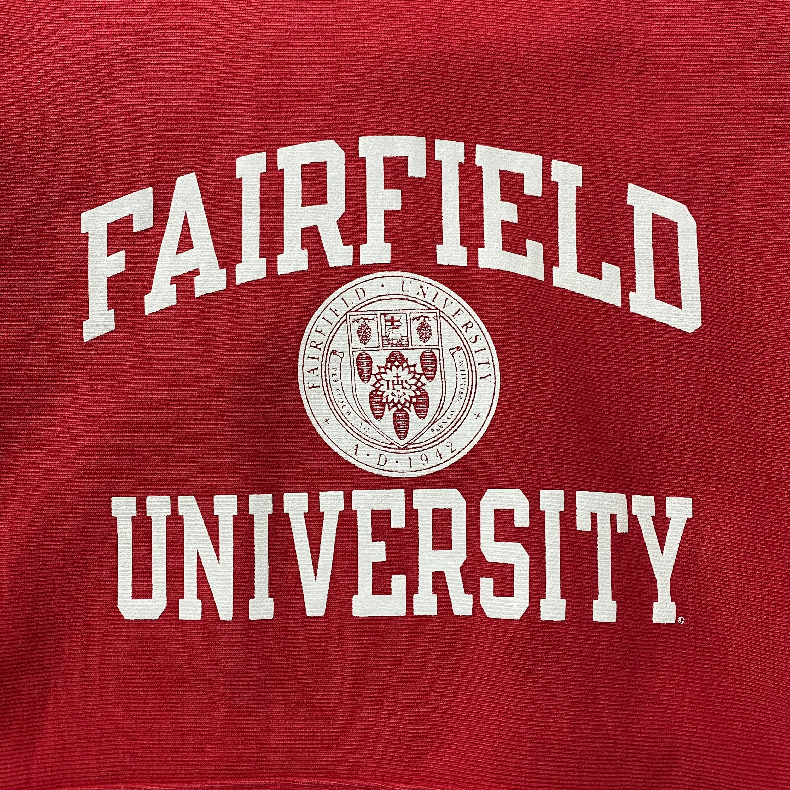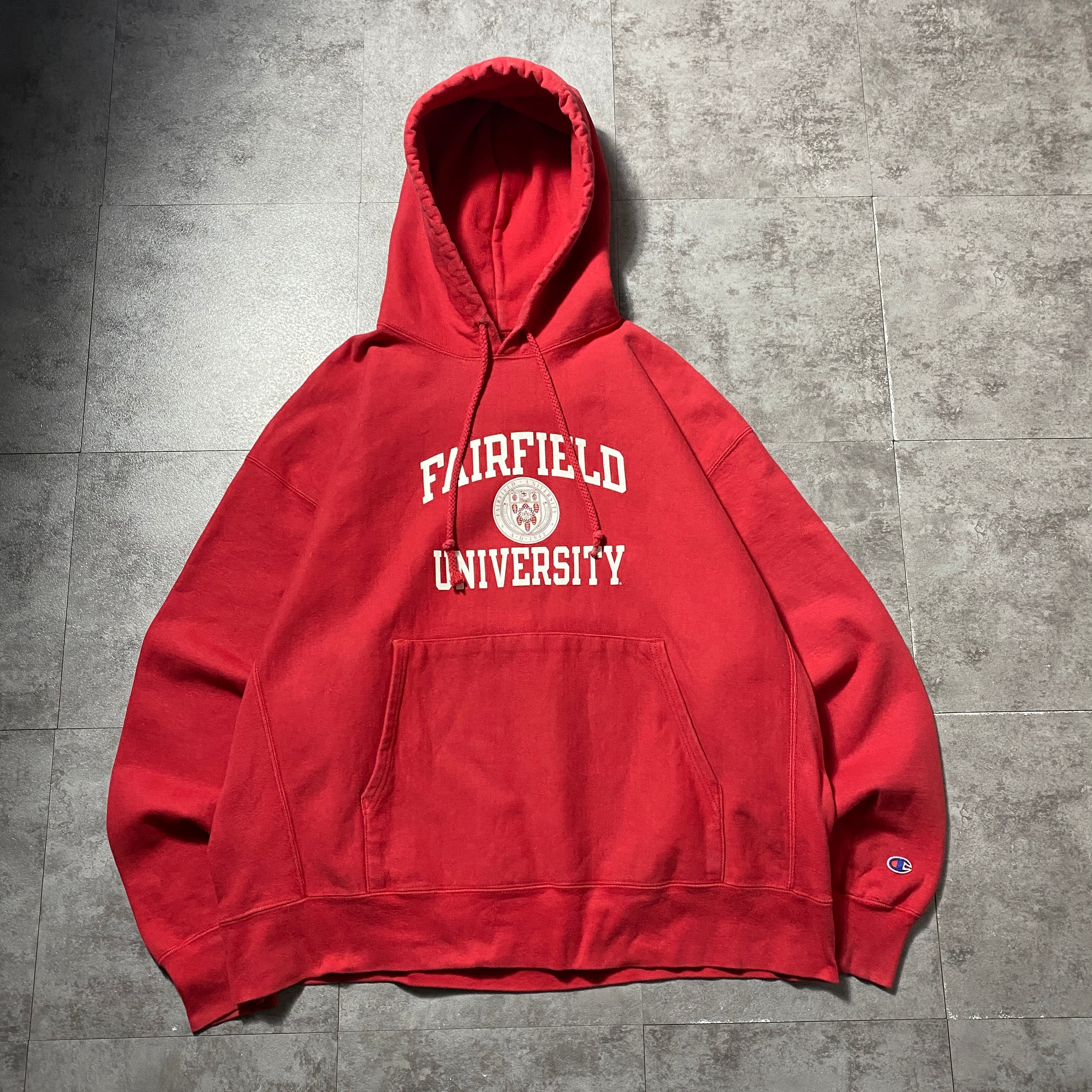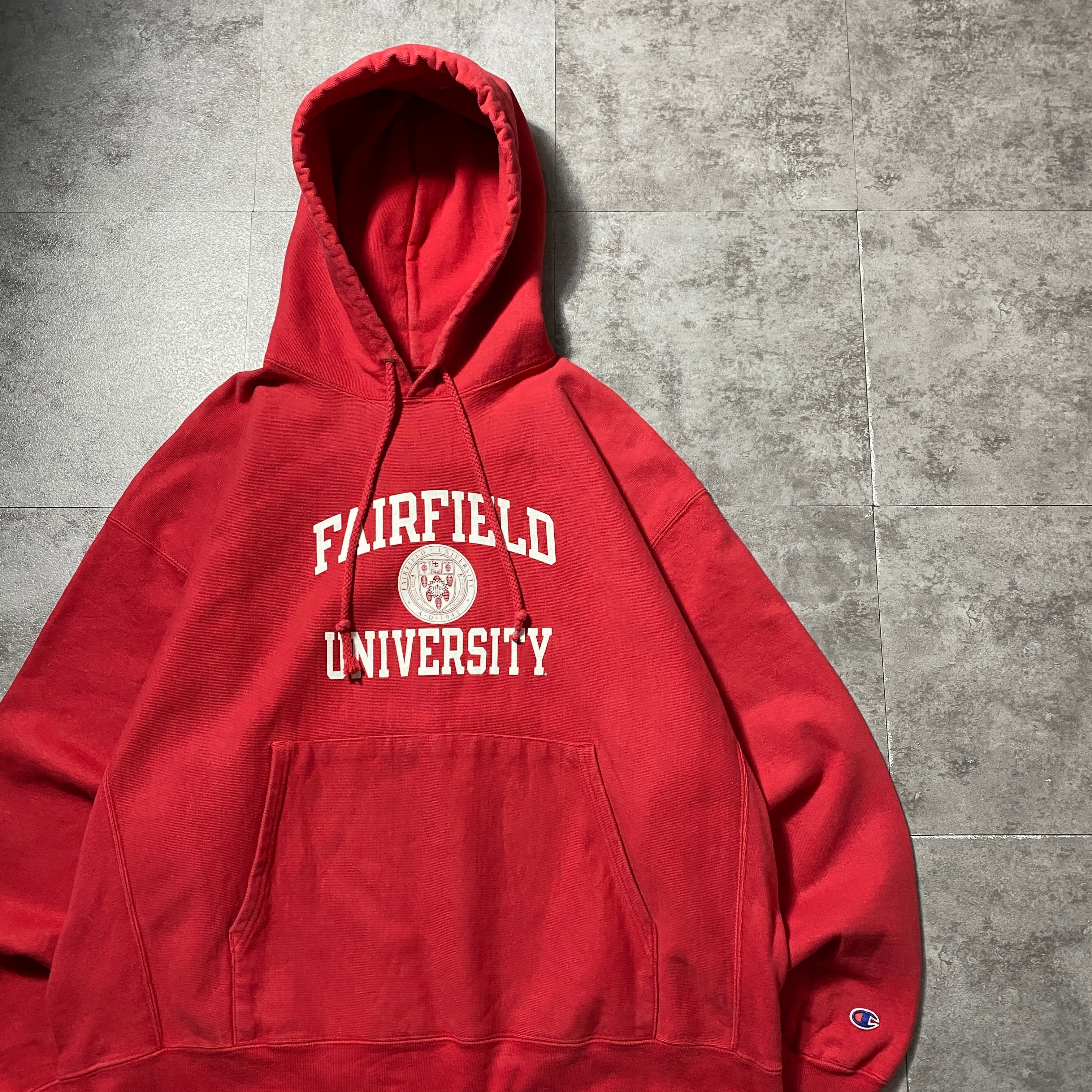【Size:XL】00's Champion チャンピオン プレミアムリバースウィーブ フェアフィールド大学 カレッジロゴ プリント レッド スウェット パーカー フーディ