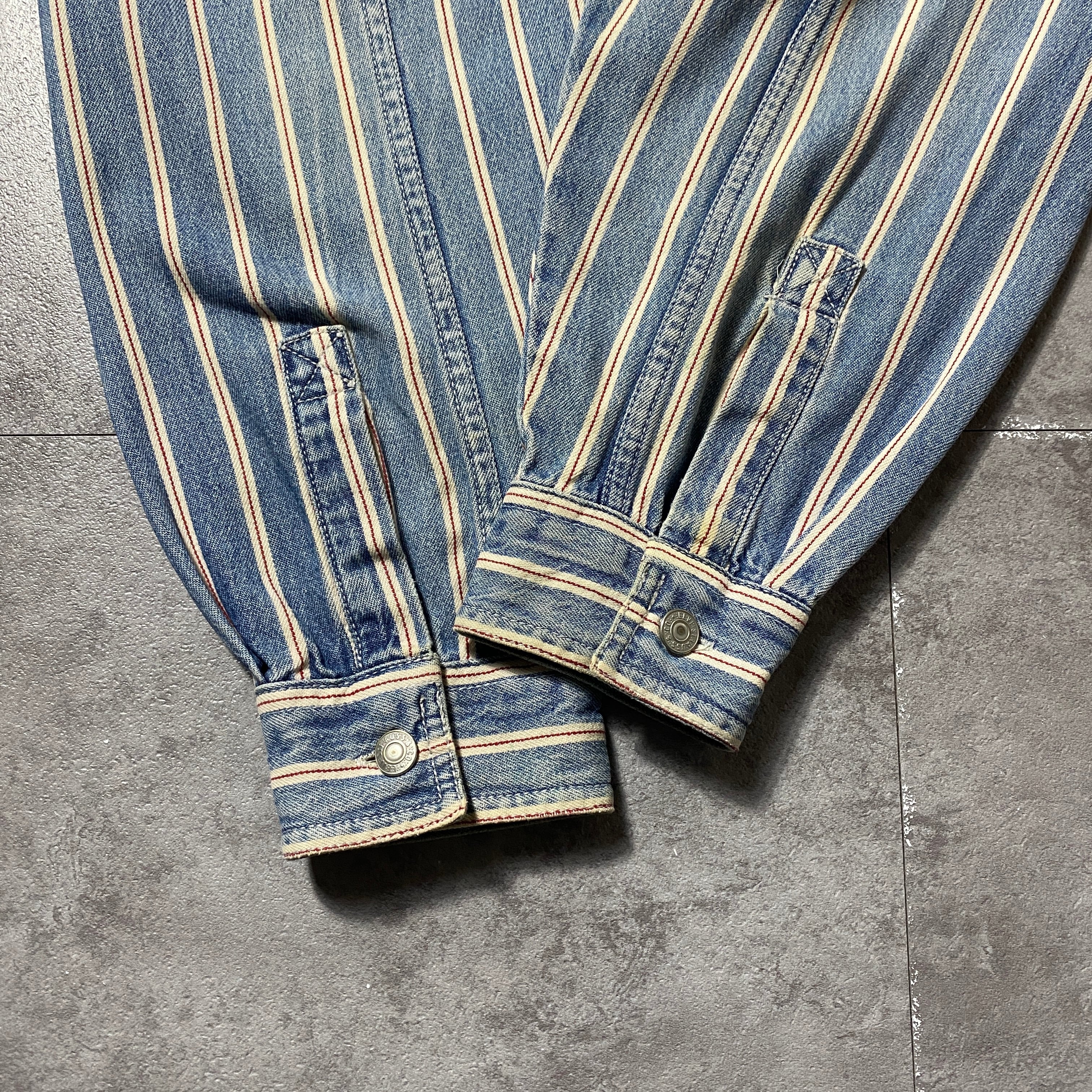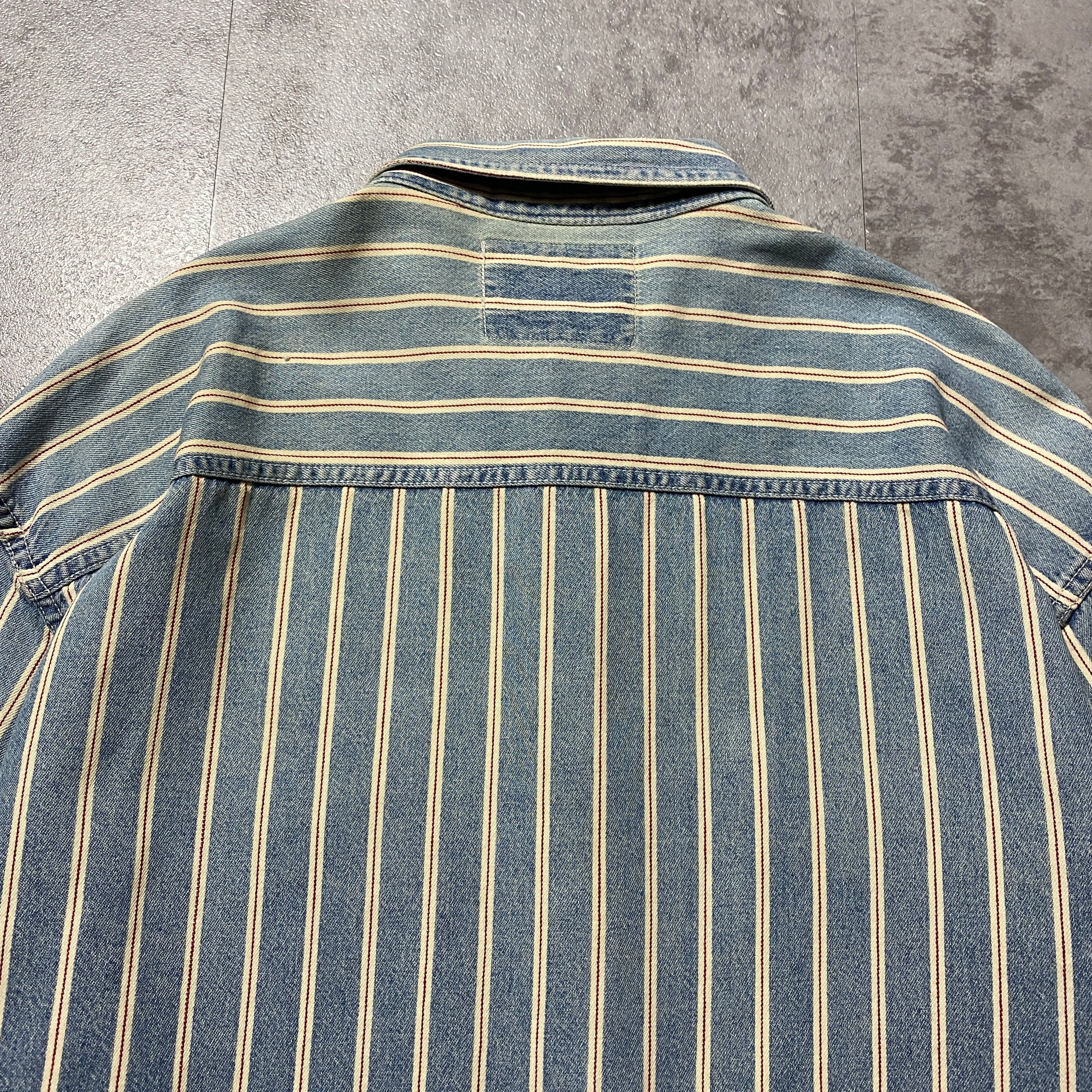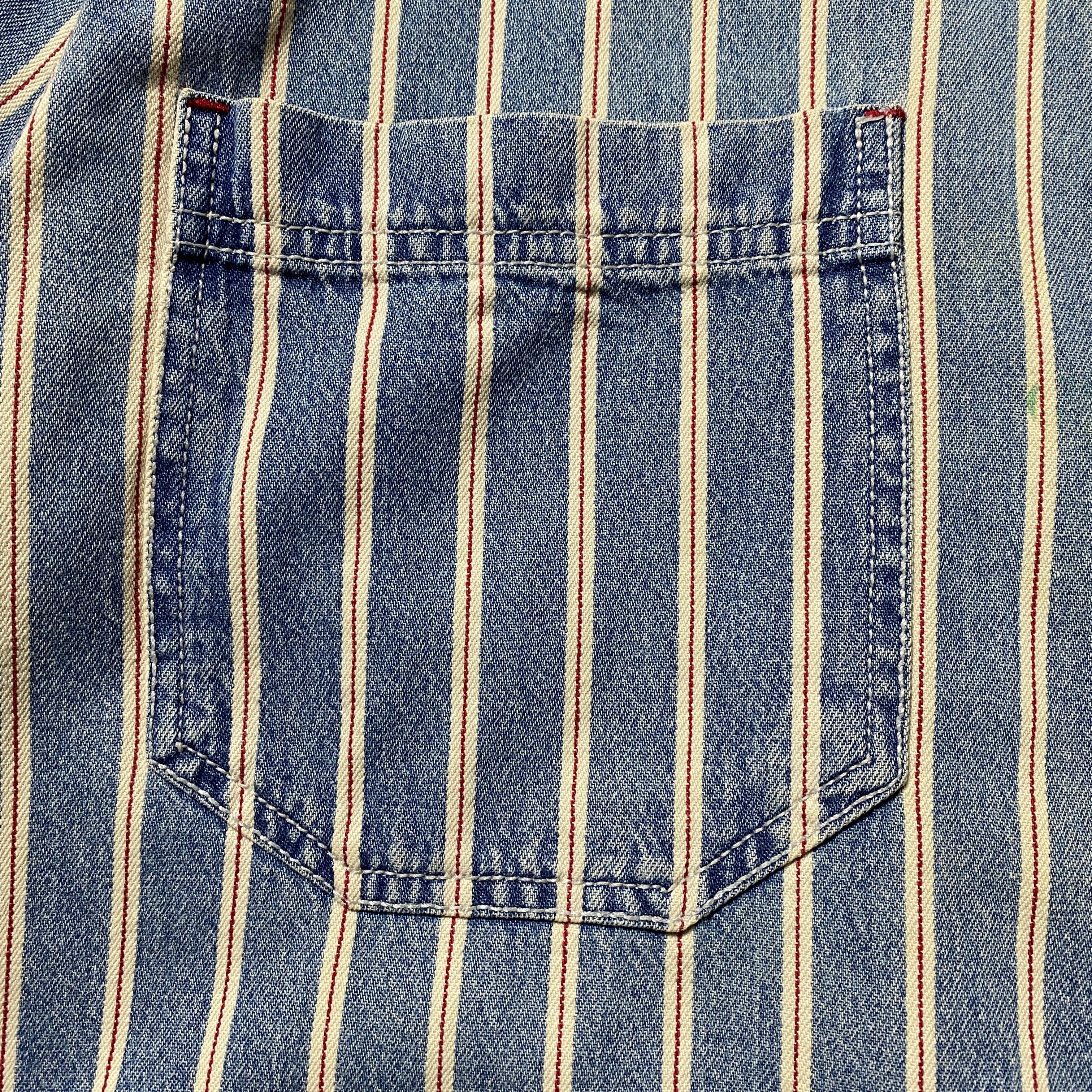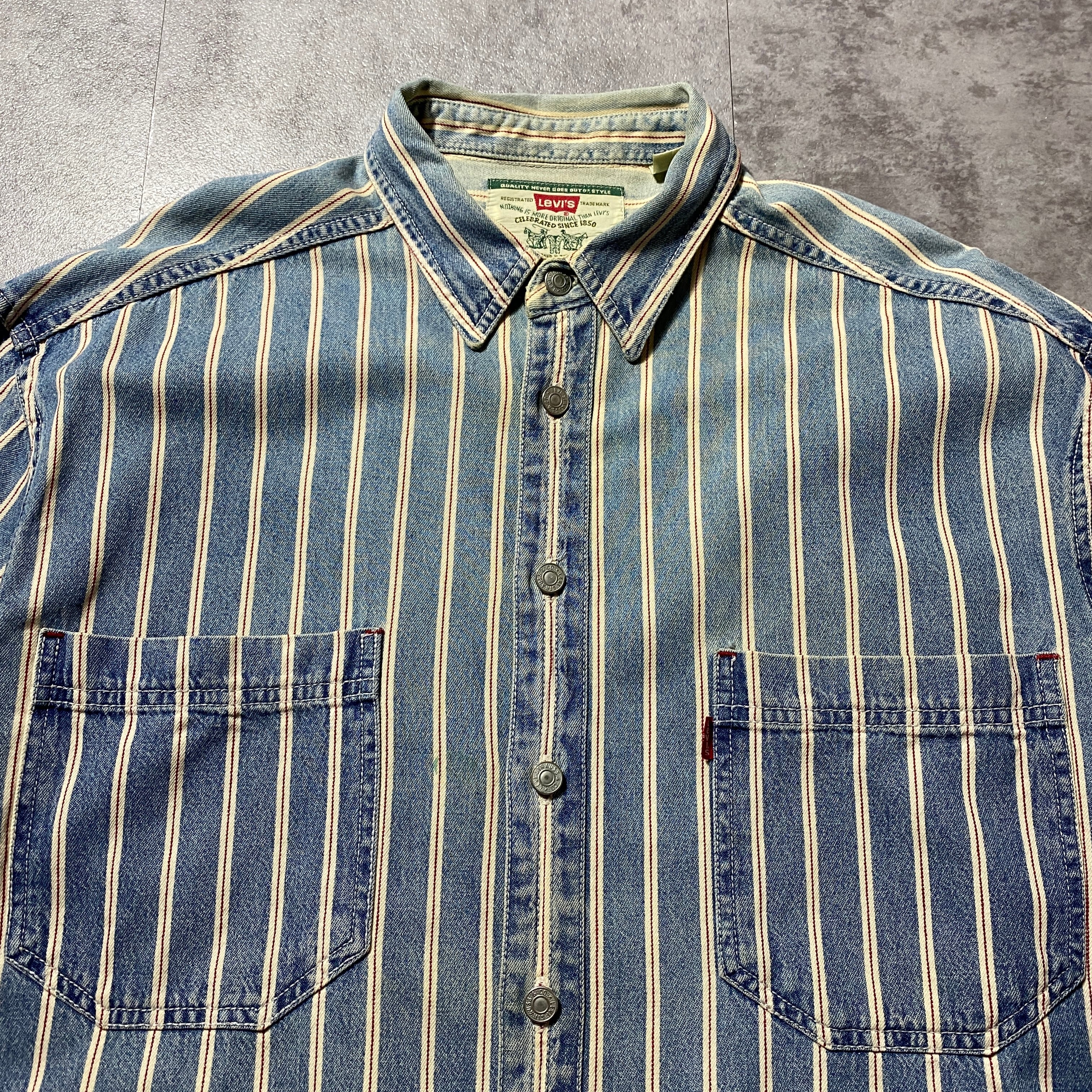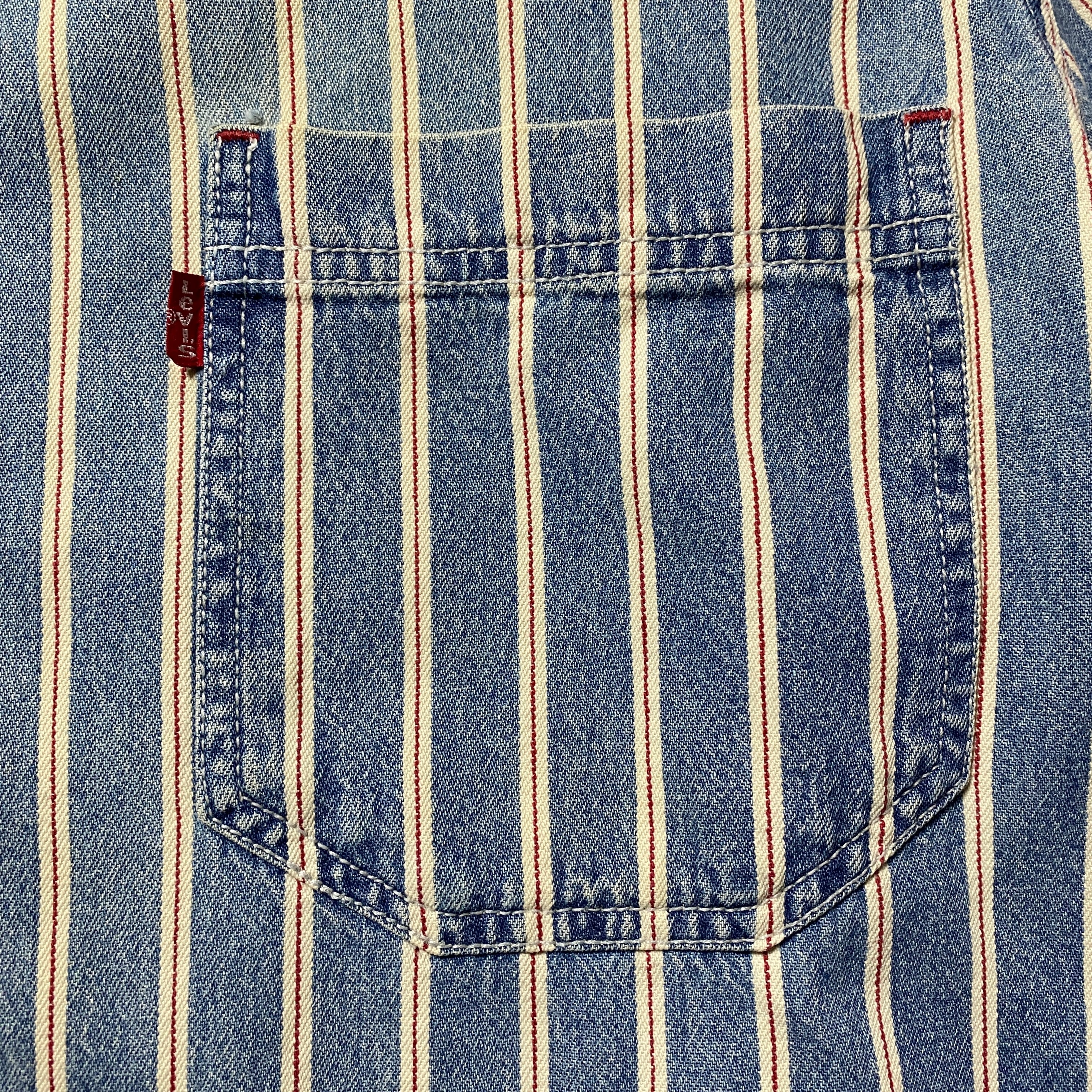 90's Levis リーバイス 赤タブ ダブルポケット メタルボタン セルビッジ風ストライプ フェード デニムシャツ