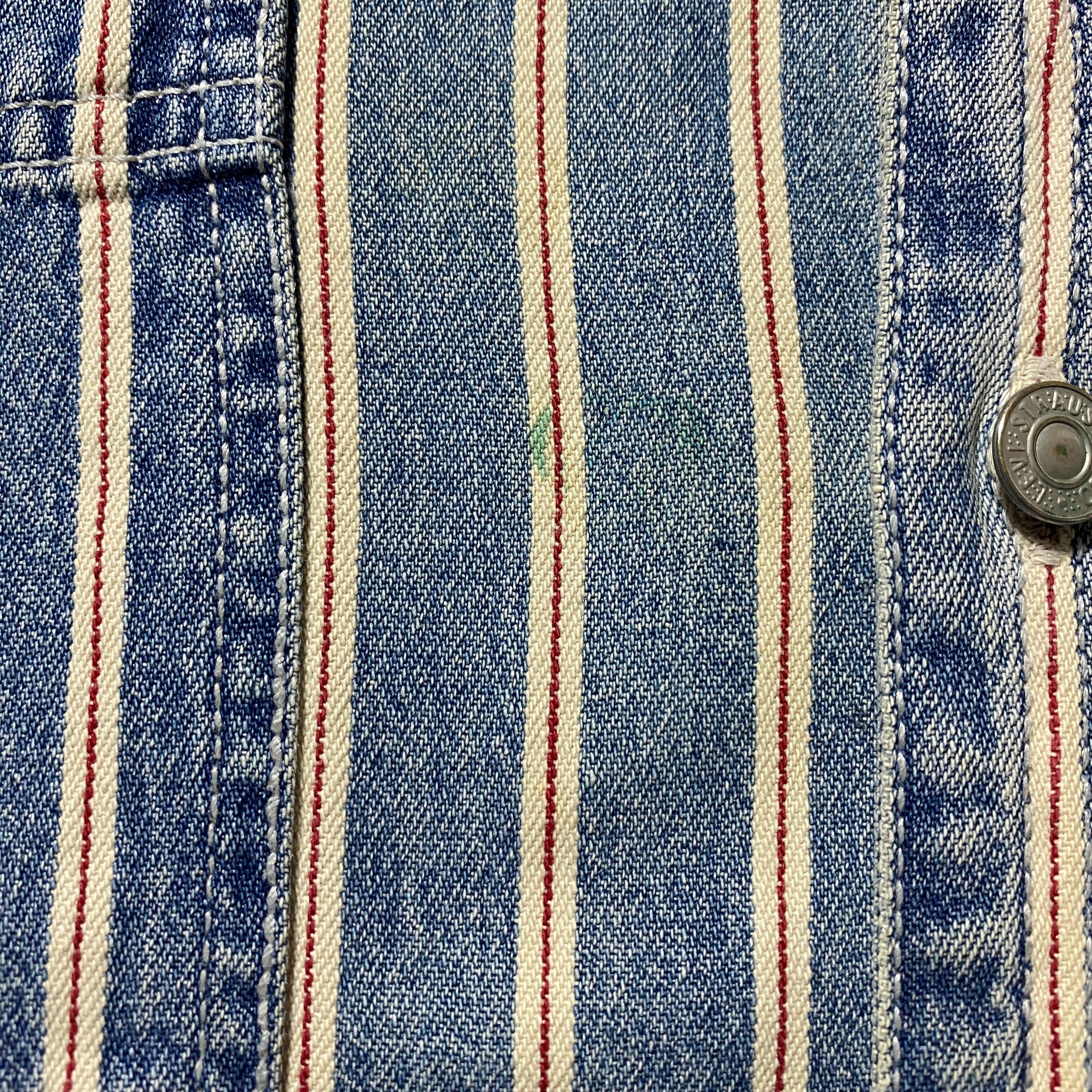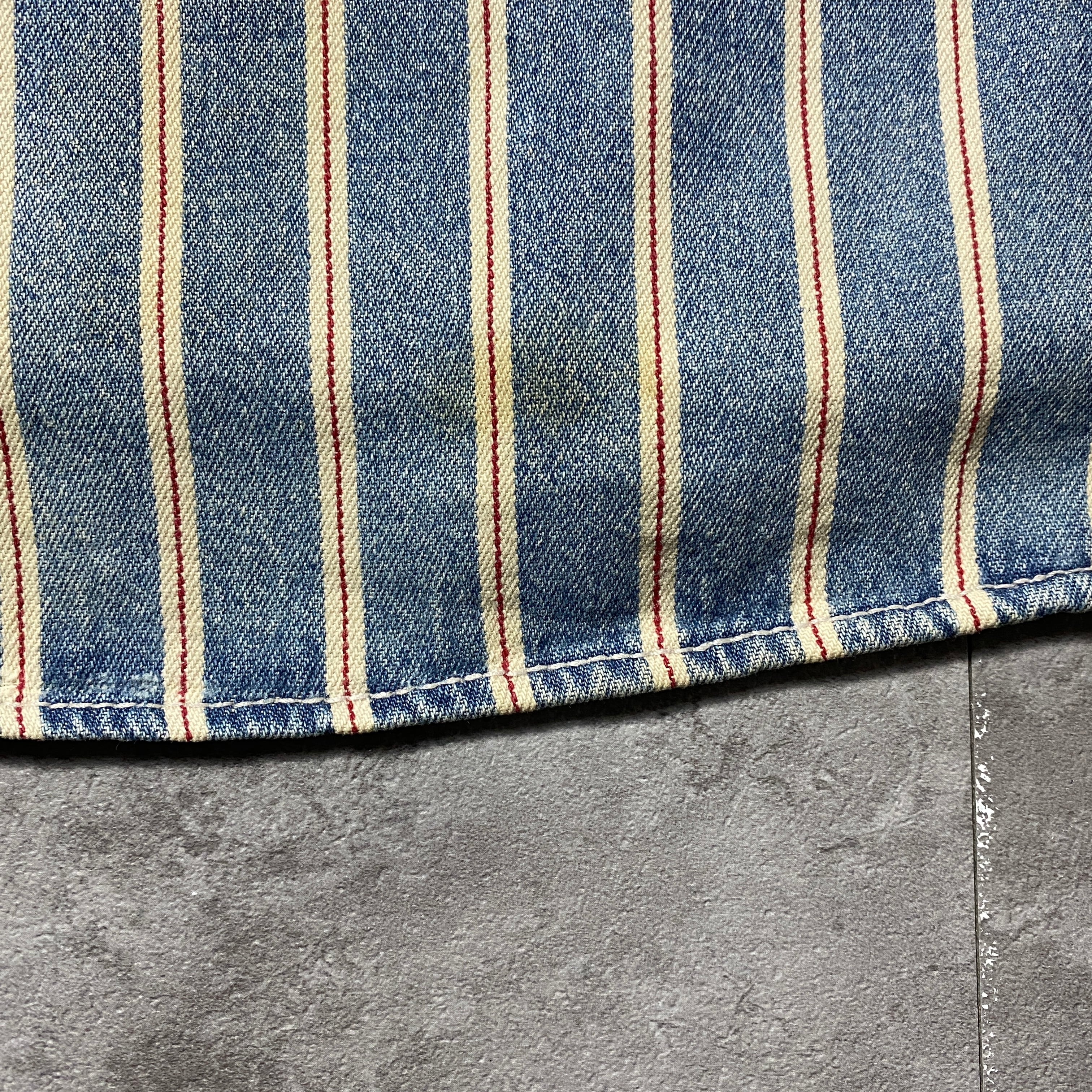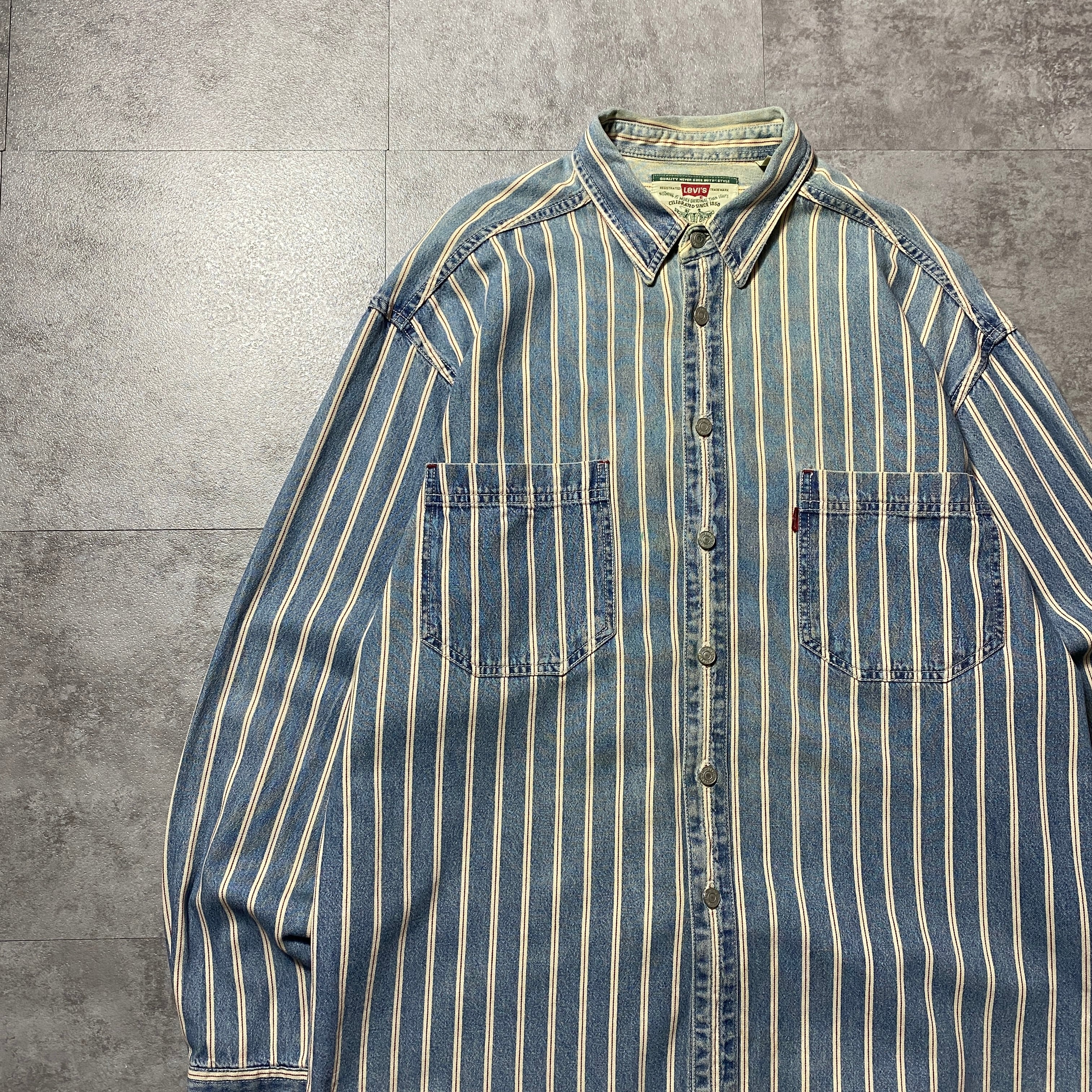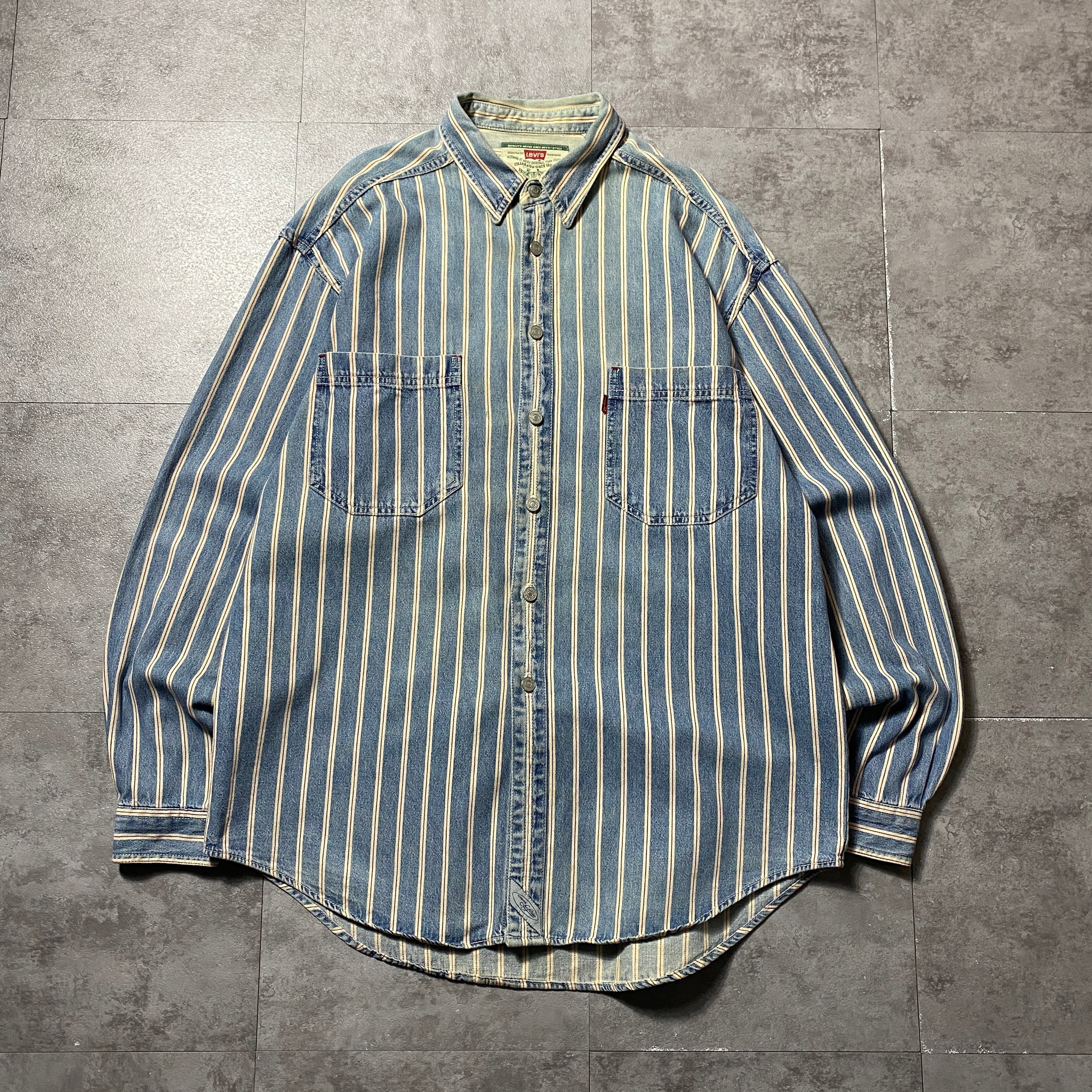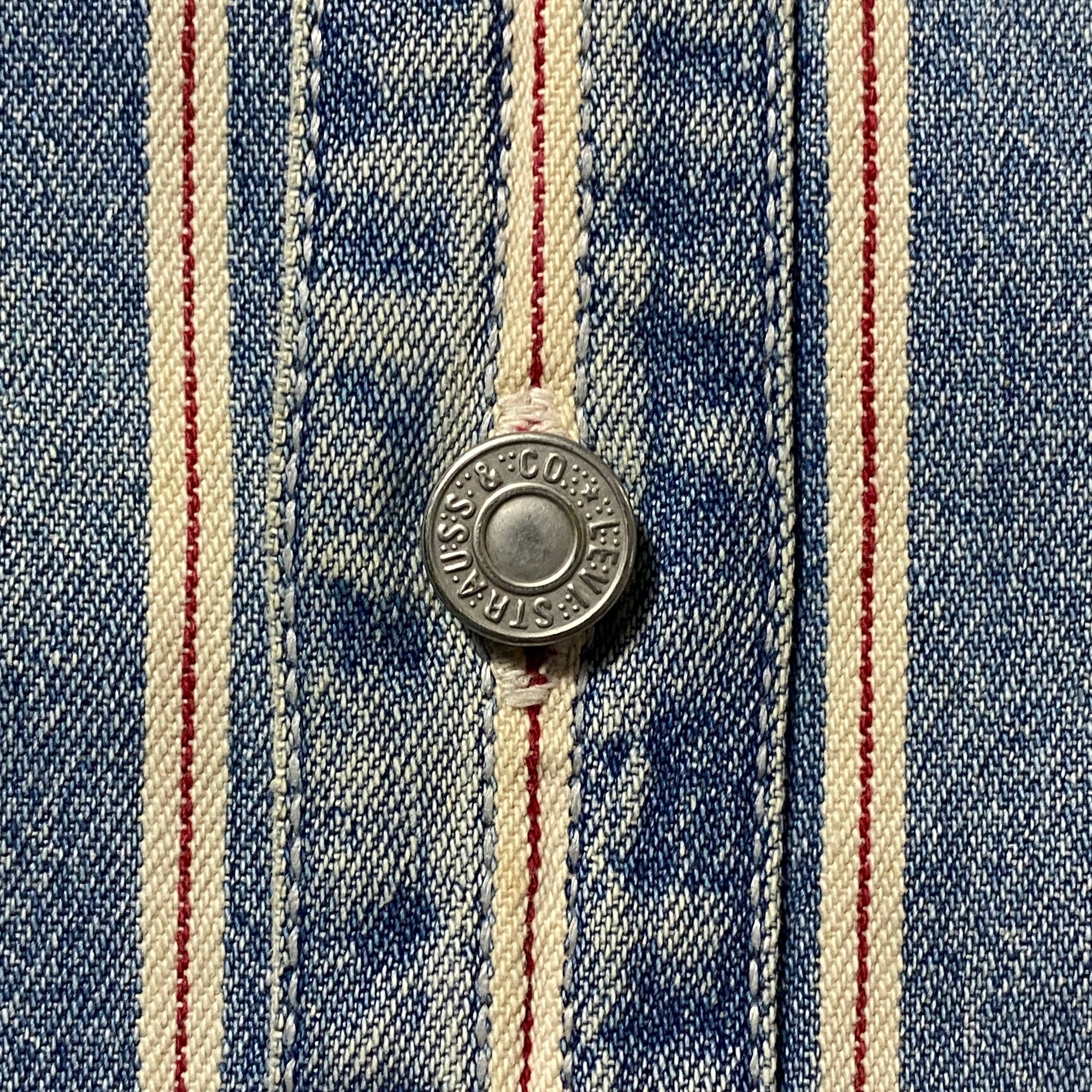 90's Levis リーバイス 赤タブ ダブルポケット メタルボタン セルビッジ風ストライプ フェード デニムシャツ