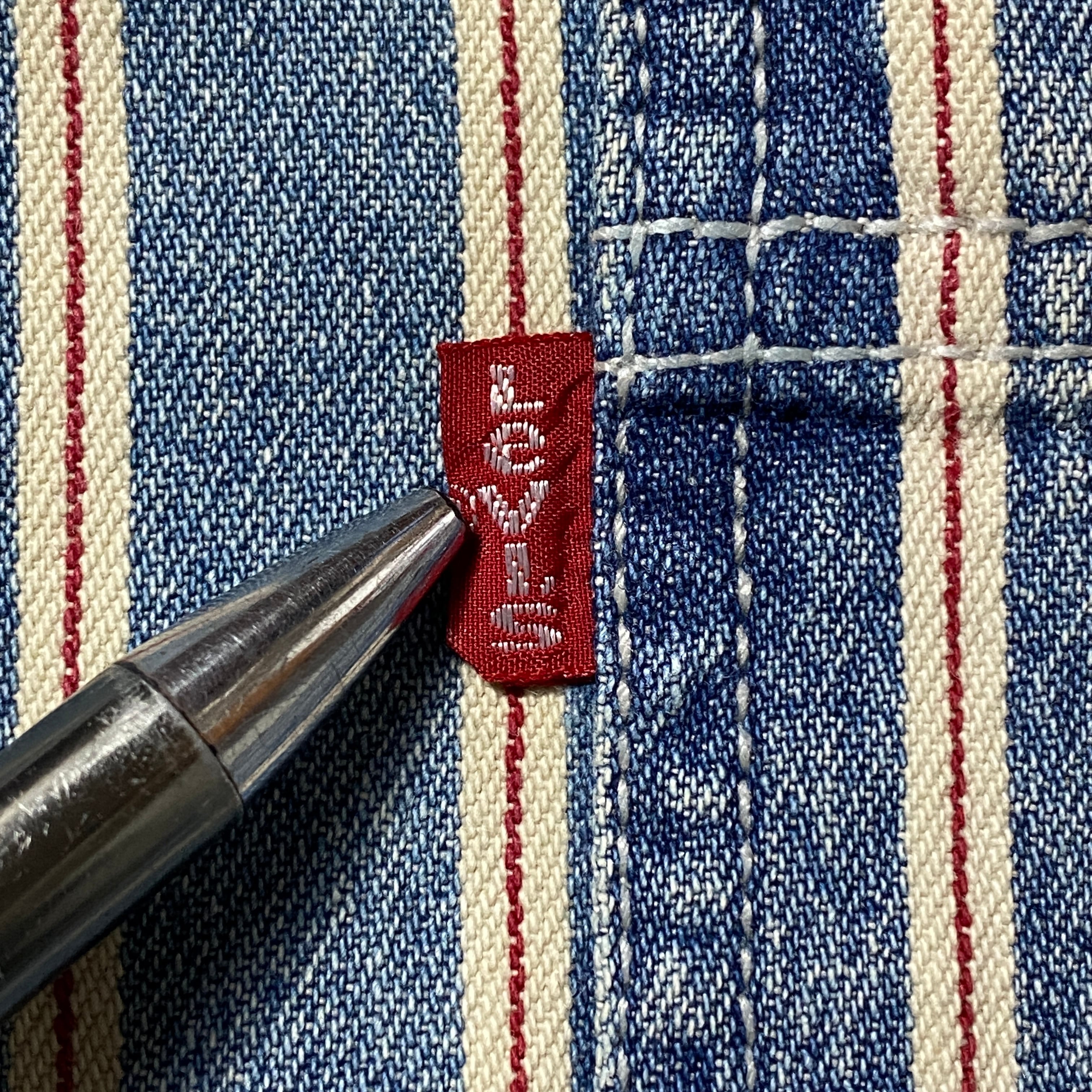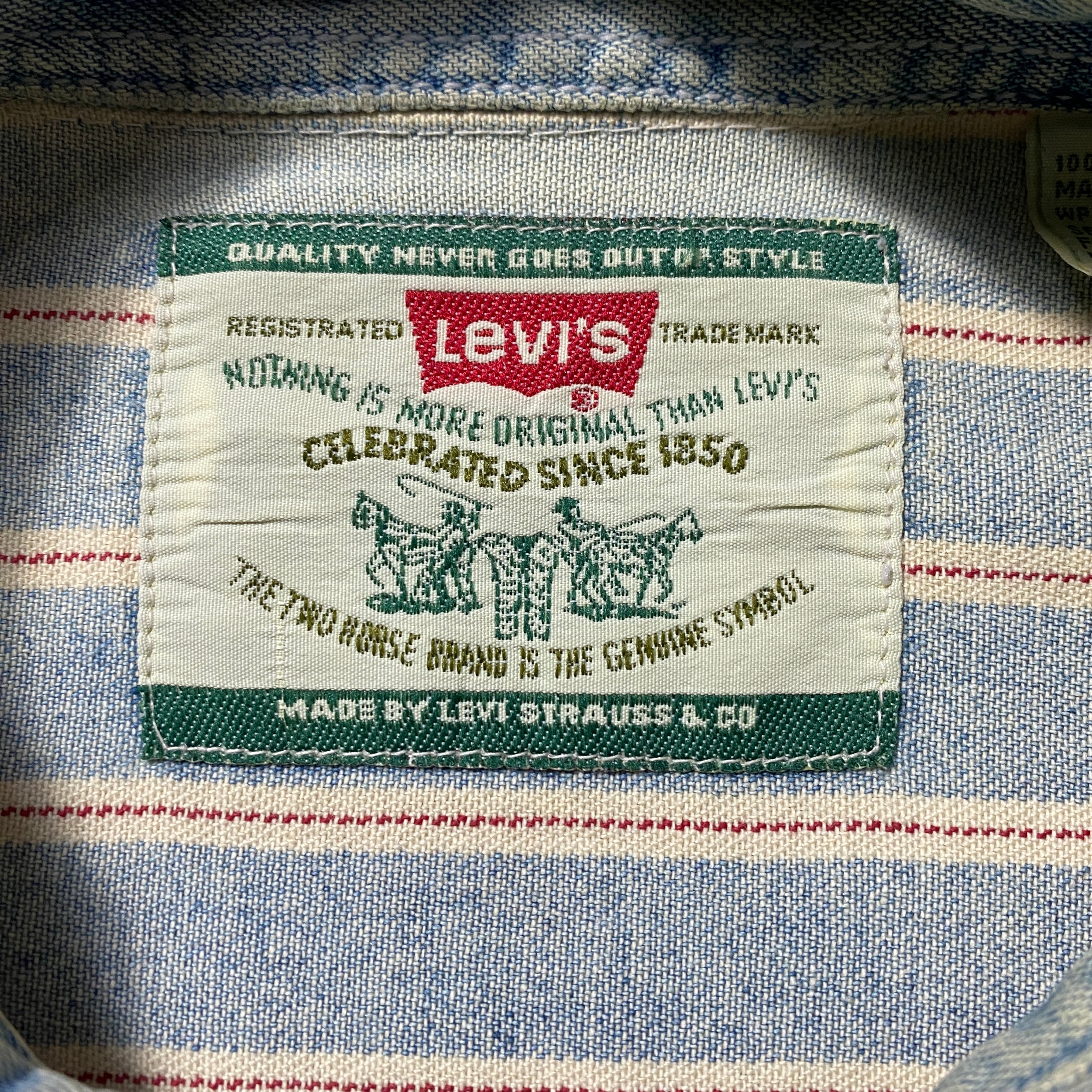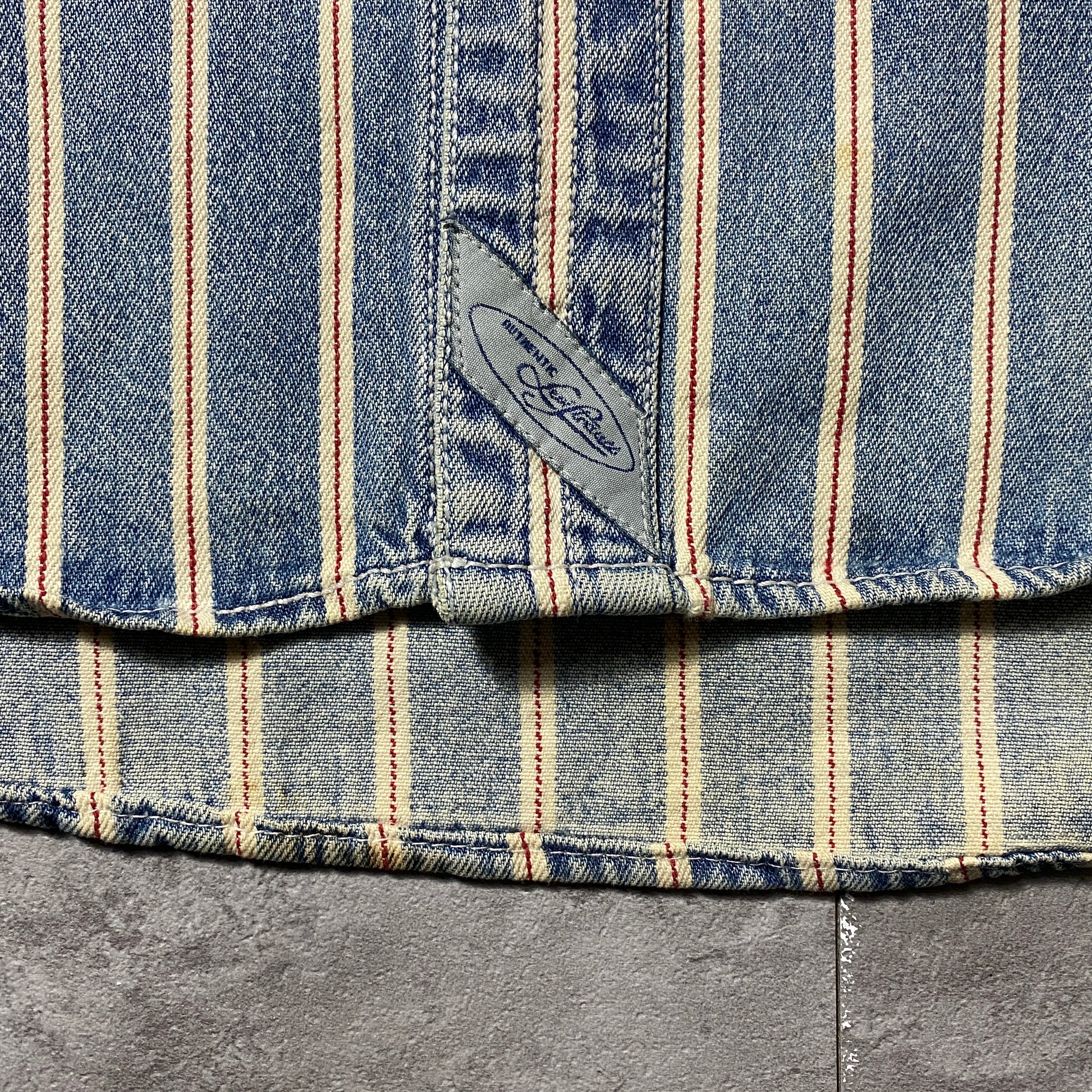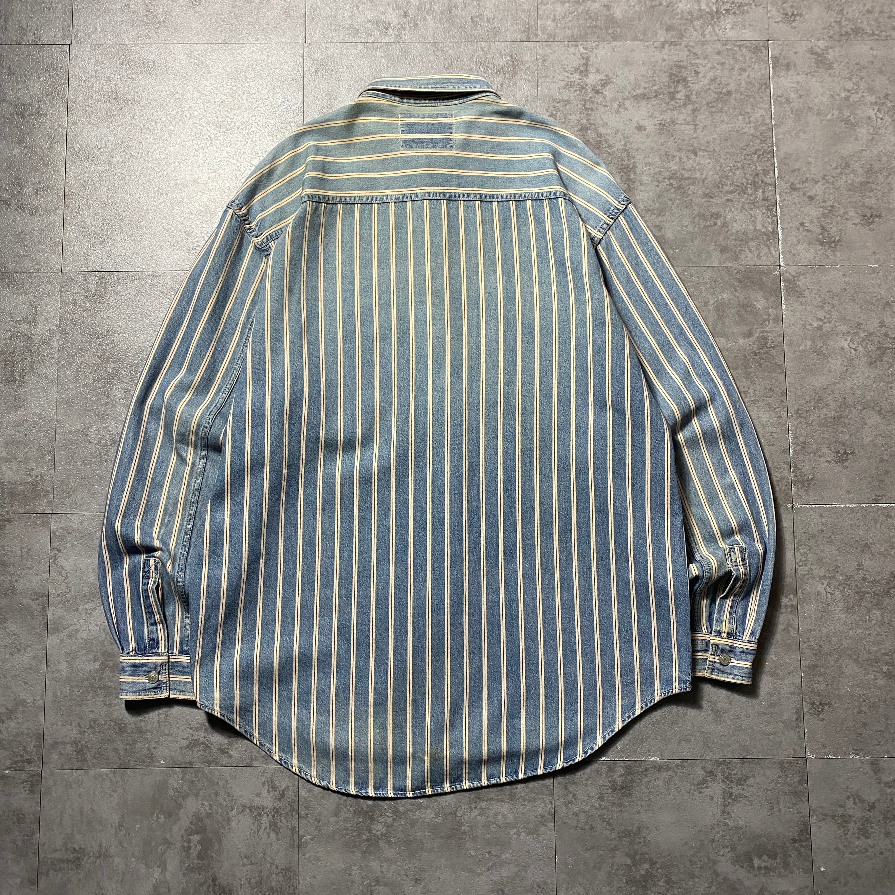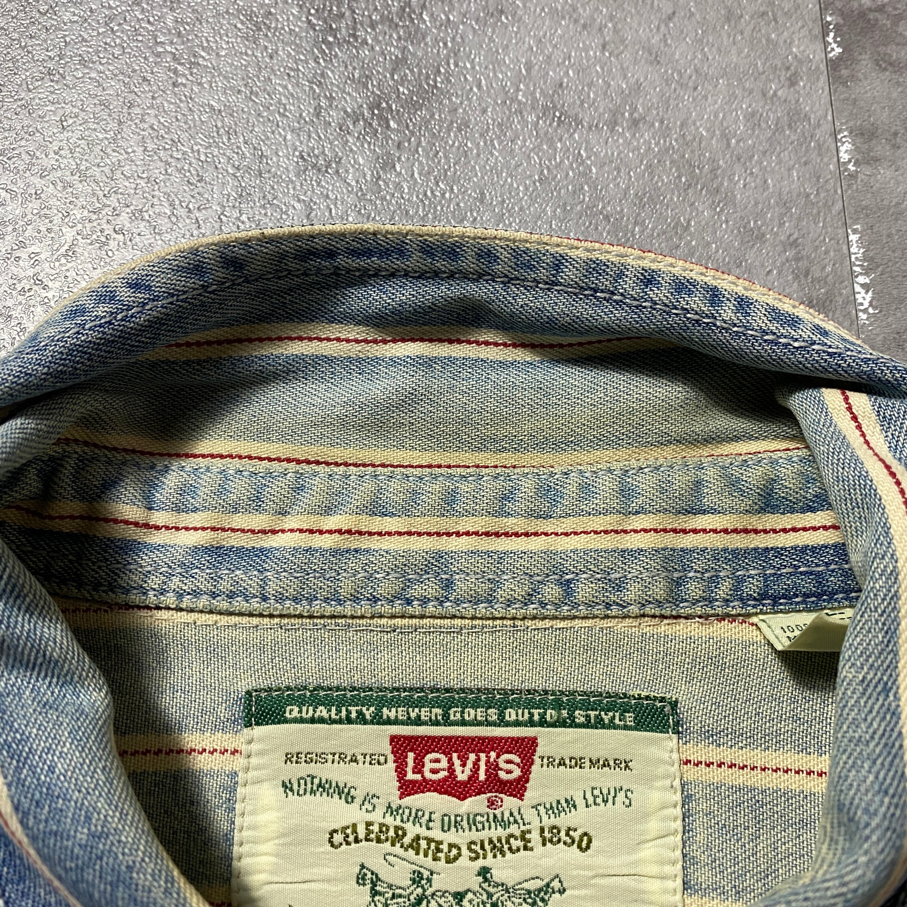 90's Levis リーバイス 赤タブ ダブルポケット メタルボタン セルビッジ風ストライプ フェード デニムシャツ