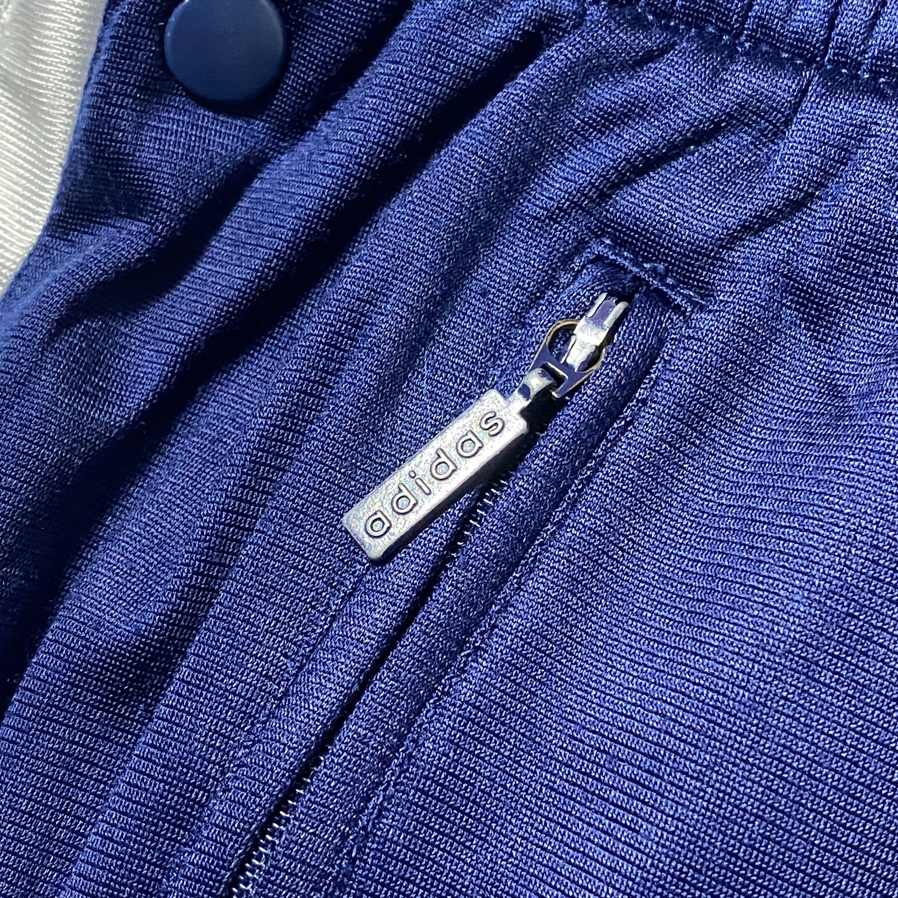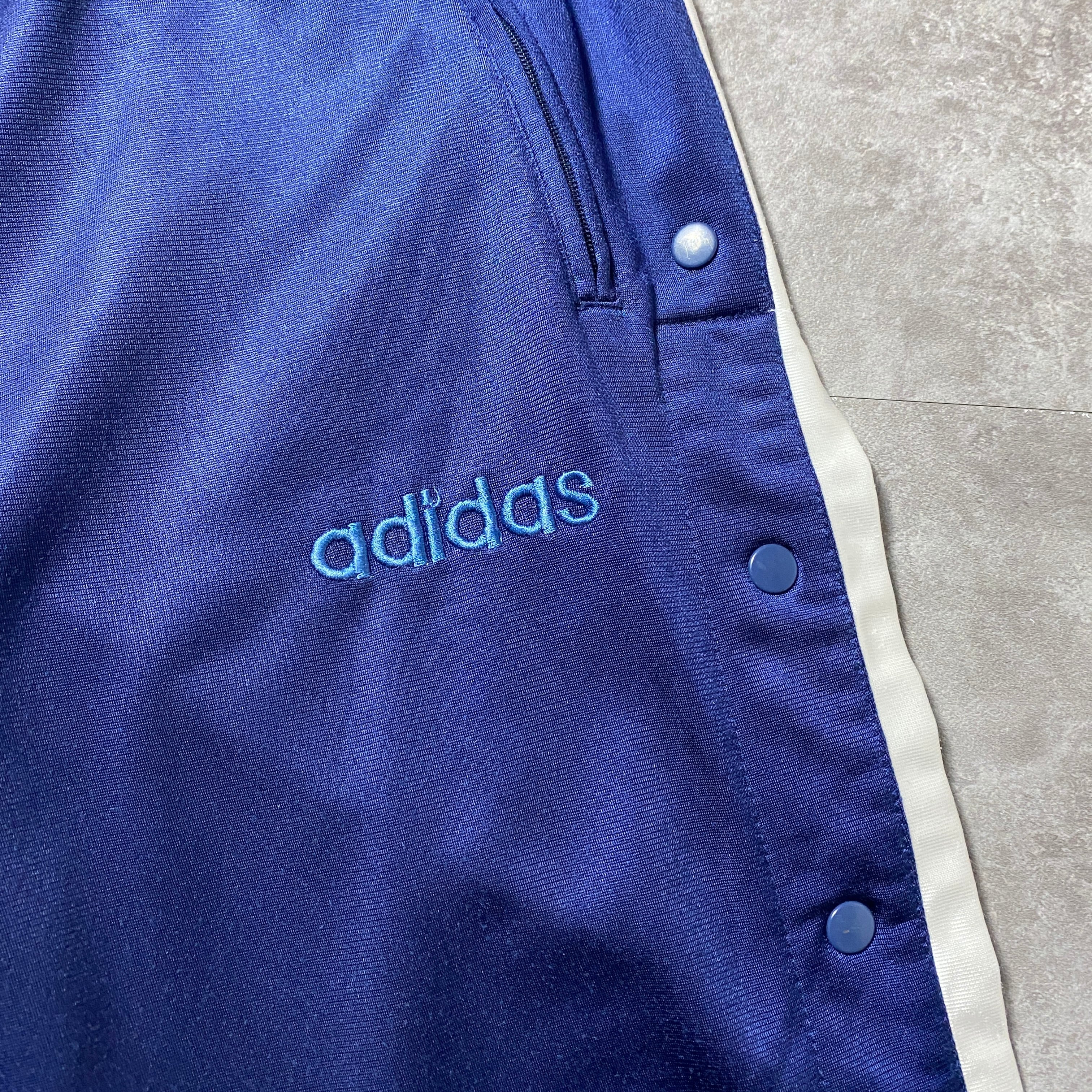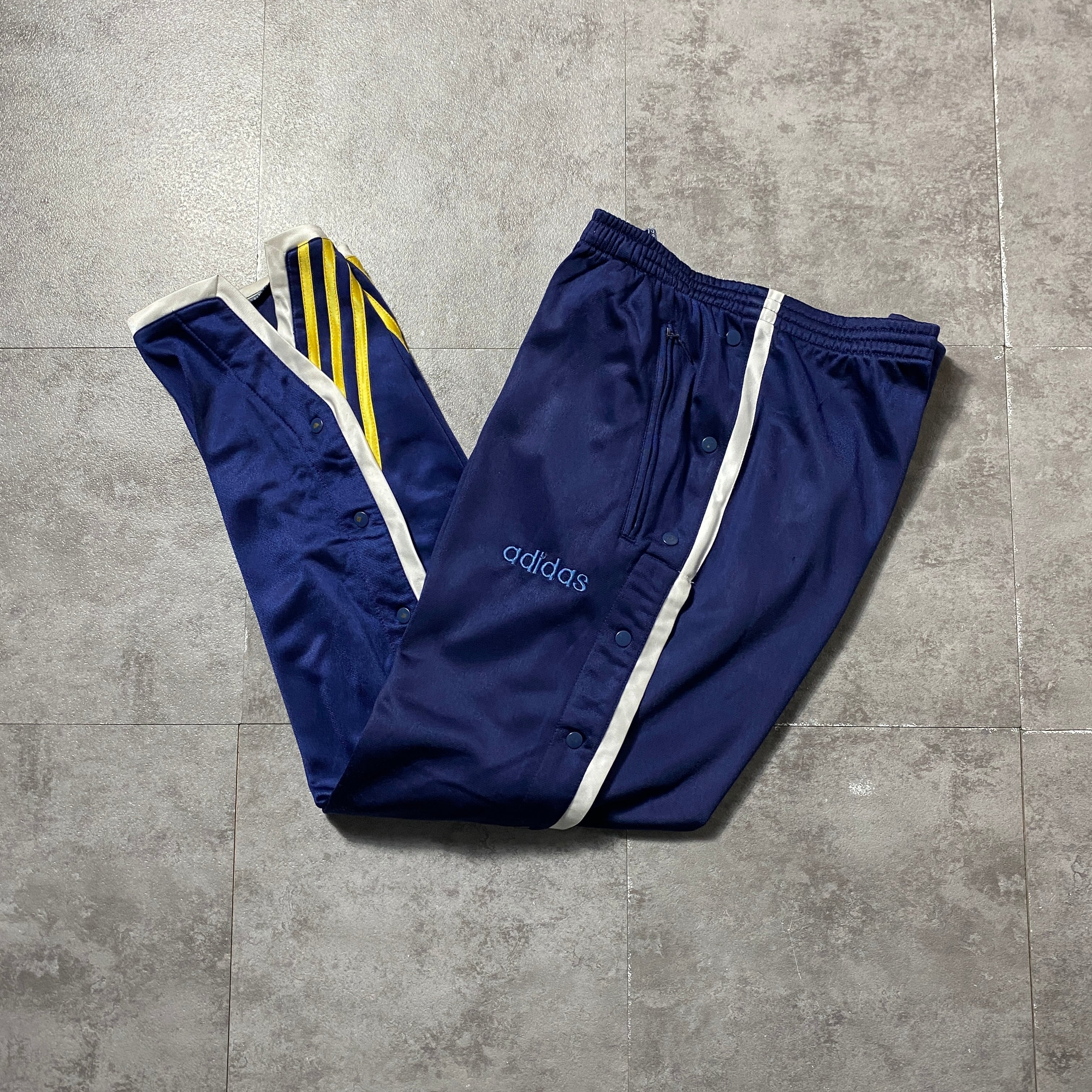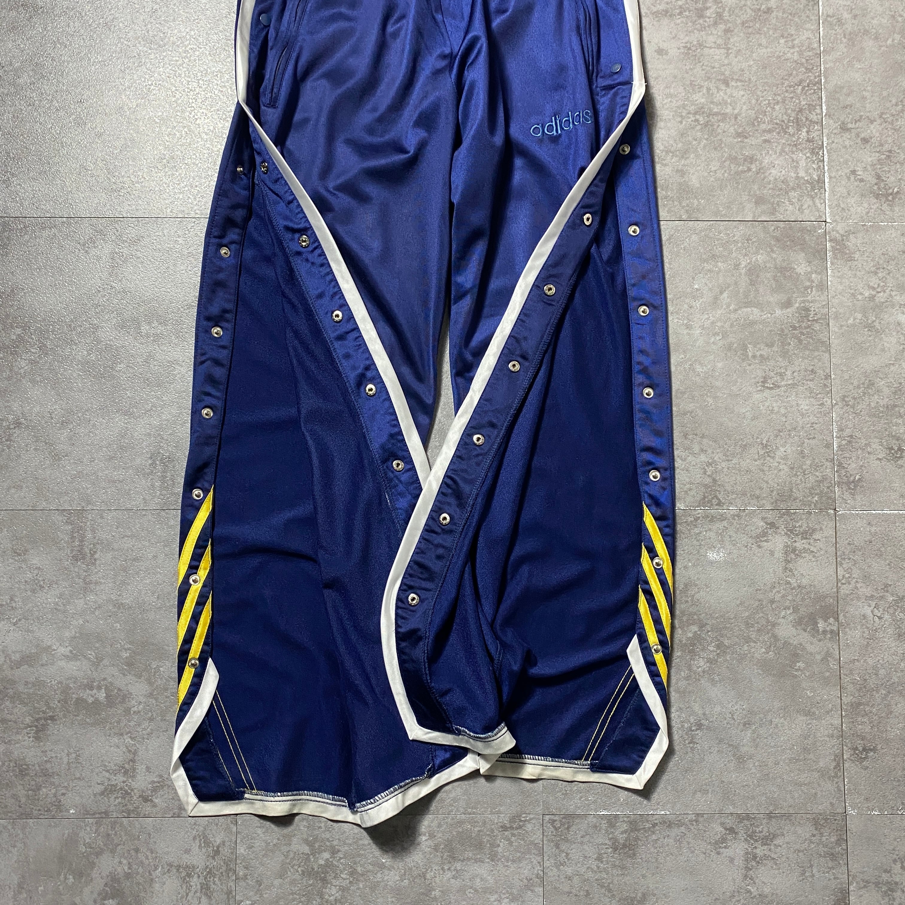 90's 00's adidas アディダス 刺繍文字ロゴ サイドスナップ ストライプ ネイビー ジャージ トラックパンツ