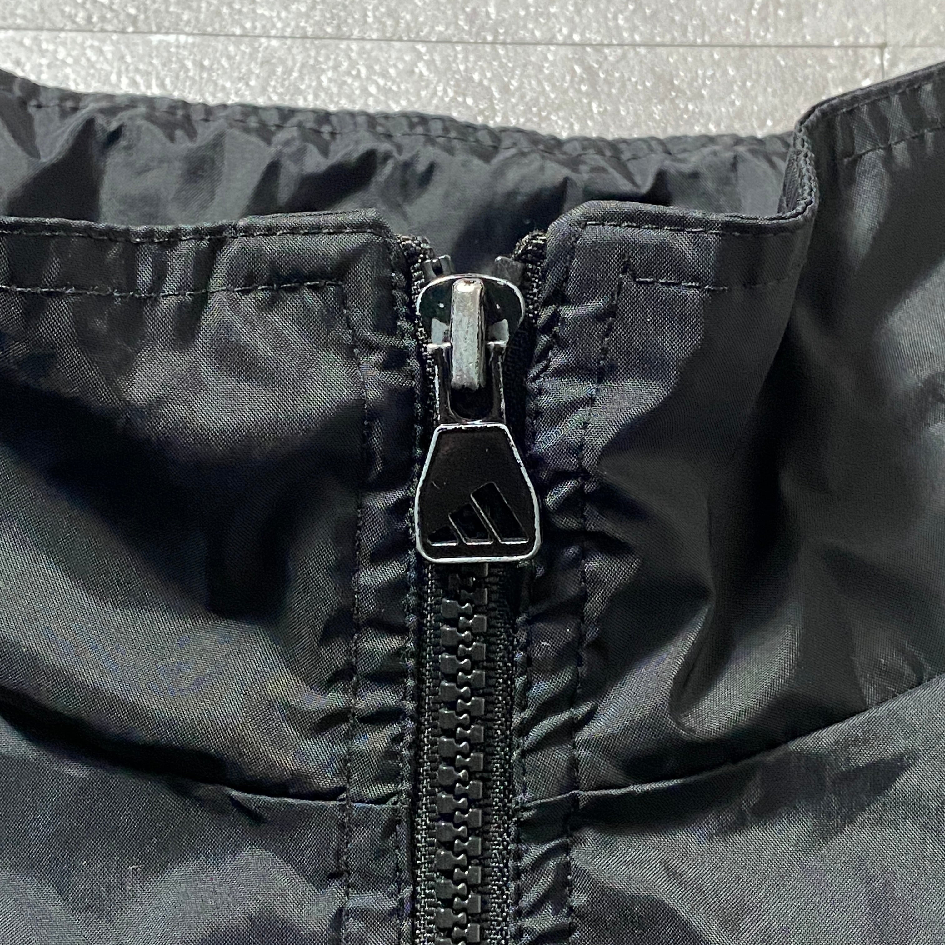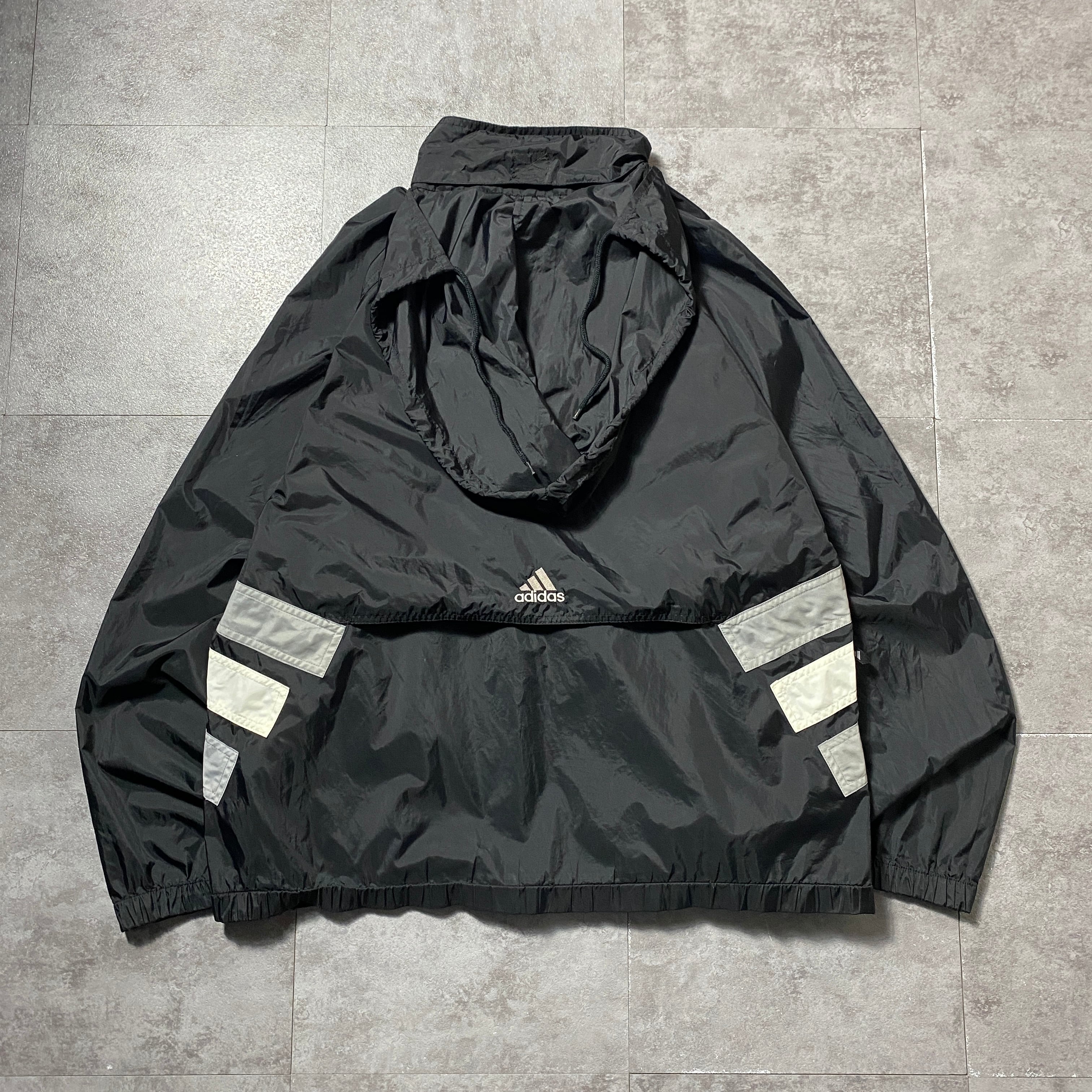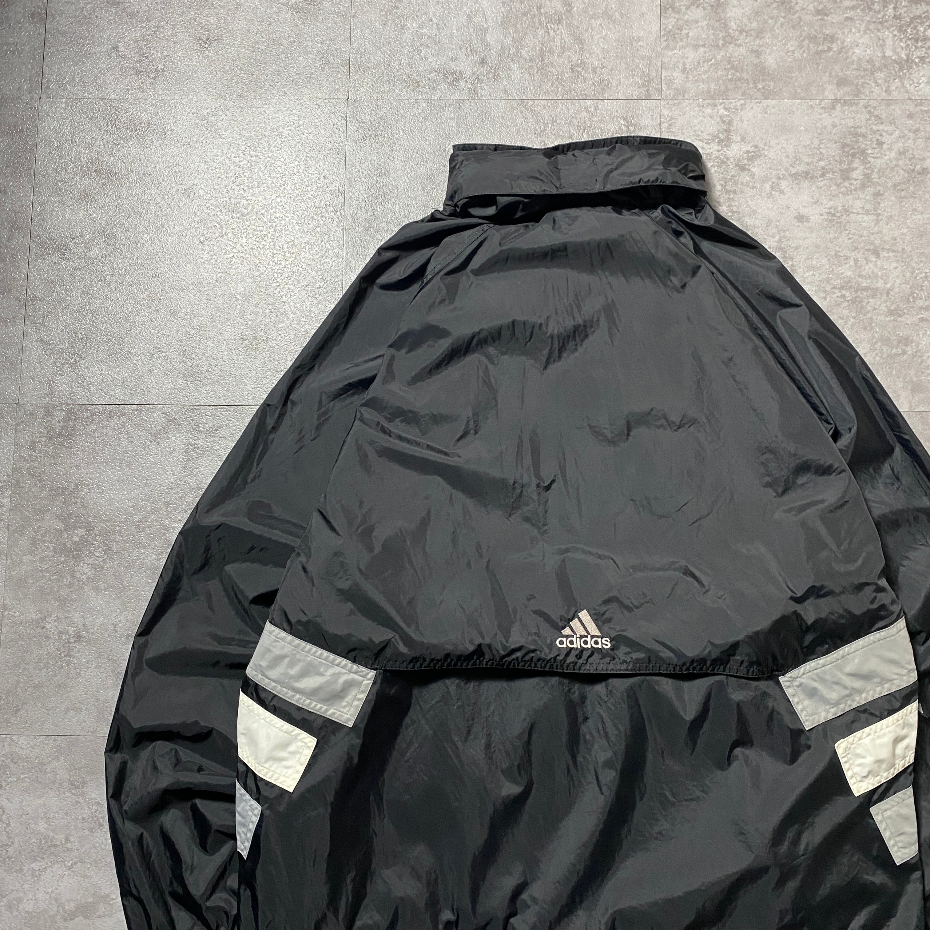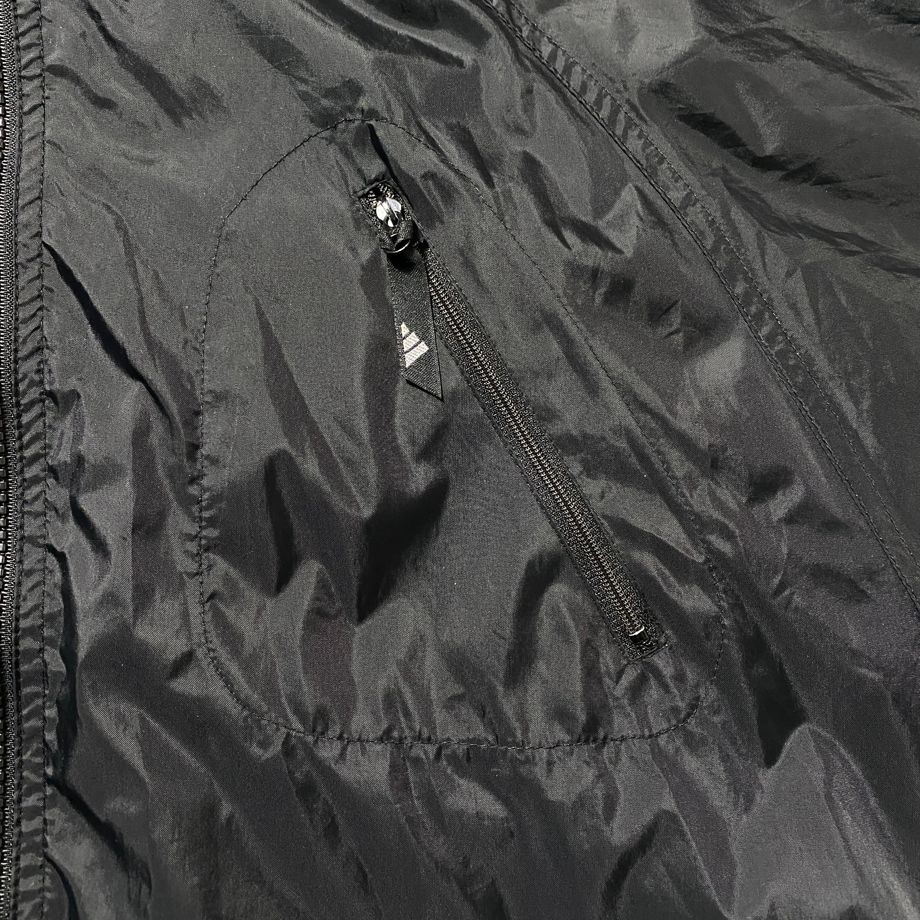 90's 00's adidas アディダス バック刺繍パフォーマンスロゴ ジップ付胸ポケット フード格納 ブラック 黒 ナイロンジャケット
