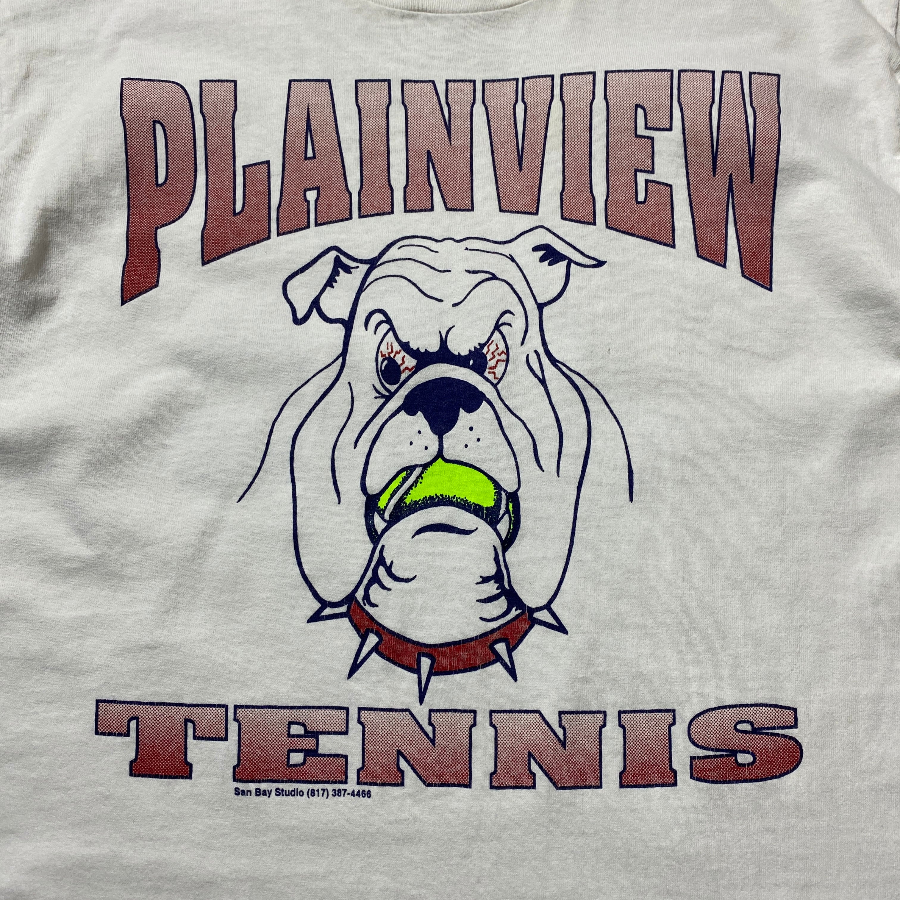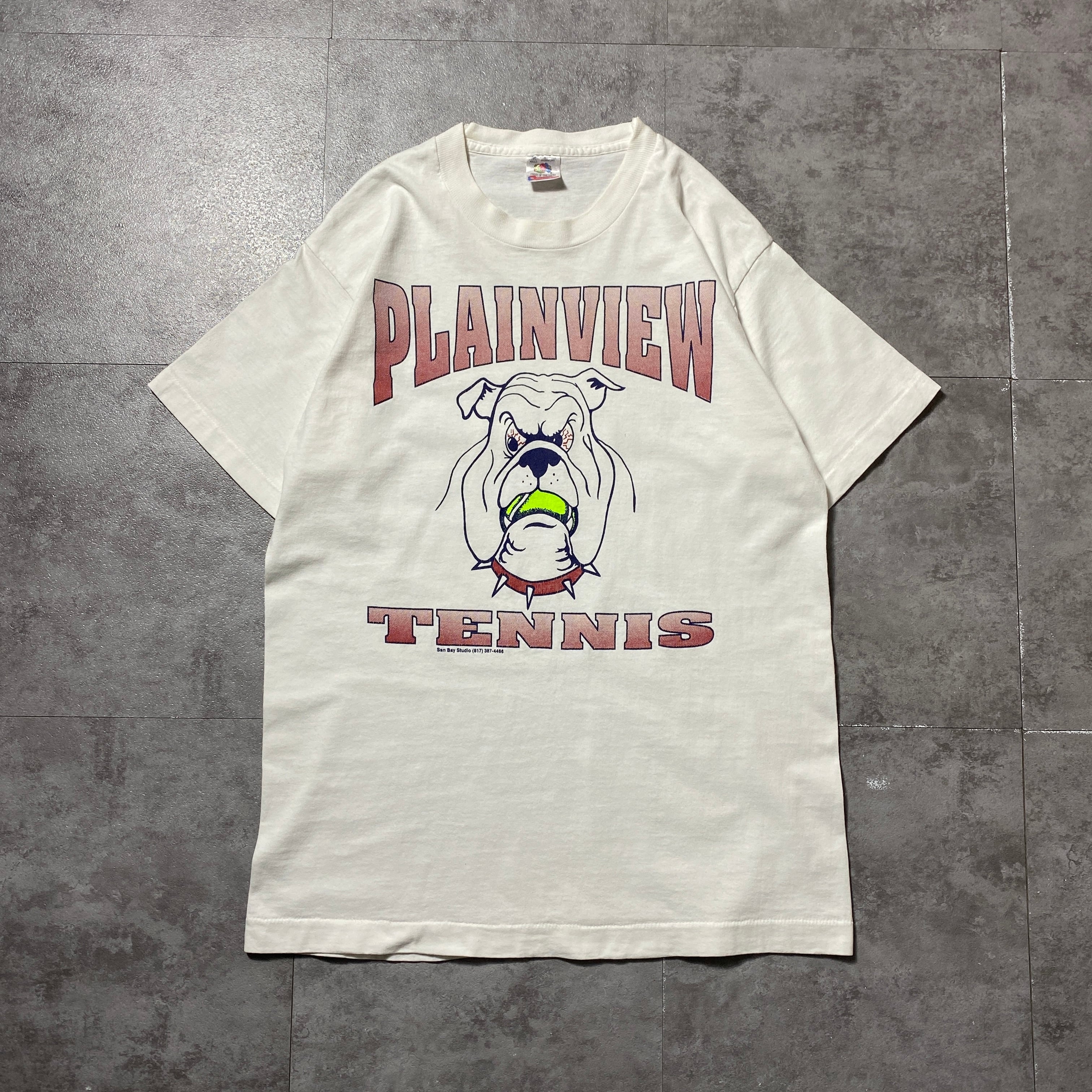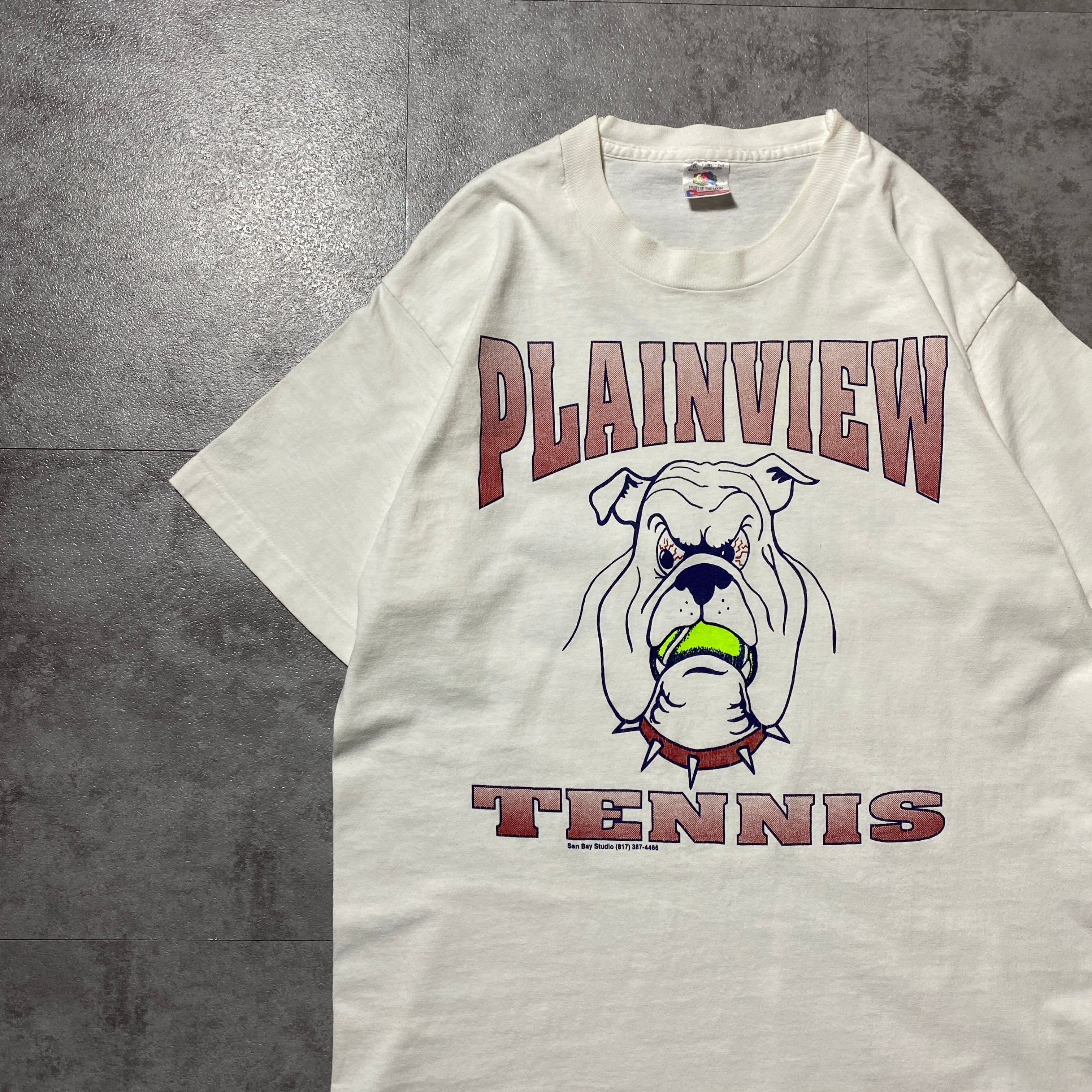 【USA製】90's Fruit Of The Loom PLAINVIEW TENNIS フルーツオブザルームボディ ブルドッグ プリント シングルステッチ ホワイト 白 Tシャツ