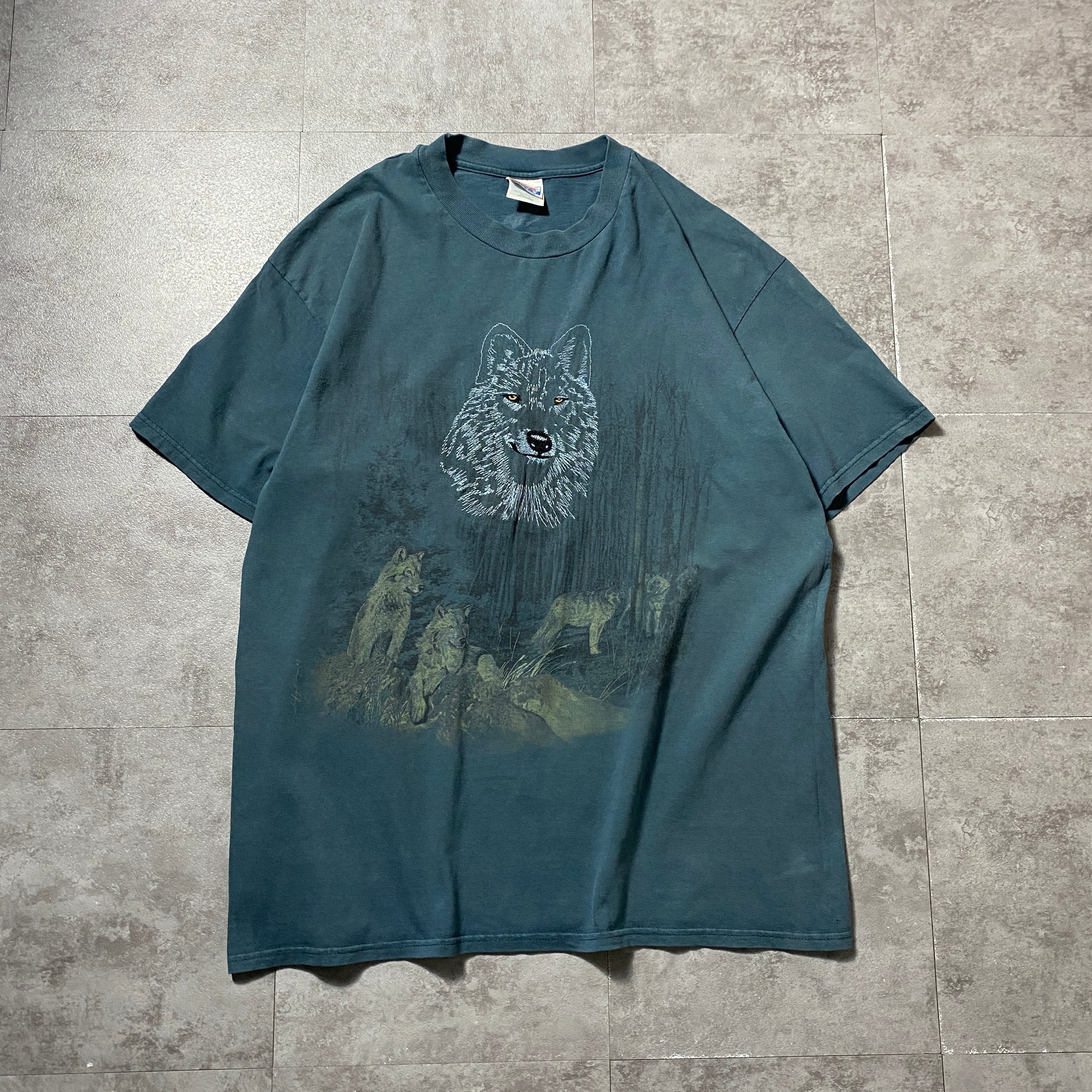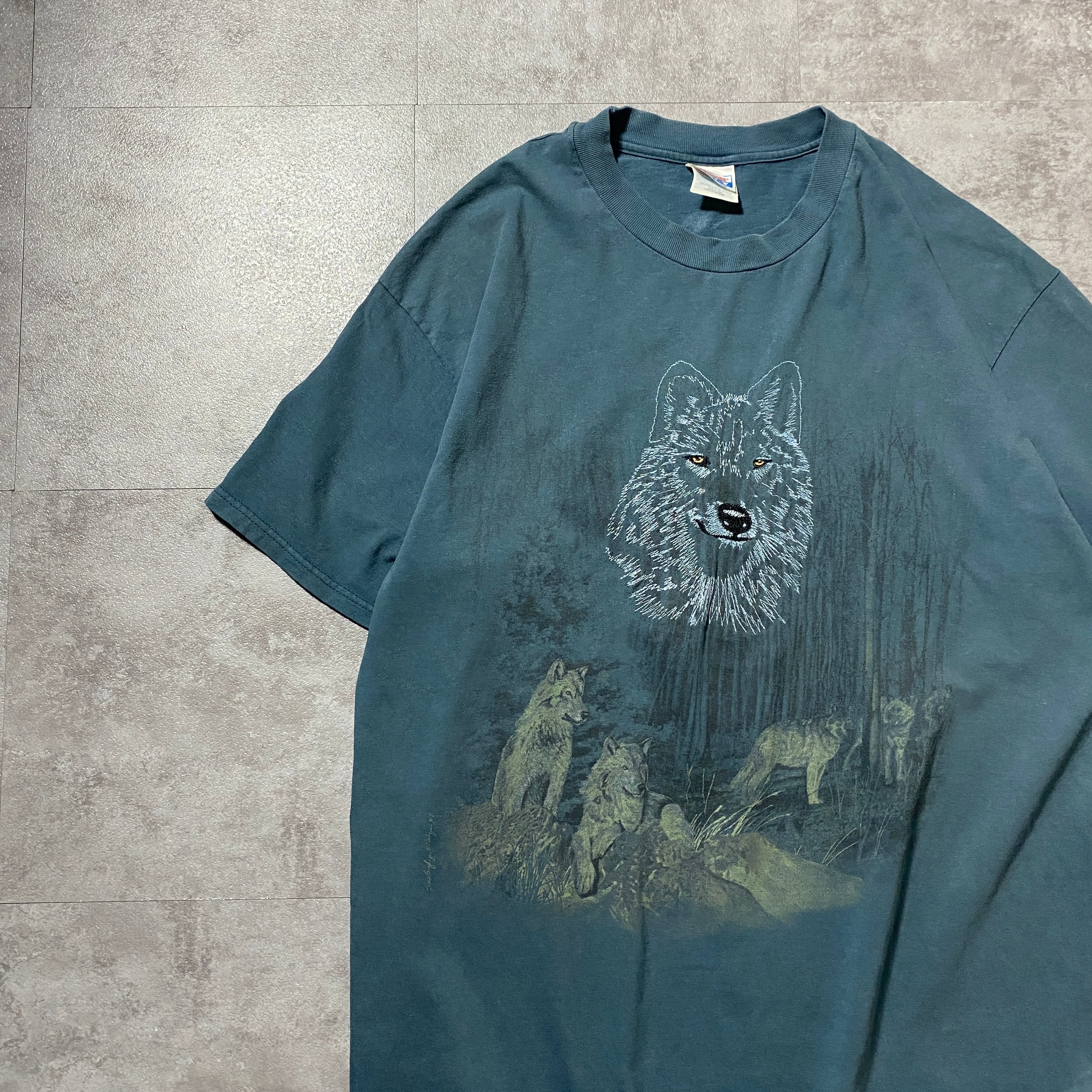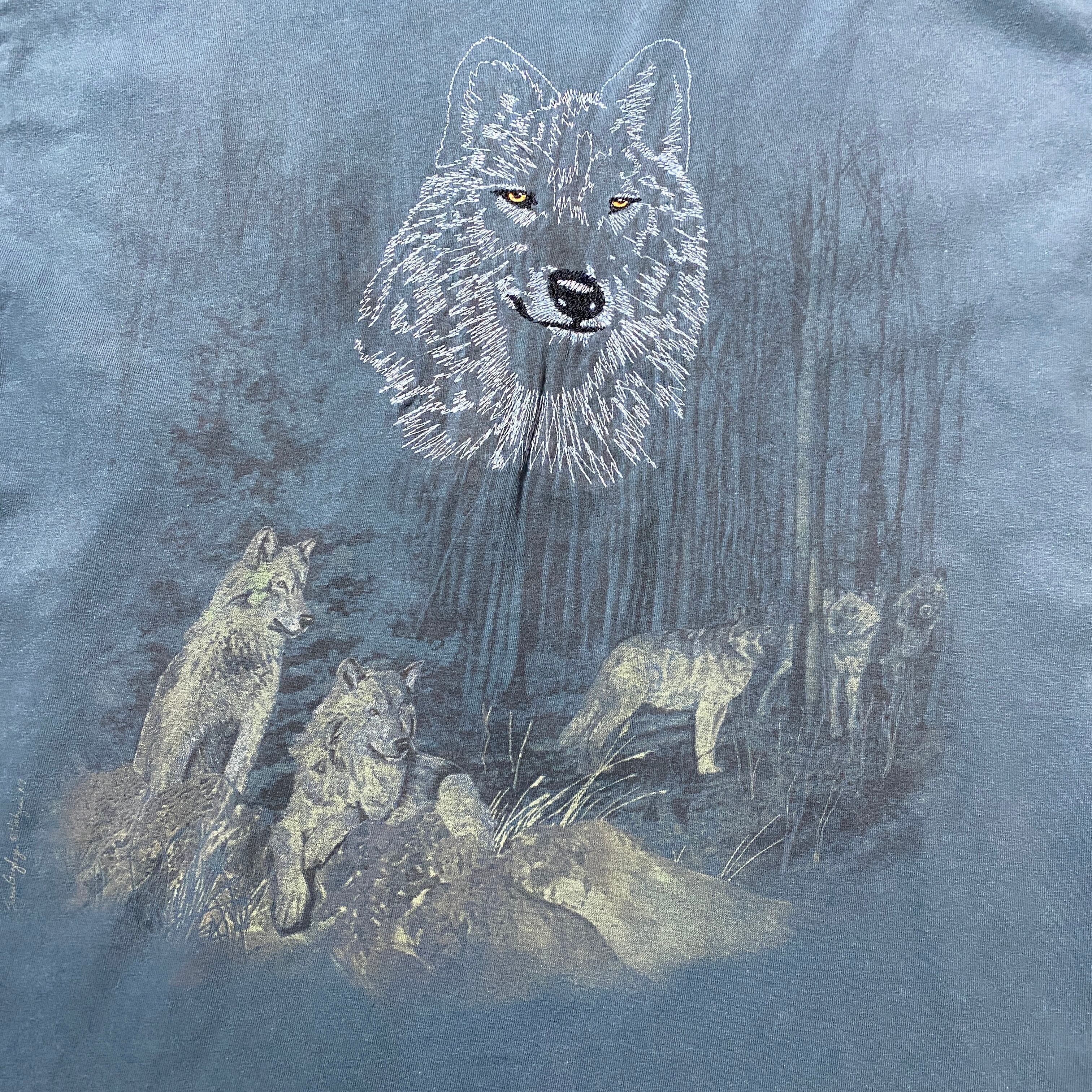 【USA製】90's Hanes オオカミ 狼 刺繍ロゴ ヘインズボディ アニマル系 Tシャツ
